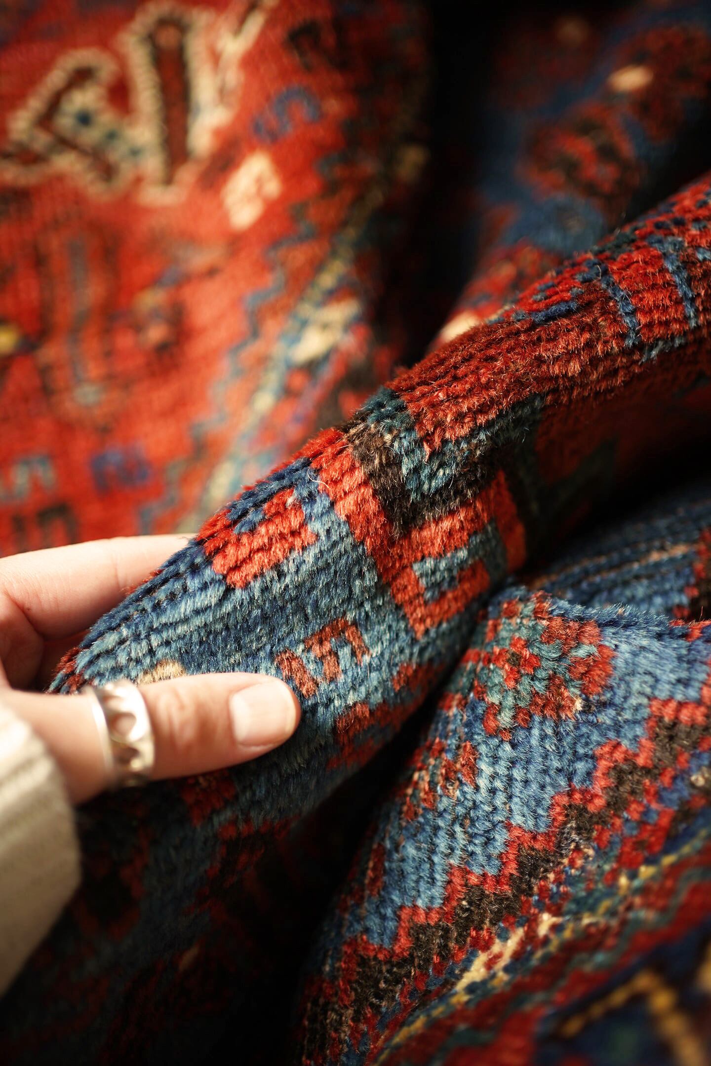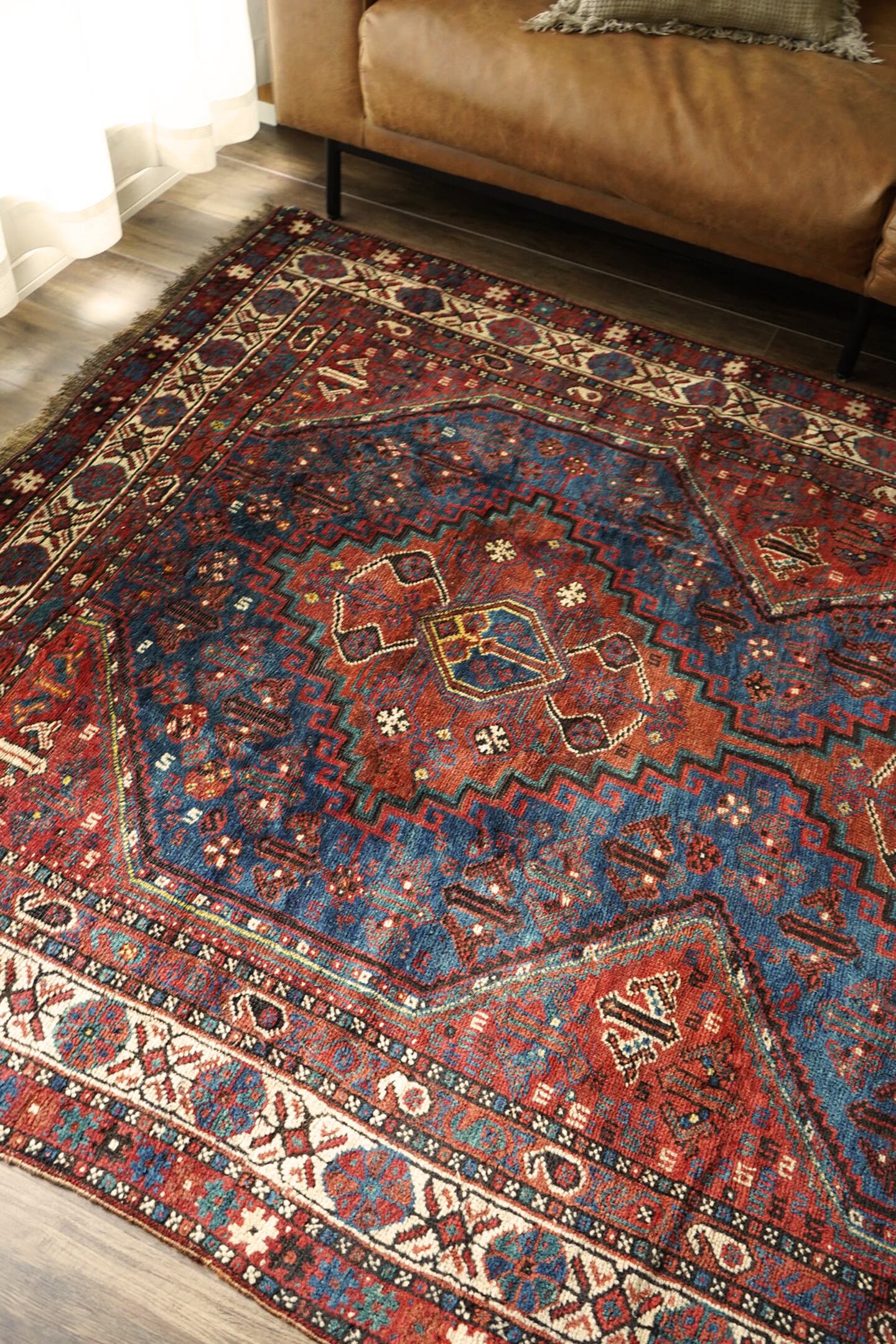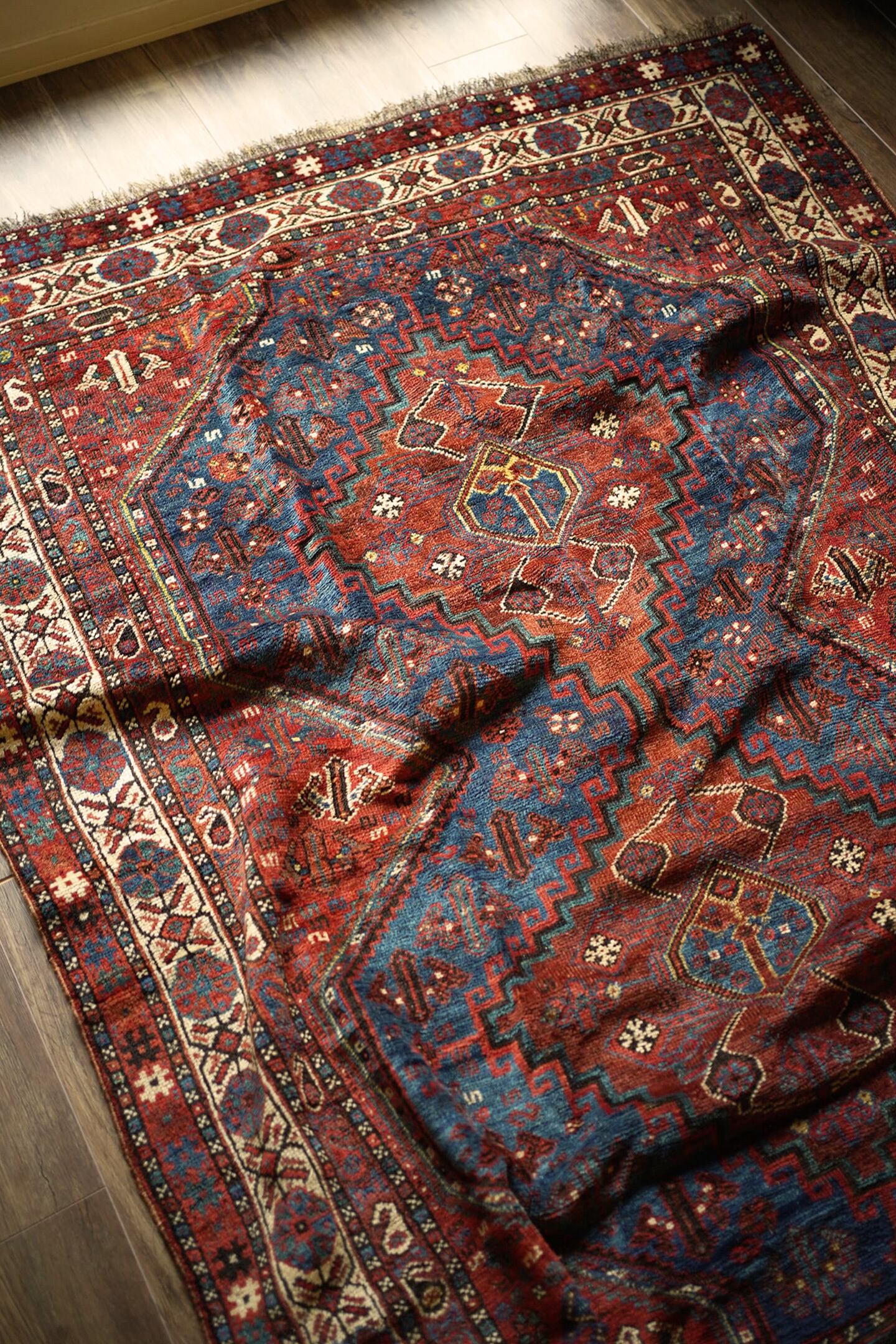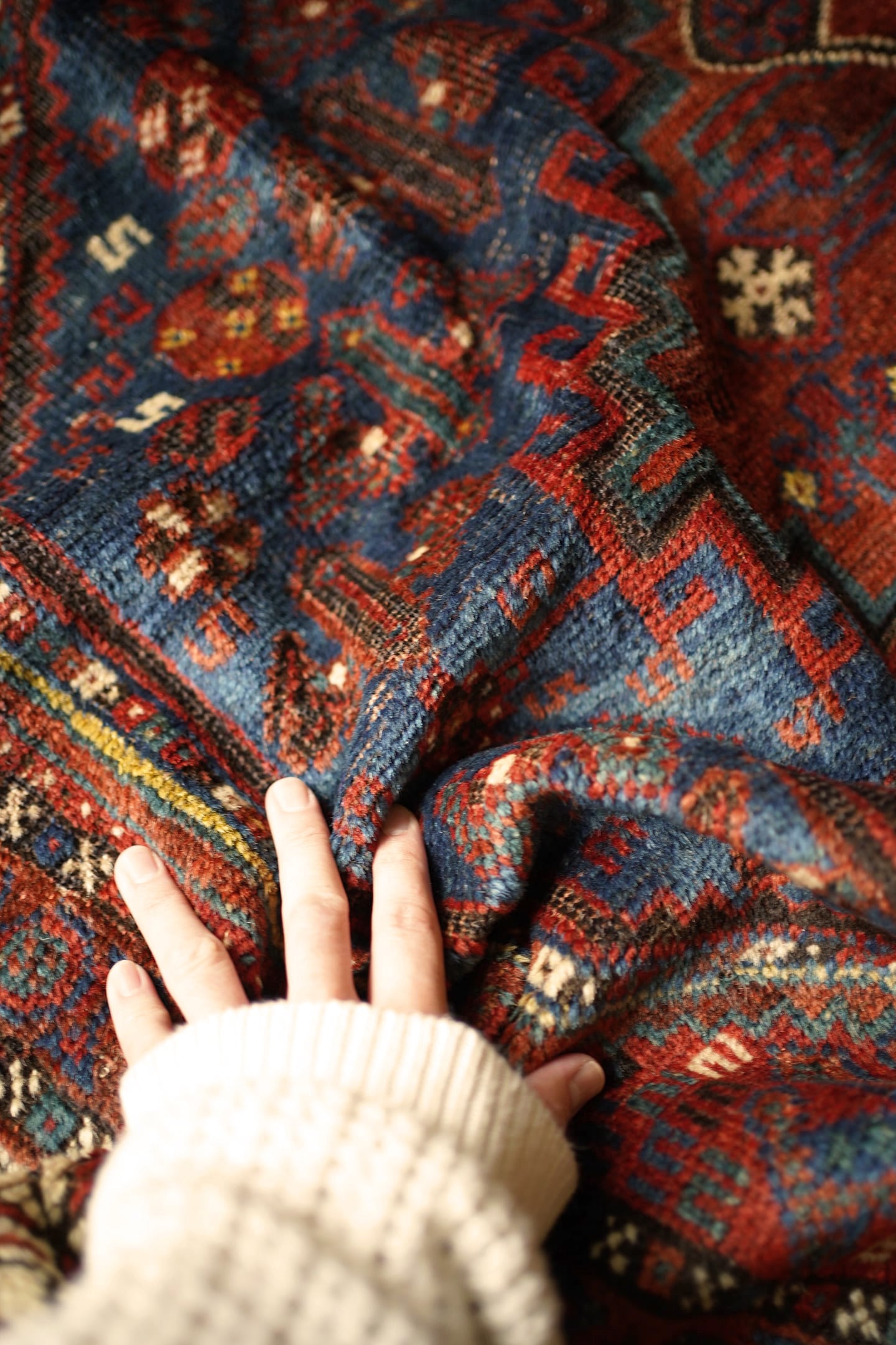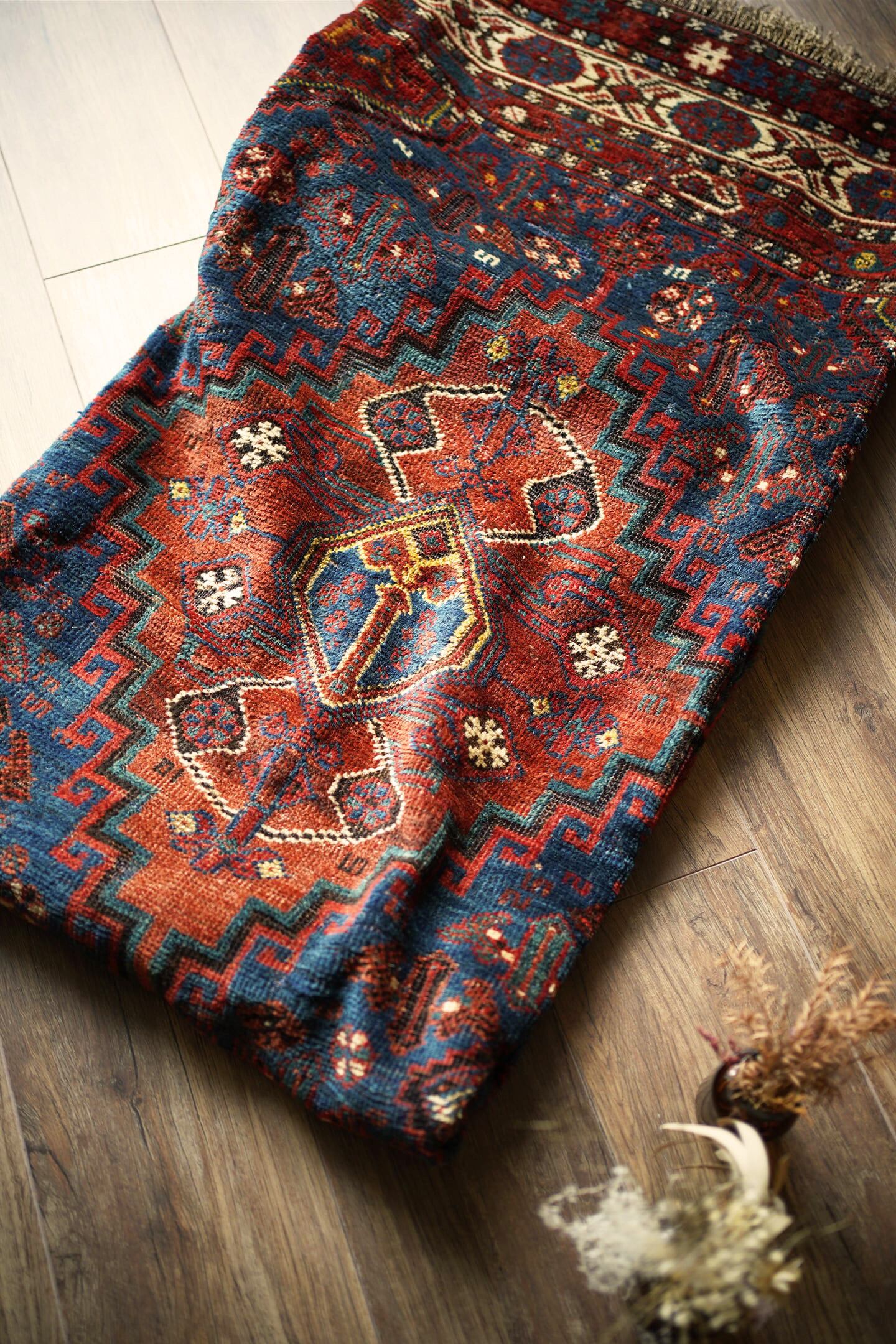 約90年前にイラン南部のハムセ連合によって織られたラグです。奥行きのある暗めの赤と深海を思わせる美しい濃紺のコントラストが魅力的な一枚で、アンティーク特有の年季を重ねた渋い風合いを兼ね備えています。経年により増した艶が素晴らしく、パイルに光が差し込むと美しい光沢を放ちます。表面はふわっと柔らかい肌触りで、厚みは5mm程度。パイルが少し薄くなっている箇所もありますが、全体的に目立った補修跡もなくグッドコンディション。歴史を感じさせる素晴らしい質感のラグをぜひ楽しんでください♫