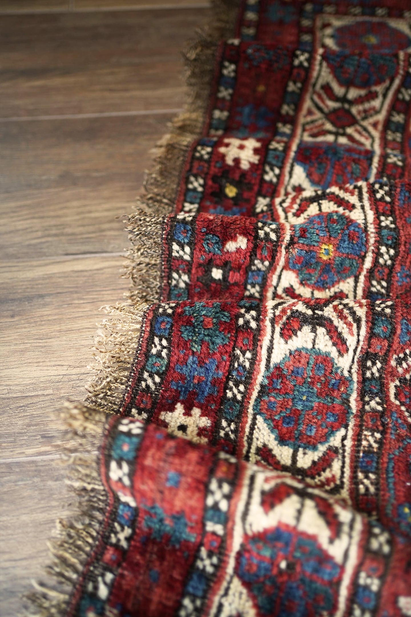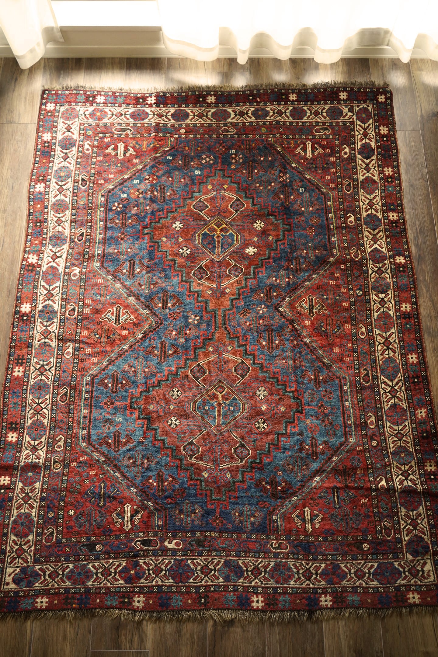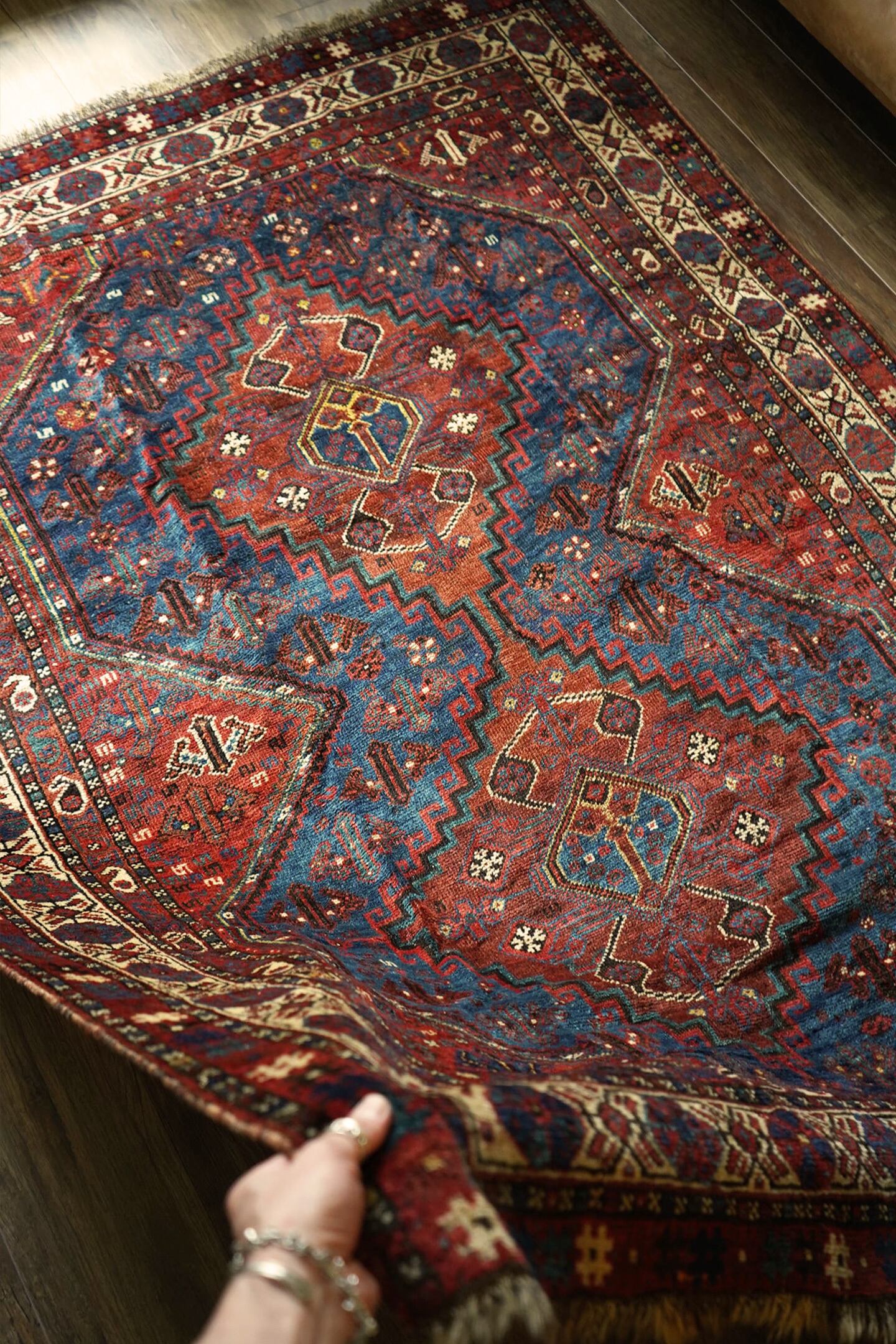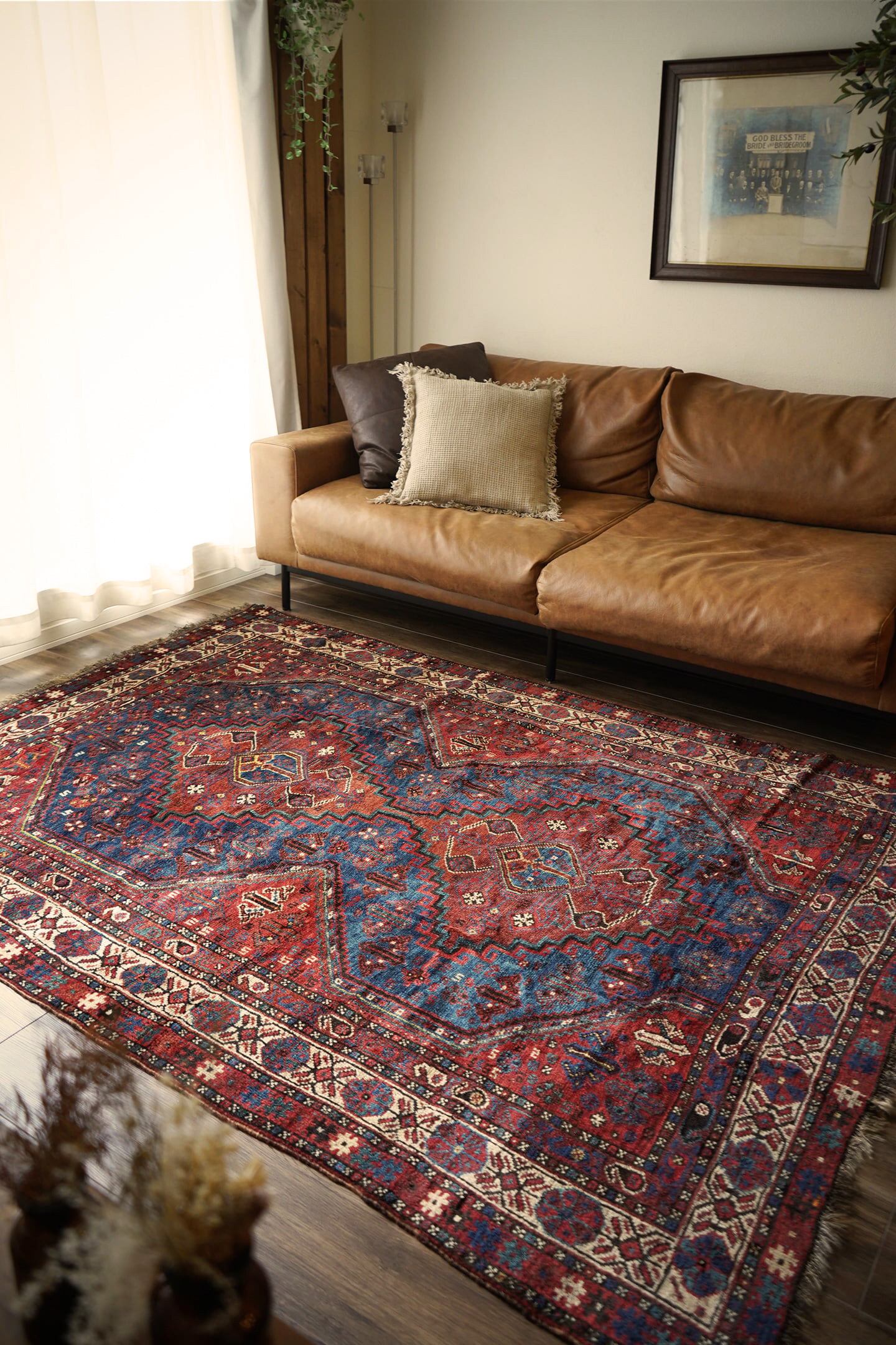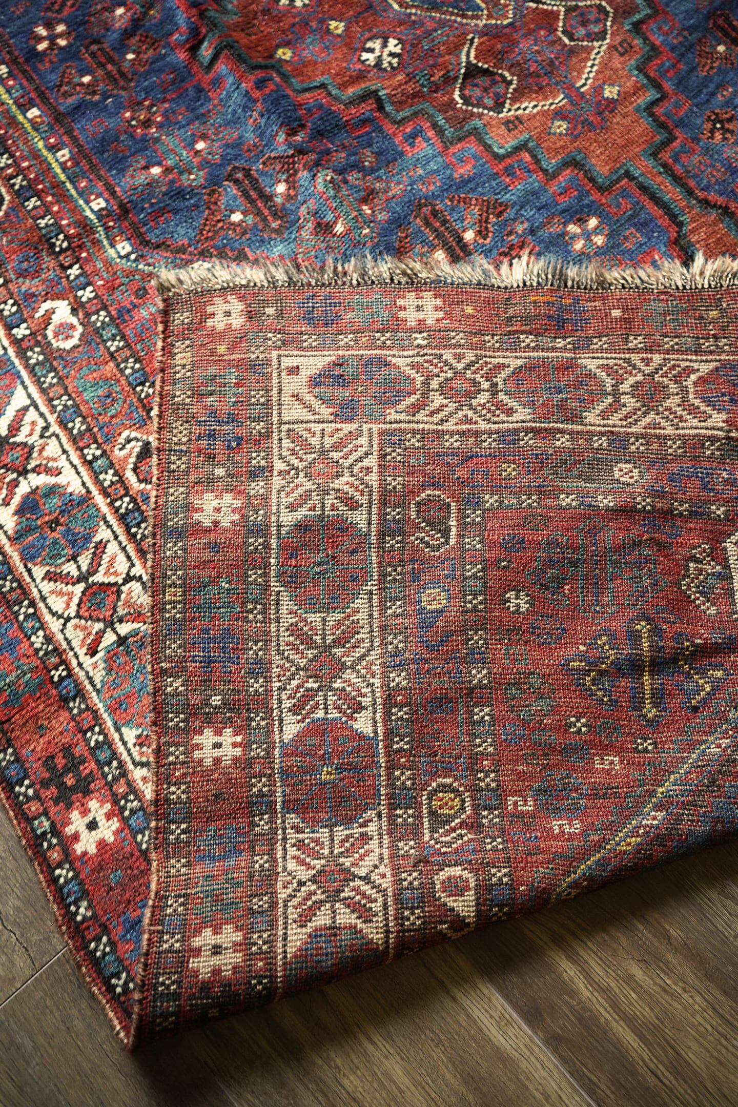 約90年前にイラン南部のハムセ連合によって織られたラグです。奥行きのある暗めの赤と深海を思わせる美しい濃紺のコントラストが魅力的な一枚で、アンティーク特有の年季を重ねた渋い風合いを兼ね備えています。経年により増した艶が素晴らしく、パイルに光が差し込むと美しい光沢を放ちます。表面はふわっと柔らかい肌触りで、厚みは5mm程度。パイルが少し薄くなっている箇所もありますが、全体的に目立った補修跡もなくグッドコンディション。歴史を感じさせる素晴らしい質感のラグをぜひ楽しんでください♫