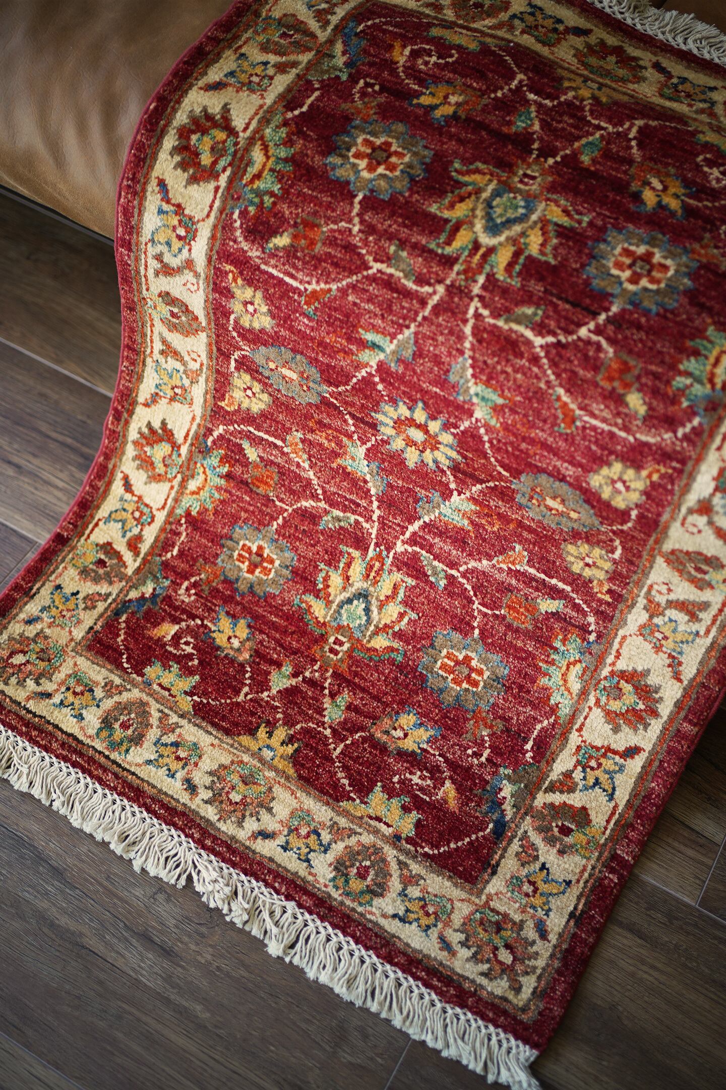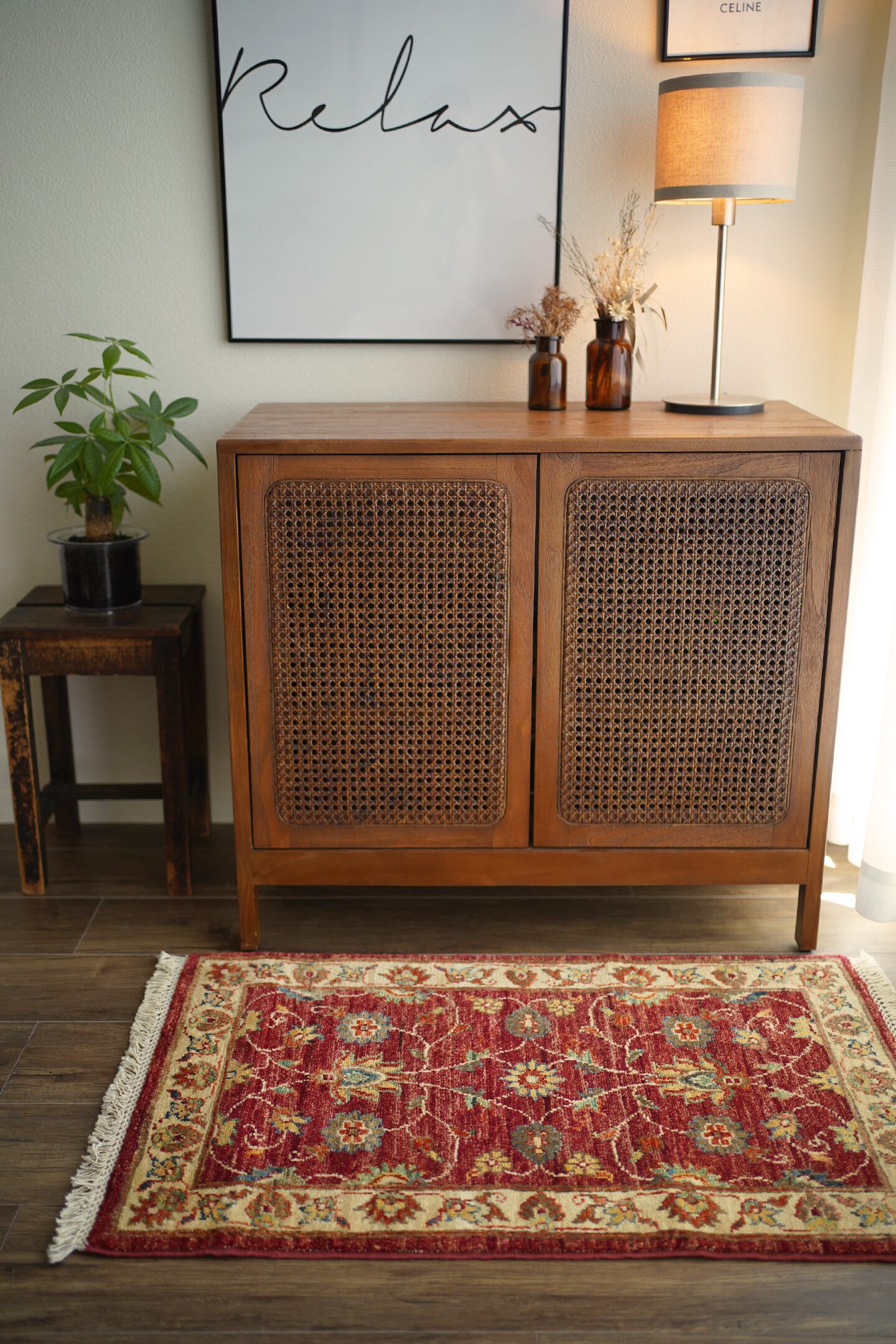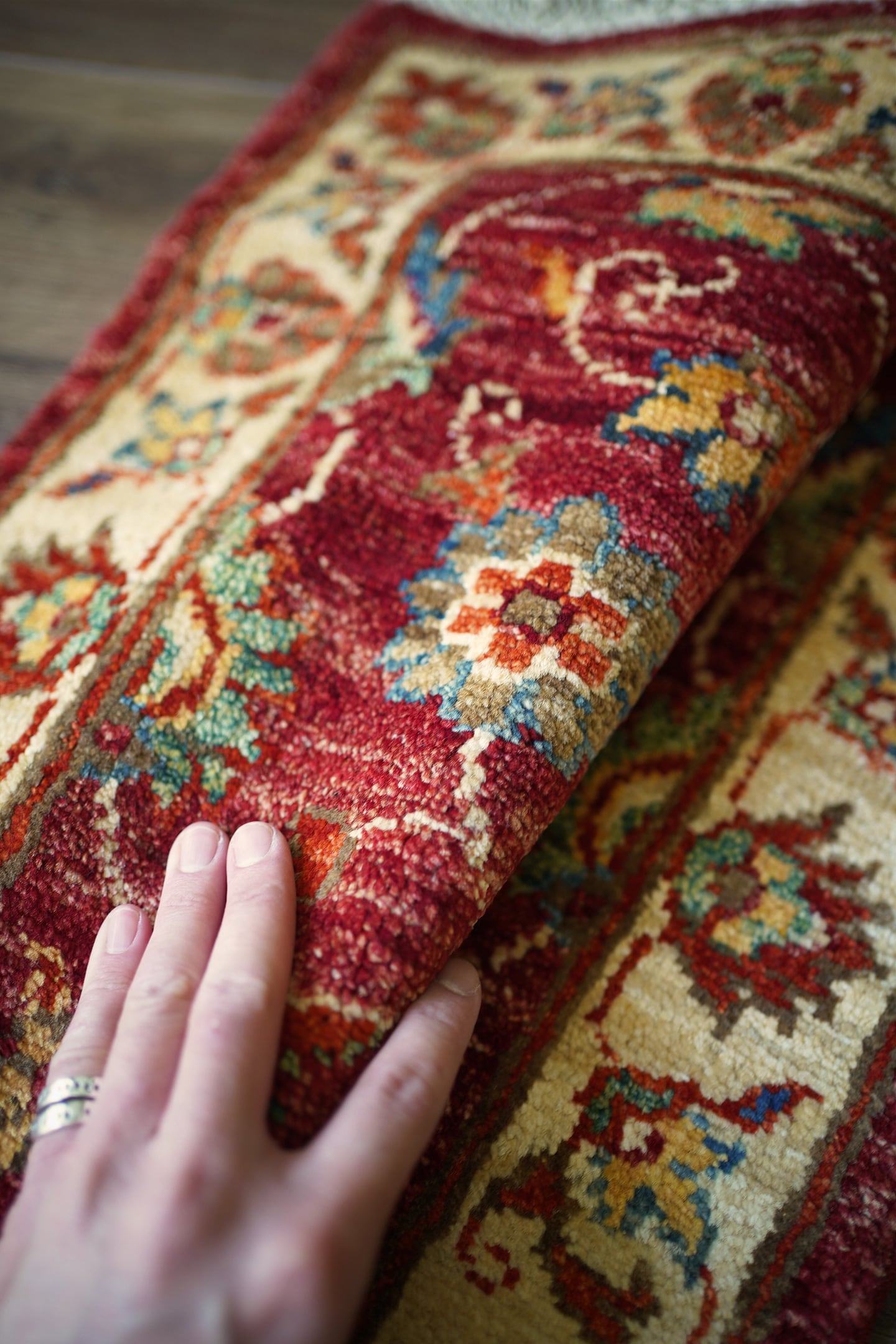 パキスタンとアフガニスタンの国境地域で作られた経年約10年〜15年のチョビラグ。当店の中では年代が浅く、比較的新しめのラグとなります。草花が織り込まれたフローラルで可憐なデザインが素敵で、赤とベージュのコントラストが美しい色合いです。厚みは7㎜ほどで、表面のパイルはふわっと滑らかな肌触りをしています。コンディションもパーフェクトな一枚。玄関やシェルフやキャビネットの前などお気に入りのスペースにどうぞ♫