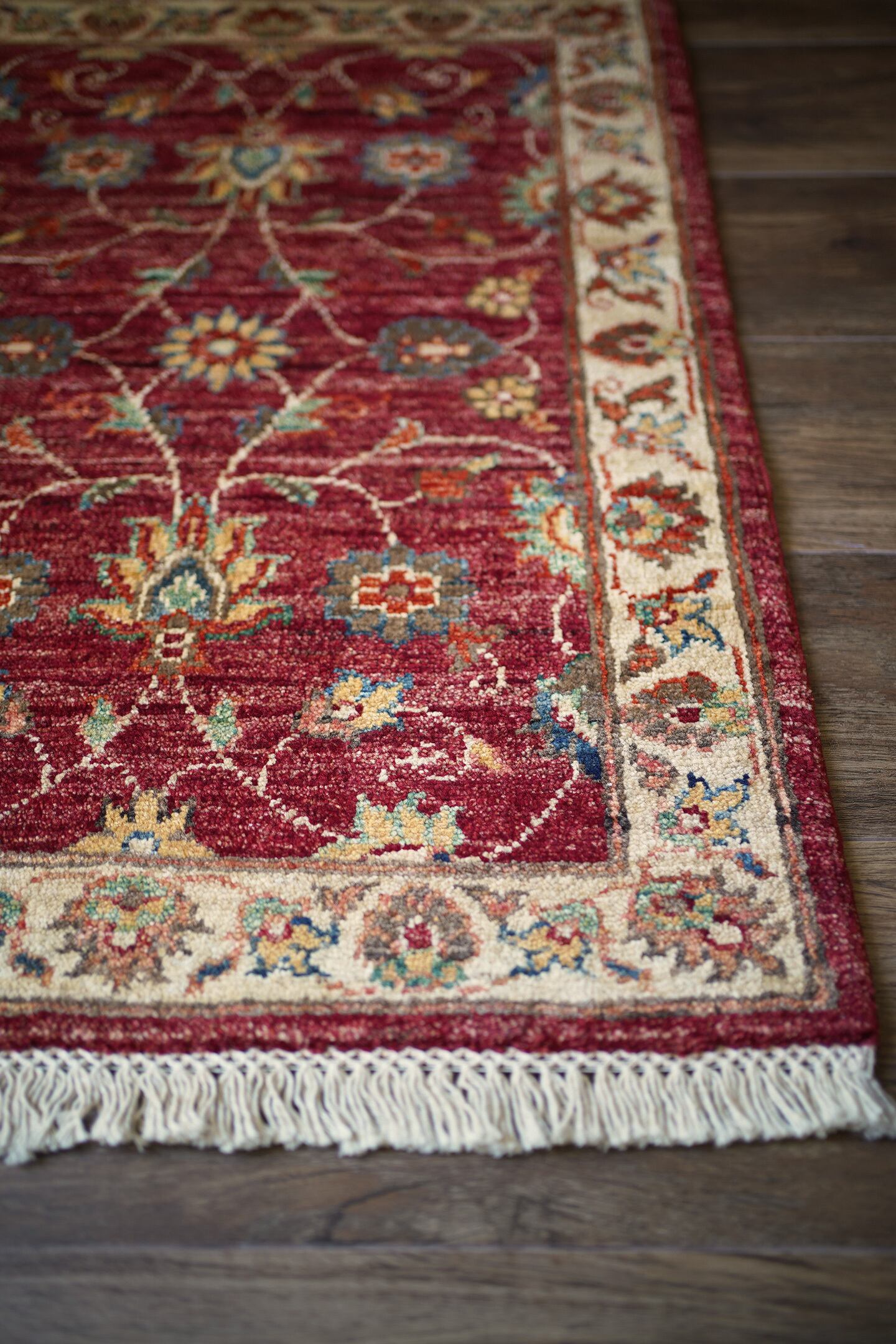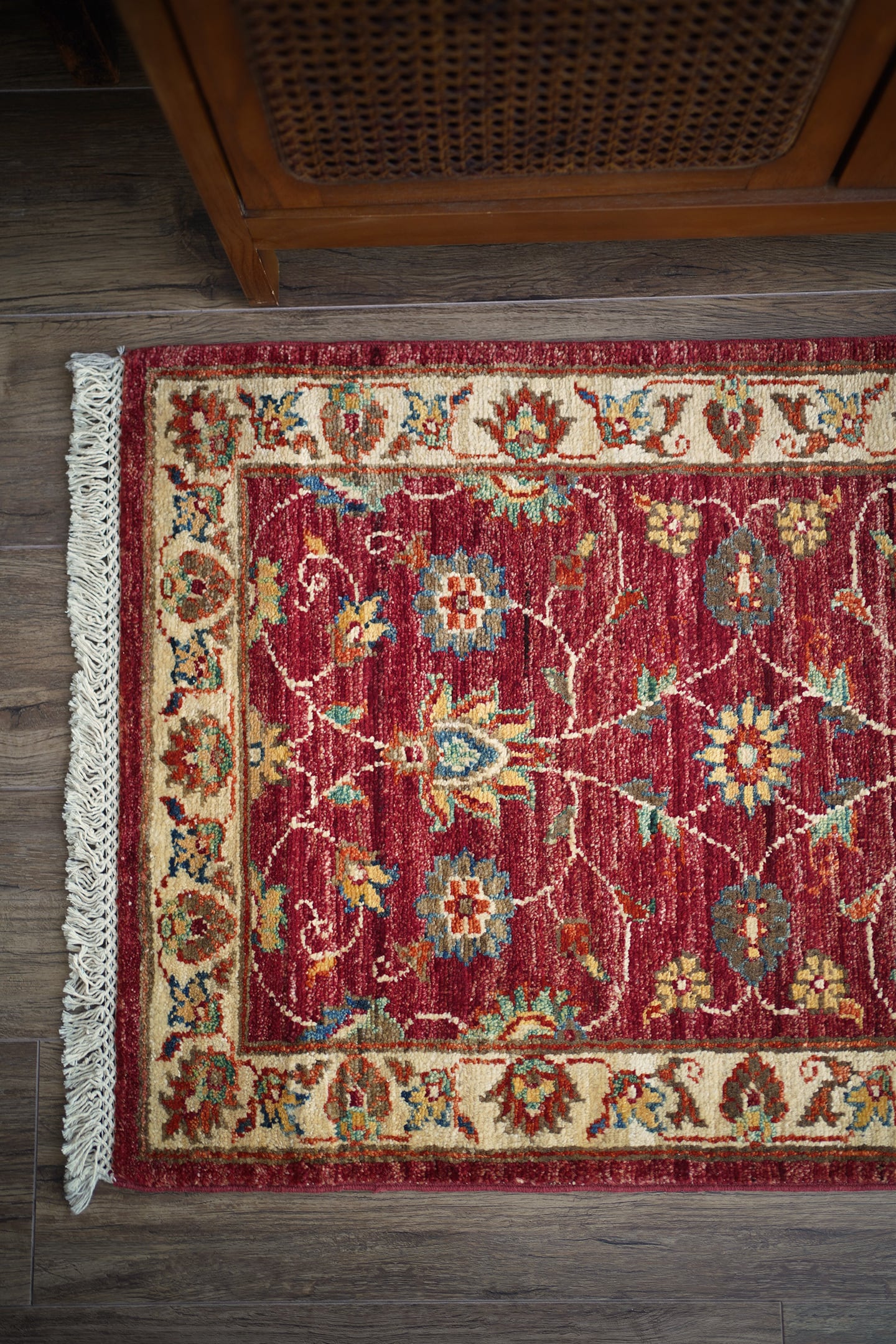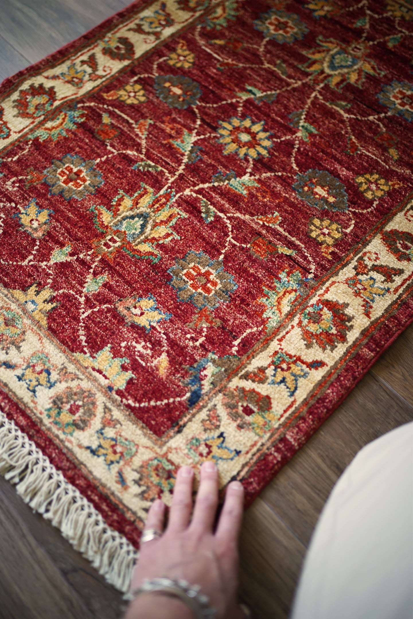 パキスタンとアフガニスタンの国境地域で作られた経年約10年〜15年のチョビラグ。当店の中では年代が浅く、比較的新しめのラグとなります。草花が織り込まれたフローラルで可憐なデザインが素敵で、赤とベージュのコントラストが美しい色合いです。厚みは7㎜ほどで、表面のパイルはふわっと滑らかな肌触りをしています。コンディションもパーフェクトな一枚。玄関やシェルフやキャビネットの前などお気に入りのスペースにどうぞ♫