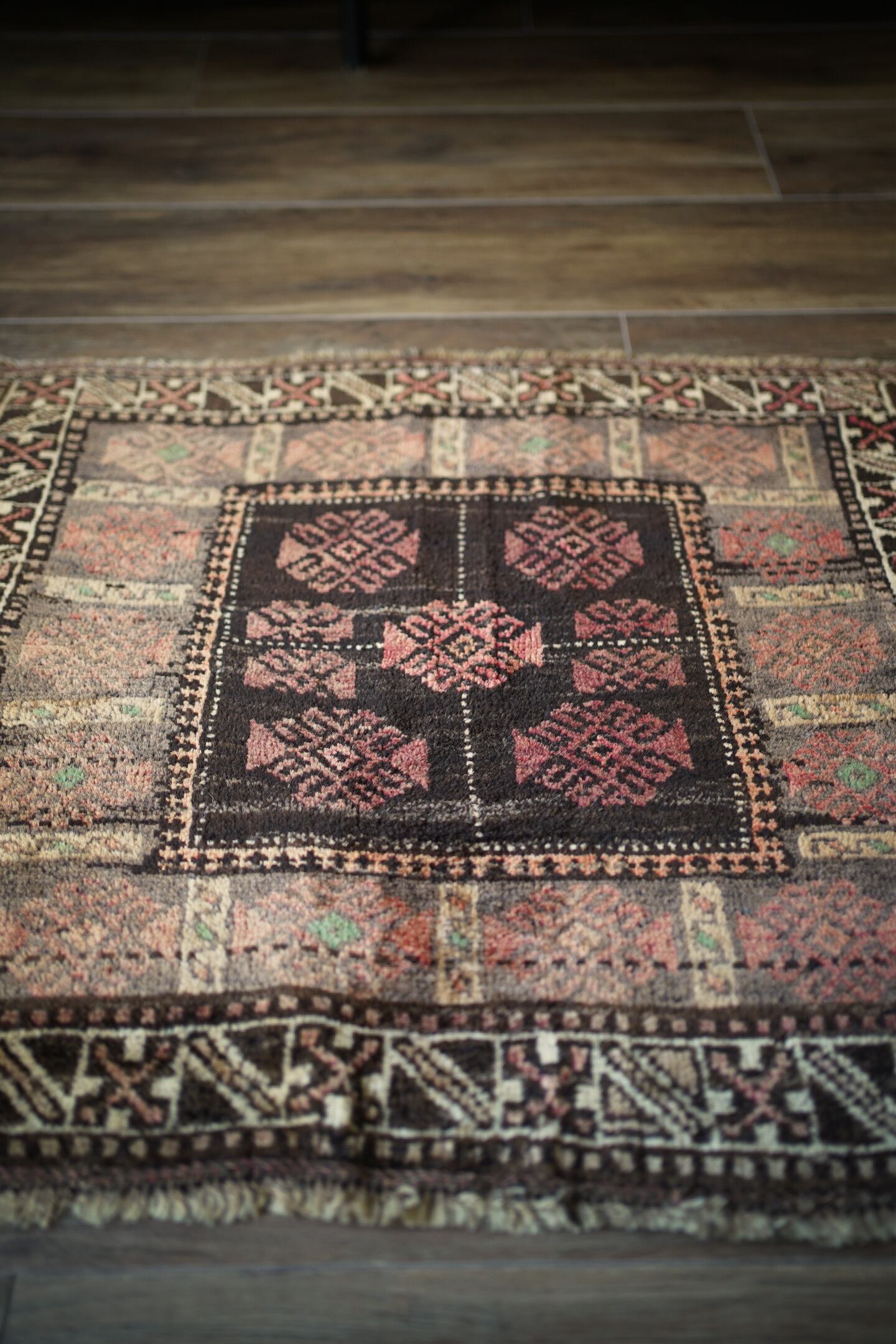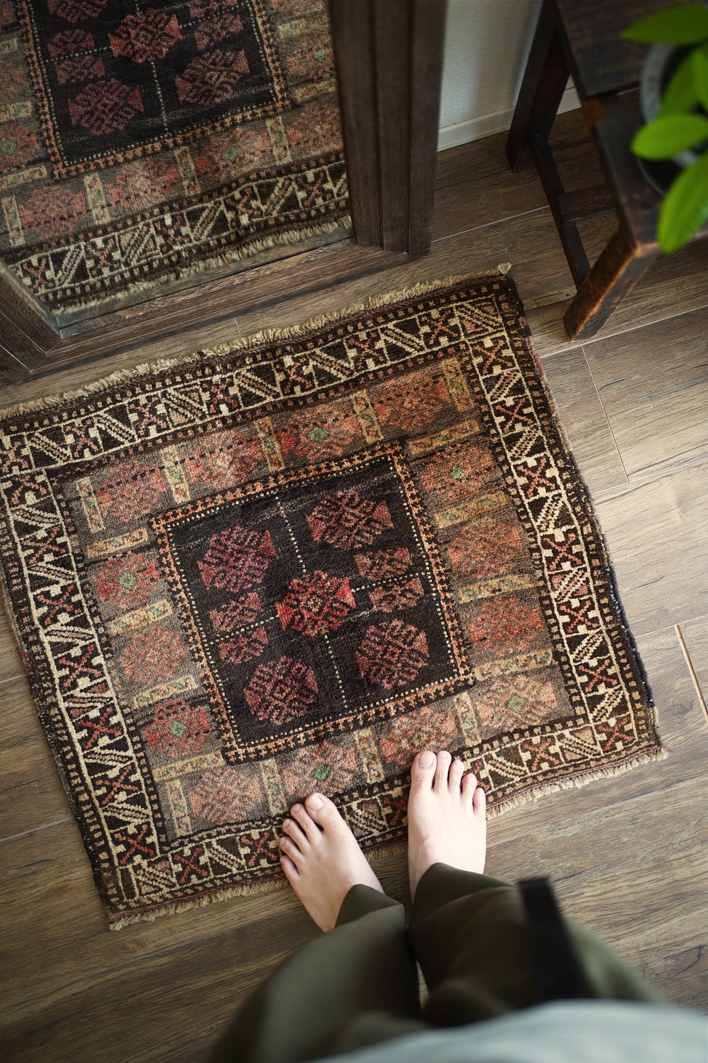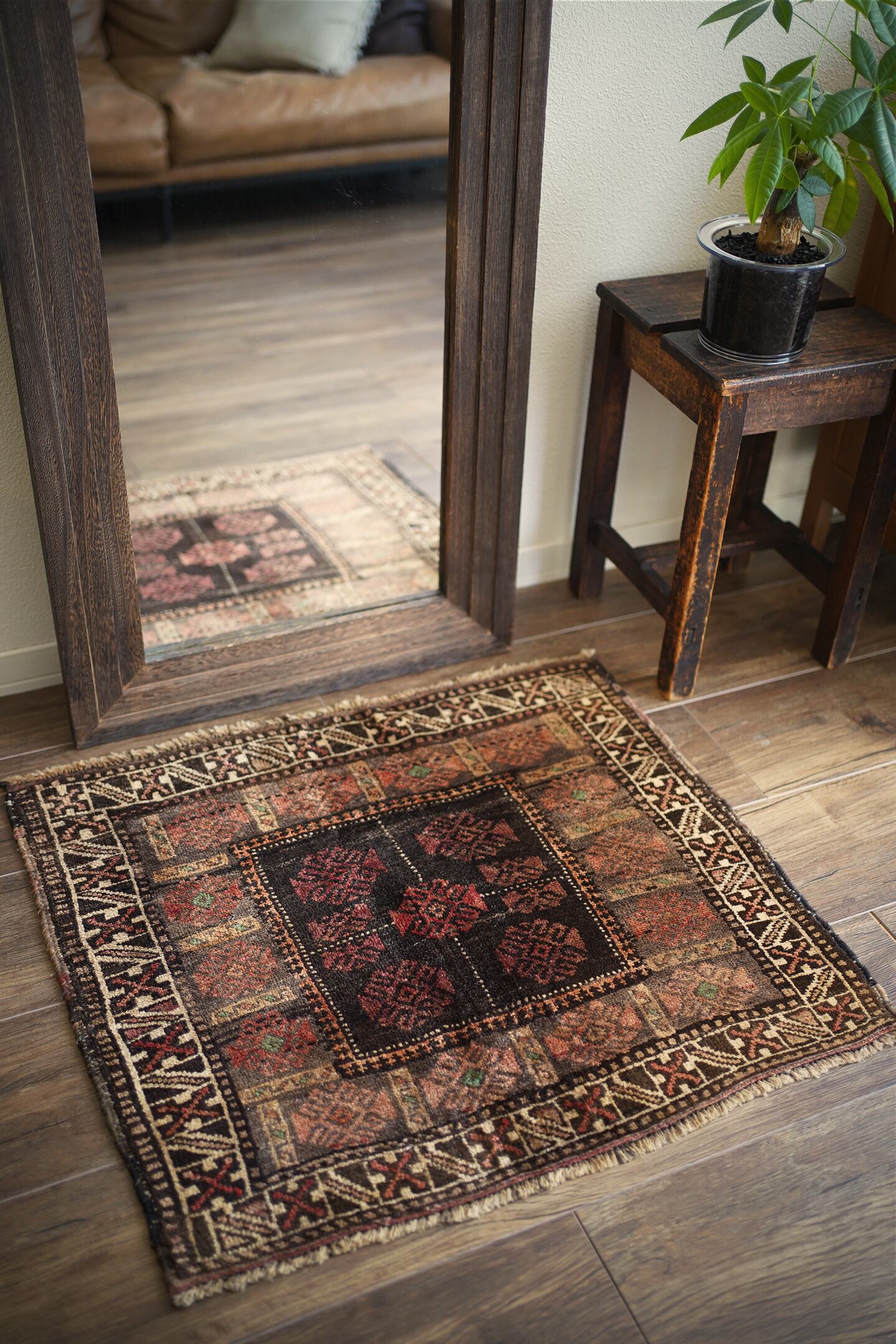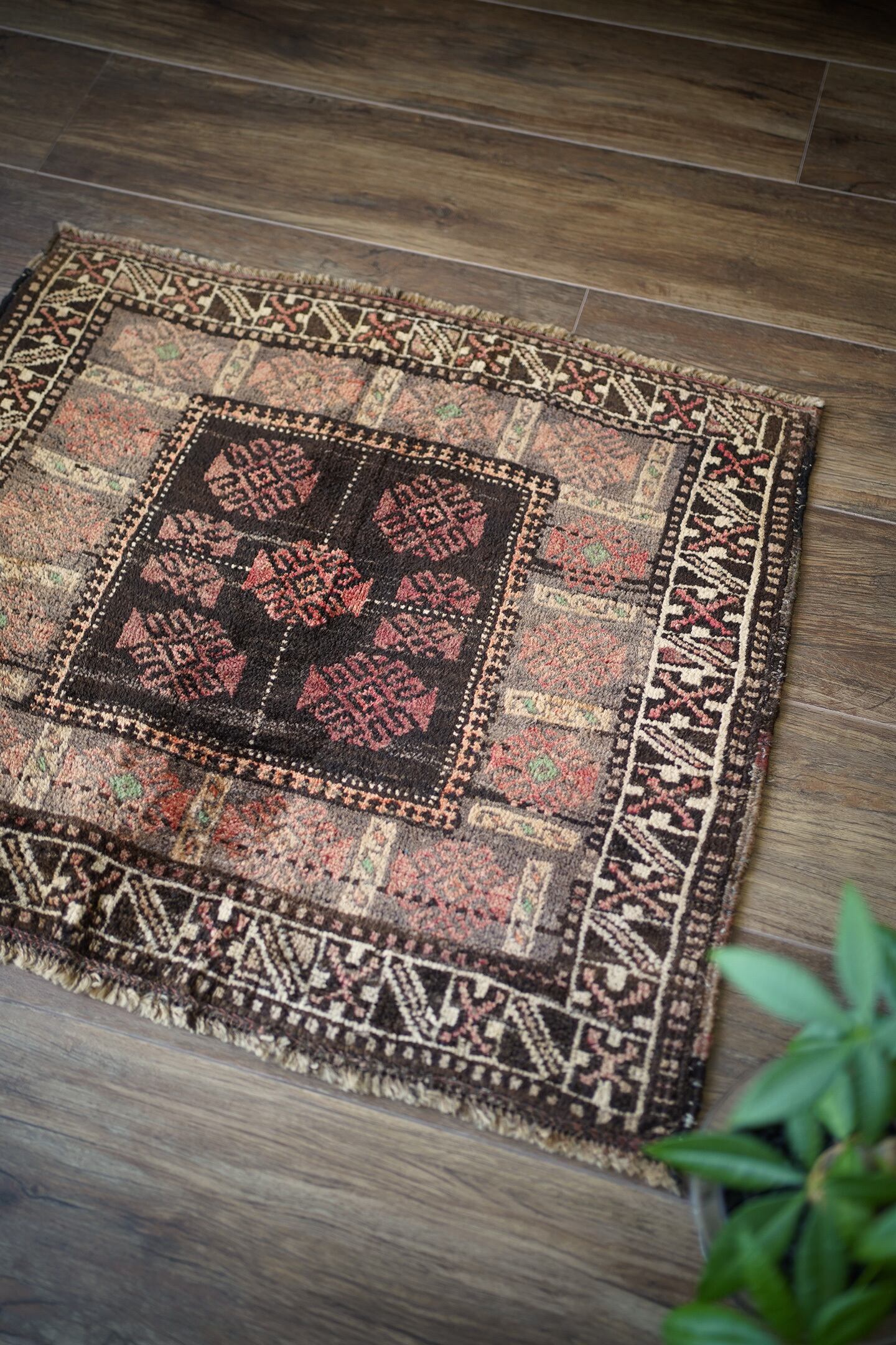 おおよそ60年前にバルーチ族によって織られたアフガニスタン産のヴィンテージラグ。色褪せた渋い風合いと色味が魅力的な一枚で、配色は茶色、薄茶色、ベージュ、サーモンピンクなどが使われています。こちらのラグは敷く向きや見る角度によって白っぽく見えたり、暗く見えます。表面はふわっと滑らかで気持ちの良い肌触り。厚みは5mm程度です。目立った補修跡やダメージもなく、グッドコンディション。スクエアタイプなので使い勝手も良く、玄関や洗面所をはじめ、色んな場所で活躍してくれるかと思います♫