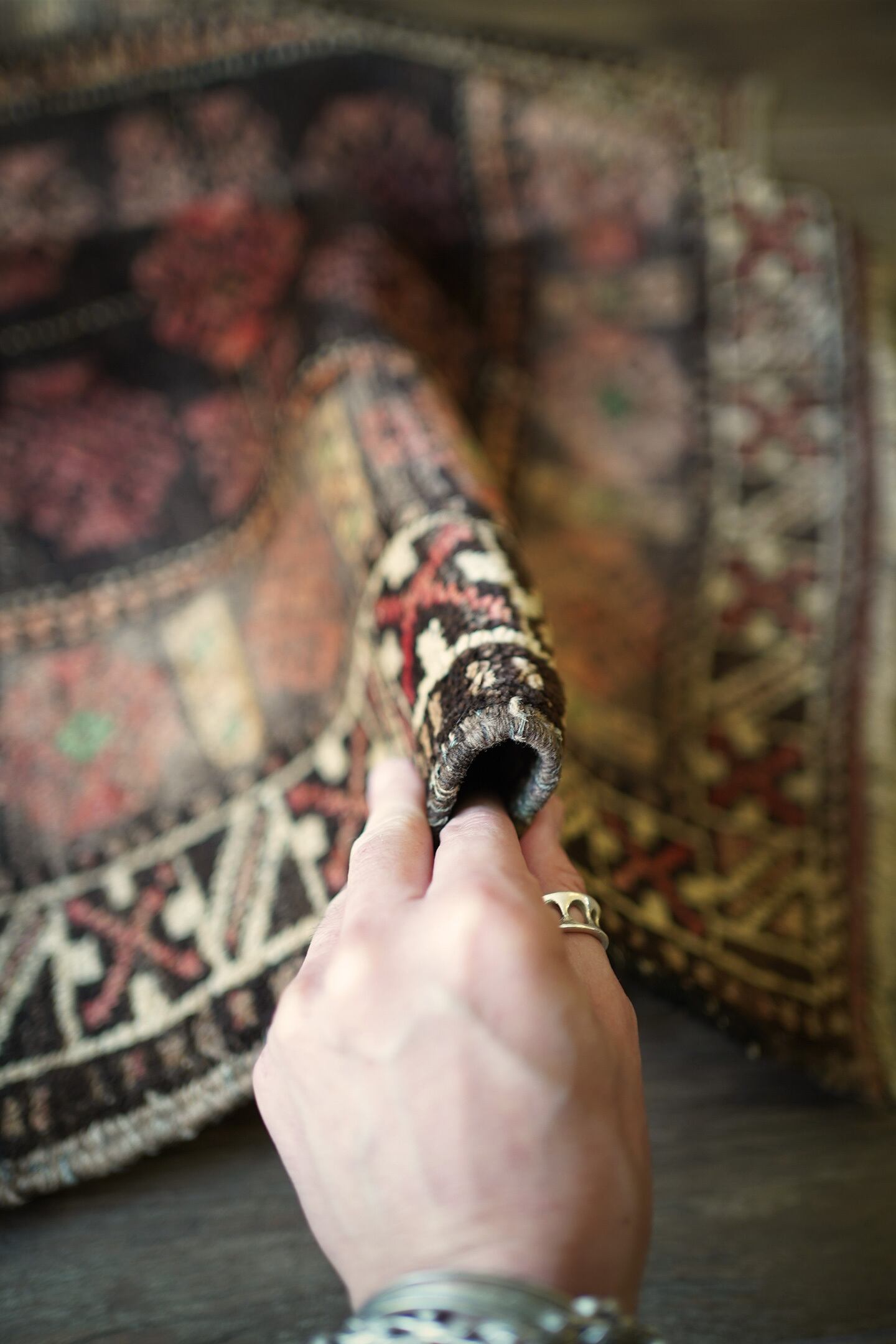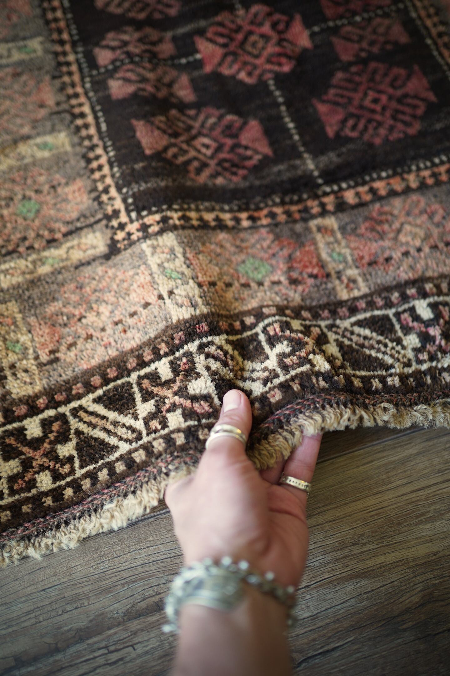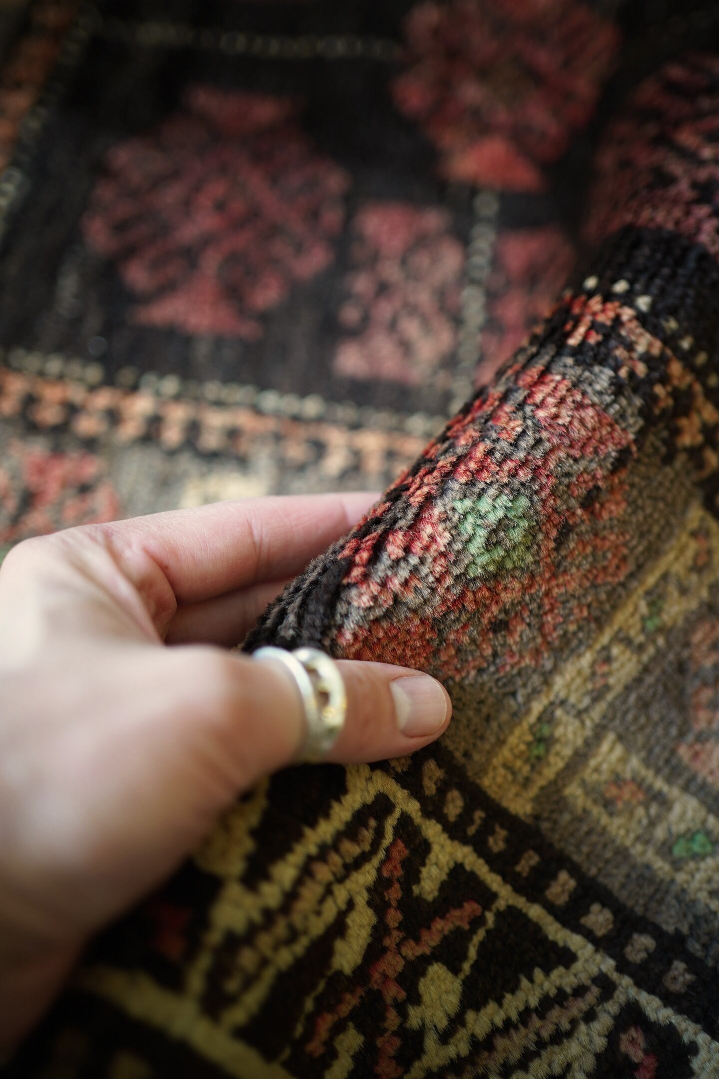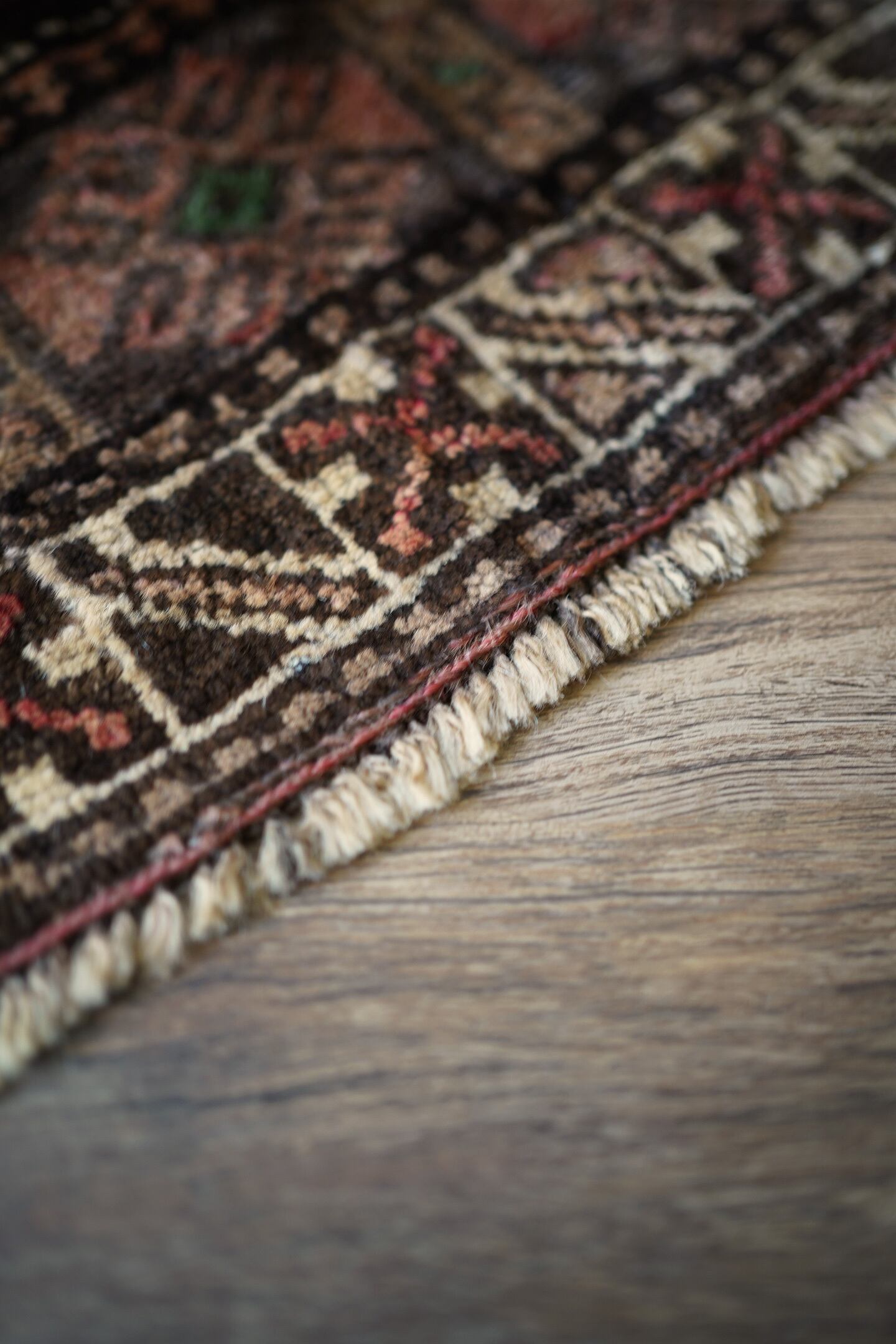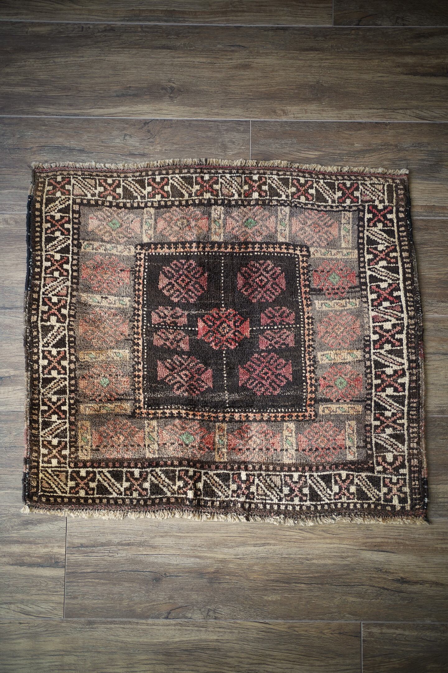 おおよそ60年前にバルーチ族によって織られたアフガニスタン産のヴィンテージラグ。色褪せた渋い風合いと色味が魅力的な一枚で、配色は茶色、薄茶色、ベージュ、サーモンピンクなどが使われています。こちらのラグは敷く向きや見る角度によって白っぽく見えたり、暗く見えます。表面はふわっと滑らかで気持ちの良い肌触り。厚みは5mm程度です。目立った補修跡やダメージもなく、グッドコンディション。スクエアタイプなので使い勝手も良く、玄関や洗面所をはじめ、色んな場所で活躍してくれるかと思います♫