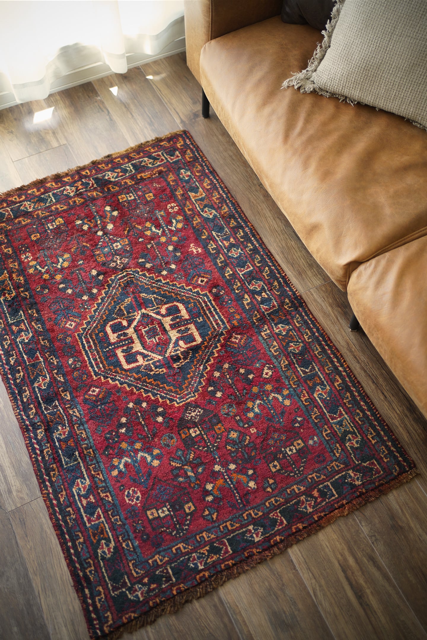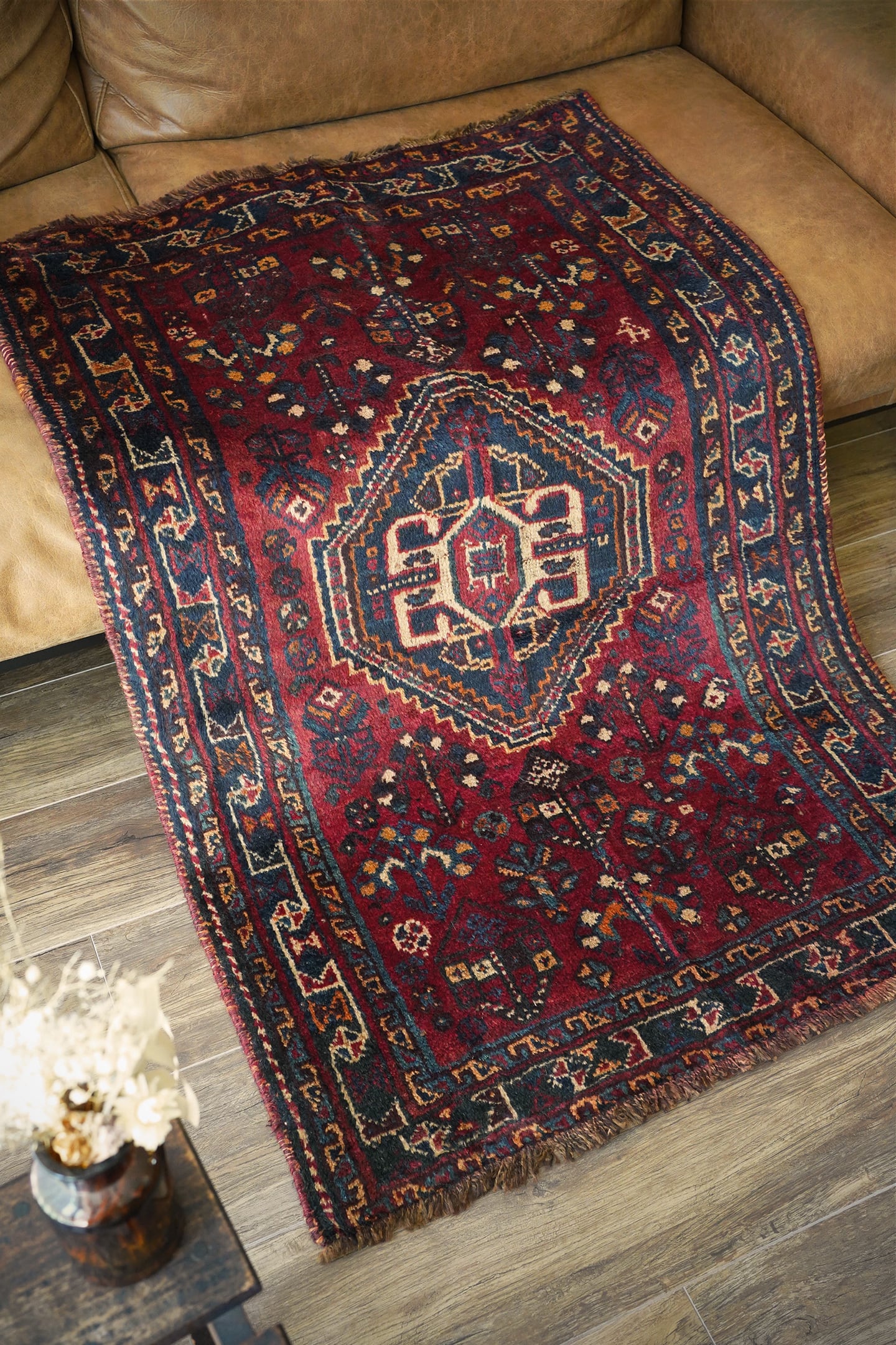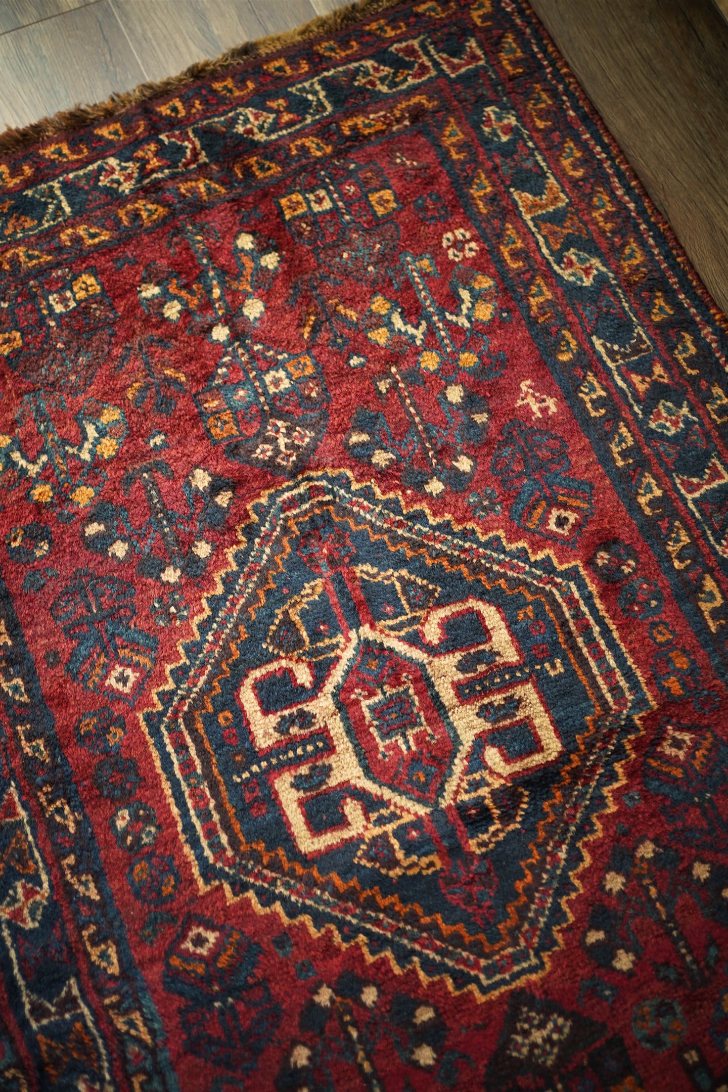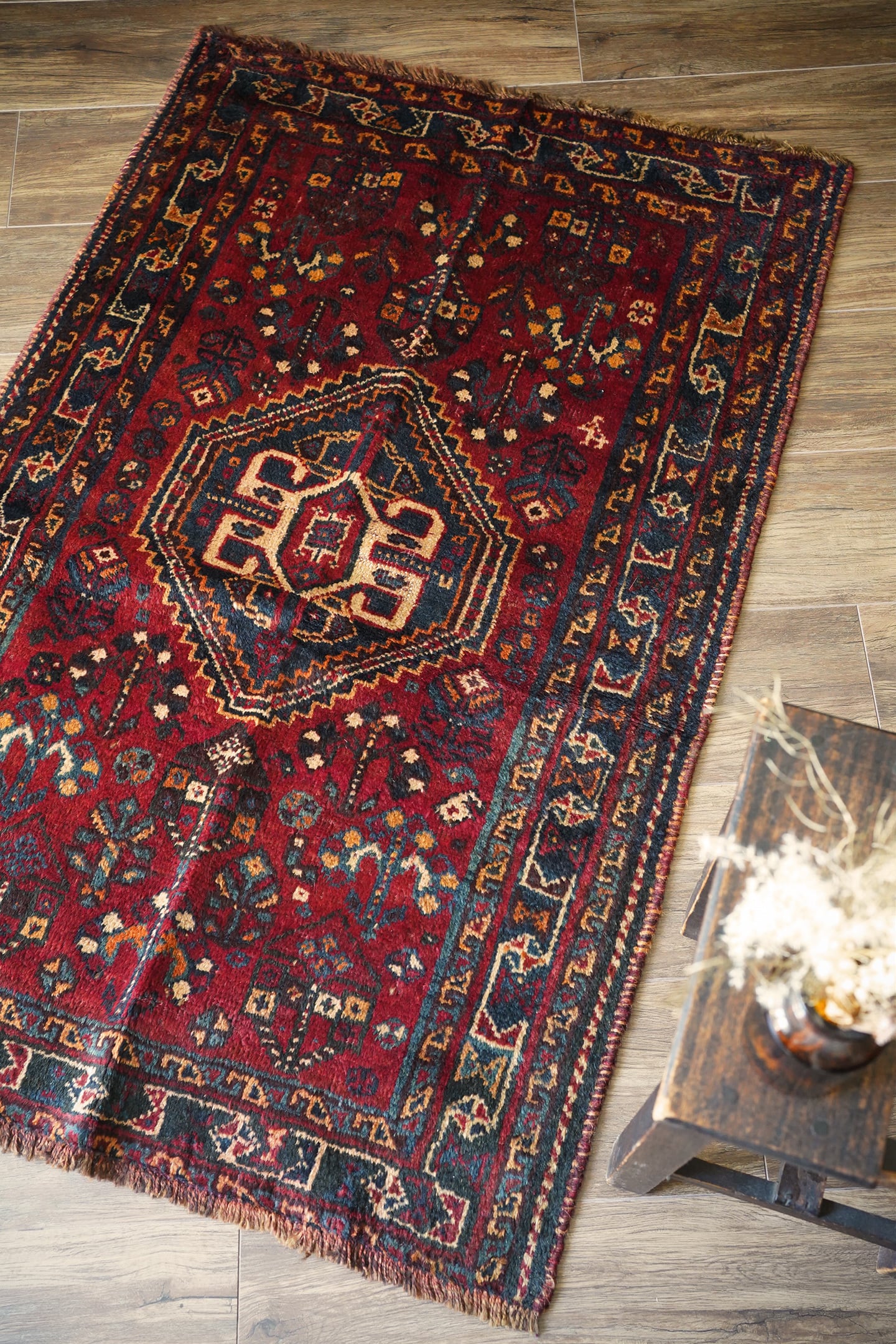 おおよそ60年前に織られたシラーズカシュガイラグ。深紅色、深緑色、ベージュ、茶色などが使われた深みのある色合いで、ヴィンテージを感じる渋い風合いです。中央に織り込まれたカシュガイメダリオンが象徴的なデザインで、メダリオンの周りには花の紋様で埋め尽くされています。6.5㎜程度の厚みで、表面はふわっと滑らかな肌触りをしています。パイルが少し薄くなっているところもありますが全く目立たず、全体的にグッドコンディション。リビングや寝室などお好みのスペースにどうぞ。