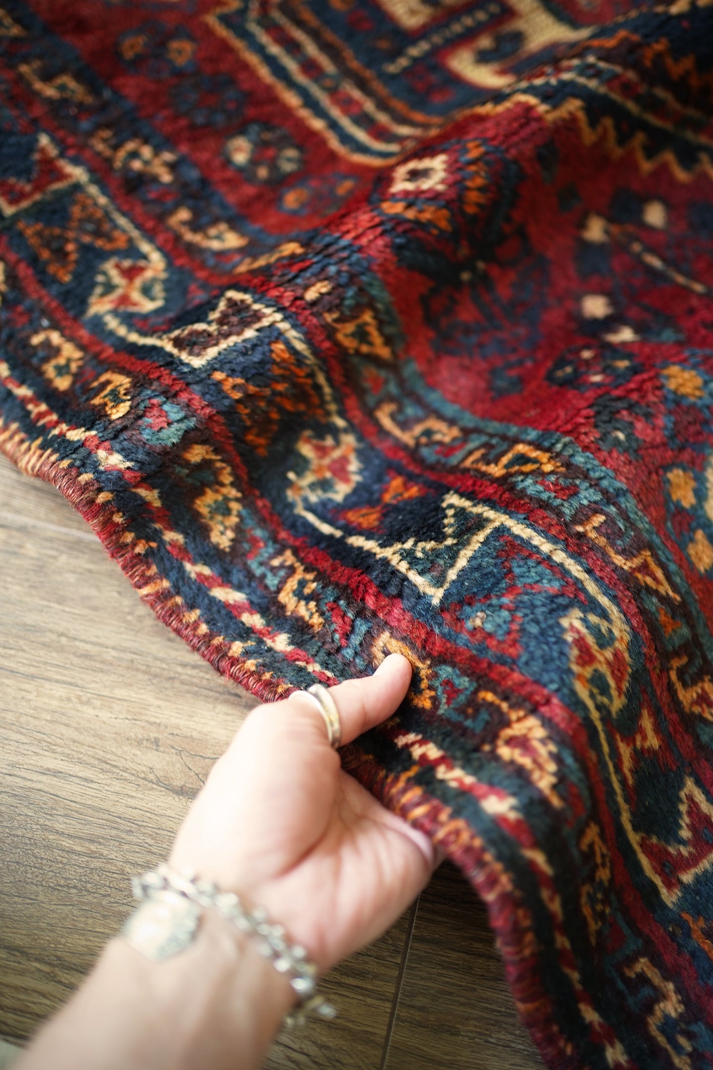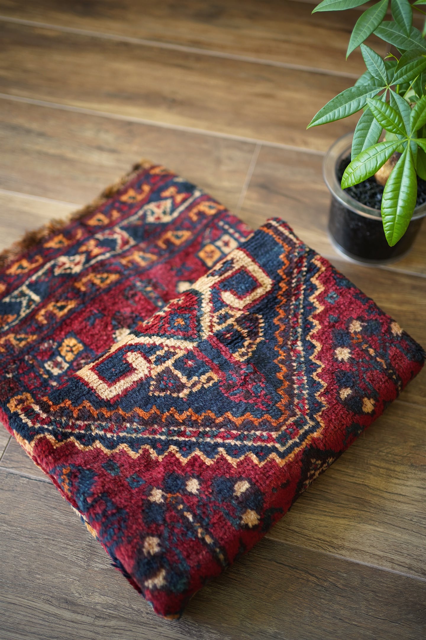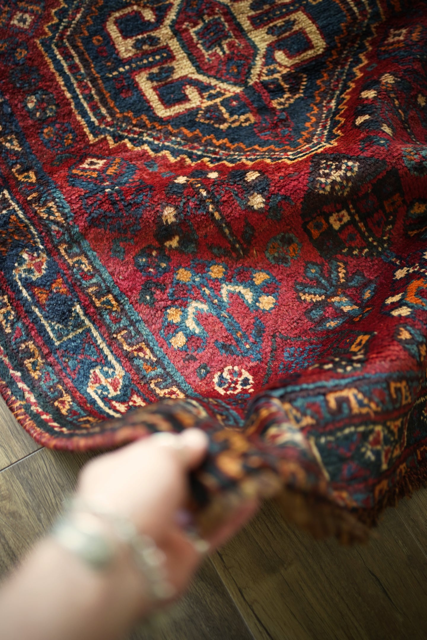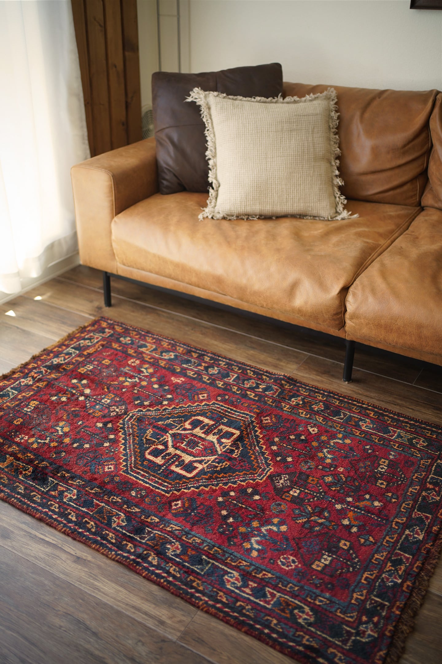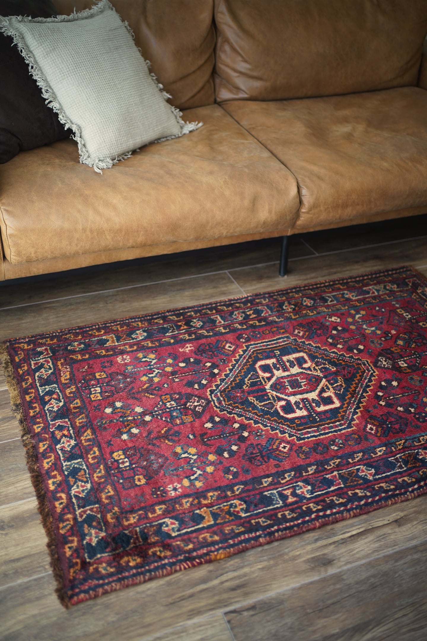 おおよそ60年前に織られたシラーズカシュガイラグ。深紅色、深緑色、ベージュ、茶色などが使われた深みのある色合いで、ヴィンテージを感じる渋い風合いです。中央に織り込まれたカシュガイメダリオンが象徴的なデザインで、メダリオンの周りには花の紋様で埋め尽くされています。6.5㎜程度の厚みで、表面はふわっと滑らかな肌触りをしています。パイルが少し薄くなっているところもありますが全く目立たず、全体的にグッドコンディション。リビングや寝室などお好みのスペースにどうぞ。