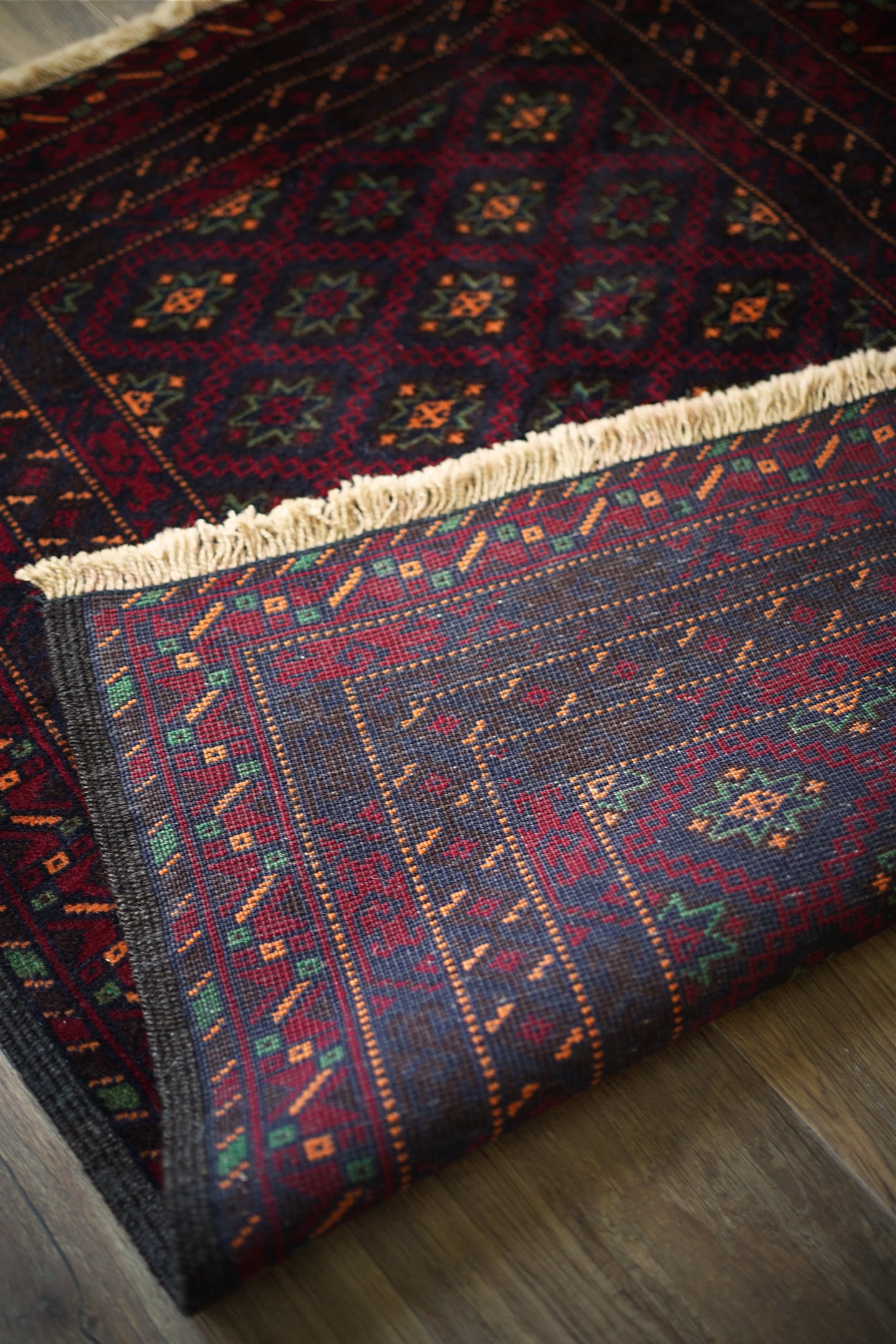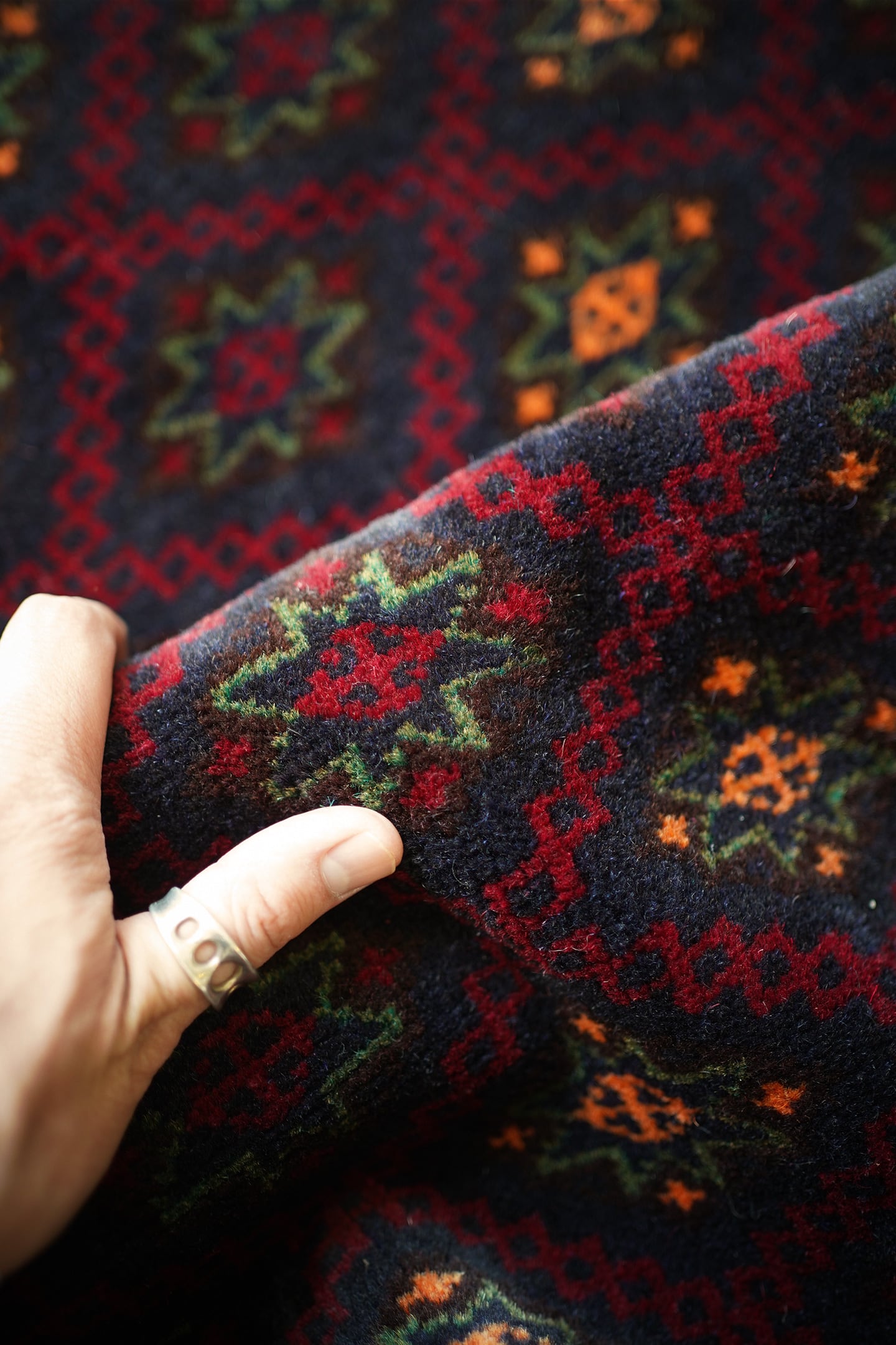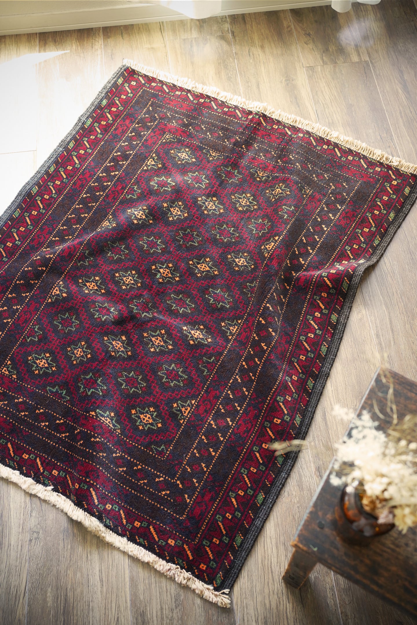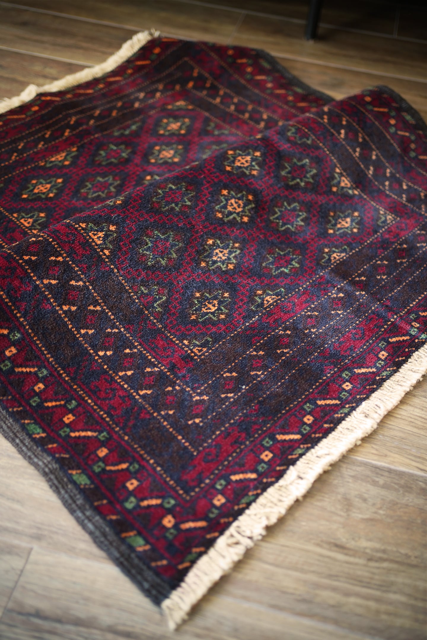 経年約30年のバルーチラグ。深紅色、こげ茶色、深緑色などの暗めでシックなカラーリングに差し色でオレンジ色がアクセントに使われているところが素敵なポイントです。フィールドには"ユルドゥズ"と呼ばれる幸運の象徴である八角星が綺麗な配列で織り込まれています。厚みは5.5㎜程度で、表面はふわっと柔らかく滑らな肌触り。ダメージもなく、パーフェクトコンディション。大きすぎず、小さすぎないサイズ感で玄関やリビングのちょっとしたスペースなどにも良さそうです。