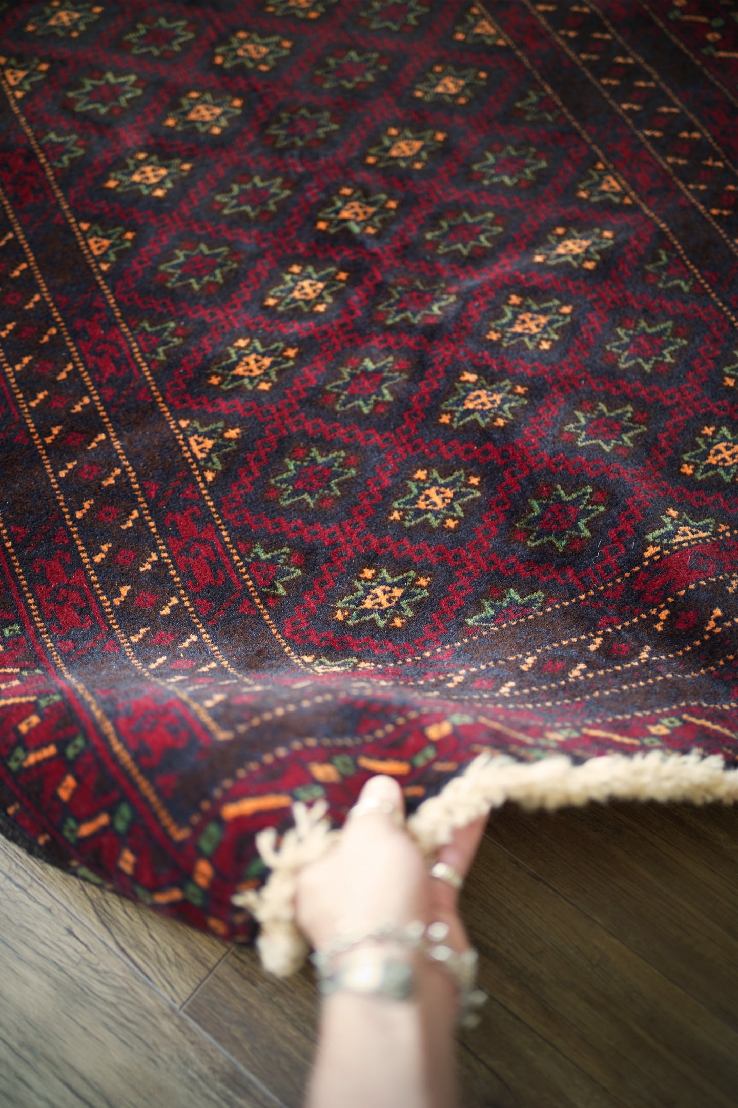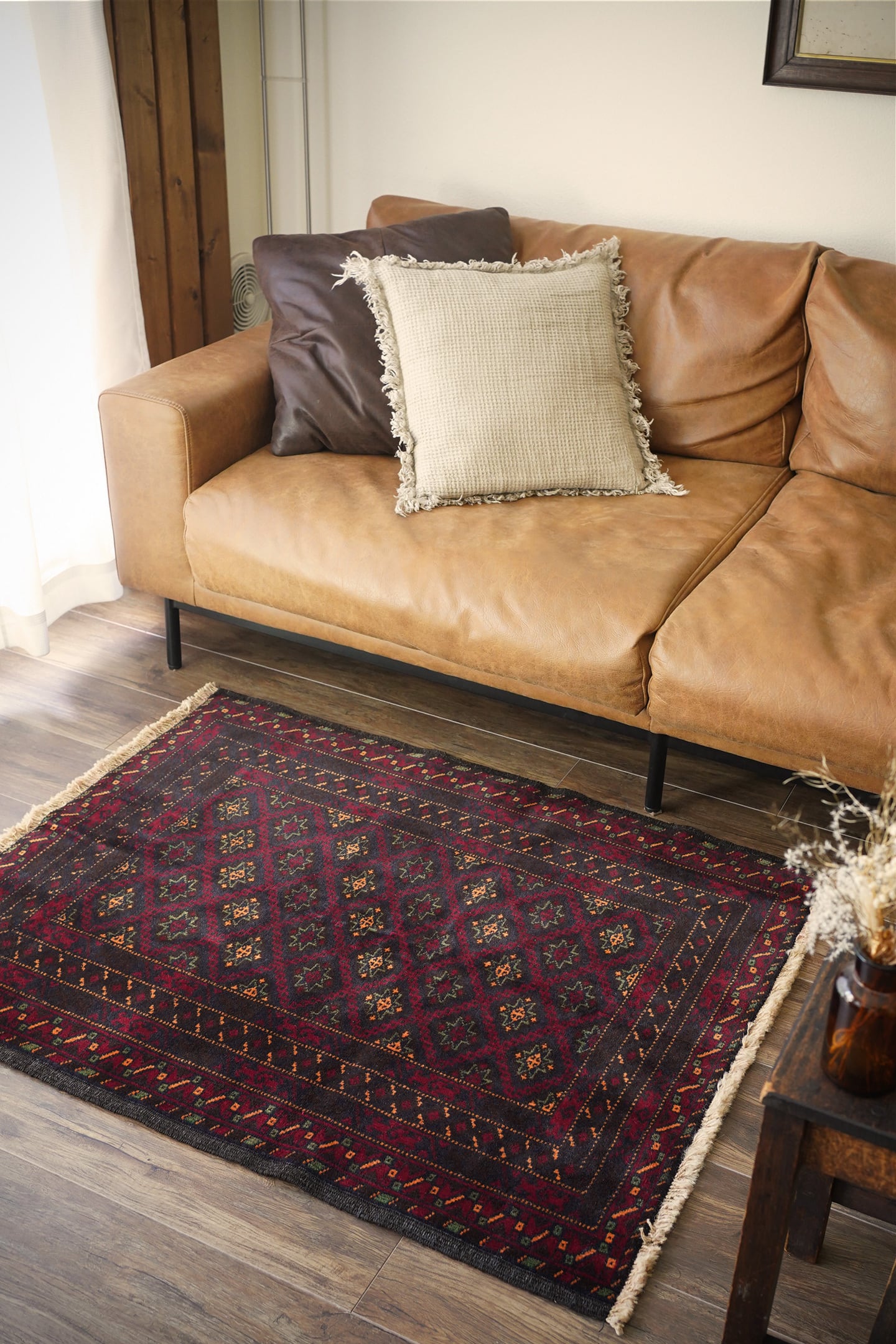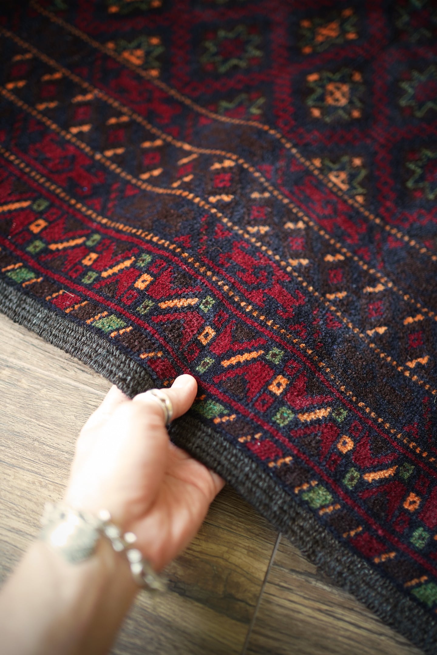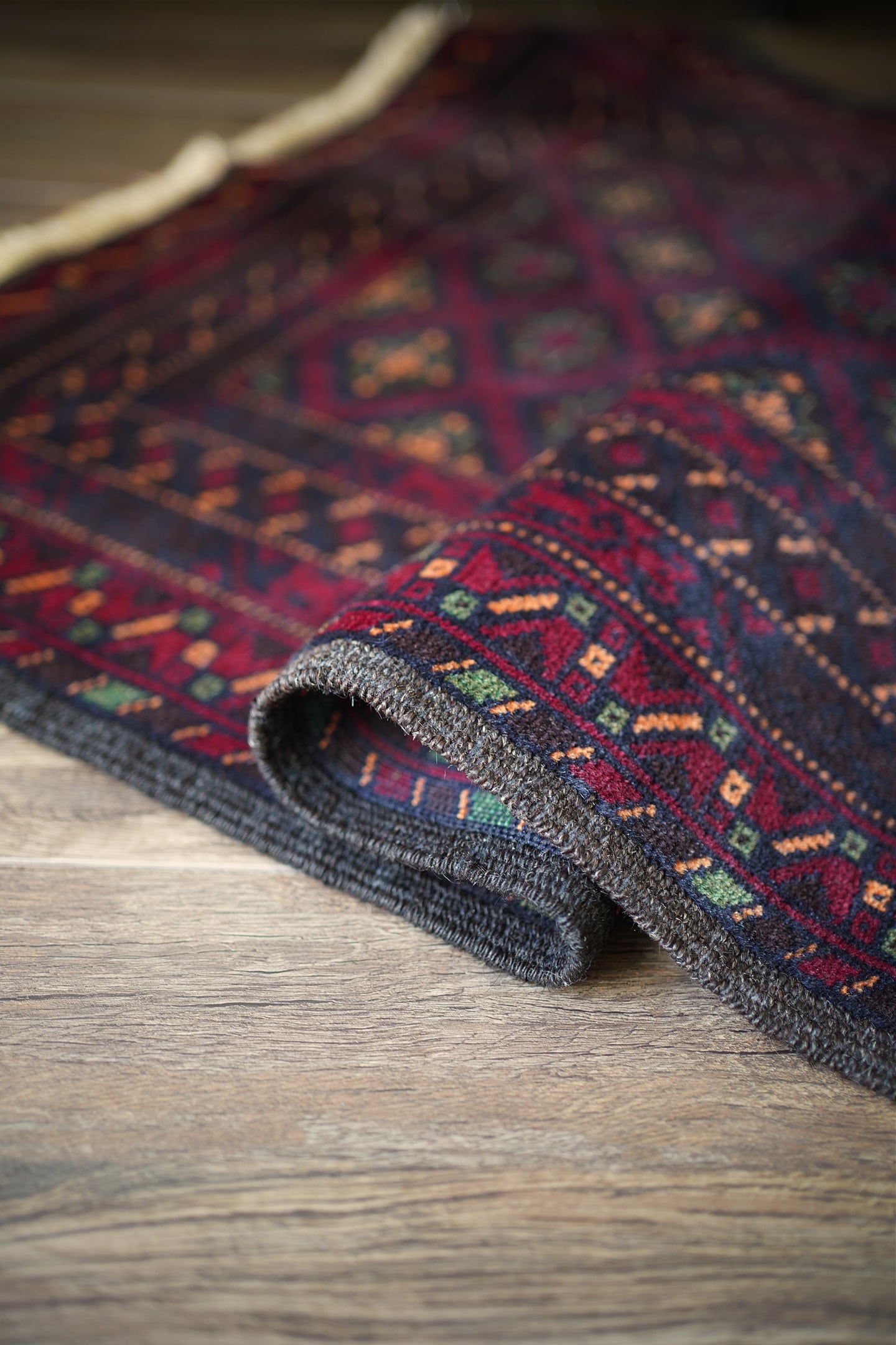 経年約30年のバルーチラグ。深紅色、こげ茶色、深緑色などの暗めでシックなカラーリングに差し色でオレンジ色がアクセントに使われているところが素敵なポイントです。フィールドには"ユルドゥズ"と呼ばれる幸運の象徴である八角星が綺麗な配列で織り込まれています。厚みは5.5㎜程度で、表面はふわっと柔らかく滑らな肌触り。ダメージもなく、パーフェクトコンディション。大きすぎず、小さすぎないサイズ感で玄関やリビングのちょっとしたスペースなどにも良さそうです。