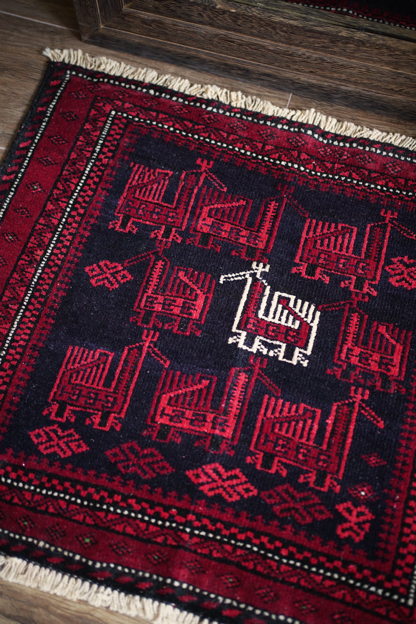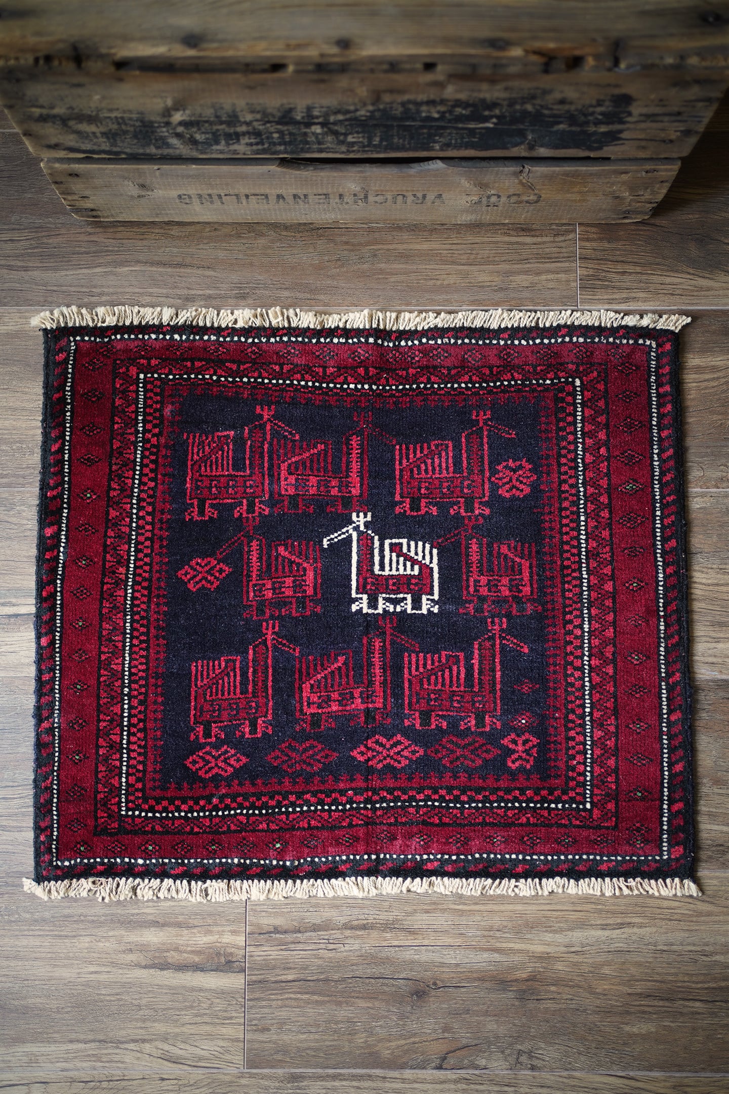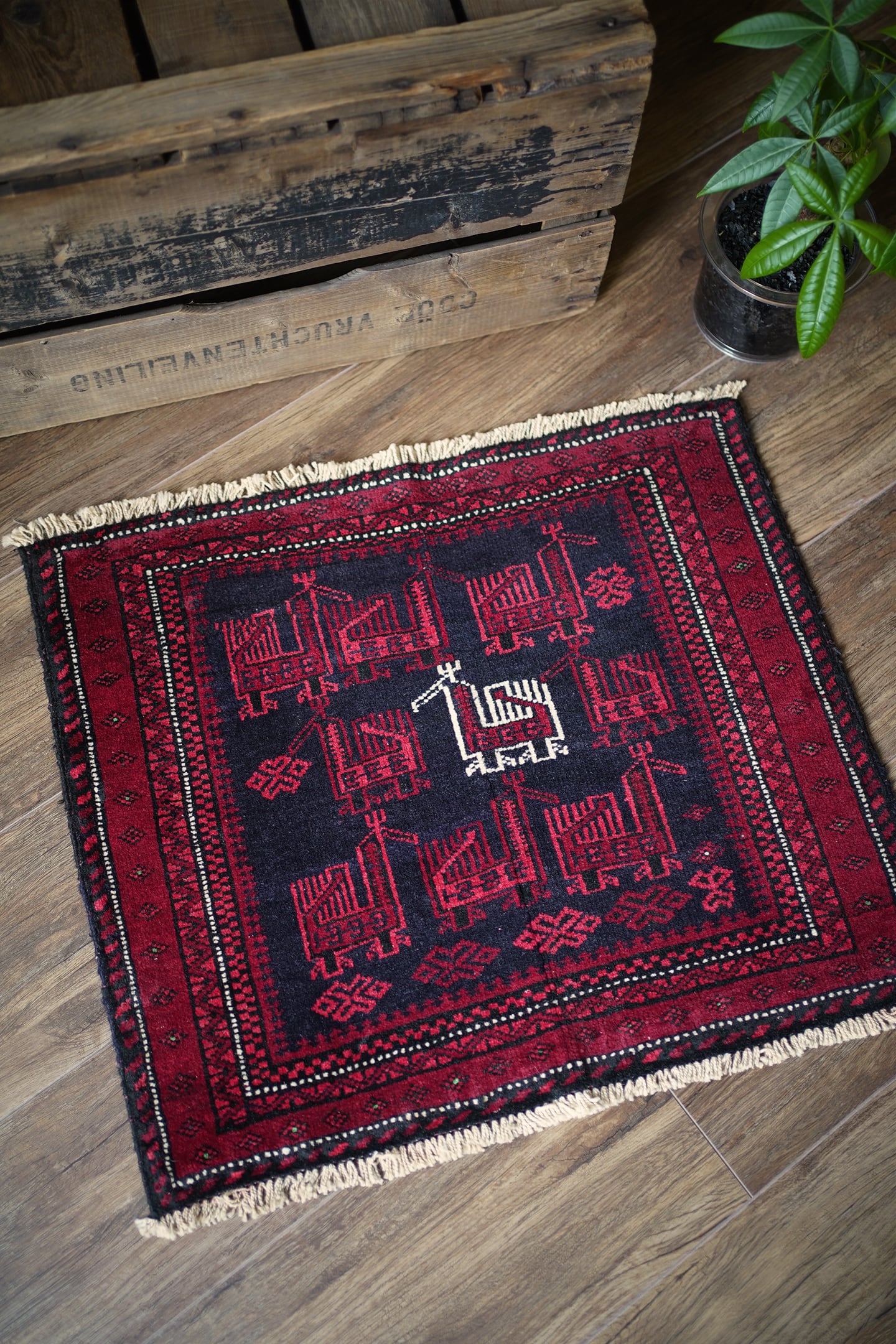 約60年前に織られたアフガニスタン産のバルーチラグ。トライバルラグでは色んな鳥紋様の造形を目にしますが、この首長めの愛らしいフォルムの鳥が店主1番のお気に入りです。中央の鳥だけ白くなっているところも織り手のセンスを感じさせます。配色は深みのあるダークレッド、ブラック、オフホワイト。厚みは6mm程度で、表面はサラふわっとしつつ、滑らかなパイルを感じる肌触り。ダメージもなくパーフェクトなコンディション。玄関や全身鏡の前、壁にタペストリーとして飾ってもとても素敵かと思います。