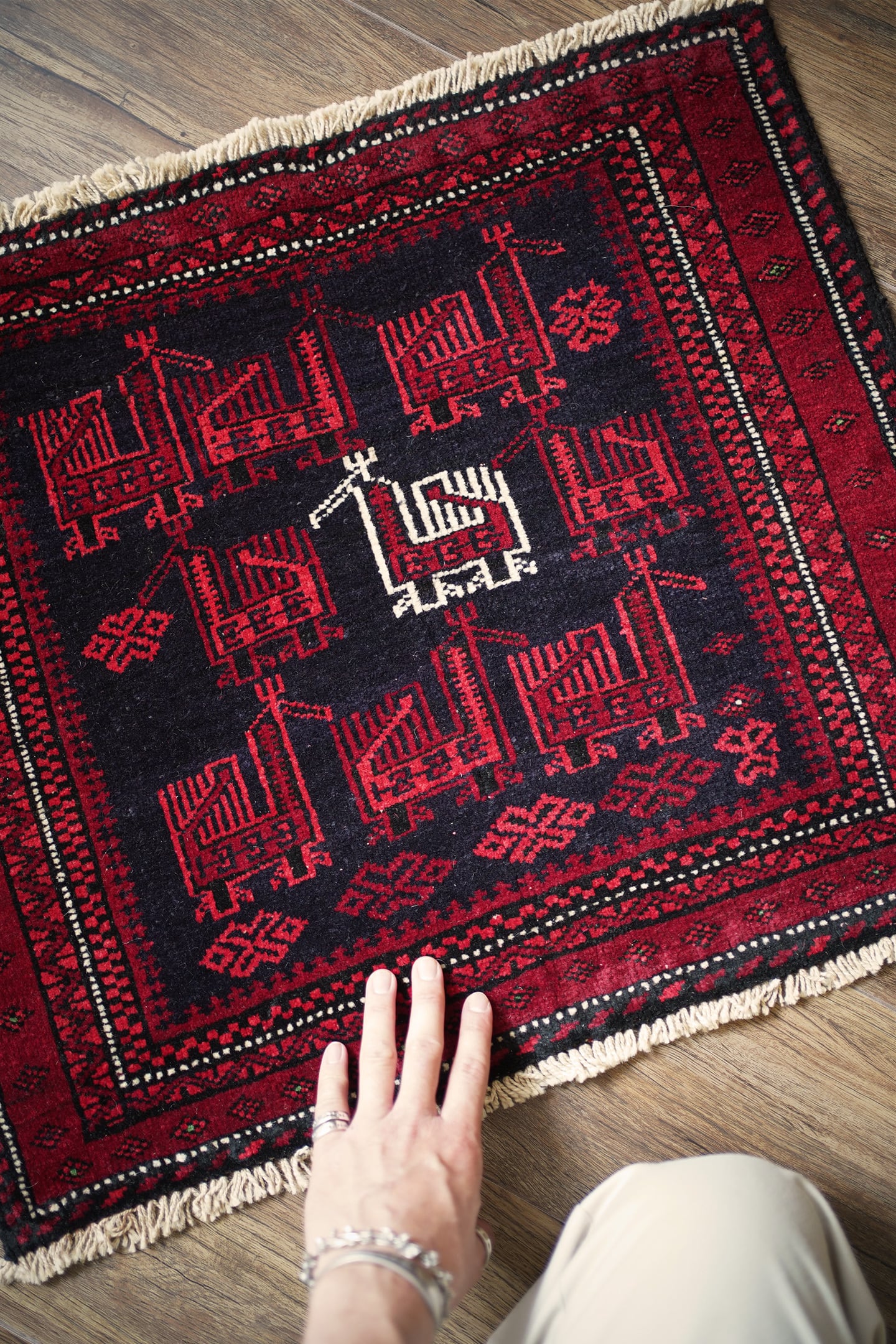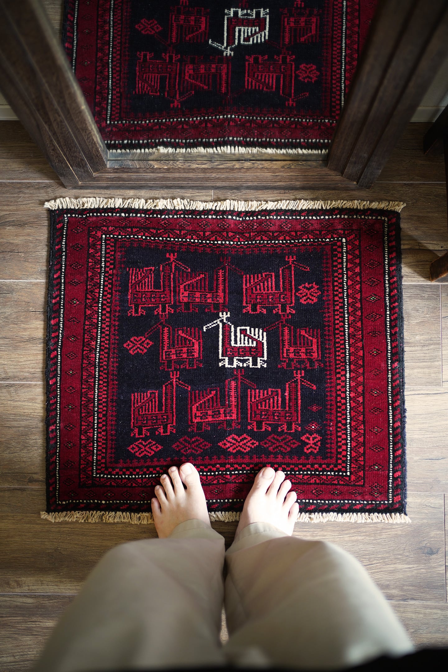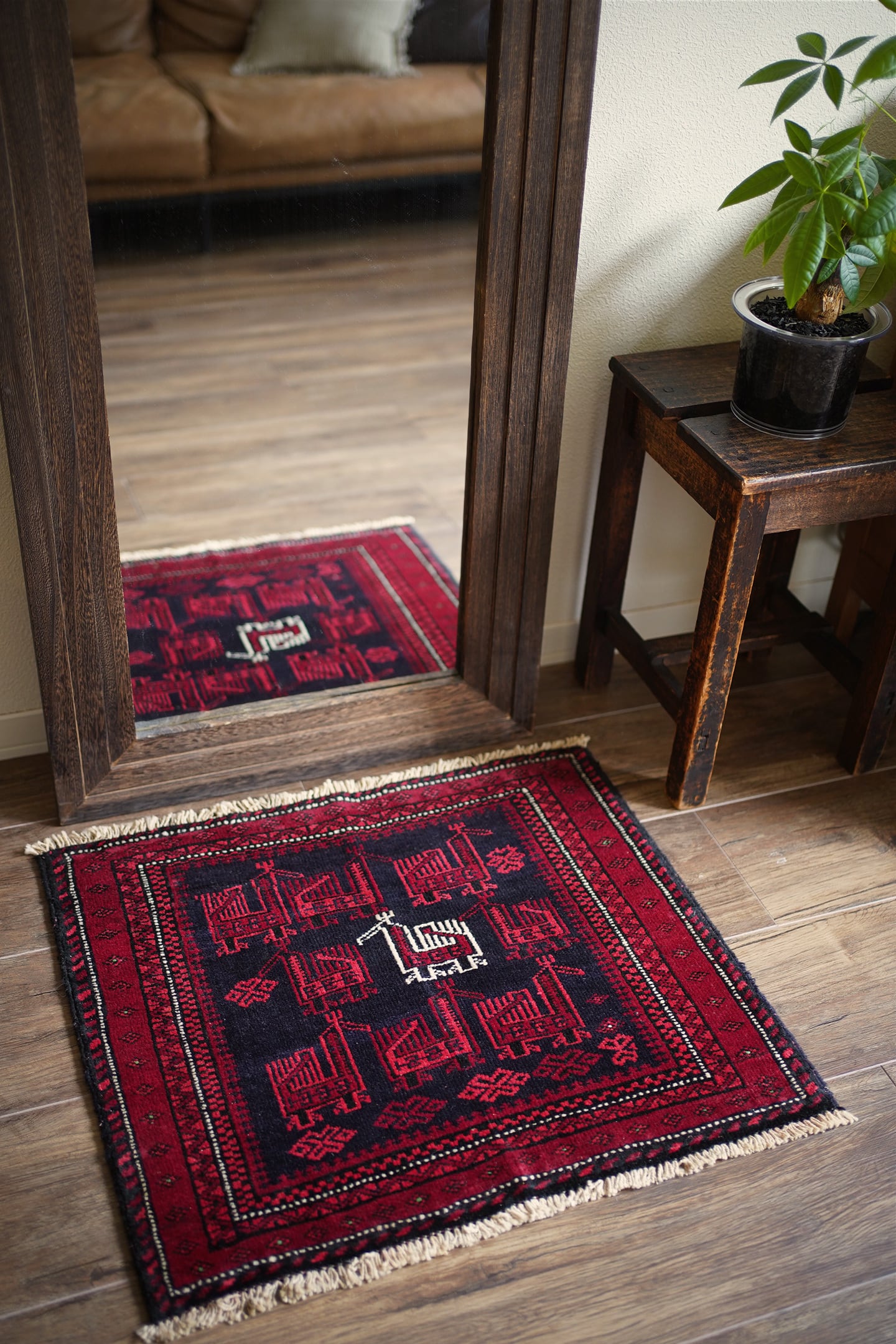 約60年前に織られたアフガニスタン産のバルーチラグ。トライバルラグでは色んな鳥紋様の造形を目にしますが、この首長めの愛らしいフォルムの鳥が店主1番のお気に入りです。中央の鳥だけ白くなっているところも織り手のセンスを感じさせます。配色は深みのあるダークレッド、ブラック、オフホワイト。厚みは6mm程度で、表面はサラふわっとしつつ、滑らかなパイルを感じる肌触り。ダメージもなくパーフェクトなコンディション。玄関や全身鏡の前、壁にタペストリーとして飾ってもとても素敵かと思います。