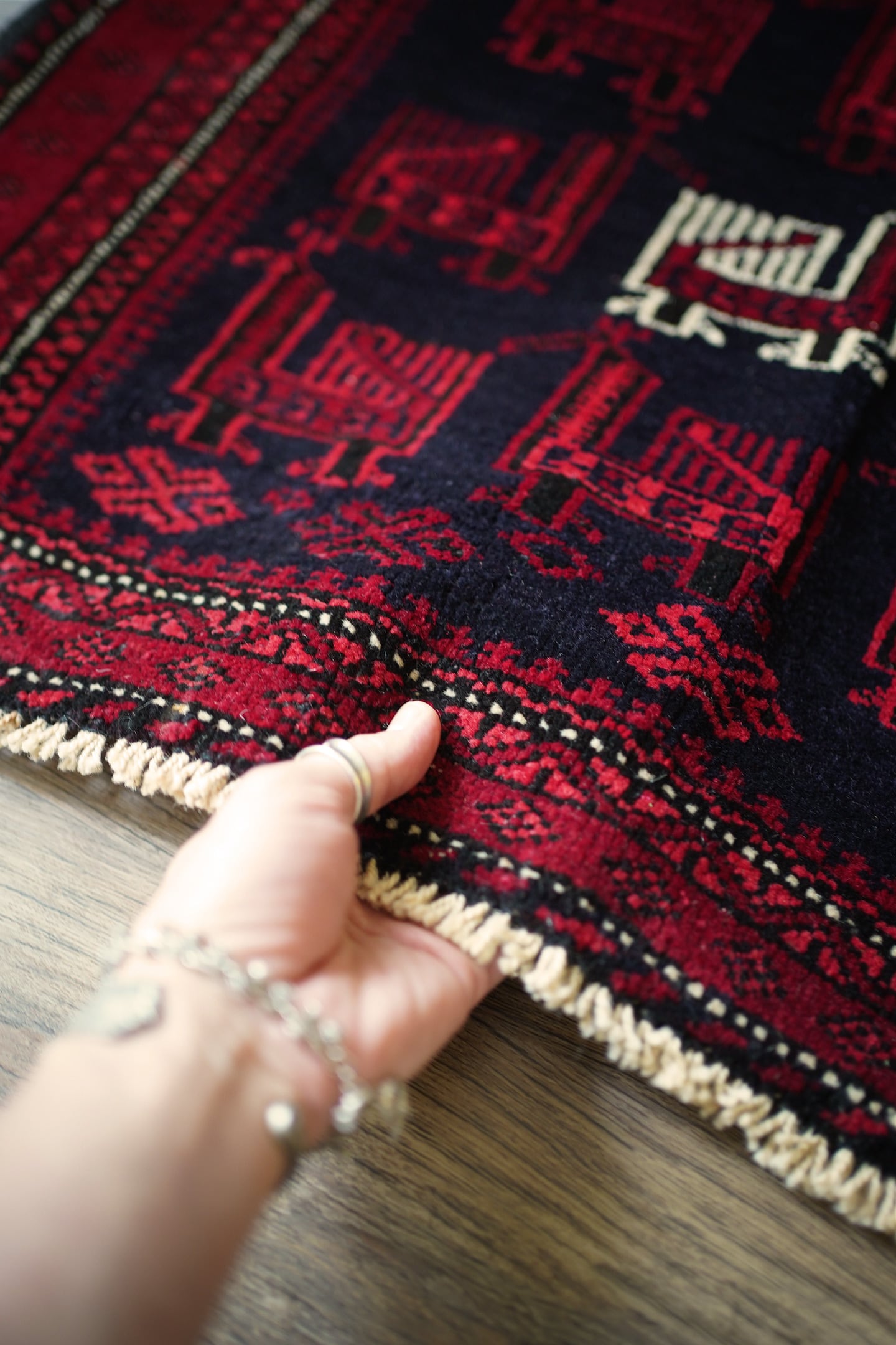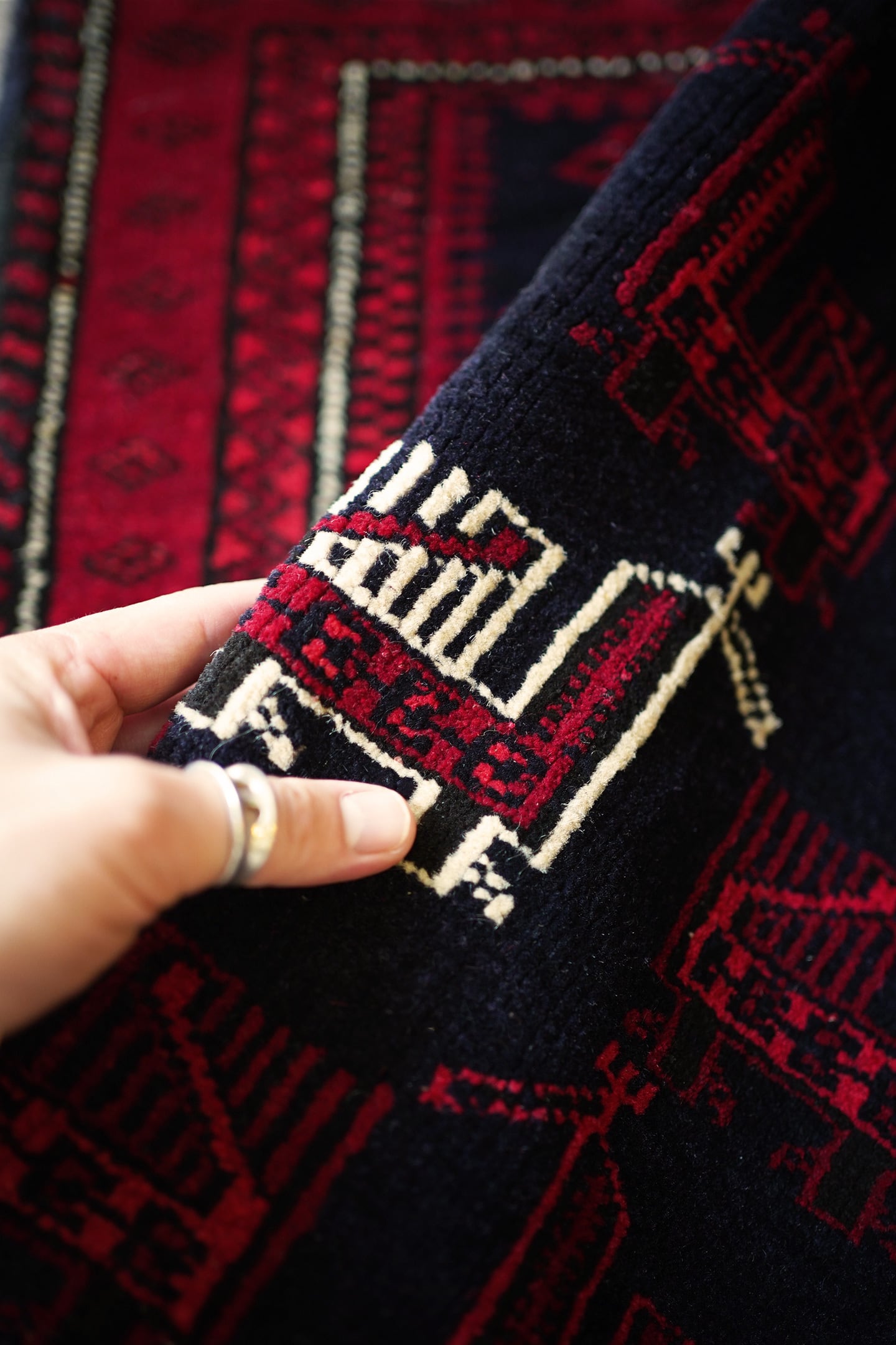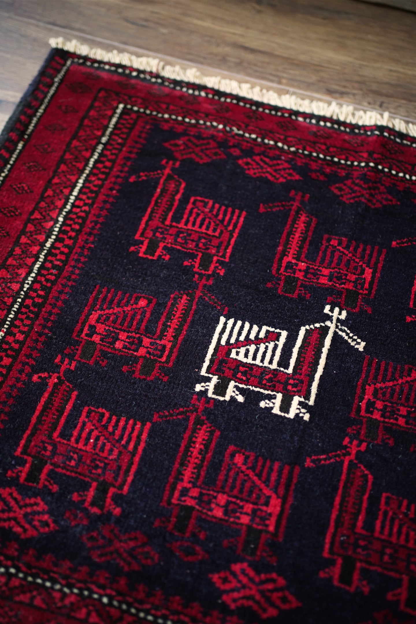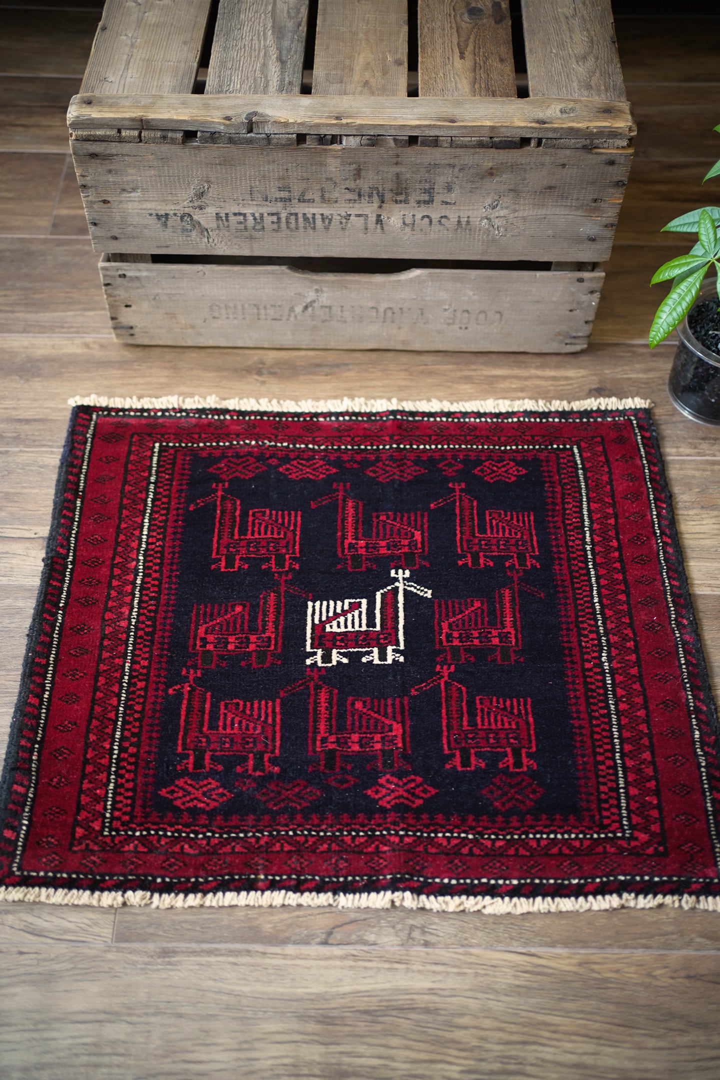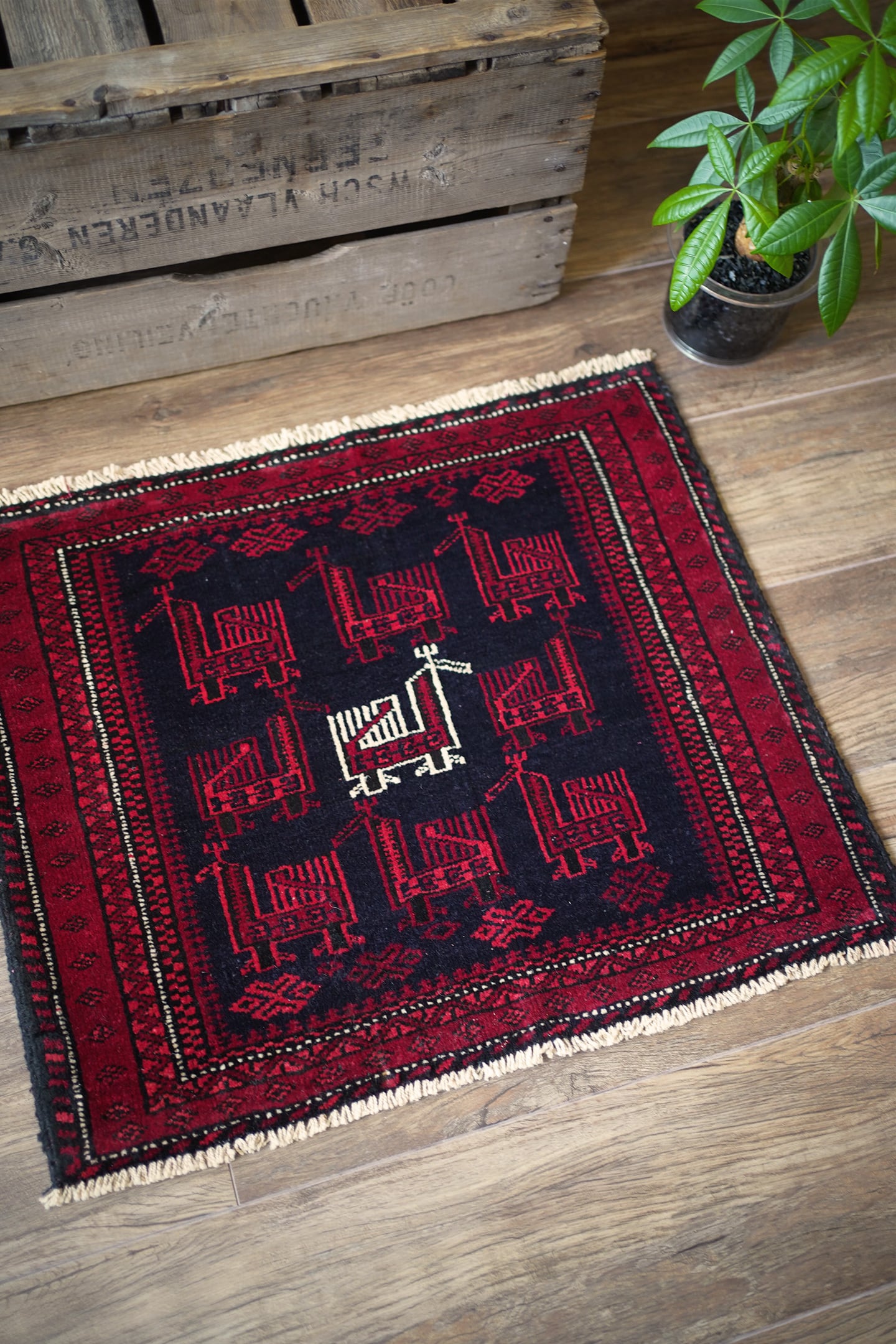 約60年前に織られたアフガニスタン産のバルーチラグ。トライバルラグでは色んな鳥紋様の造形を目にしますが、この首長めの愛らしいフォルムの鳥が店主1番のお気に入りです。中央の鳥だけ白くなっているところも織り手のセンスを感じさせます。配色は深みのあるダークレッド、ブラック、オフホワイト。厚みは7mm程度で、表面はサラふわっとしつつ、滑らかなパイルを感じる肌触り。ダメージもなくパーフェクトなコンディション。玄関や全身鏡の前、壁にタペストリーとして飾ってもとても素敵かと思います。