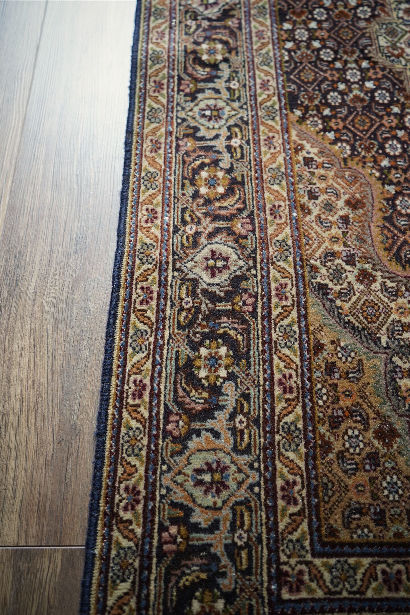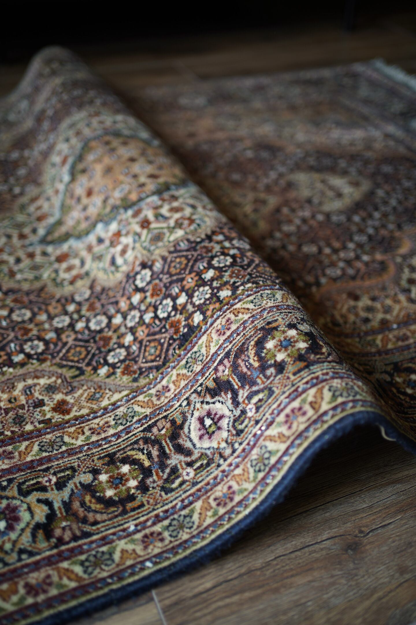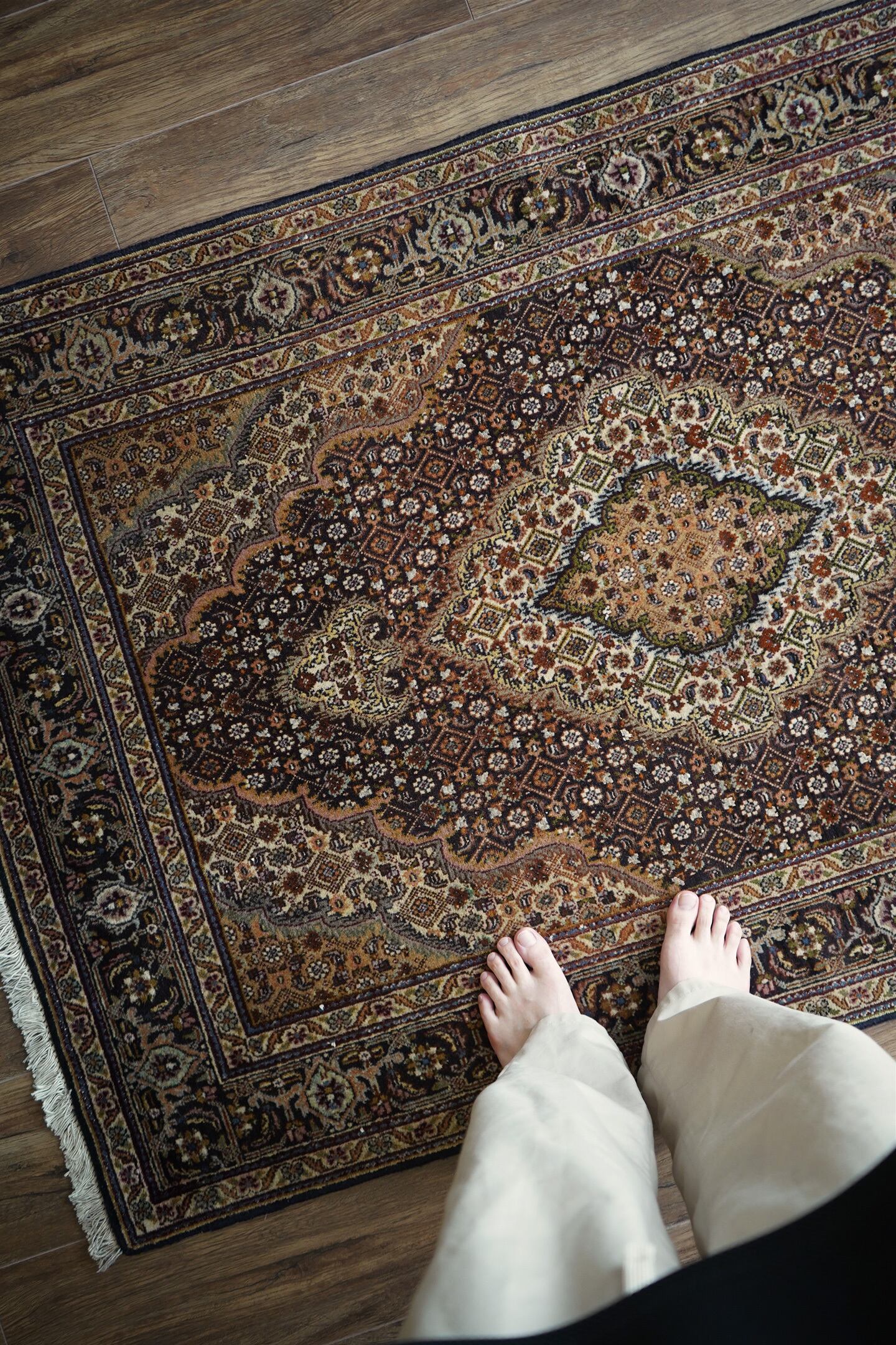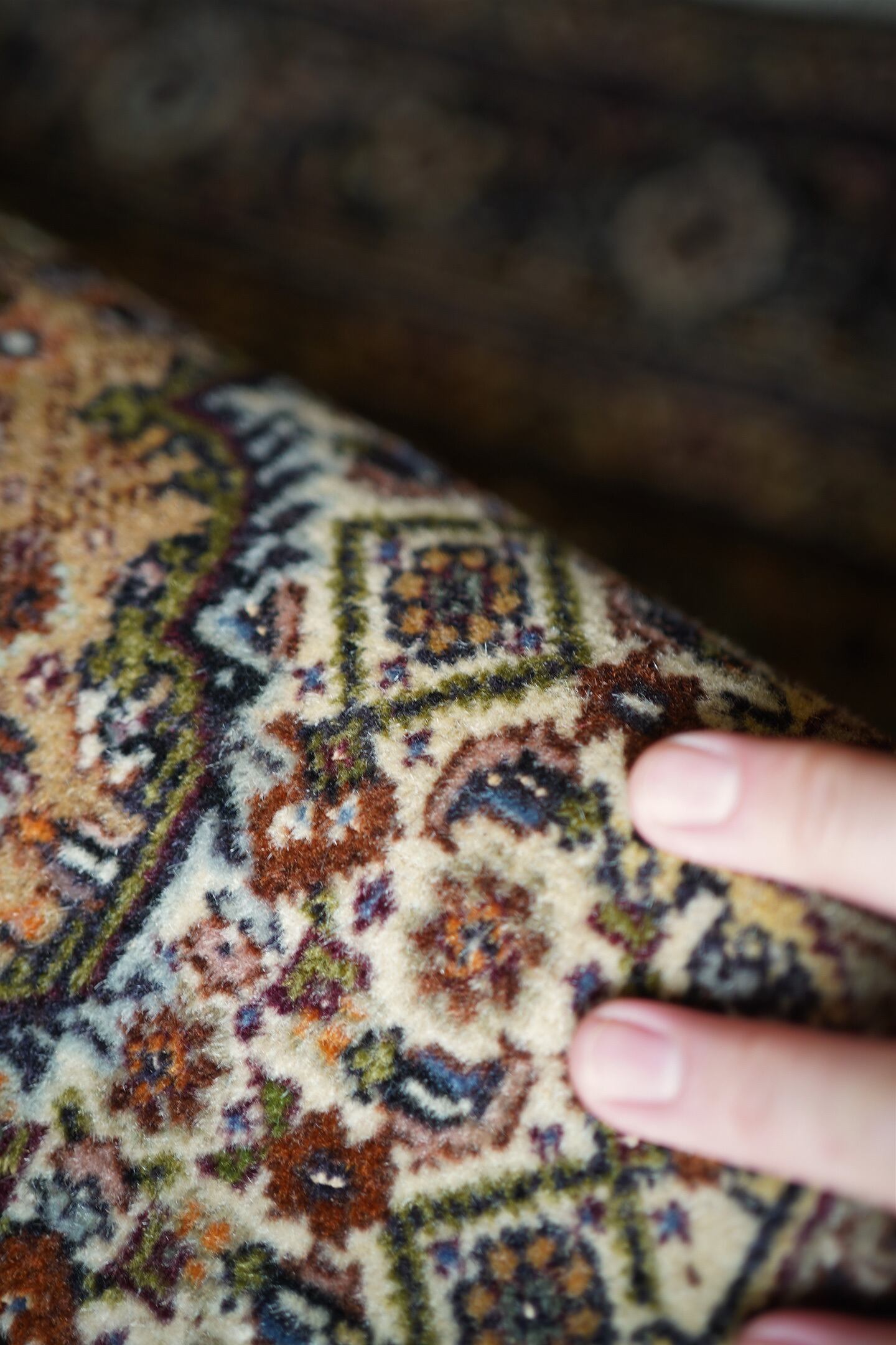 経年約50年のイラン・タブリーズ産のヴィンテージラグ。4つのアカンサス葉に囲まれた菱形模様が反復パターンとして用いられた"ヘラティ紋様"と呼ばれる美しいデザイン。繊細な模様でありながら、全体的にバランスの取れた落ち着いた色合いなのでお部屋にも馴染みやすく合わせやすい一枚です。配色はキャメル、ブラウン、ブラック、オリーブ、くすみのあるベージュ・ホワイト・水色など。毛足は短めでサラふわっとした滑らか肌触り。通年で気持ちよく敷いていただける質感かと思います。厚みは6mm〜7mm程度。ダメージや補修跡もなく、状態良好です。