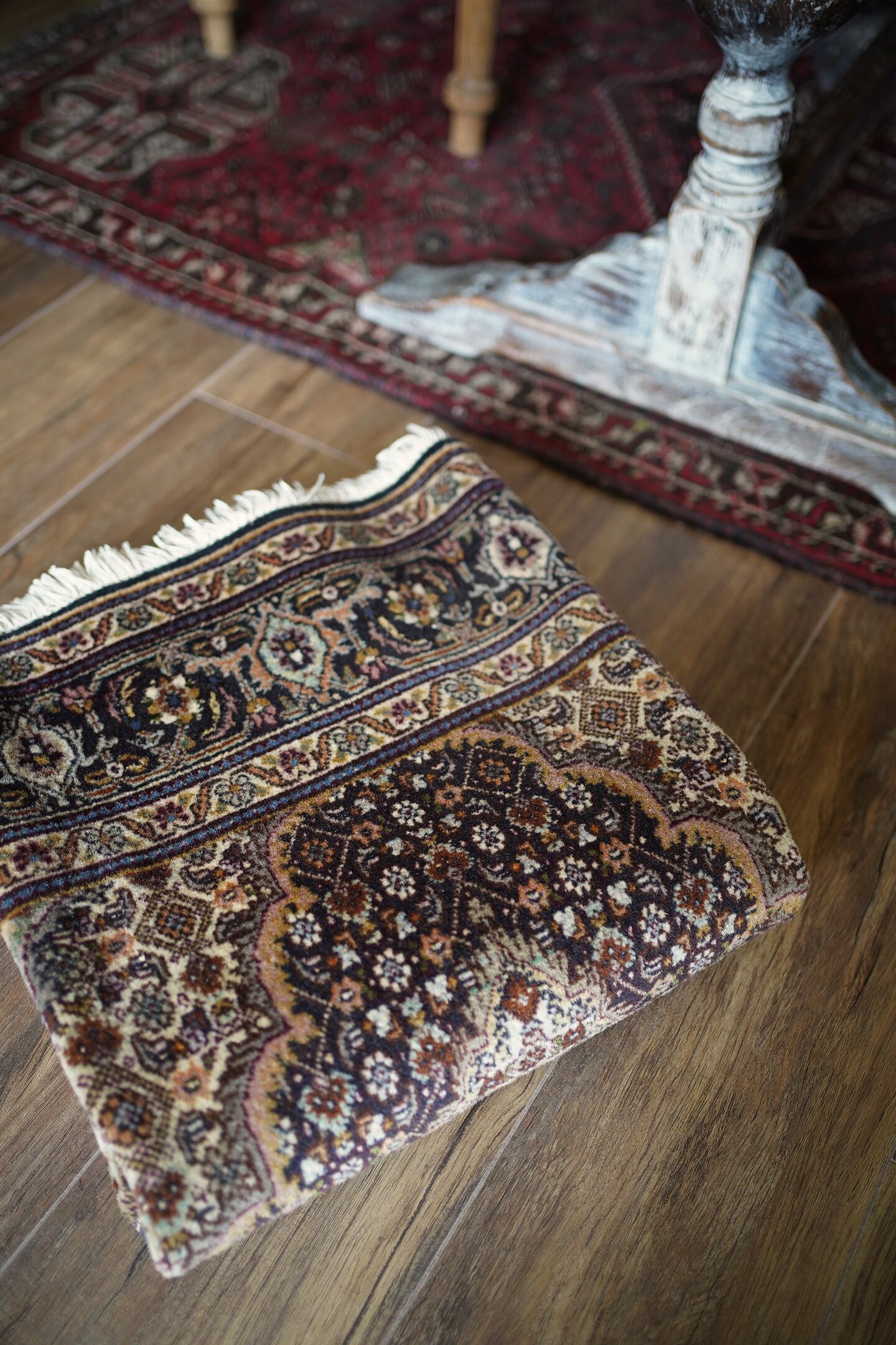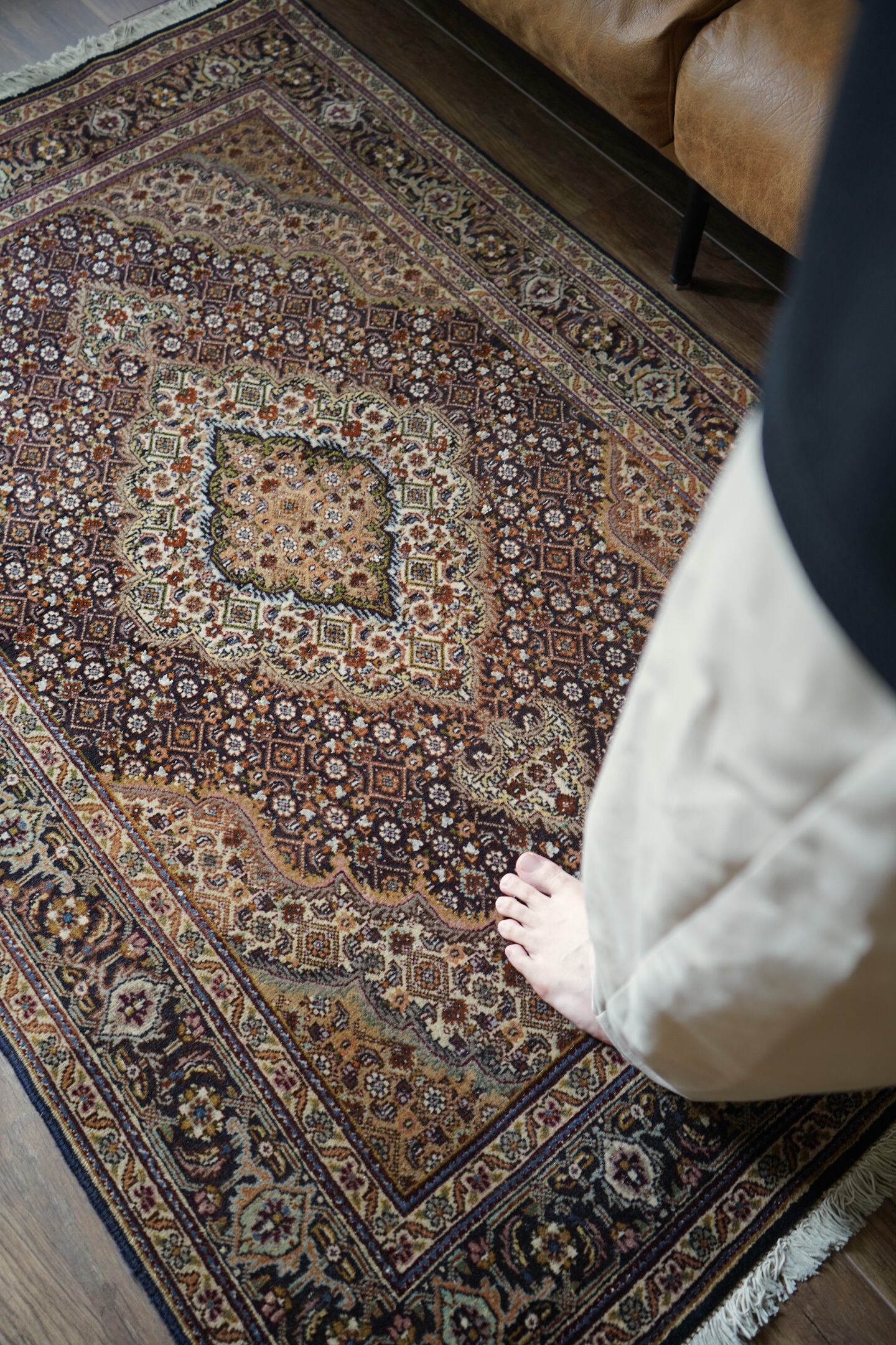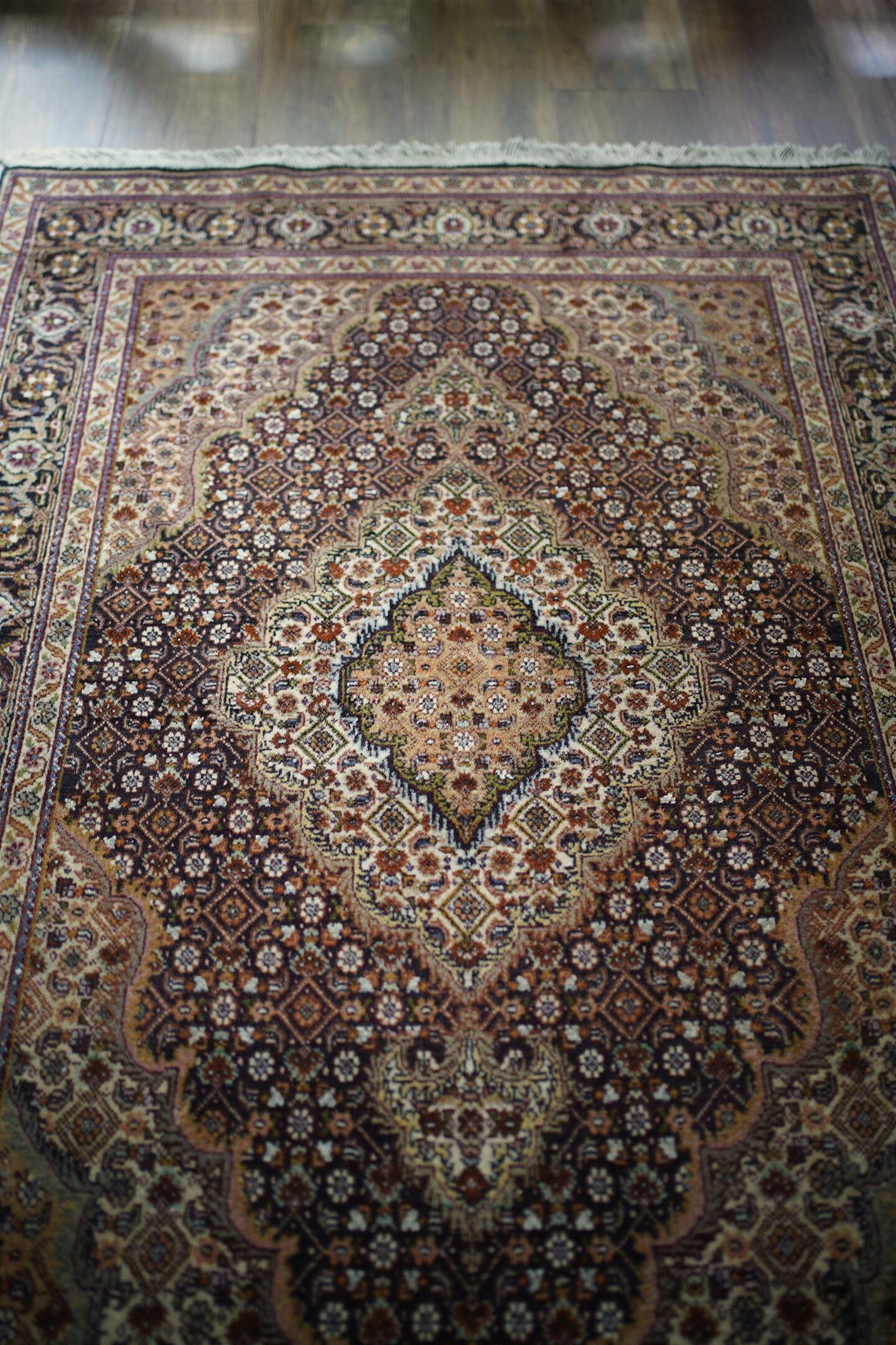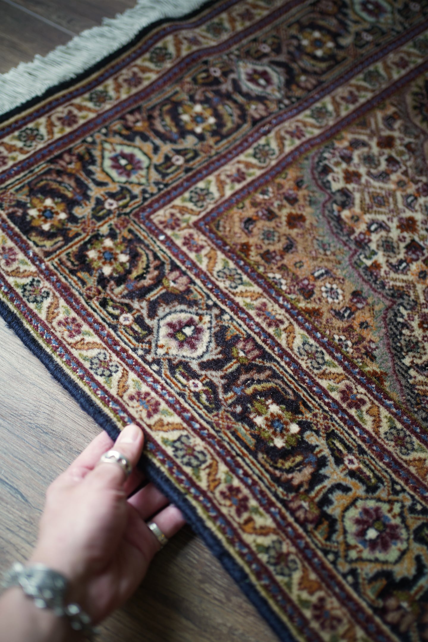 経年約50年のイラン・タブリーズ産のヴィンテージラグ。4つのアカンサス葉に囲まれた菱形模様が反復パターンとして用いられた"ヘラティ紋様"と呼ばれる美しいデザイン。繊細な模様でありながら、全体的にバランスの取れた落ち着いた色合いなのでお部屋にも馴染みやすく合わせやすい一枚です。配色はキャメル、ブラウン、ブラック、オリーブ、くすみのあるベージュ・ホワイト・水色など。毛足は短めでサラふわっとした滑らか肌触り。通年で気持ちよく敷いていただける質感かと思います。厚みは6mm〜7mm程度。ダメージや補修跡もなく、状態良好です。