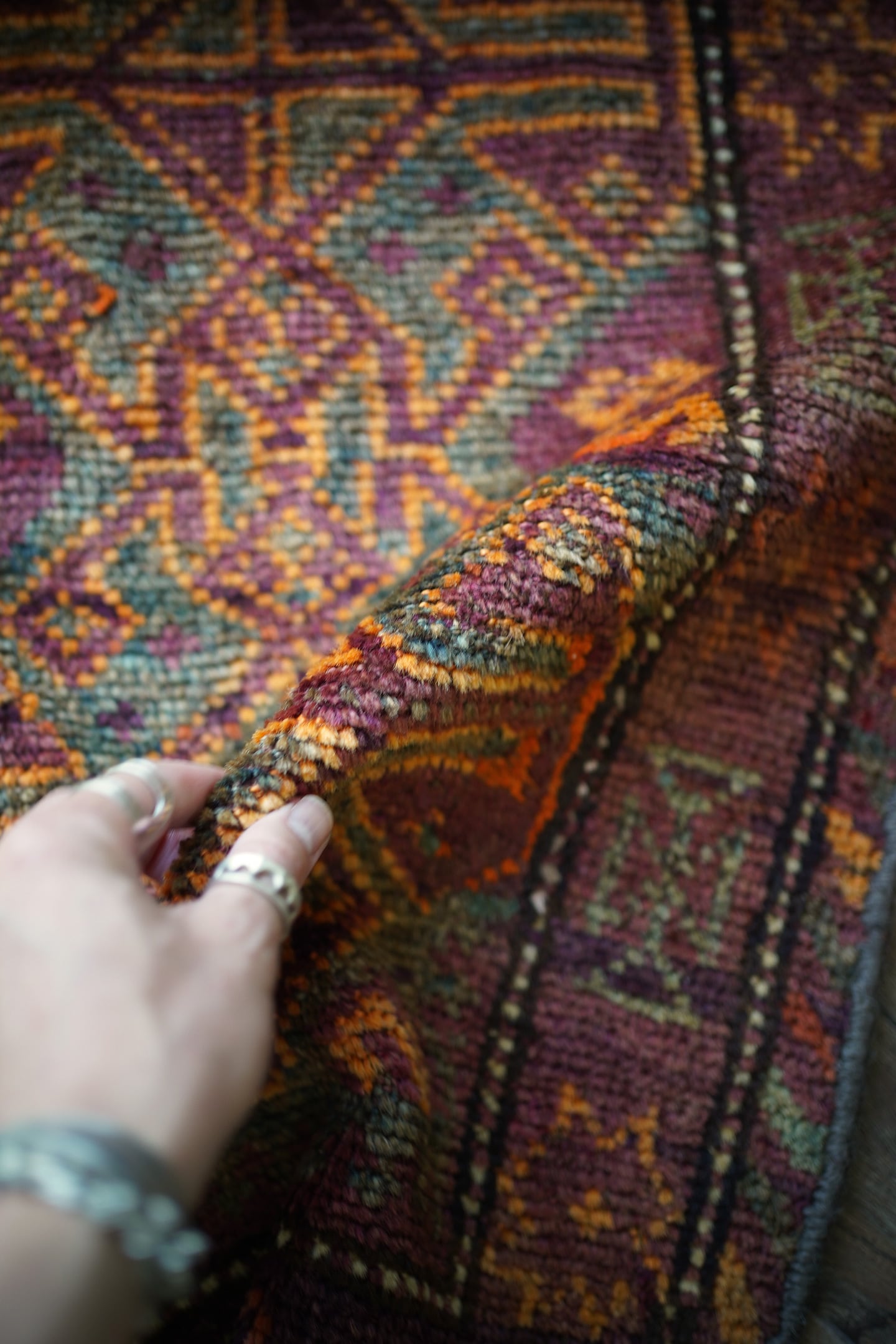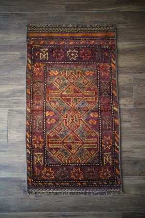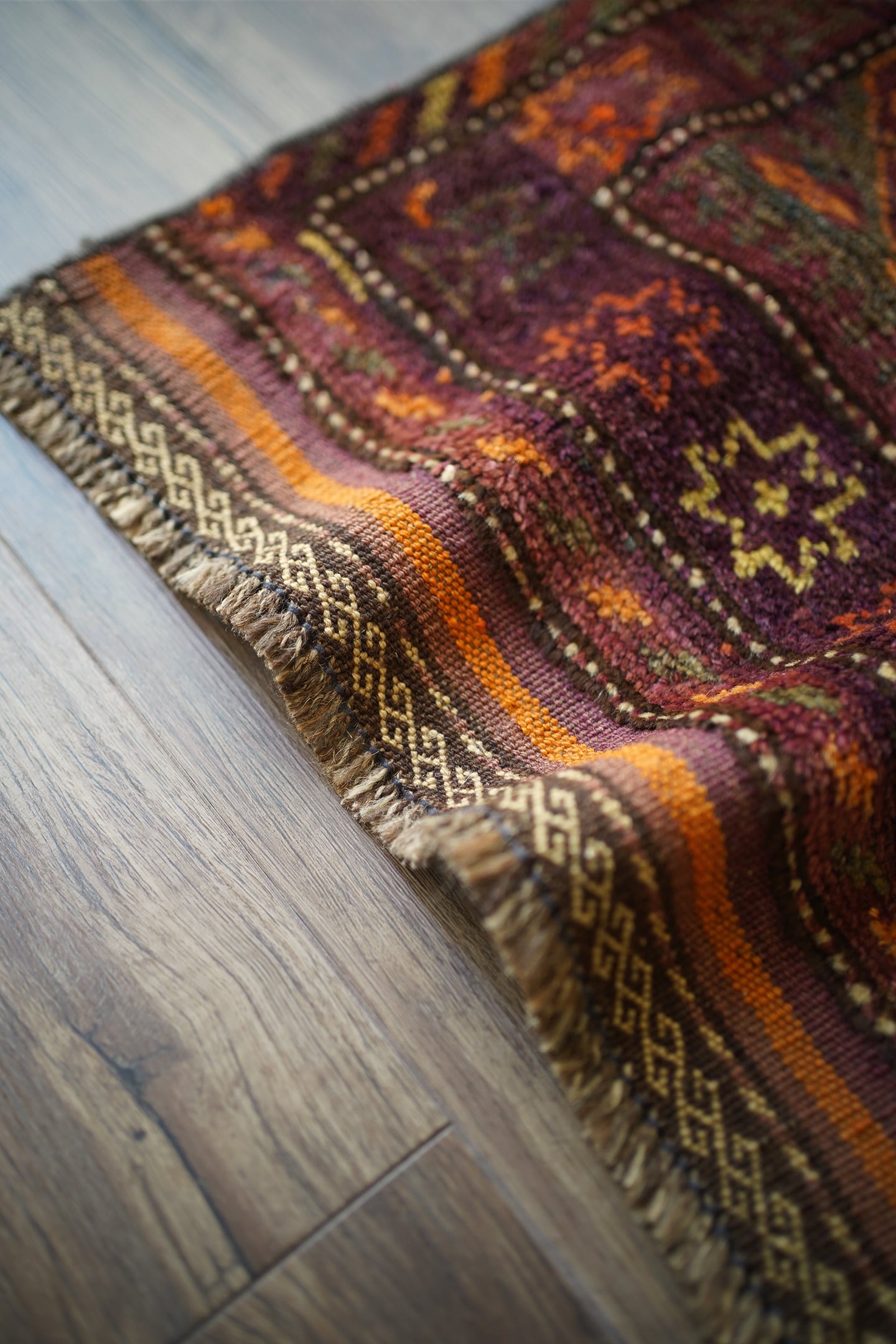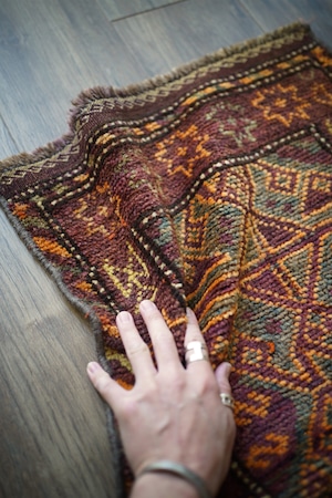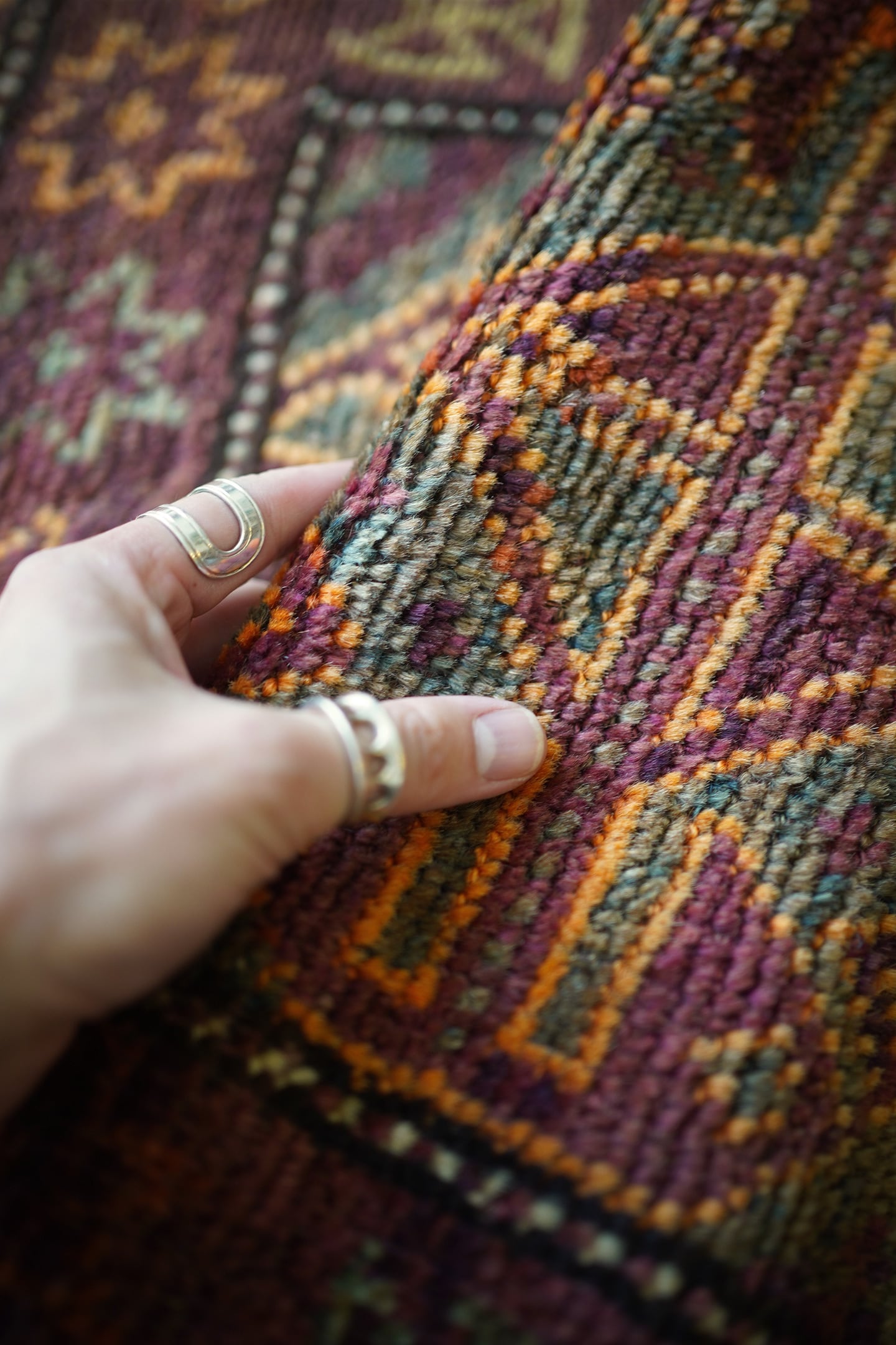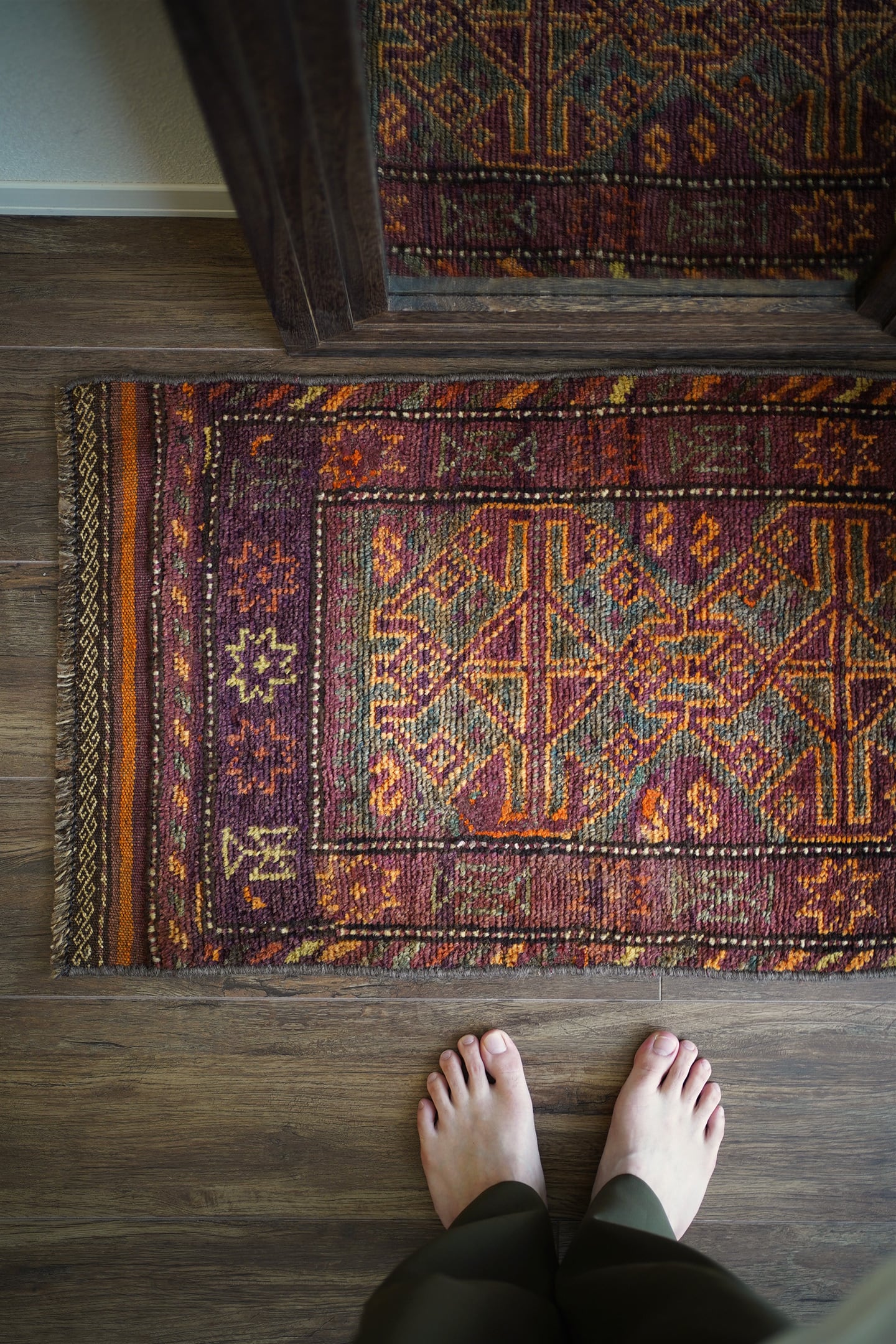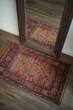 約60年前にアフガニスタン北西部に居住するタイマニ族によって織られたヴィンテージラグ。ラグの面積に対して非常に大きく織り込まれた2つのメダリオンが象徴的で、周りには魔除けを意味するS字のマーク、ボーダーには幸運を意味する八角星などが織り込まれています。えんじ色、オレンジ、赤茶、黄土色などが使われたユニークな配色で、フリンジ部分はキリムエンドの作りになっています。表面のパイルはふわっと滑らかな肌触りをしており、厚みは5mmほど。柔らかくクタッとした質感をしています。状態は大変良好なコンディションです。観葉植物を上に置いたり、全身鏡の前に敷いたりといろんな場所で敷いていただけるかと思います。