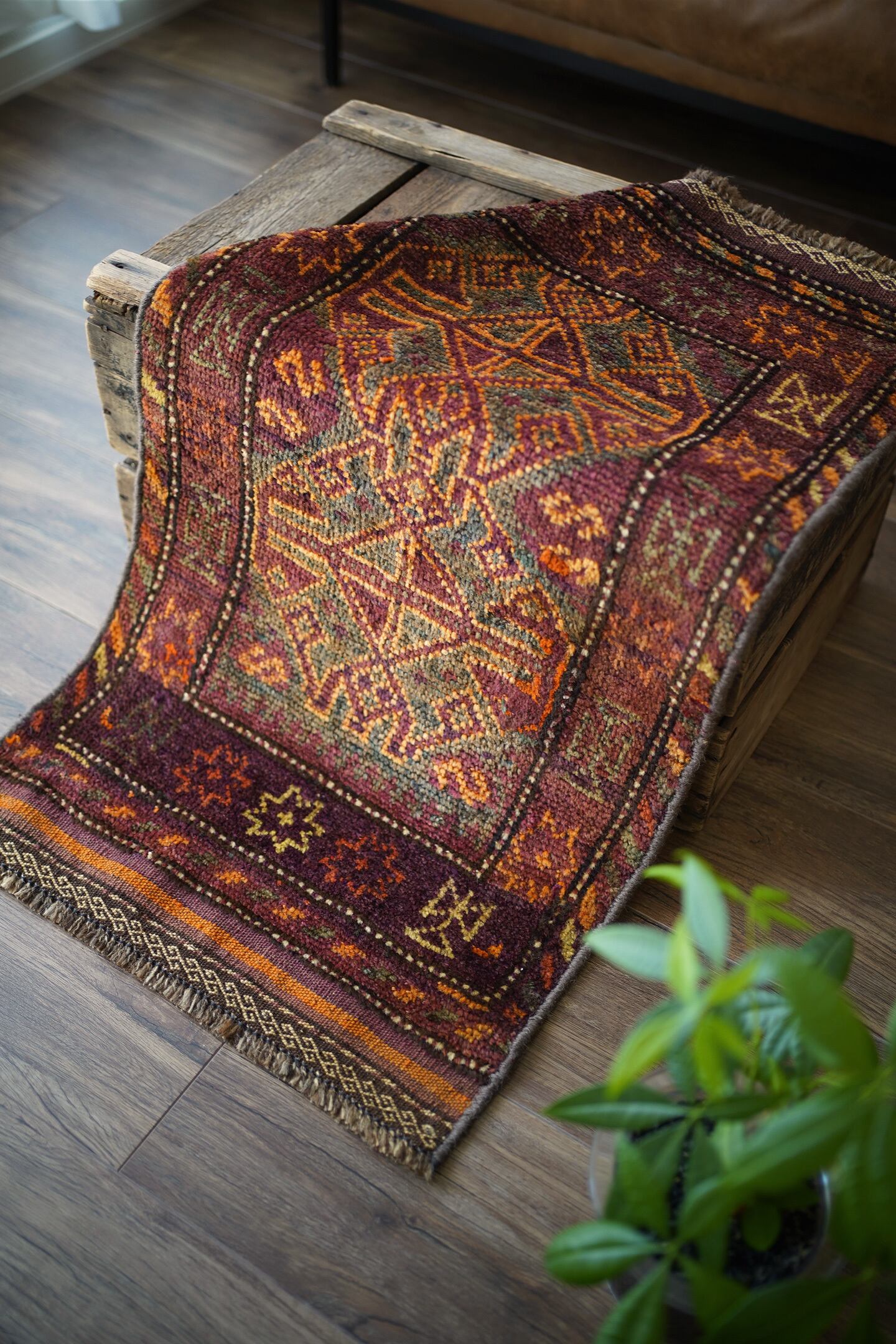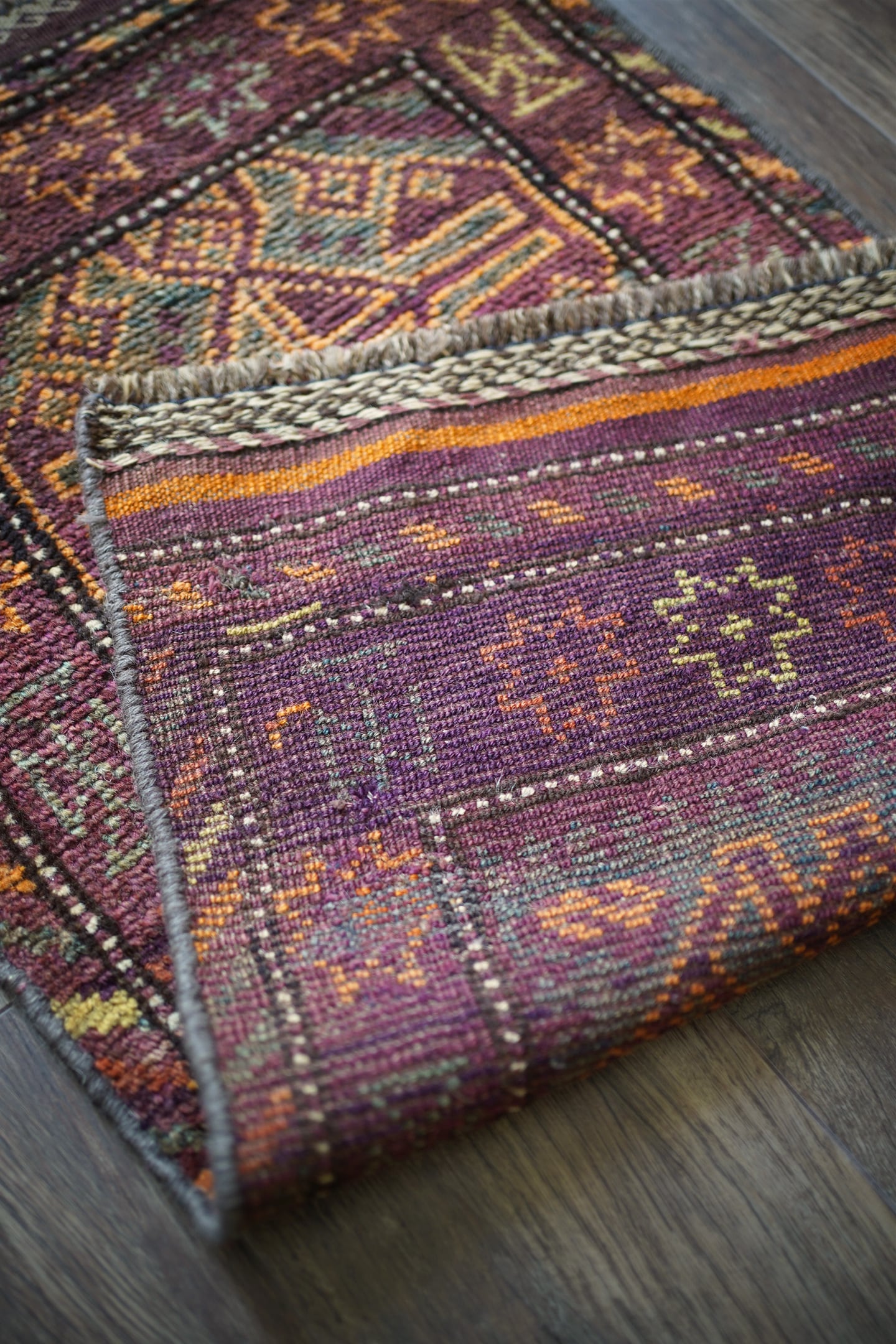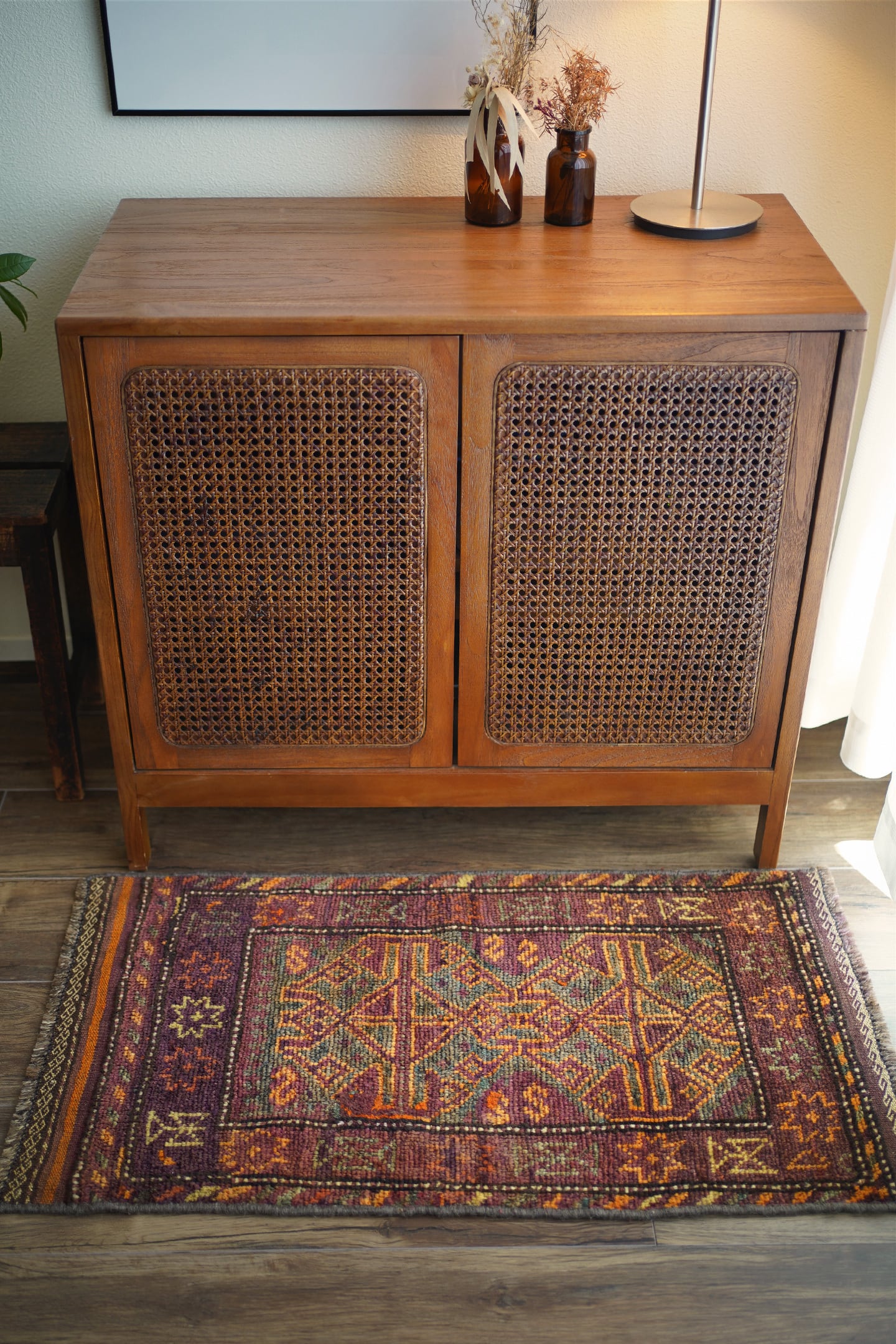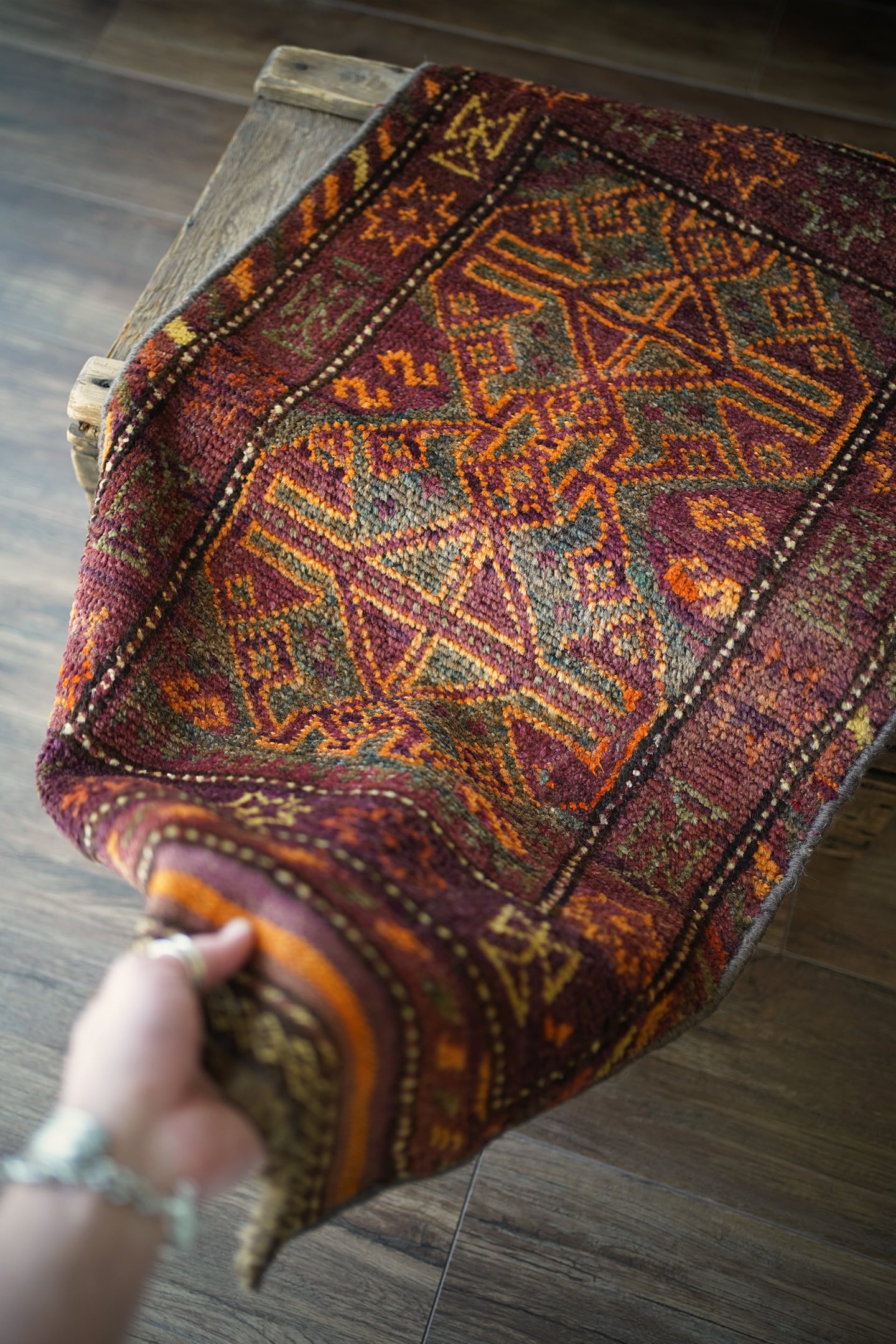 約60年前にアフガニスタン北西部に居住するタイマニ族によって織られたヴィンテージラグ。ラグの面積に対して非常に大きく織り込まれた2つのメダリオンが象徴的で、周りには魔除けを意味するS字のマーク、ボーダーには幸運を意味する八角星などが織り込まれています。えんじ色、オレンジ、赤茶、黄土色などが使われたユニークな配色で、フリンジ部分はキリムエンドの作りになっています。表面のパイルはふわっと滑らかな肌触りをしており、厚みは5mmほど。柔らかくクタッとした質感をしています。状態は大変良好なコンディションです。観葉植物を上に置いたり、全身鏡の前に敷いたりといろんな場所で敷いていただけるかと思います。