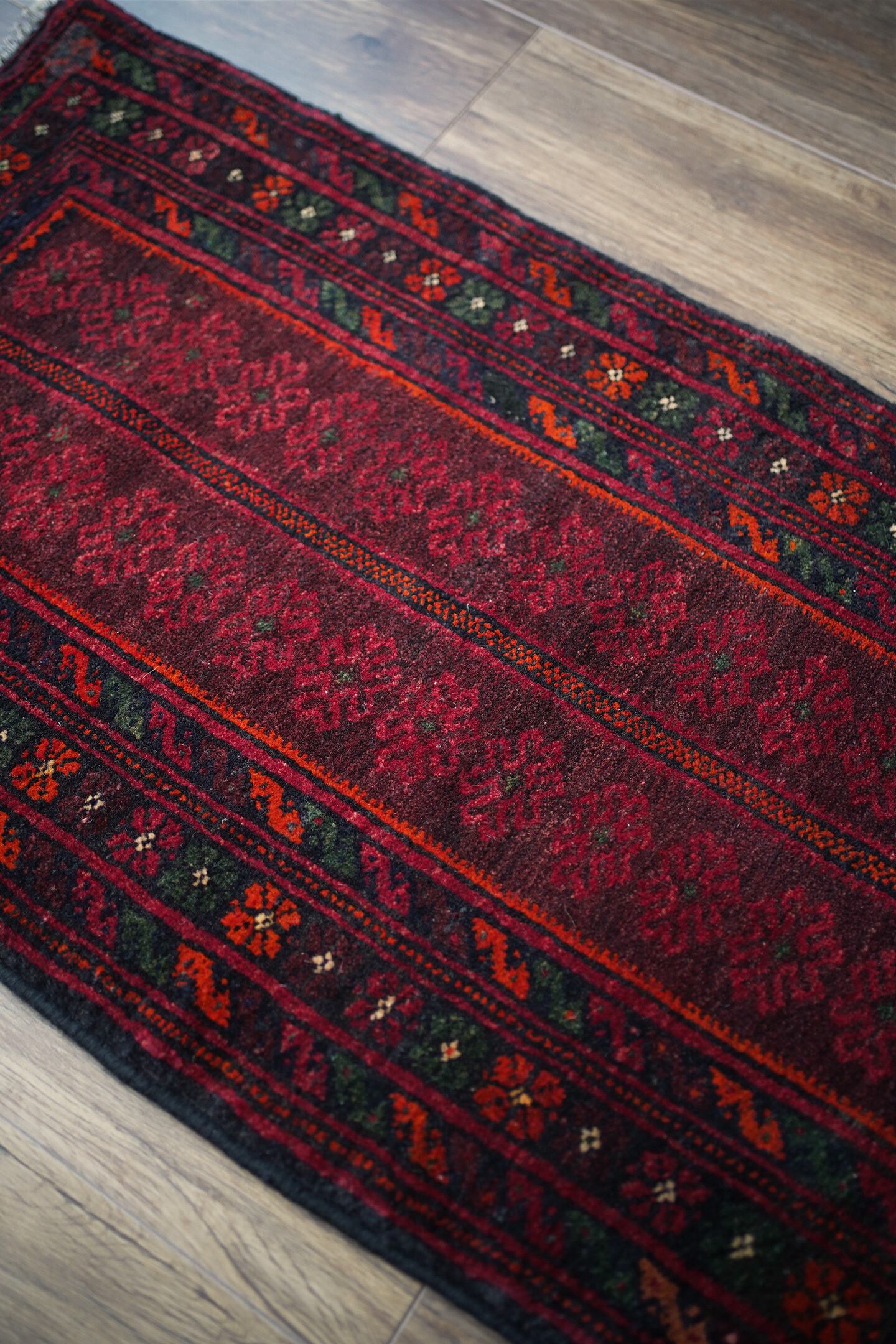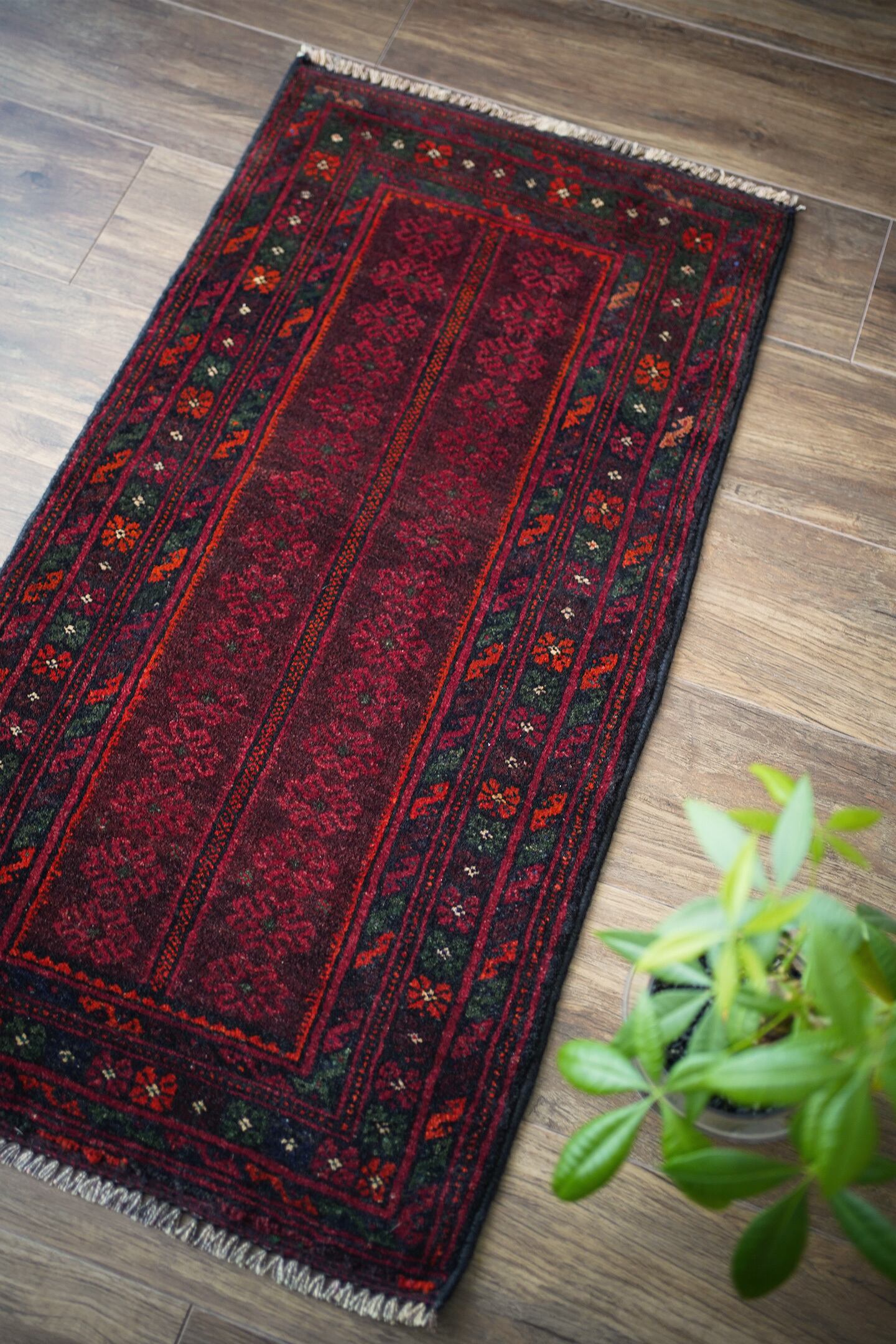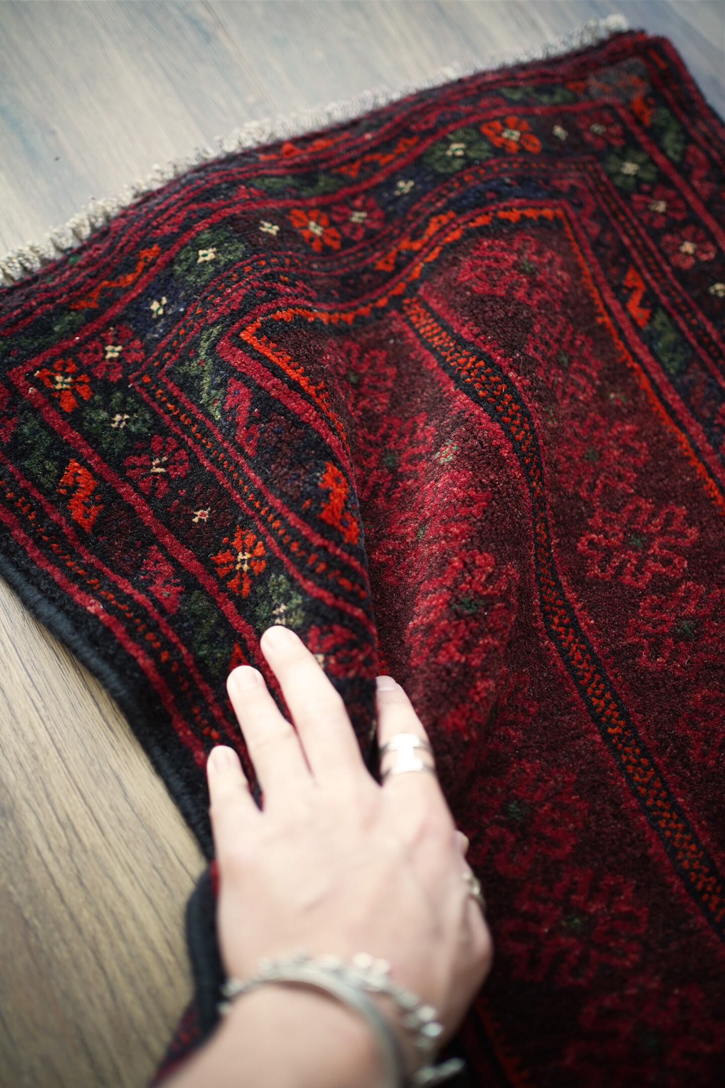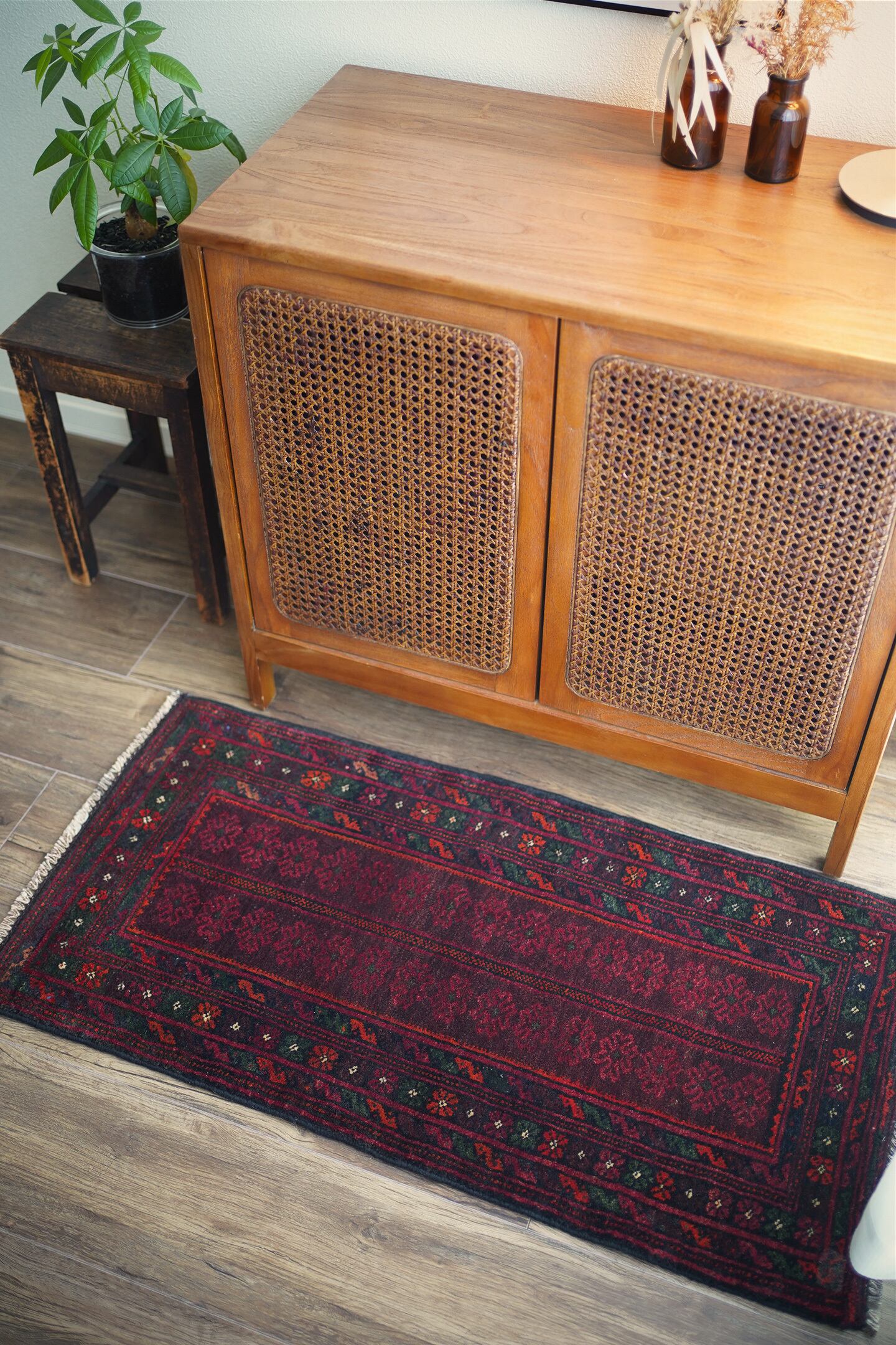 深い奥行きのある色味が魅力的な経年約40年のバルーチラグ。暗めな赤とダークグリーンの落ち着いた色の組み合わせが目を惹く一枚で、ラグ自体の主張はそこまでないものの、バランスの取れたデザインで非常にオシャレな印象を受けます。9mmほどの厚みもあり全体的な質感も◎。表面はふわっと柔らかく気持ちの良い肌触りをしています。状態は言うことなしのパーフェクトコンディション。店主オススメの一枚です♫