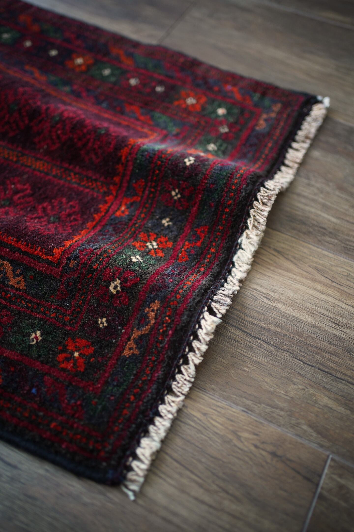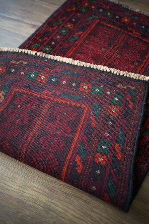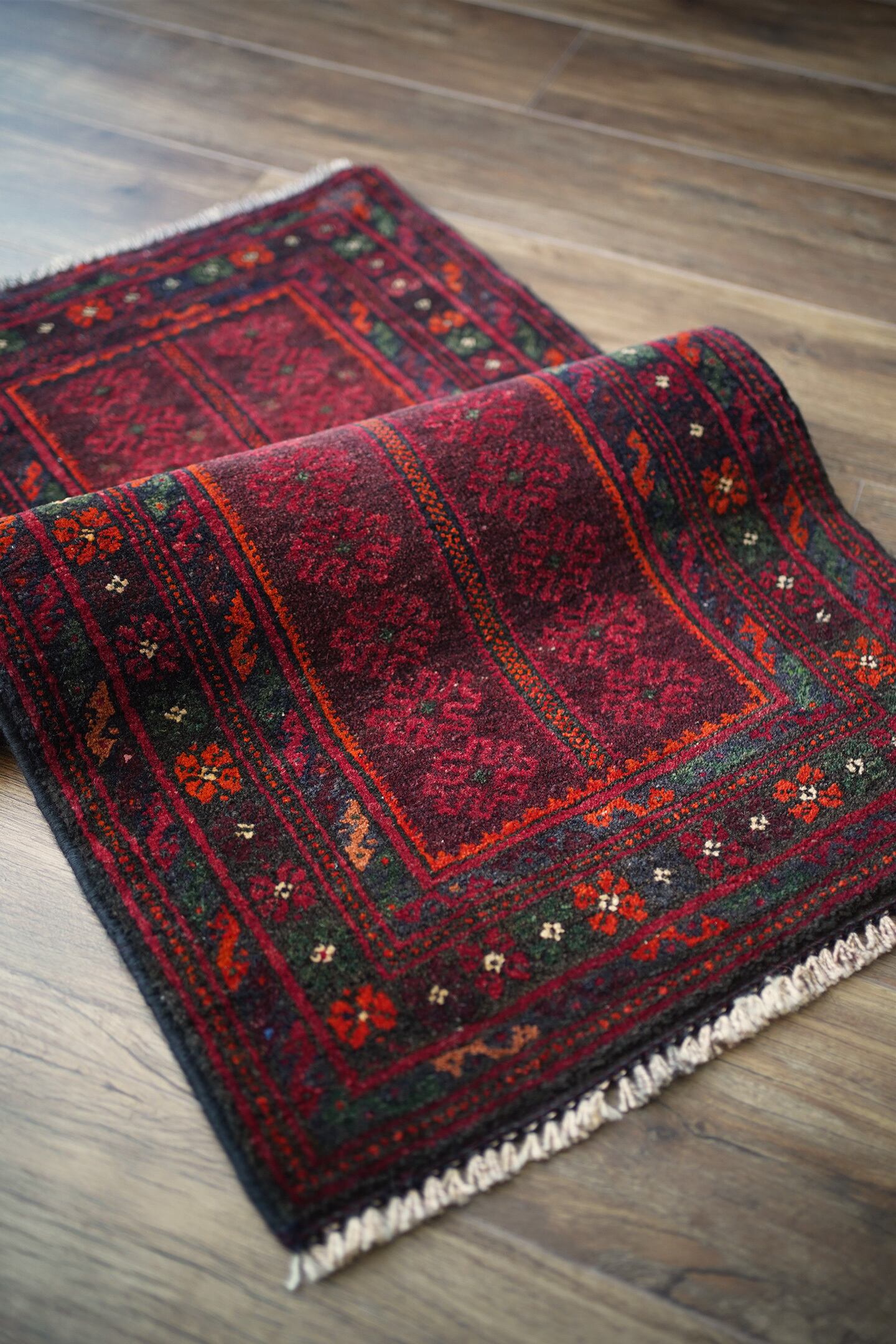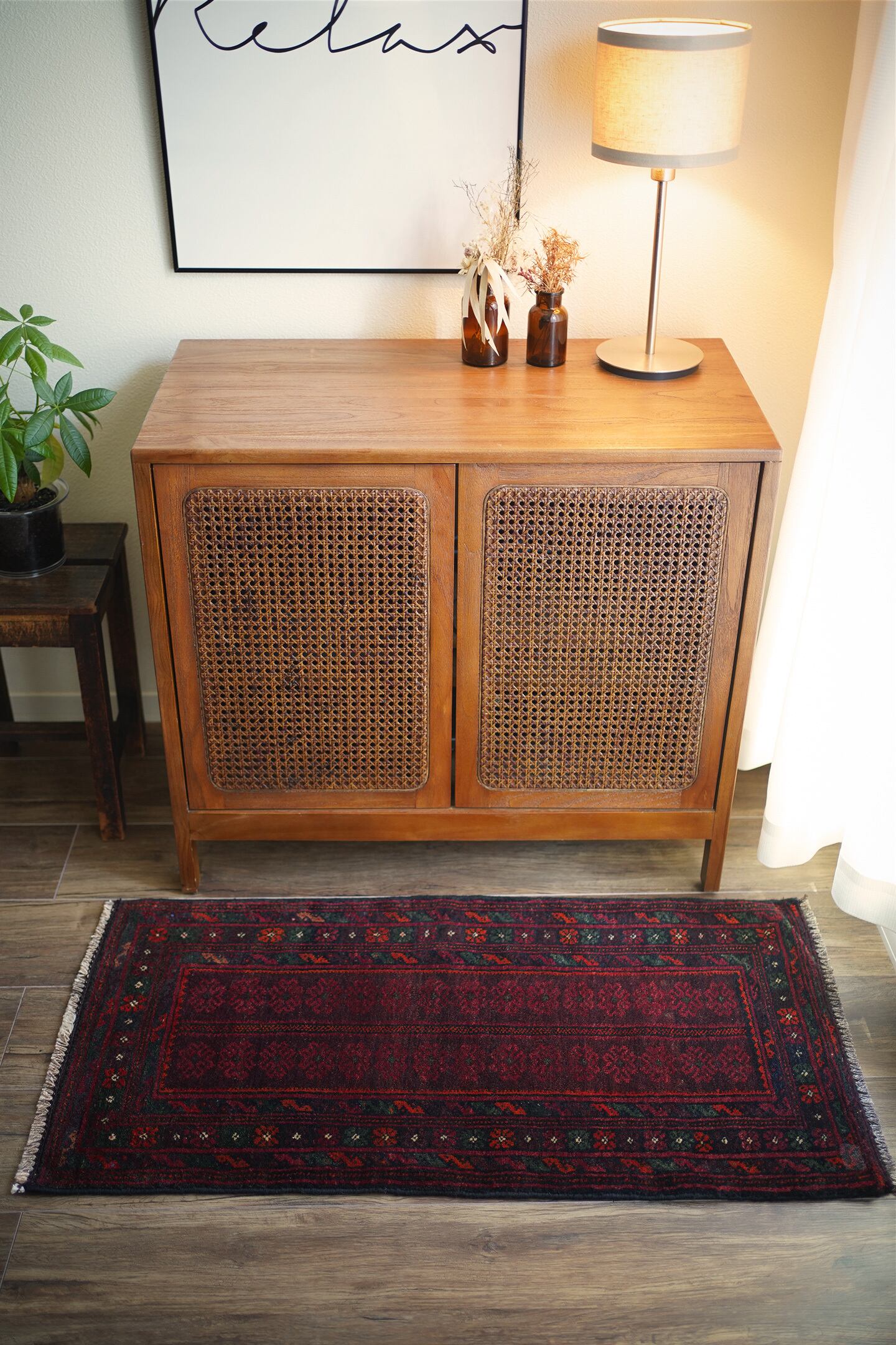 深い奥行きのある色味が魅力的な経年約40年のバルーチラグ。暗めな赤とダークグリーンの落ち着いた色の組み合わせが目を惹く一枚で、ラグ自体の主張はそこまでないものの、バランスの取れたデザインで非常にオシャレな印象を受けます。9mmほどの厚みもあり全体的な質感も◎。表面はふわっと柔らかく気持ちの良い肌触りをしています。状態は言うことなしのパーフェクトコンディション。店主オススメの一枚です♫