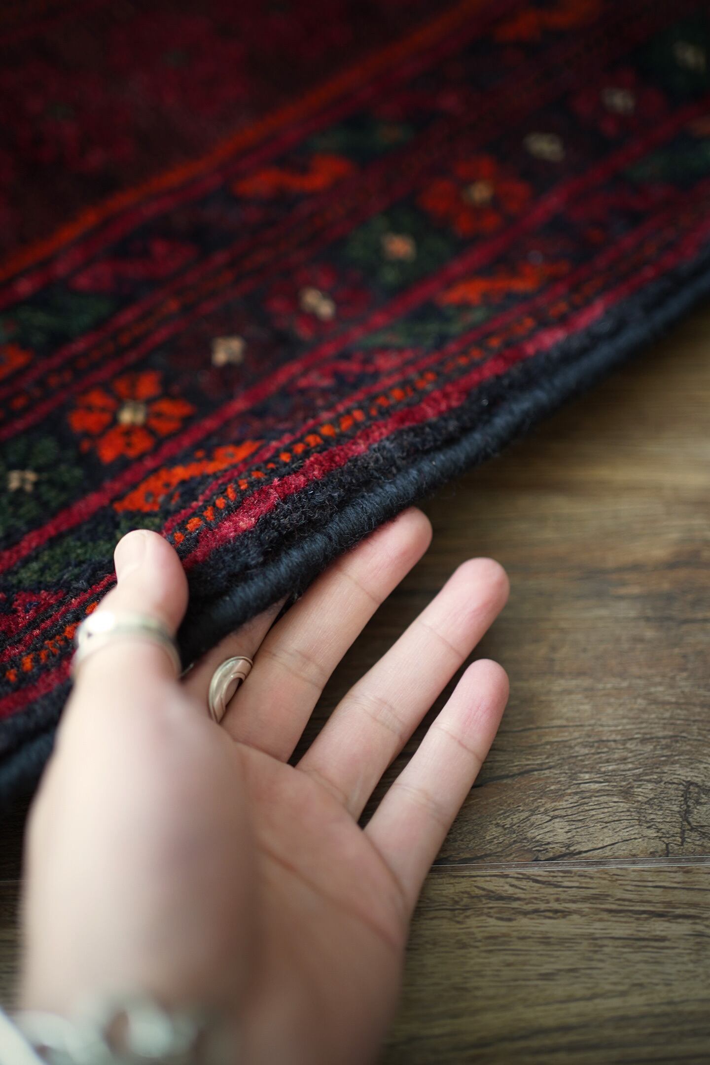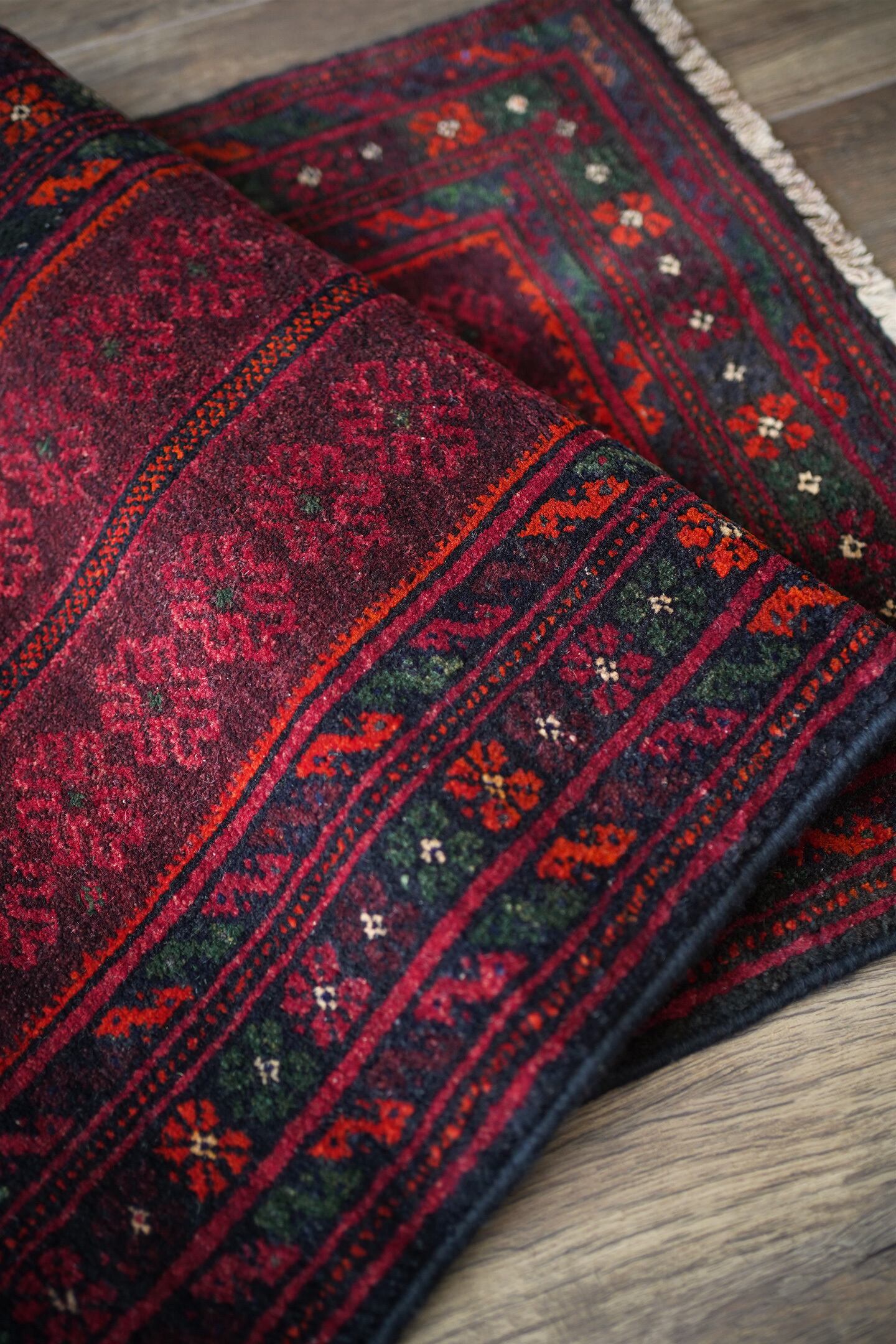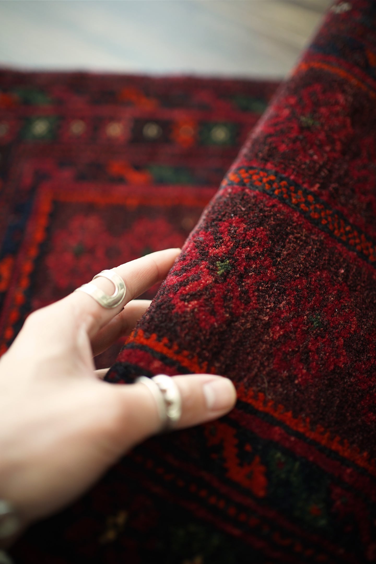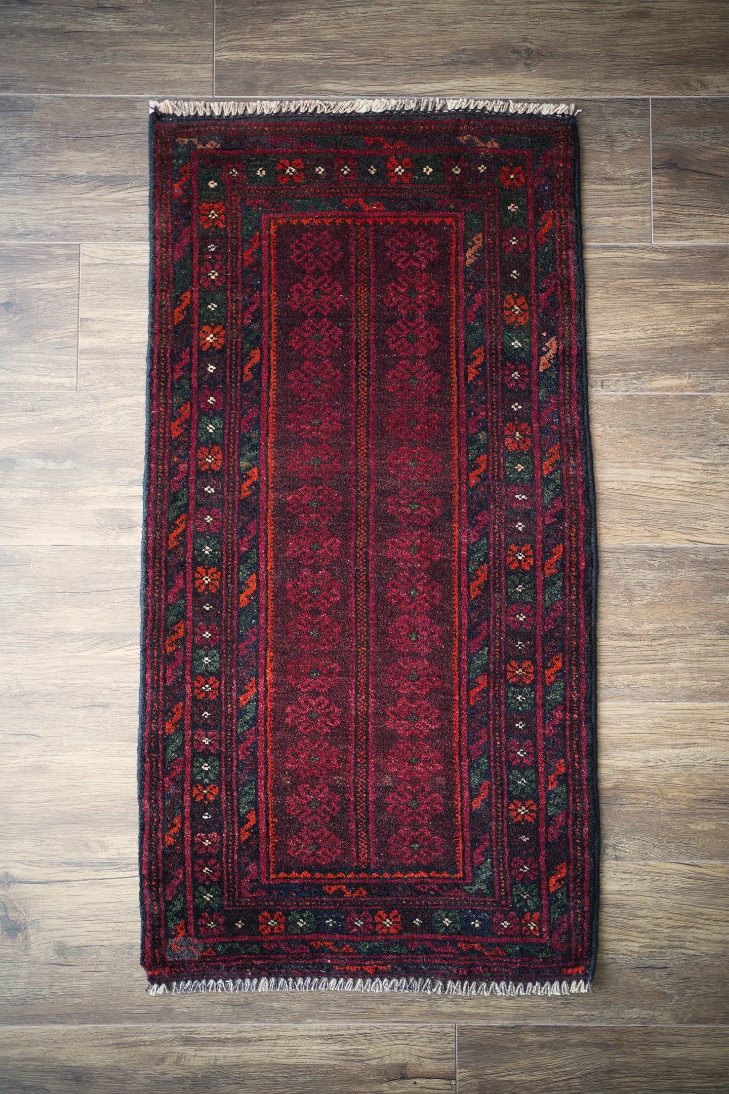 深い奥行きのある色味が魅力的な経年約40年のバルーチラグ。暗めな赤とダークグリーンの落ち着いた色の組み合わせが目を惹く一枚で、ラグ自体の主張はそこまでないものの、バランスの取れたデザインで非常にオシャレな印象を受けます。9mmほどの厚みもあり全体的な質感も◎。表面はふわっと柔らかく気持ちの良い肌触りをしています。状態は言うことなしのパーフェクトコンディション。店主オススメの一枚です♫