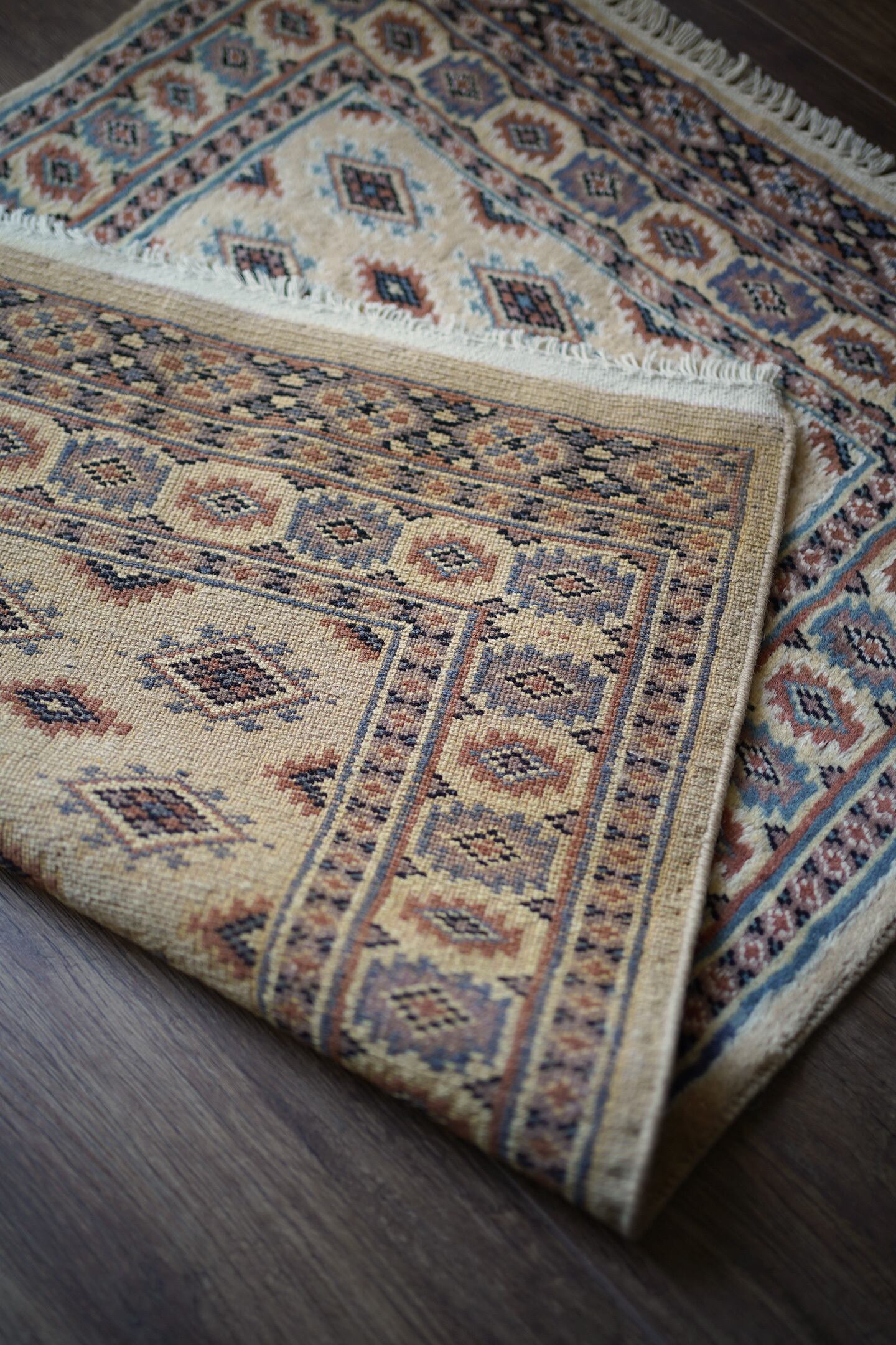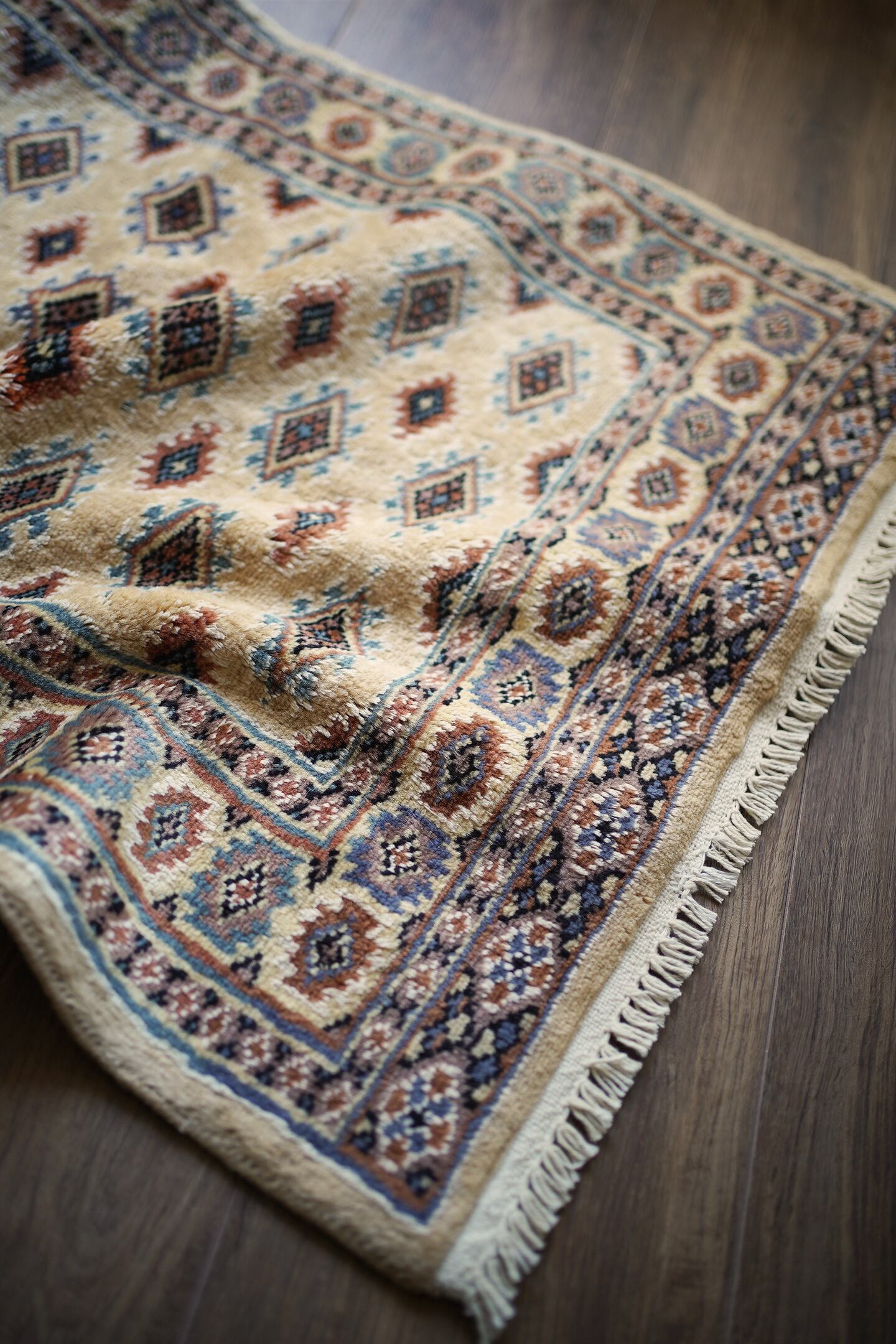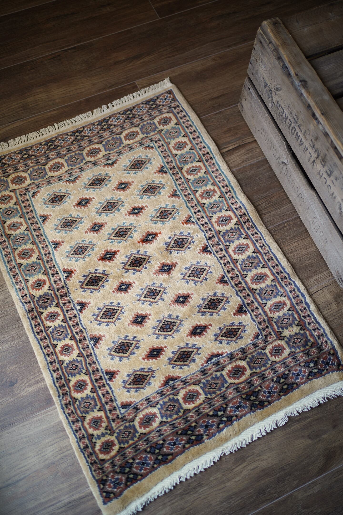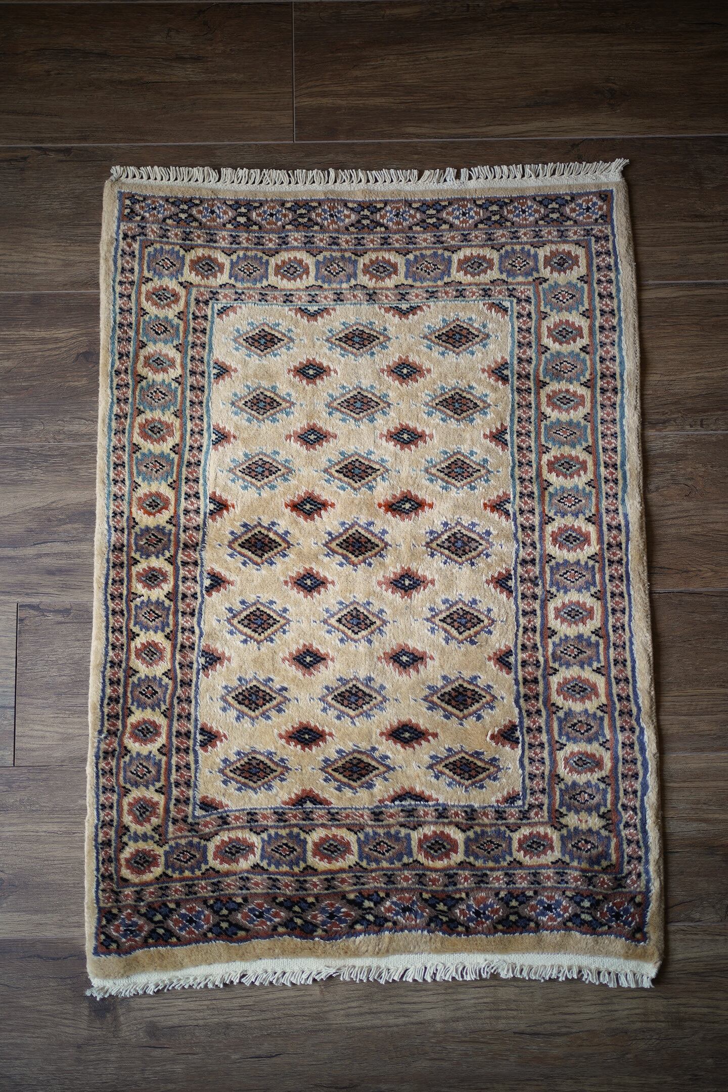 約30年前に織られたパキスタン産のラグです。ベージュの優しい色合いが魅力的な一枚で、淡いエメラルドグリーンや淡いブルーなどがアクセントカラーになっています。統一感のある落ち着いた配色で様々なインテリアに合わせやすい一枚かと思います。厚みは6mm程度で、表面はふわっと滑らかで気持ちの良い肌触り。状態も非常に良いです。柔らかい色味のラグをお探しの方へ。
