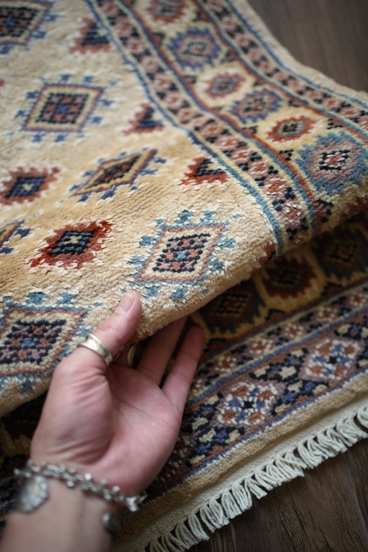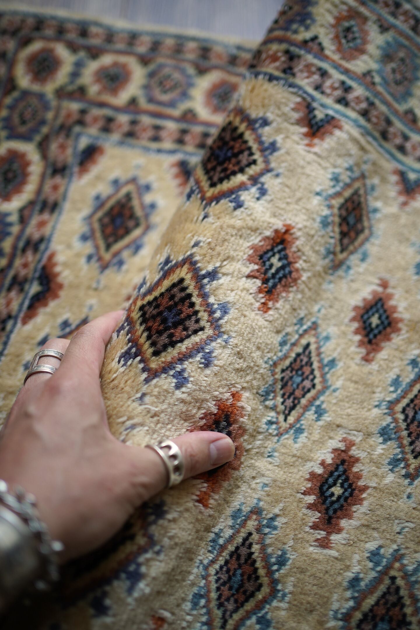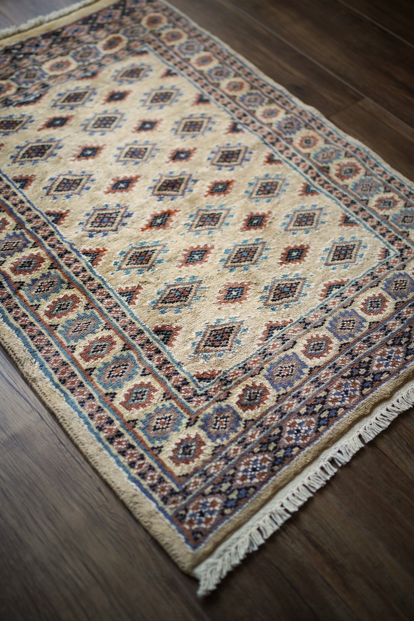 約30年前に織られたパキスタン産のラグです。ベージュの優しい色合いが魅力的な一枚で、淡いエメラルドグリーンや淡いブルーなどがアクセントカラーになっています。統一感のある落ち着いた配色で様々なインテリアに合わせやすい一枚かと思います。厚みは6mm程度で、表面はふわっと滑らかで気持ちの良い肌触り。状態も非常に良いです。柔らかい色味のラグをお探しの方へ。
