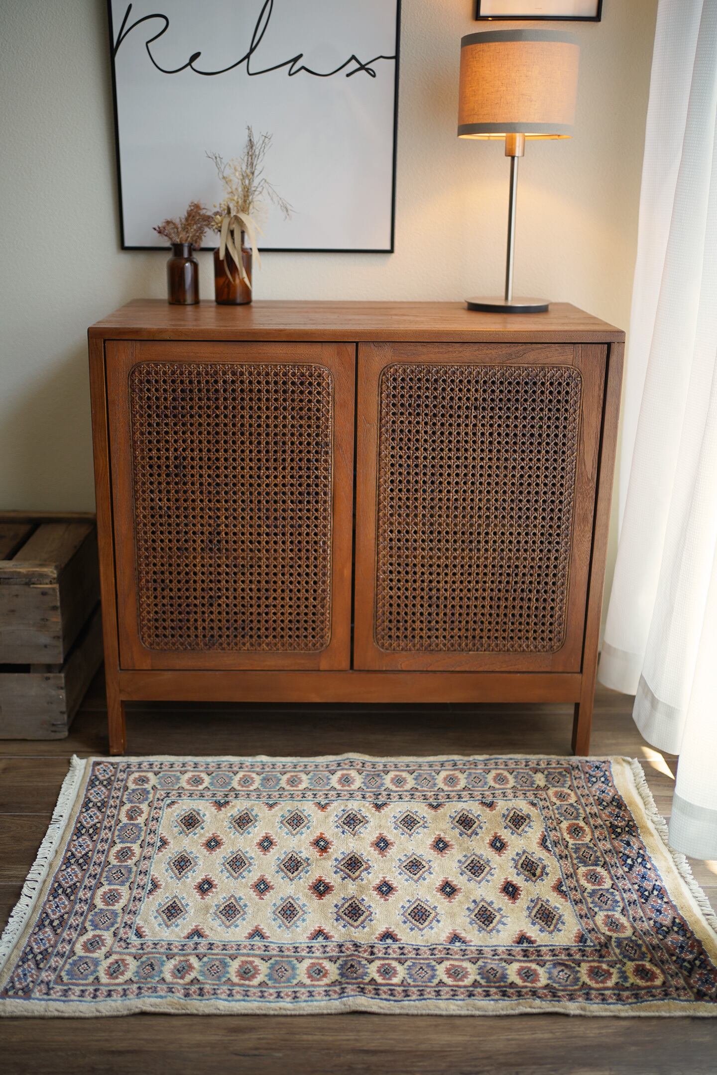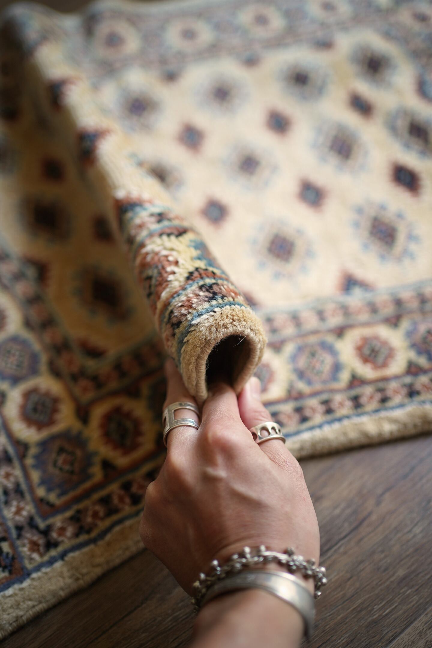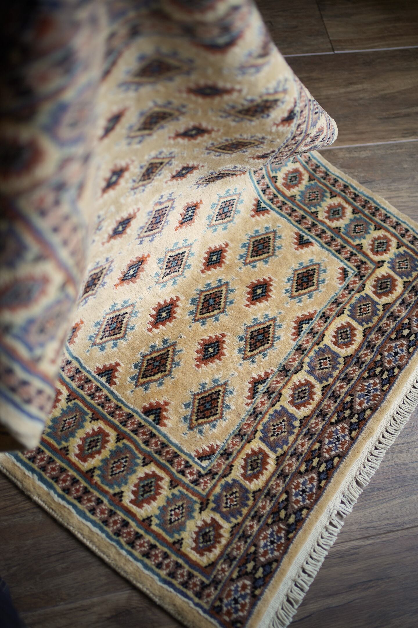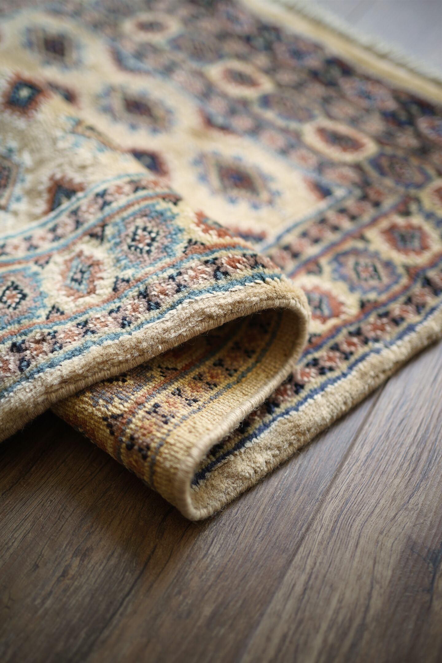 約30年前に織られたパキスタン産のラグです。ベージュの優しい色合いが魅力的な一枚で、淡いエメラルドグリーンや淡いブルーなどがアクセントカラーになっています。統一感のある落ち着いた配色で様々なインテリアに合わせやすい一枚かと思います。厚みは6mm程度で、表面はふわっと滑らかで気持ちの良い肌触り。状態も非常に良いです。柔らかい色味のラグをお探しの方へ。