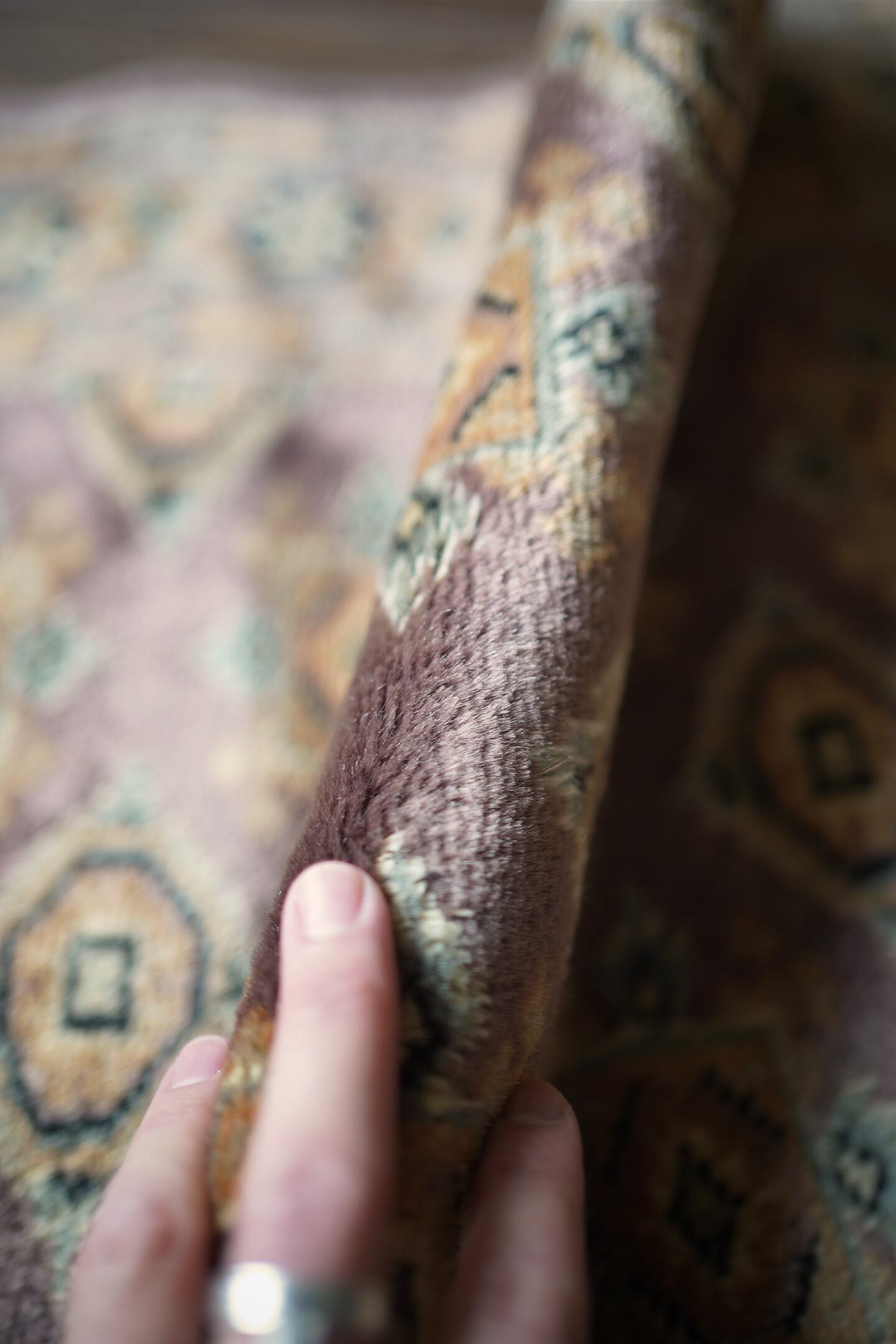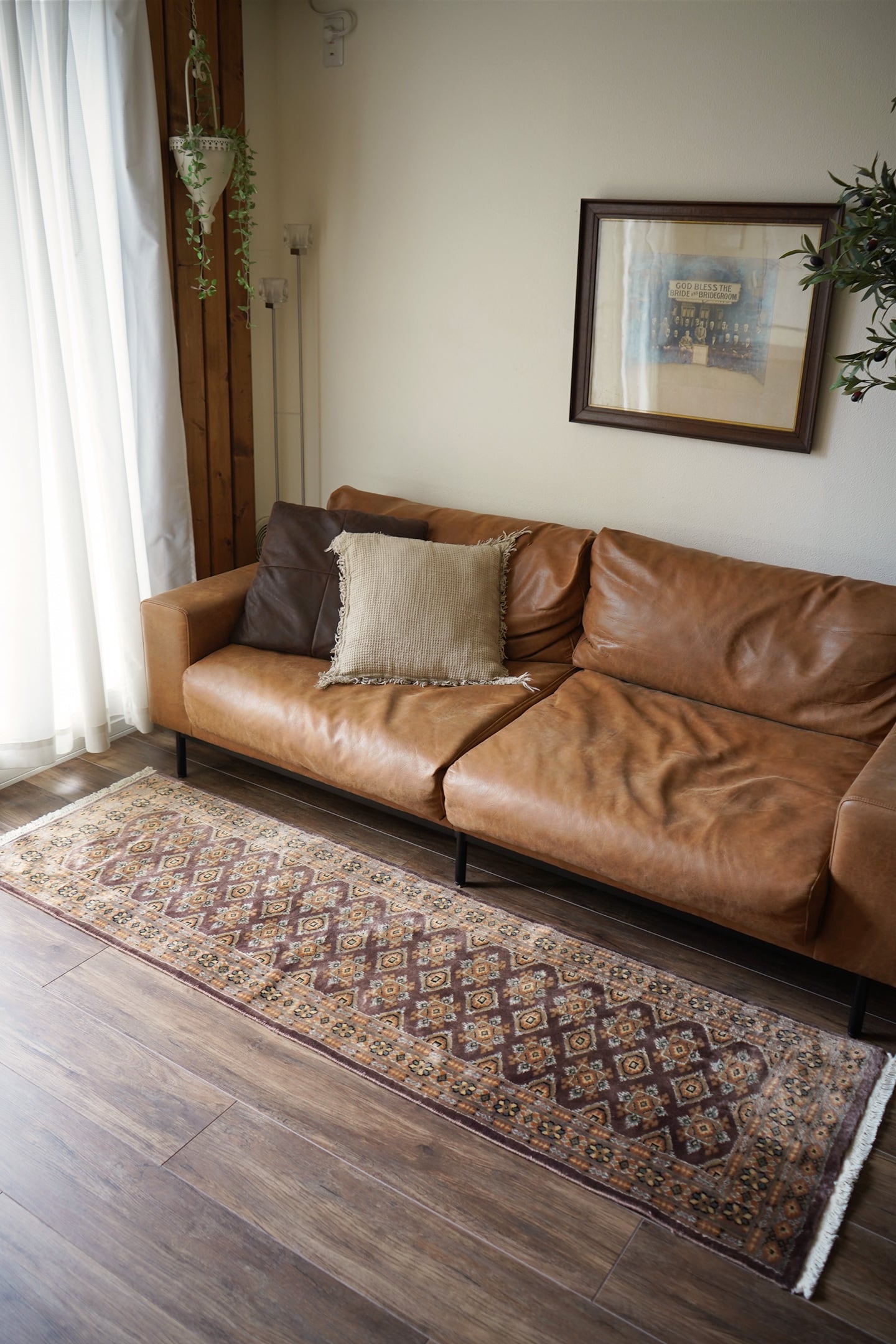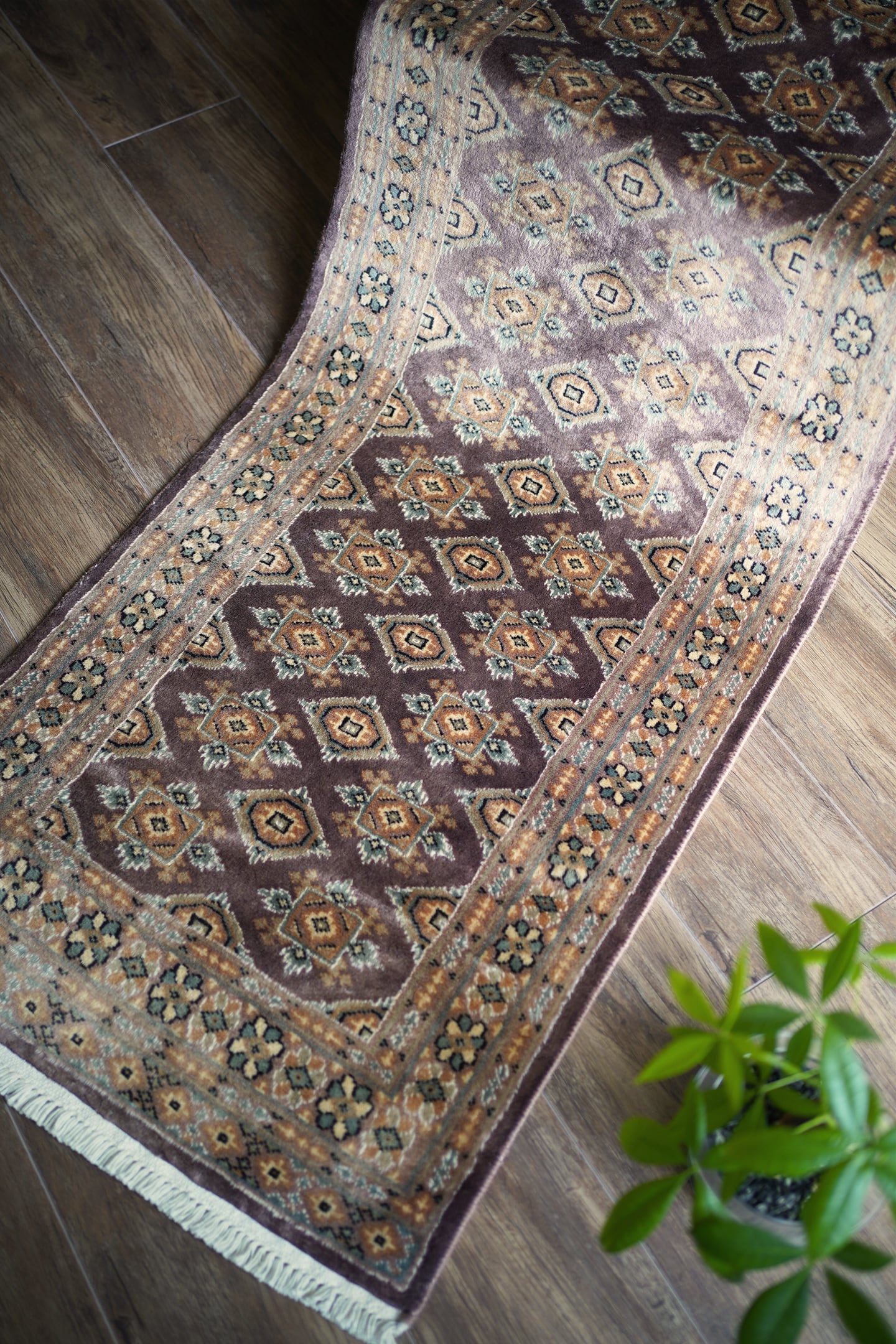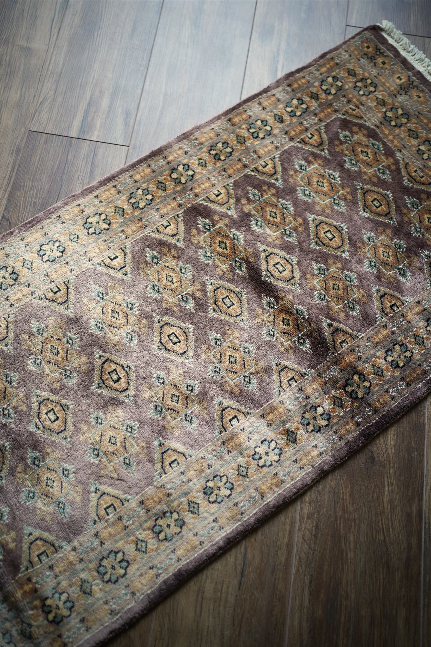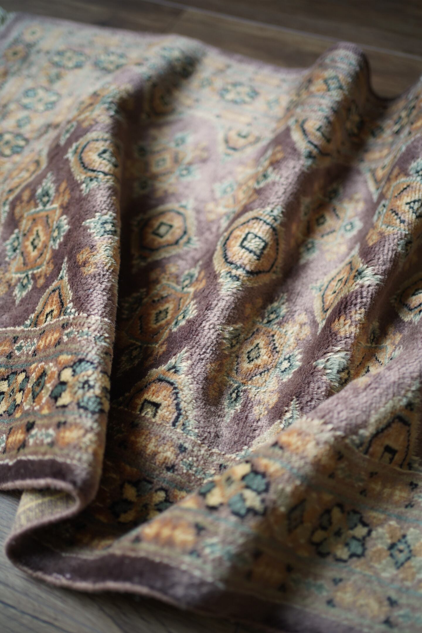 約30年前に織られたパキスタン産ラグ。パイル全体に光沢感のある艶が広がっており、非常に美しい一枚です。一方から見ると暗めのダークブラウンで、もう一方から見ると光沢が強くグレーとベージュの間のようなカラーの一枚。その他、ベージュ、肌色、くすんだミントグリーンなどが使われた配色です。表面はふわっと滑らかで、柔らかく気持ちの良い肌触りをしています。厚みは6mmほど。状態も大変良好で、パーフェクトなコンディション。ランナータイプなので廊下やキッチンスペースなどにオススメです♪