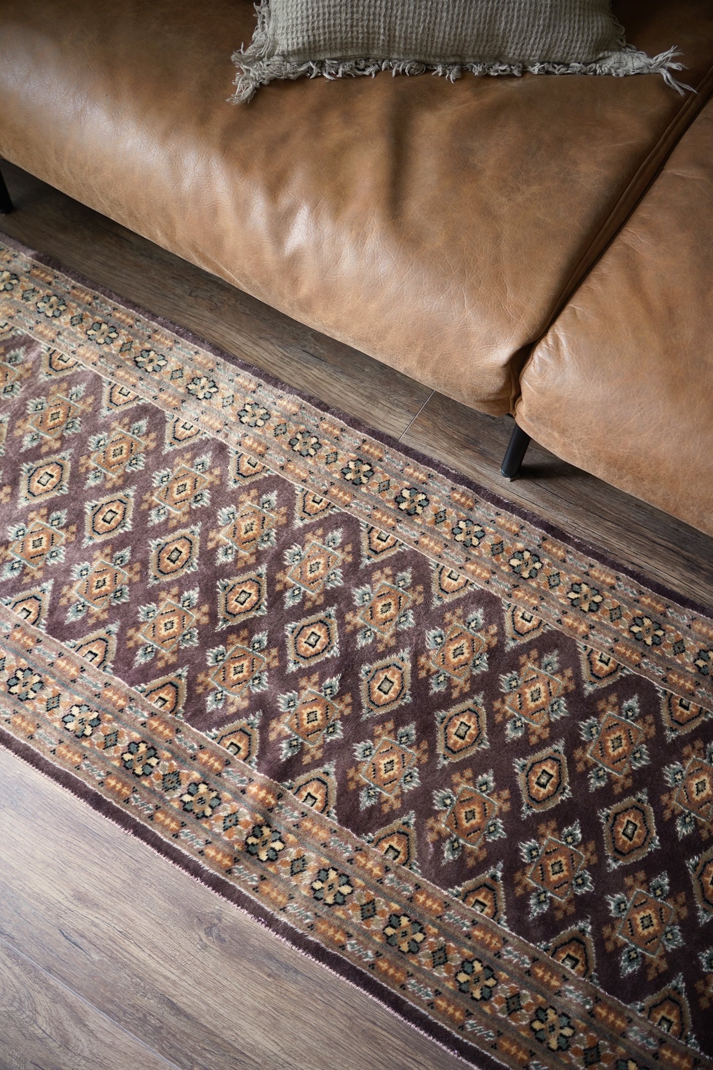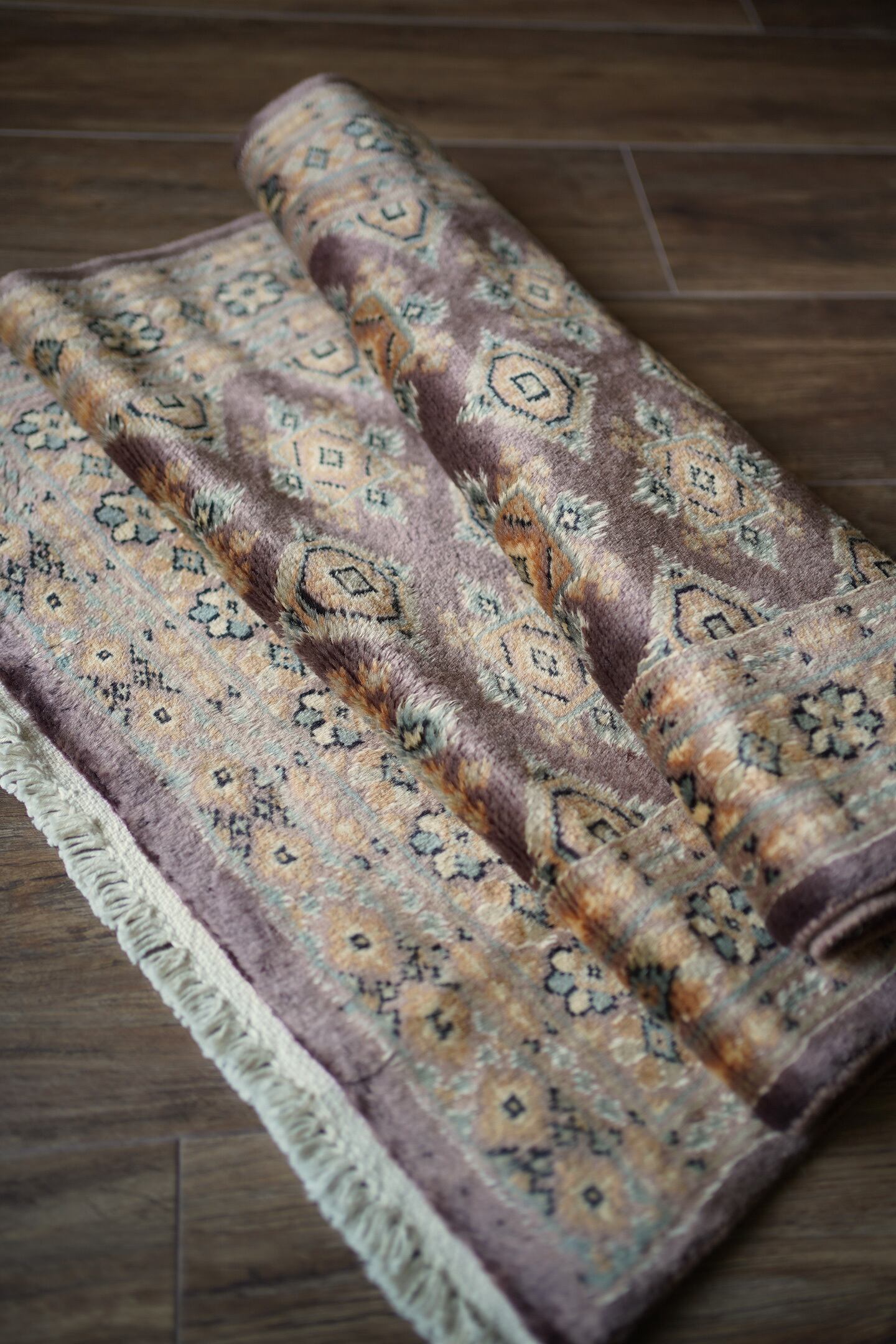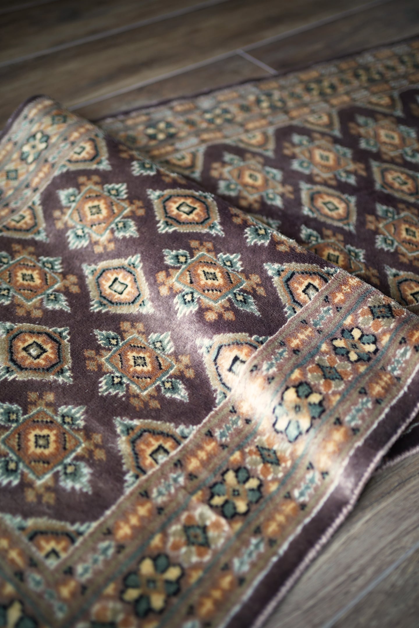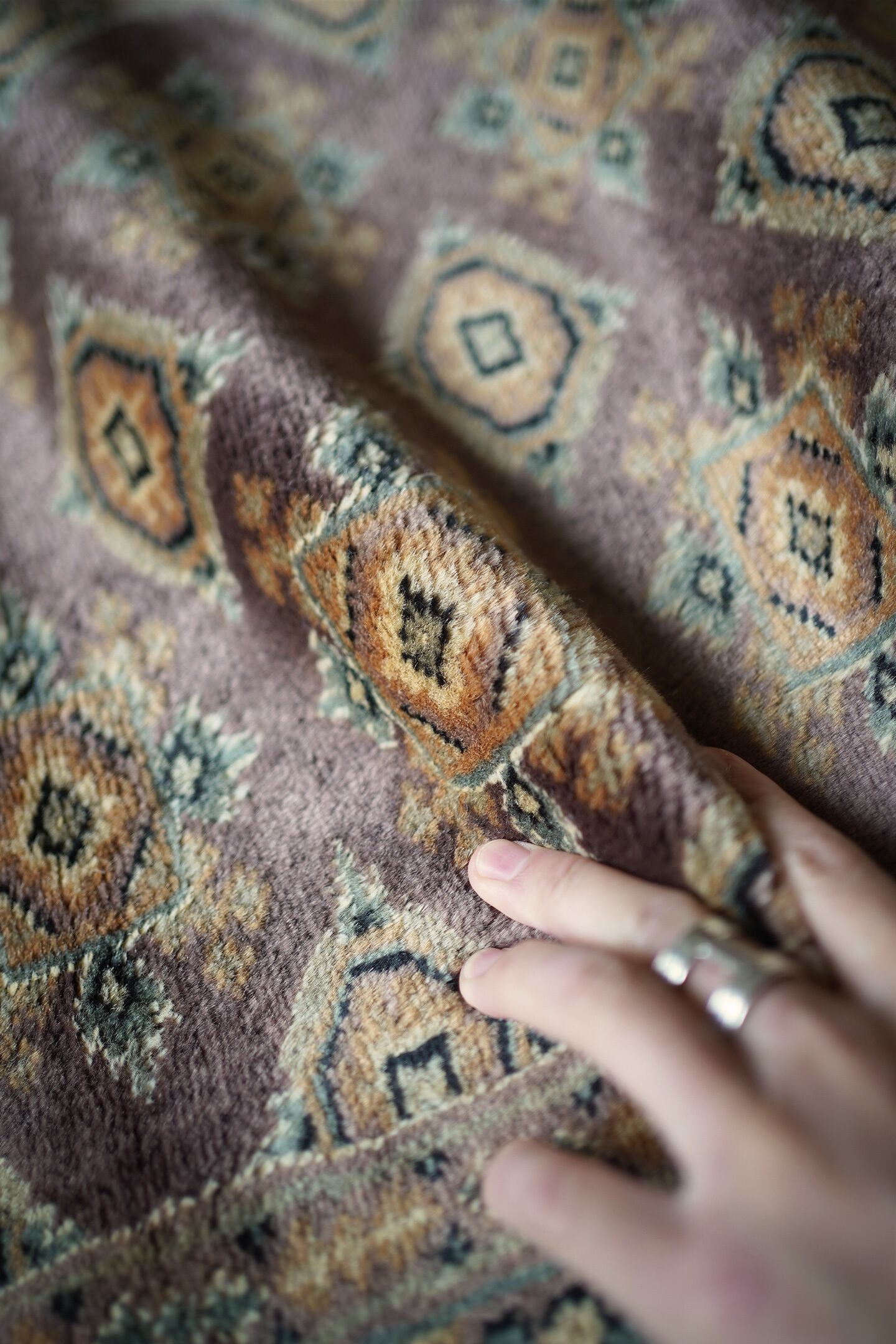 約30年前に織られたパキスタン産ラグ。パイル全体に光沢感のある艶が広がっており、非常に美しい一枚です。一方から見ると暗めのダークブラウンで、もう一方から見ると光沢が強くグレーとベージュの間のようなカラーの一枚。その他、ベージュ、肌色、くすんだミントグリーンなどが使われた配色です。表面はふわっと滑らかで、柔らかく気持ちの良い肌触りをしています。厚みは6mmほど。状態も大変良好で、パーフェクトなコンディション。ランナータイプなので廊下やキッチンスペースなどにオススメです♪