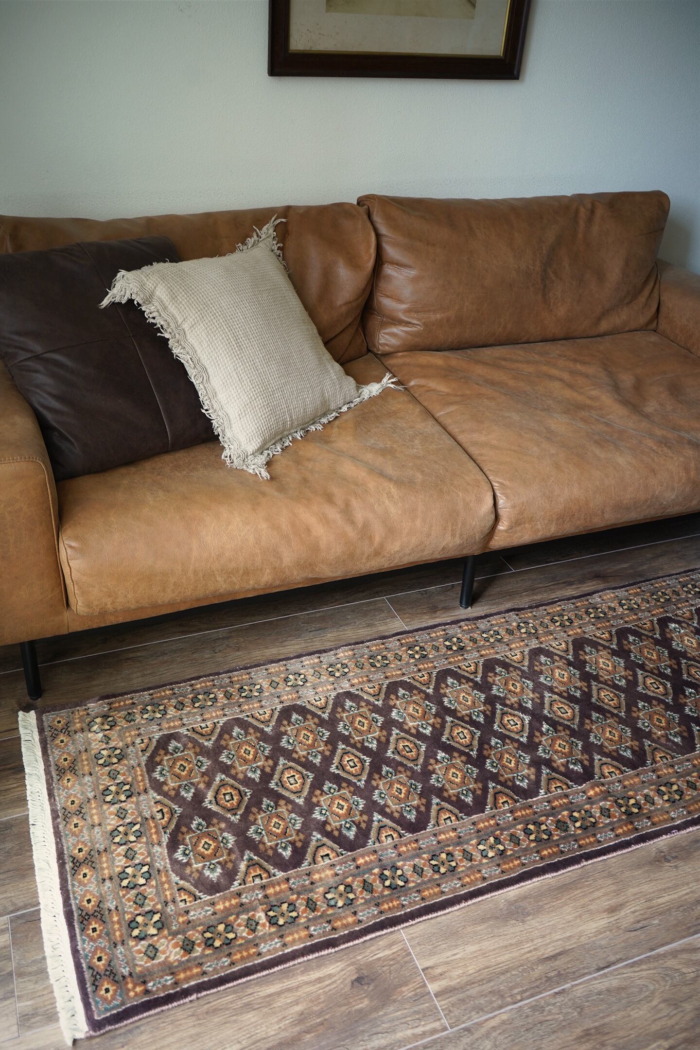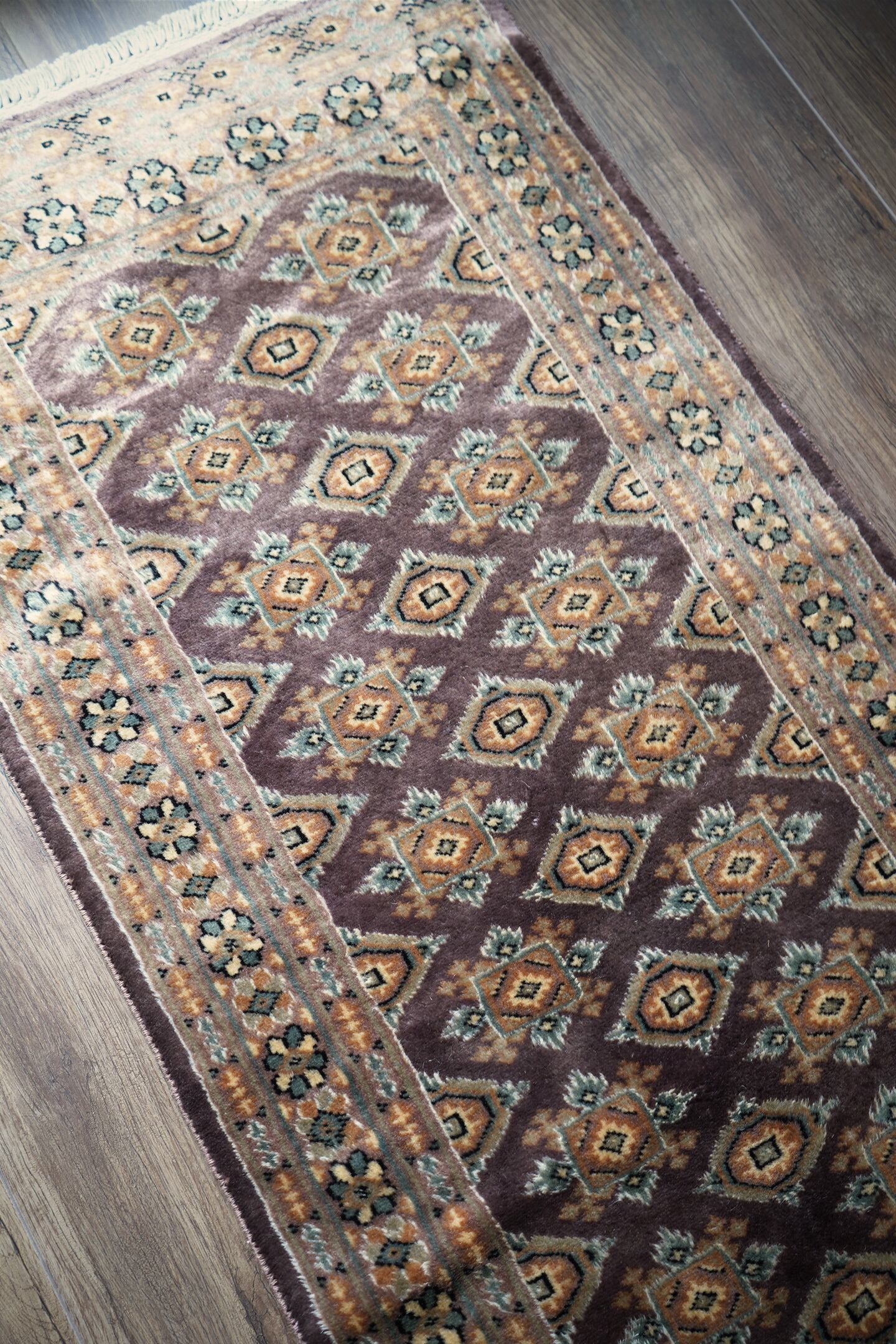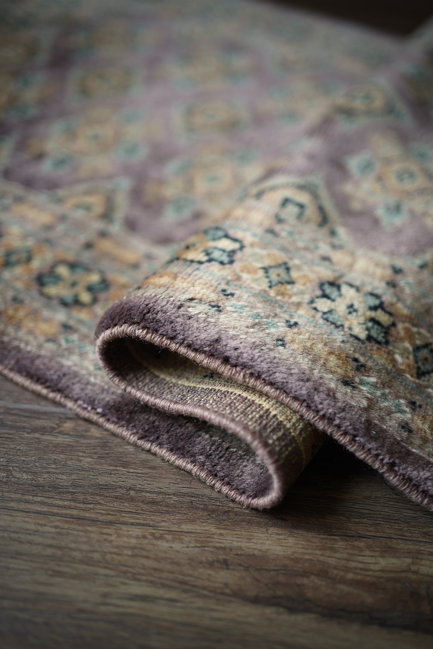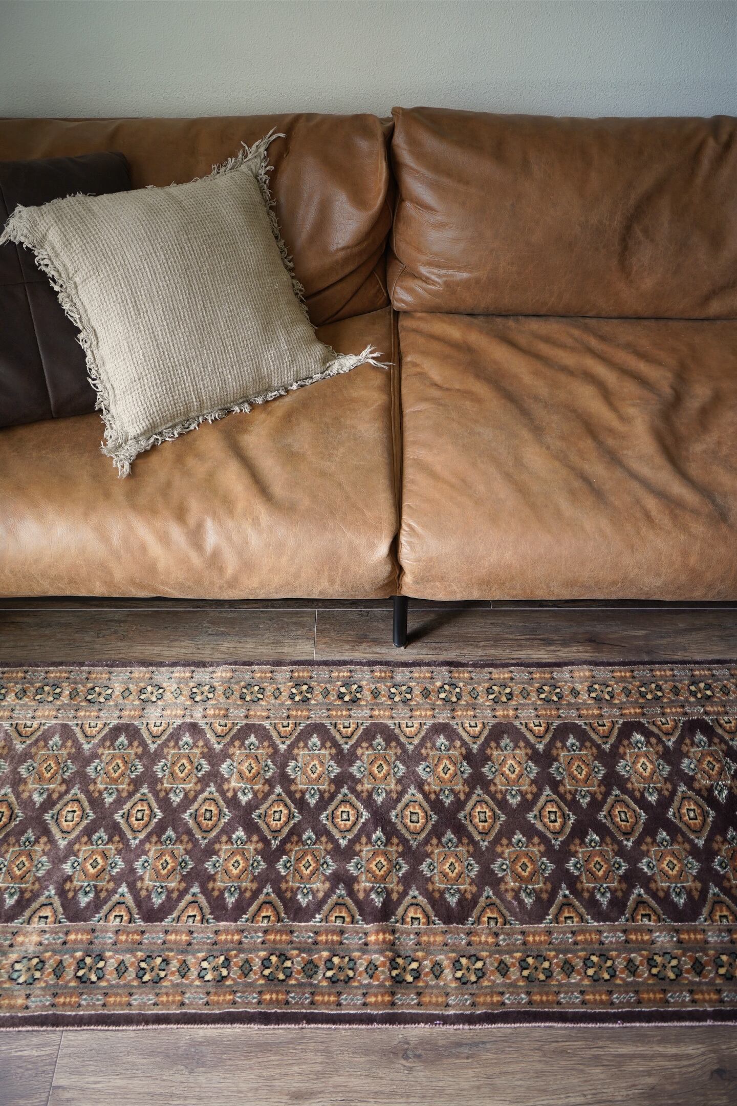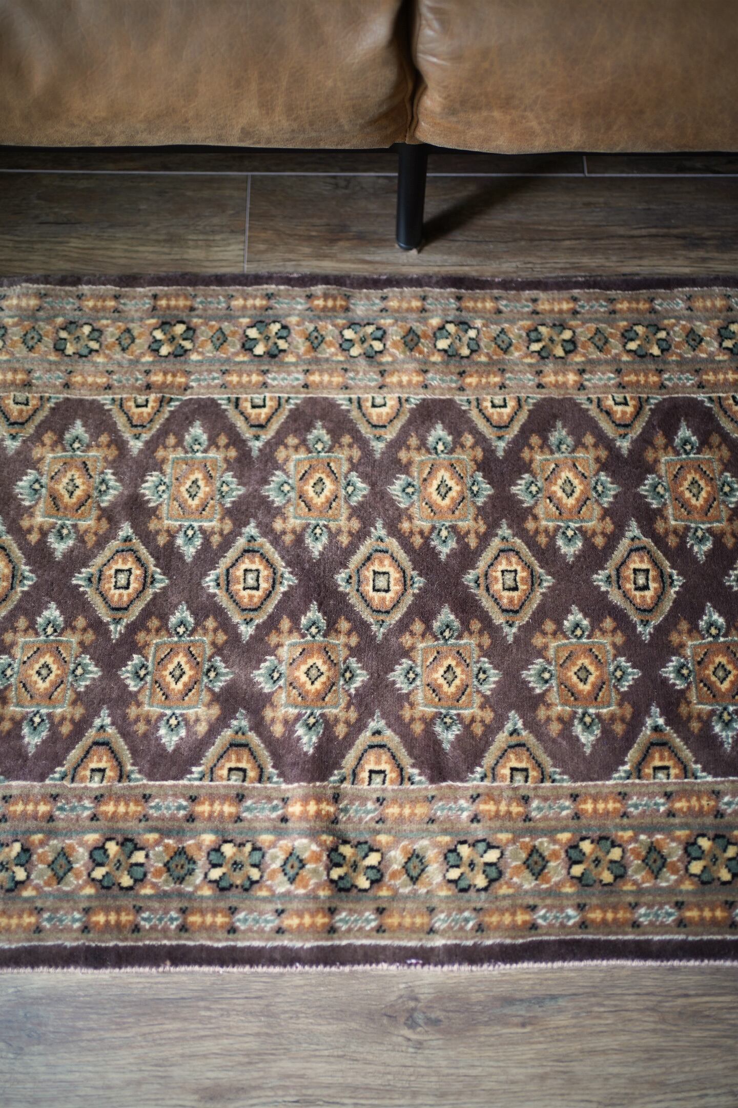 約30年前に織られたパキスタン産ラグ。パイル全体に光沢感のある艶が広がっており、非常に美しい一枚です。一方から見ると暗めのダークブラウンで、もう一方から見ると光沢が強くグレーとベージュの間のようなカラーの一枚。その他、ベージュ、肌色、くすんだミントグリーンなどが使われた配色です。表面はふわっと滑らかで、柔らかく気持ちの良い肌触りをしています。厚みは6mmほど。状態も大変良好で、パーフェクトなコンディション。ランナータイプなので廊下やキッチンスペースなどにオススメです♪