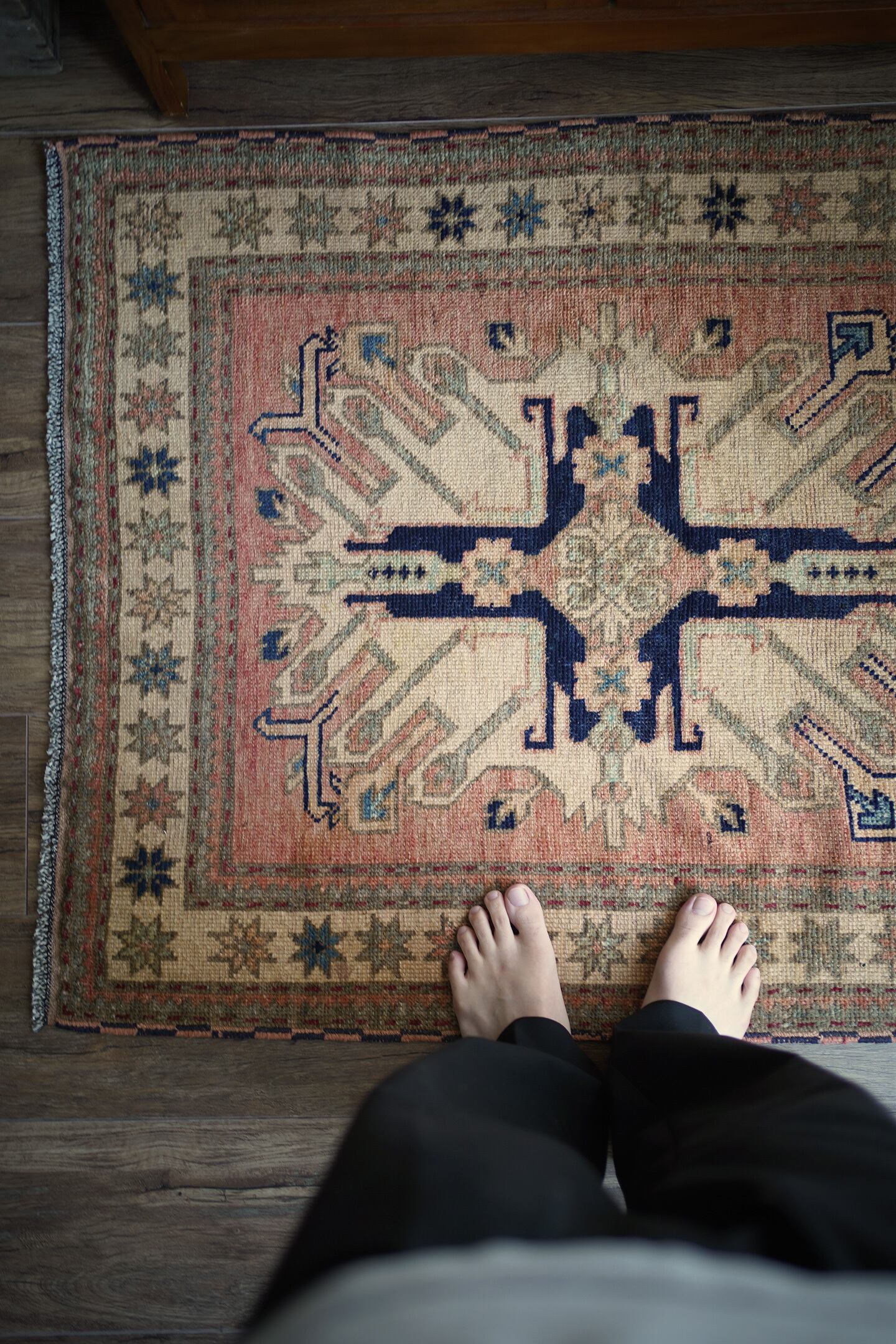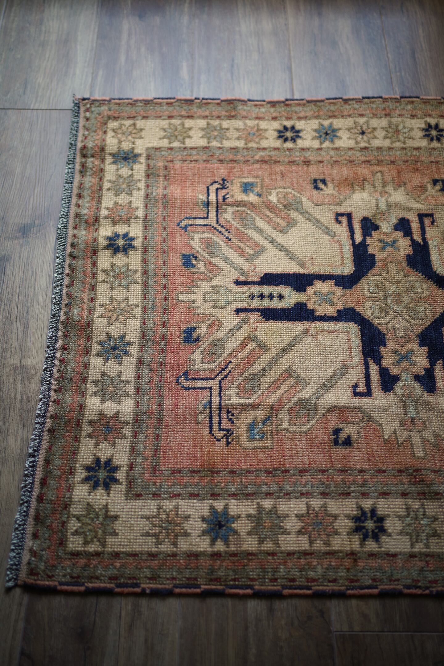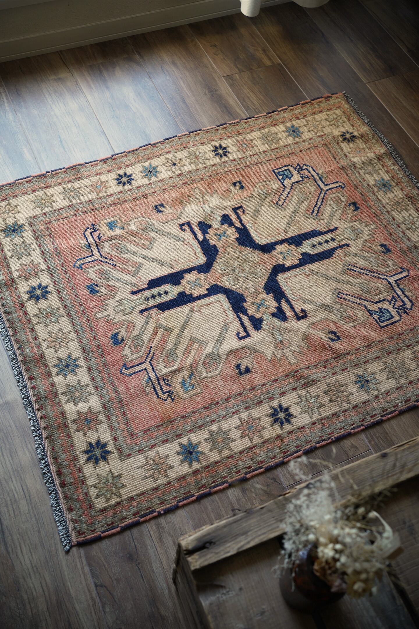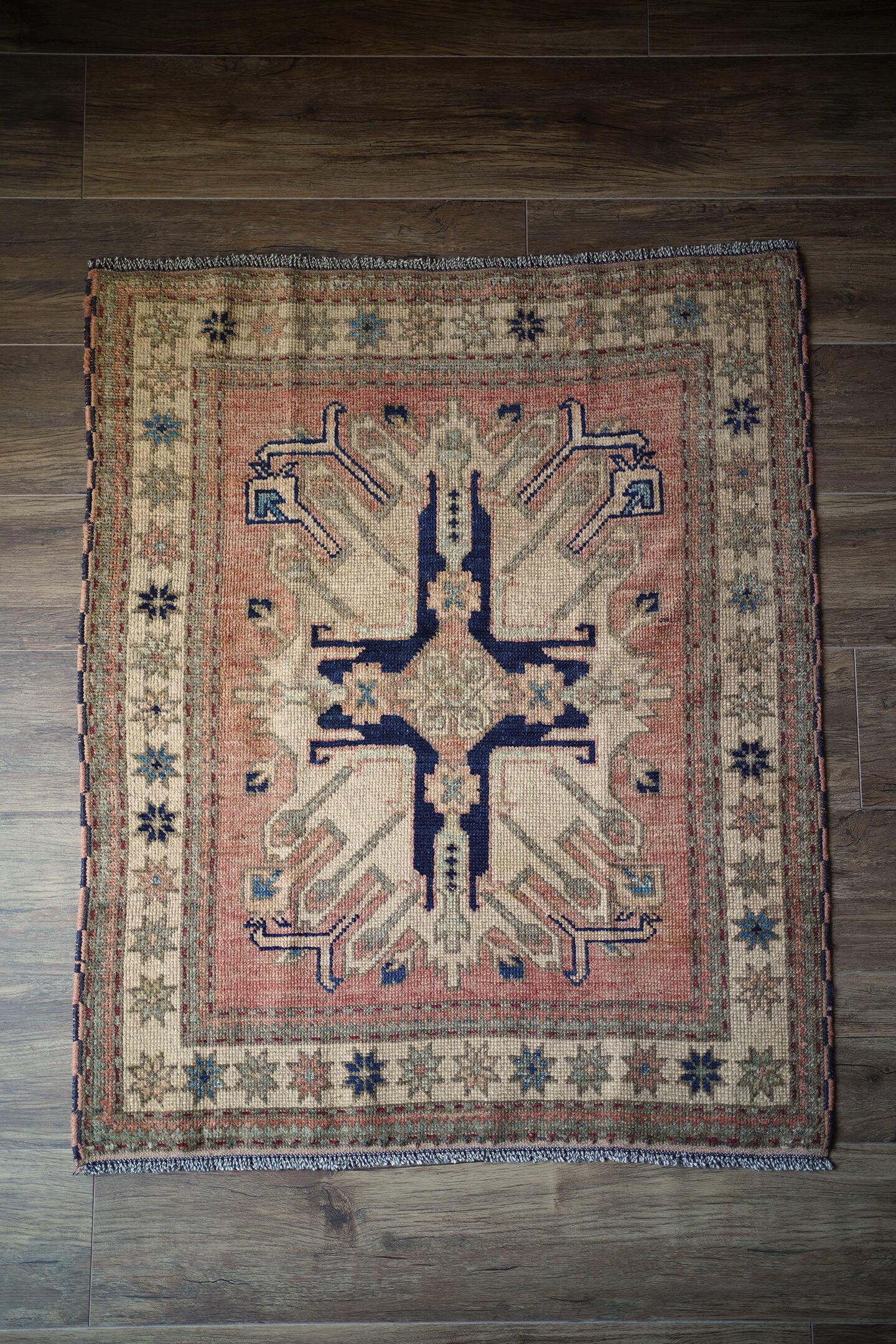 約1960年頃にコーカサス地方で織られたヴィンテージのカザックラグです。フィールドの中央にはコーカサス地方に伝わる太陽の紋様から図案化されたとされる"サンバースト紋様(イーグルカザック紋様とも呼ばれています)が大きく1つ織り込まれています。優しい雰囲気のサーモンピンクをベースカラーに、濃紺と薄いブルーグリーンの色の組み合わせが非常に魅力的です。厚みは4mm程度。表面のパイルは少し残っているものの、表面はサラッとサッパリとした肌触りをしています。ダメージや補修された跡もなく、グッドコンディション。アートピースとして壁に飾っても大変素敵かと思います。