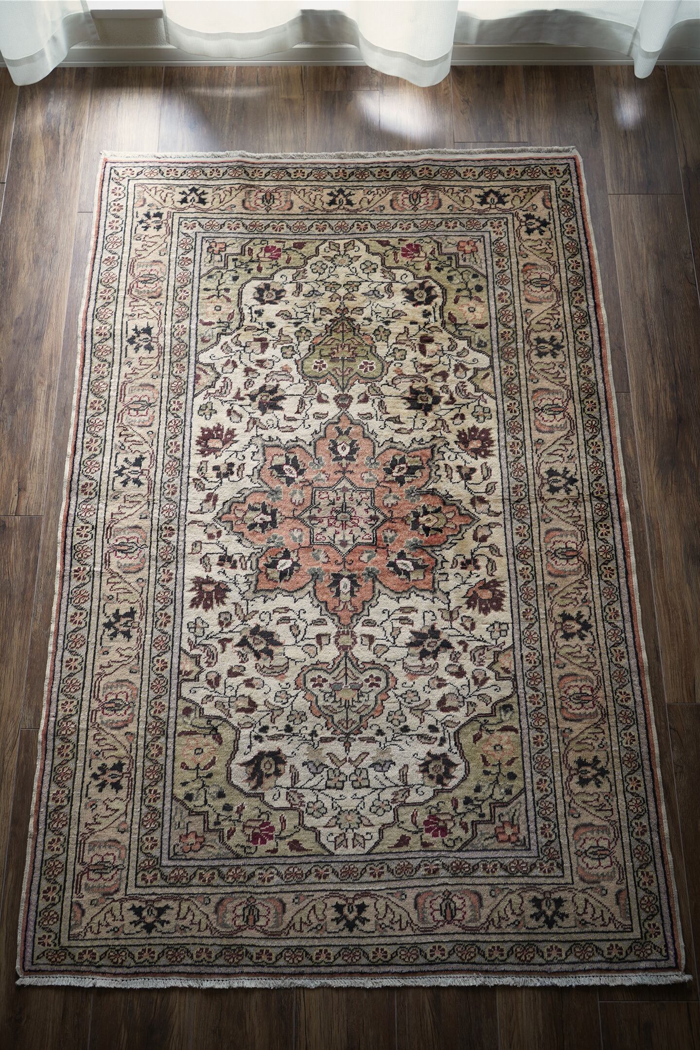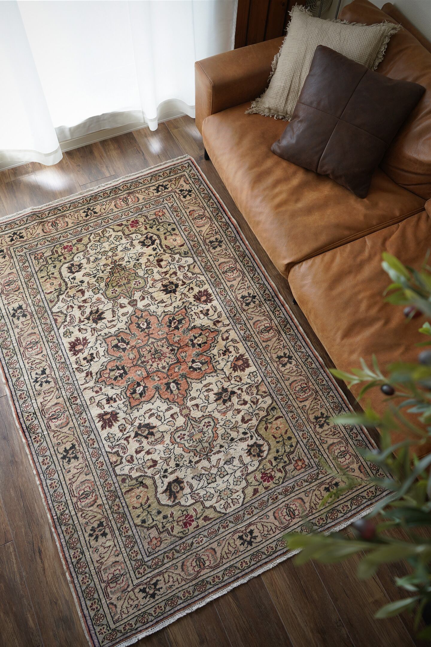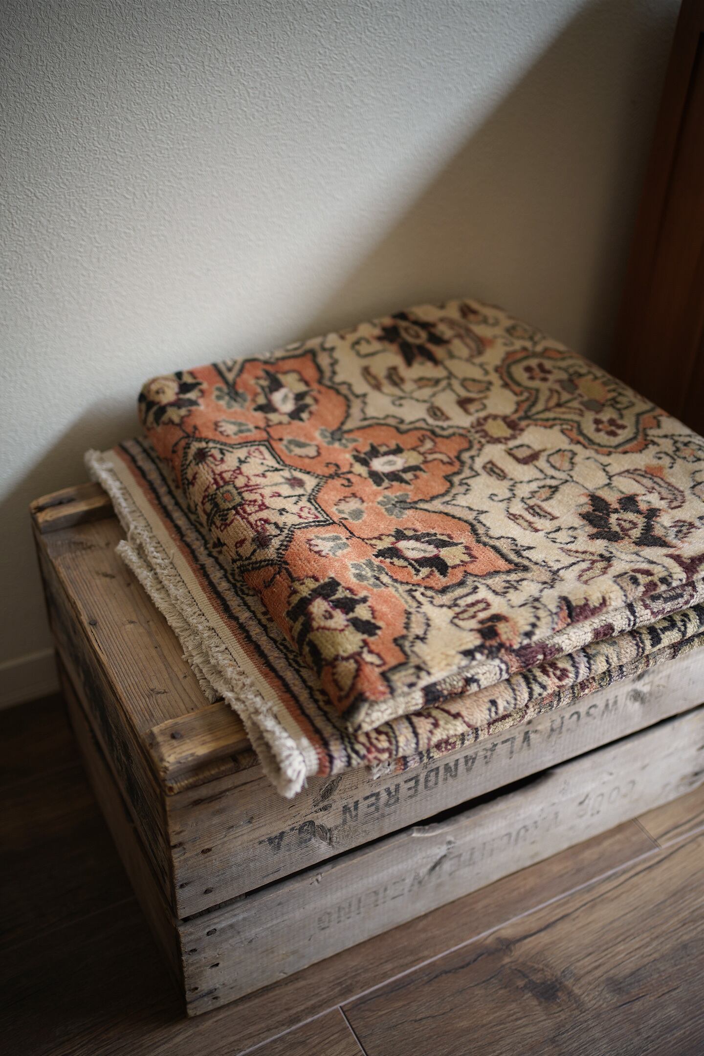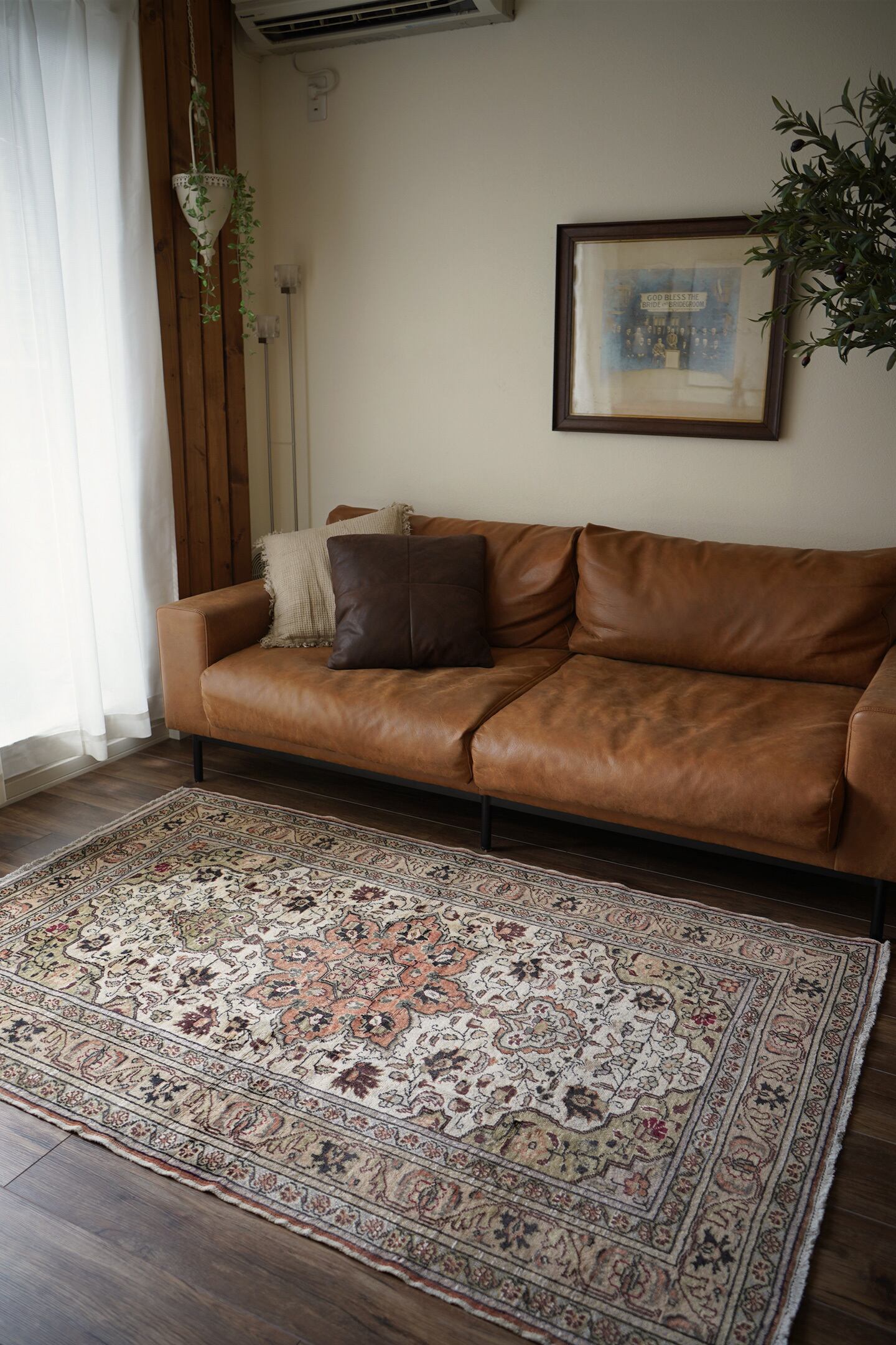 経年約40年ほどのトルコ産のヴィンテージラグ。花柄モチーフのデザインに、淡いサーモンピンクとホフホワイトの組み合わせが非常に可愛らしい雰囲気の一枚。コーナー部分で使われている赤紫色の花がアクセントになっており、店主の好きなポイントです。厚みは4mm〜5mm程度で、表面のパイルはサラッと滑らかな肌触り。ダメージや補修跡なども見受けられるずコンディションも良好。落ち着いた優しい色味なので様々な家具とも相性がよく、自然と馴染んでくれそうです。リビングのソファ前をはじめ、ダイニングテーブル下などにも。