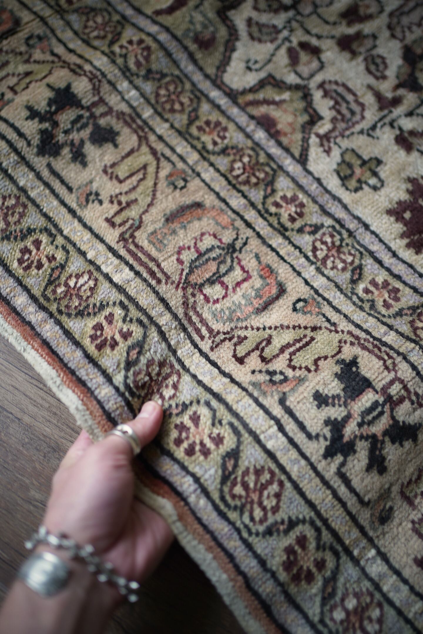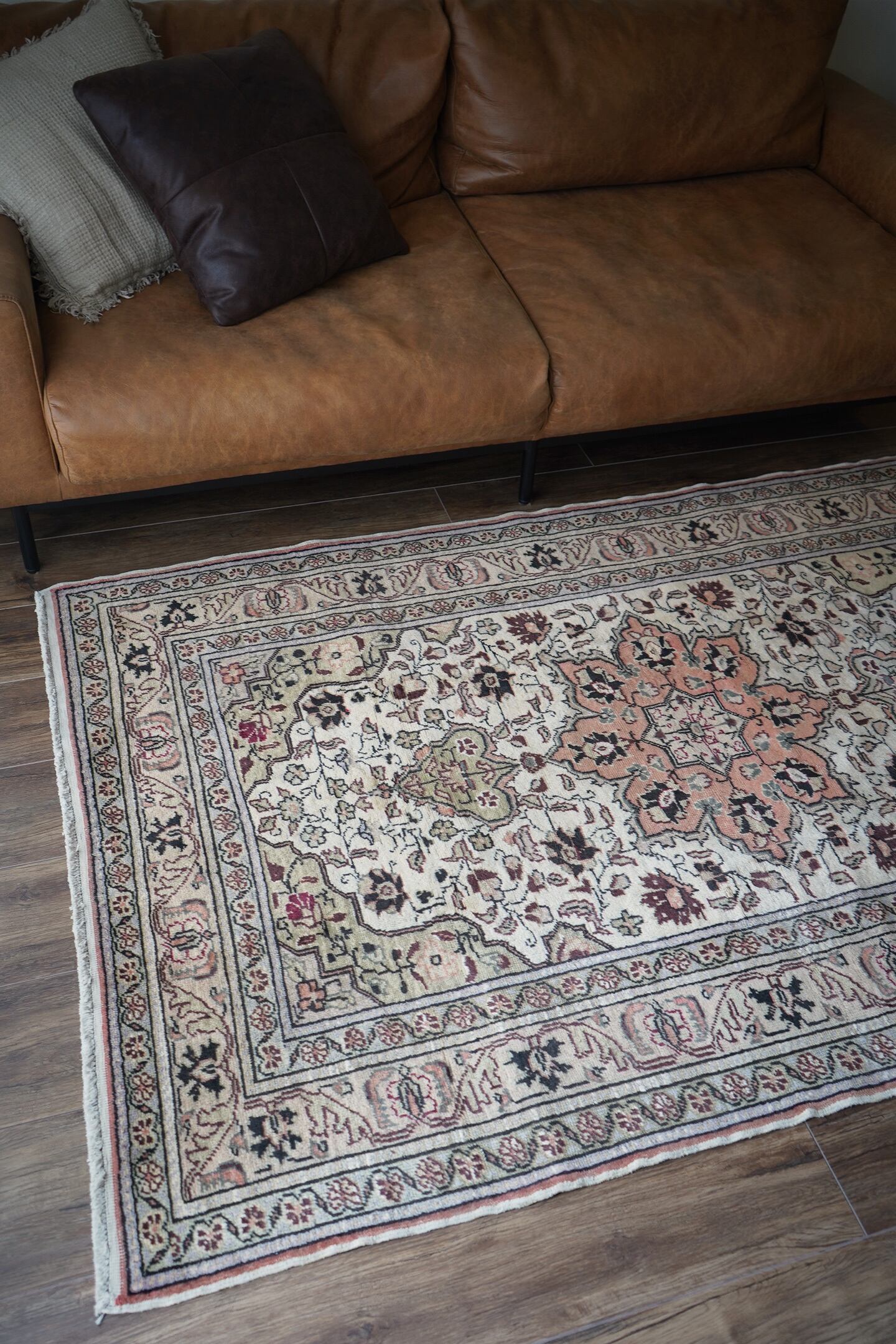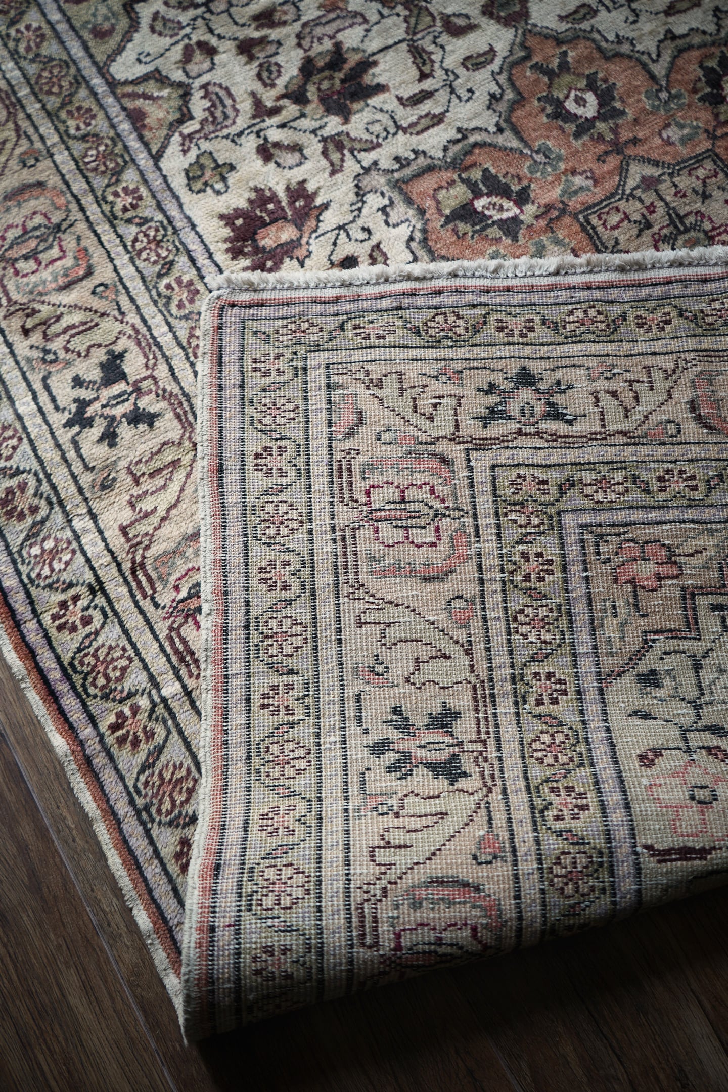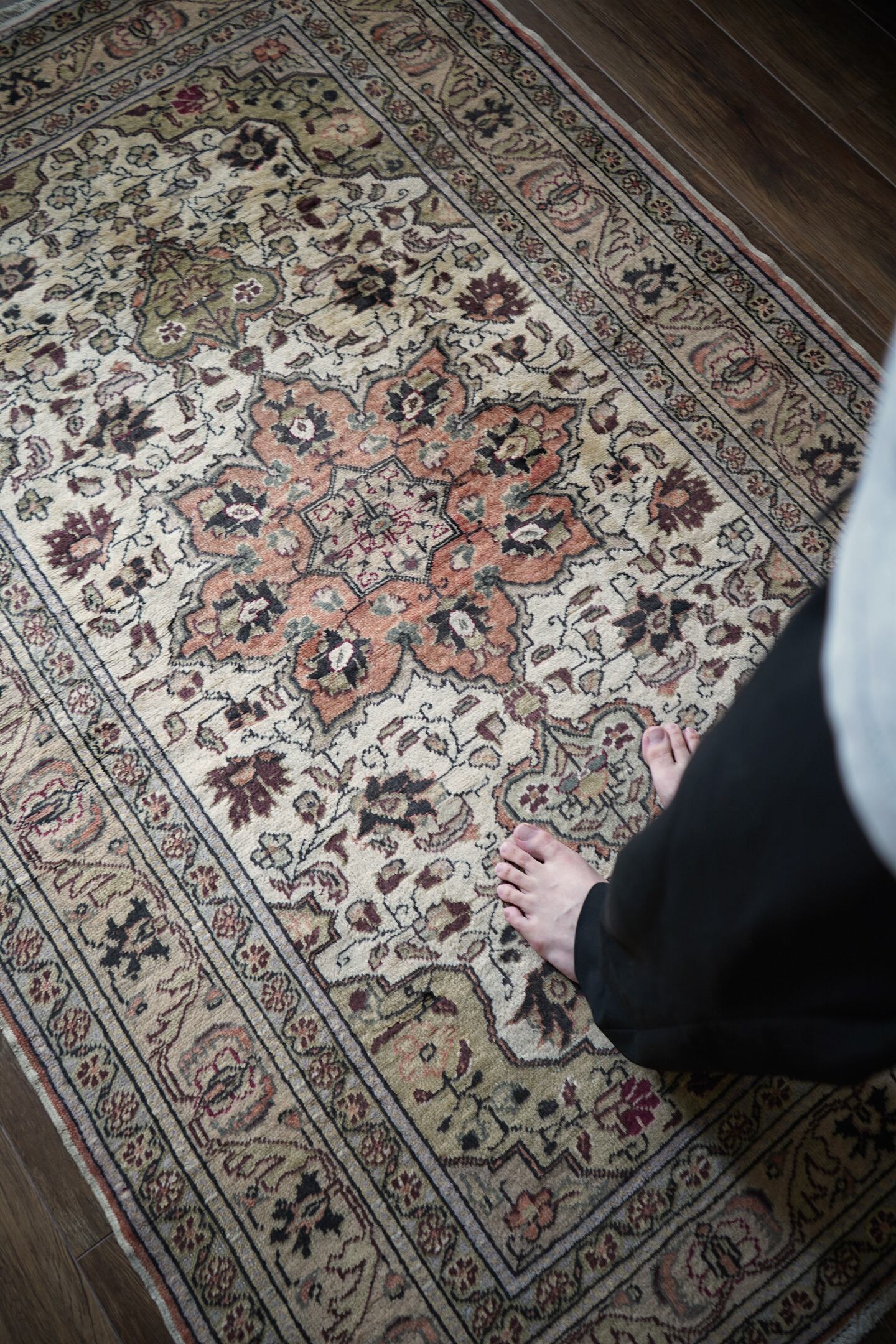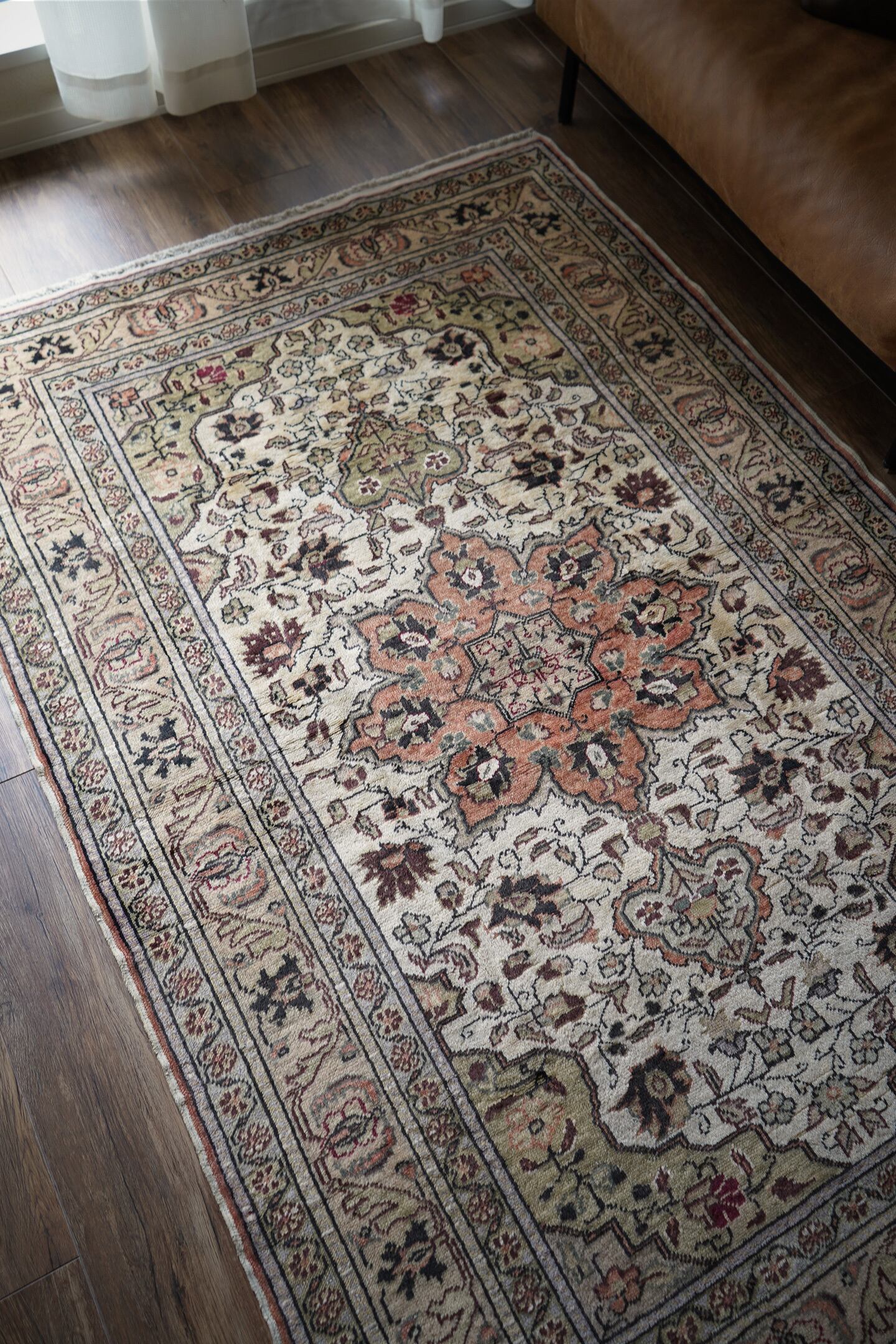 経年約40年ほどのトルコ産のヴィンテージラグ。花柄モチーフのデザインに、淡いサーモンピンクとホフホワイトの組み合わせが非常に可愛らしい雰囲気の一枚。コーナー部分で使われている赤紫色の花がアクセントになっており、店主の好きなポイントです。厚みは4mm〜5mm程度で、表面のパイルはサラッと滑らかな肌触り。ダメージや補修跡なども見受けられるずコンディションも良好。落ち着いた優しい色味なので様々な家具とも相性がよく、自然と馴染んでくれそうです。リビングのソファ前をはじめ、ダイニングテーブル下などにも。