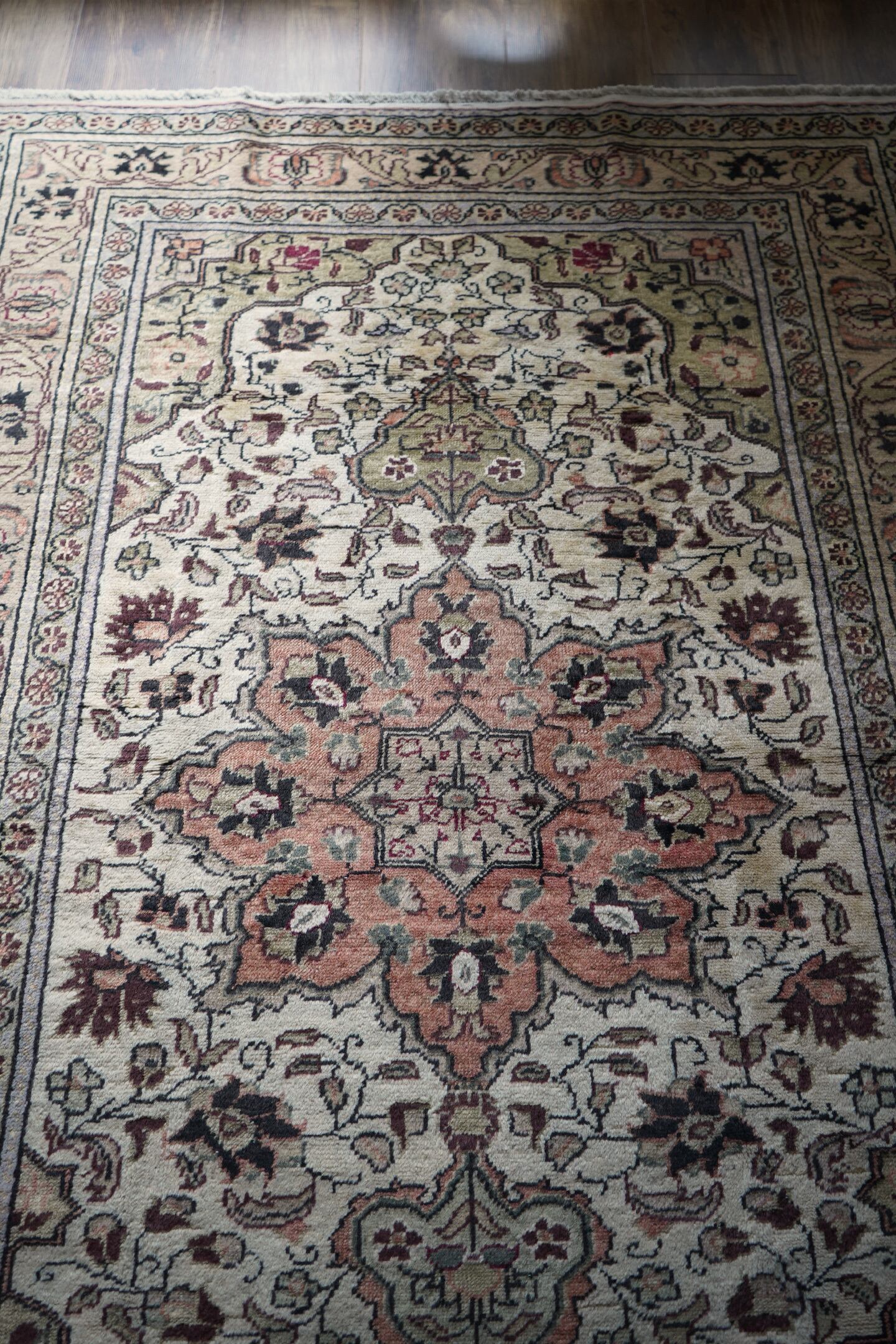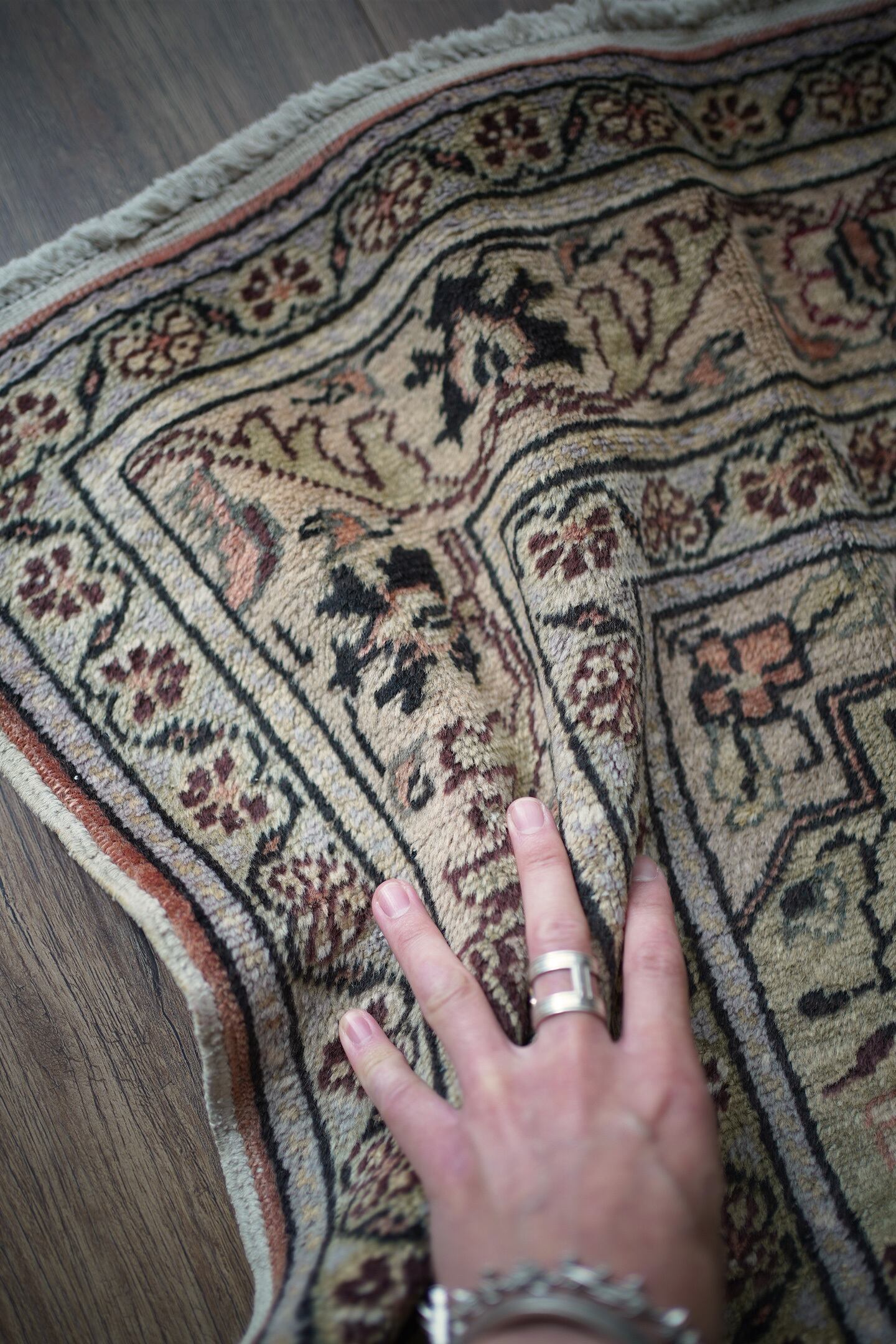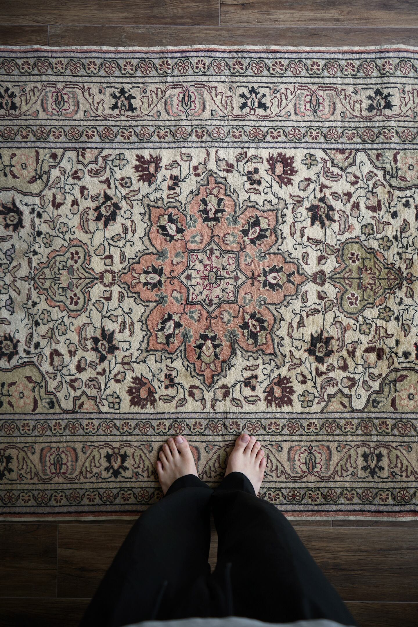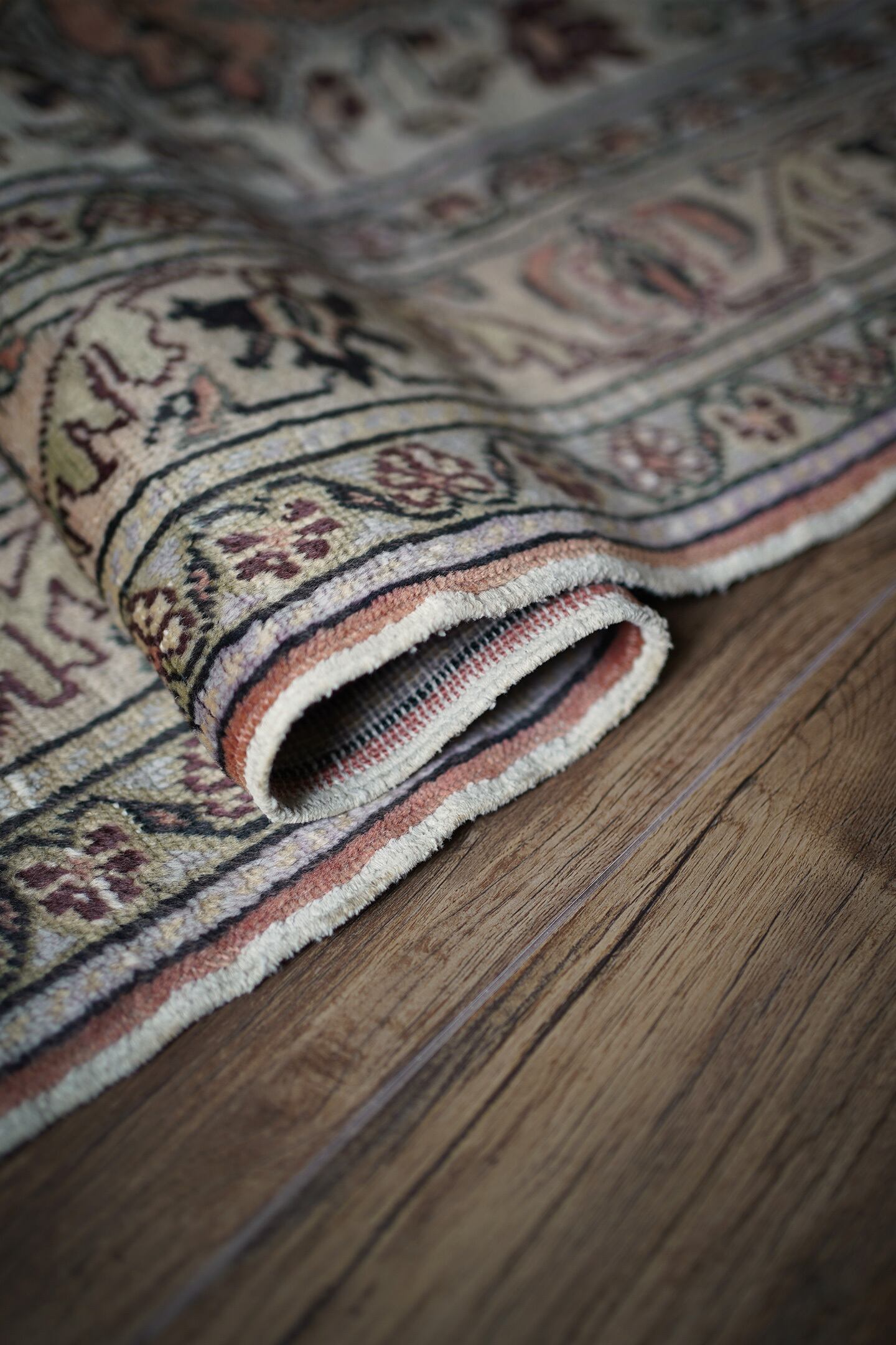 経年約40年ほどのトルコ産のヴィンテージラグ。花柄モチーフのデザインに、淡いサーモンピンクとホフホワイトの組み合わせが非常に可愛らしい雰囲気の一枚。コーナー部分で使われている赤紫色の花がアクセントになっており、店主の好きなポイントです。厚みは4mm〜5mm程度で、表面のパイルはサラッと滑らかな肌触り。ダメージや補修跡なども見受けられるずコンディションも良好。落ち着いた優しい色味なので様々な家具とも相性がよく、自然と馴染んでくれそうです。リビングのソファ前をはじめ、ダイニングテーブル下などにも。