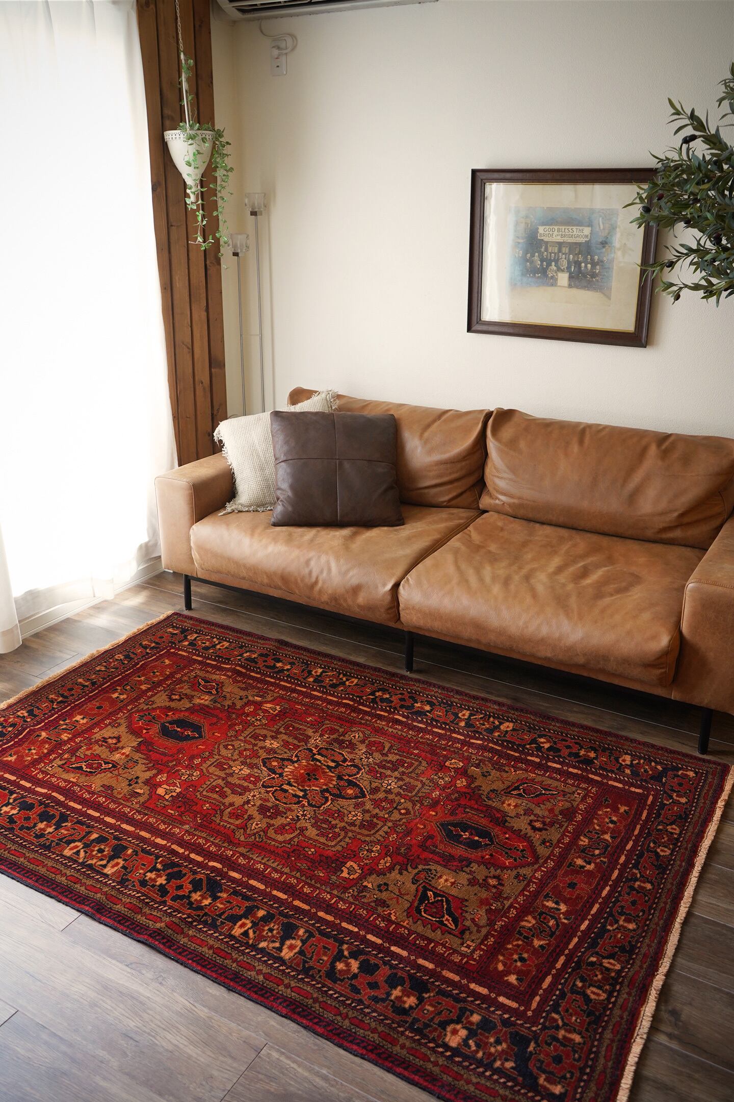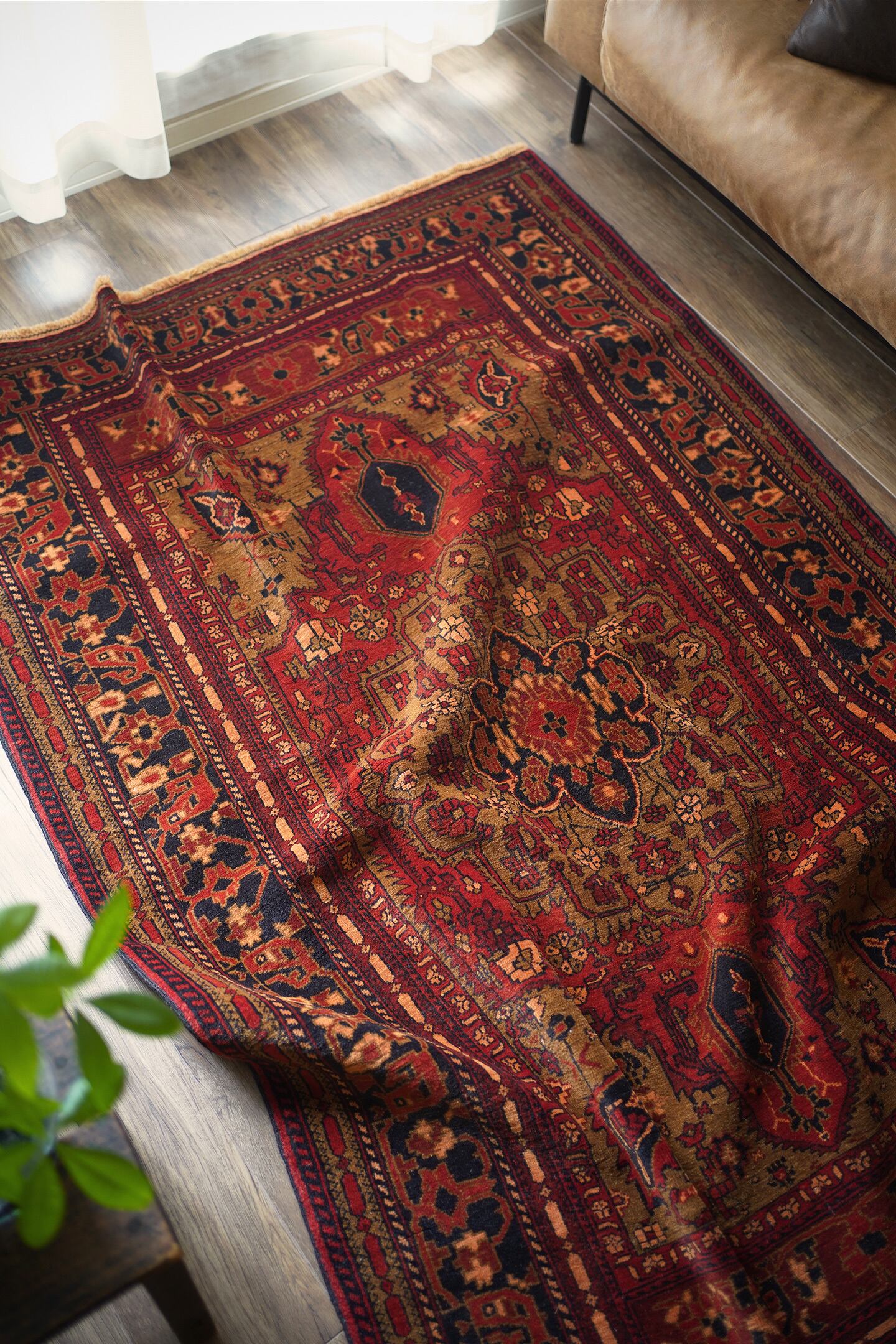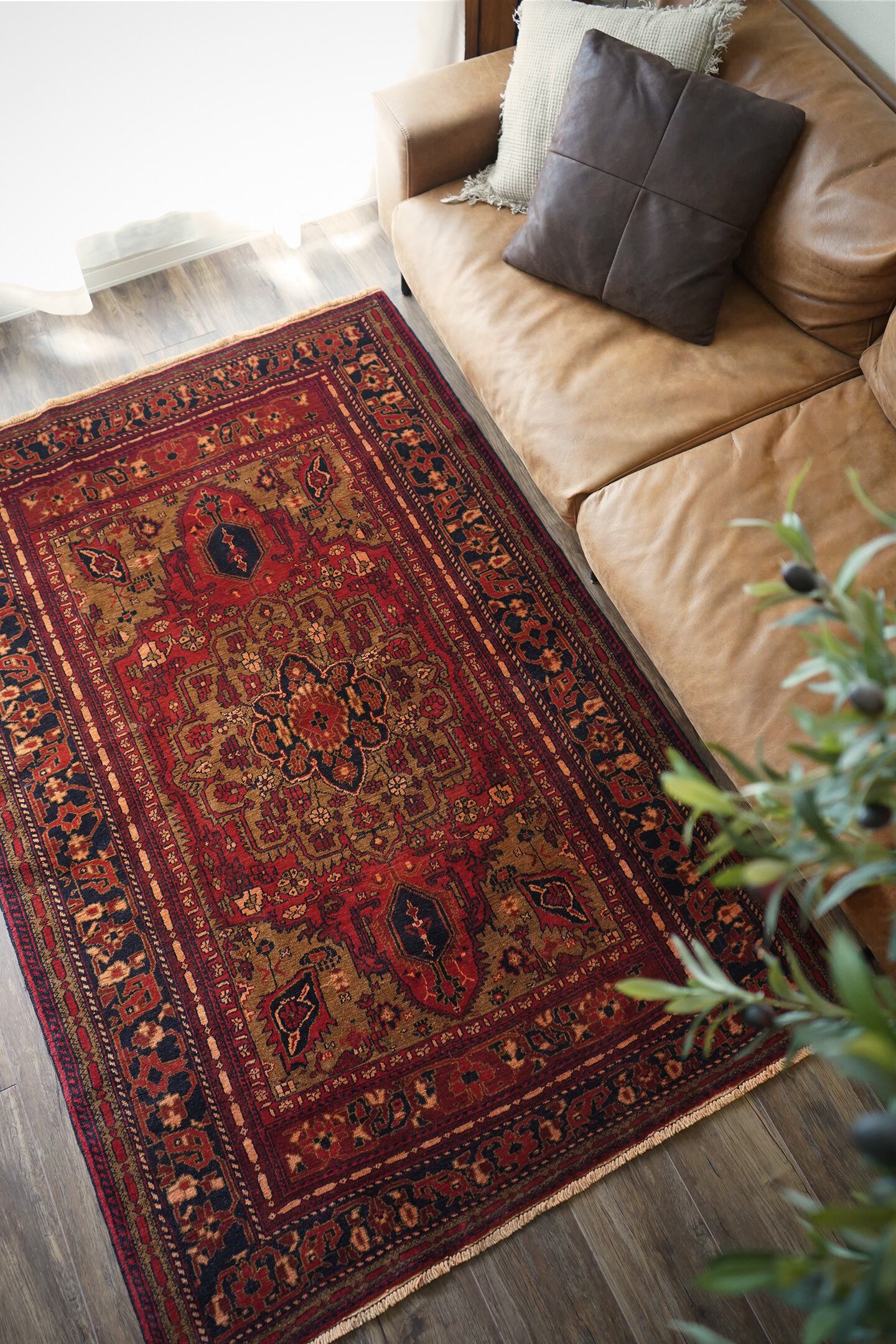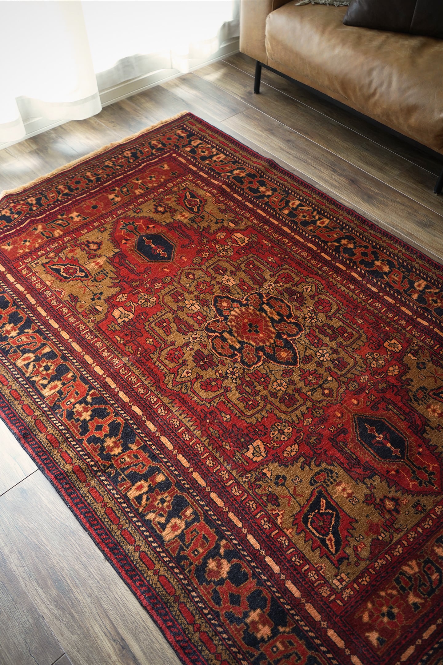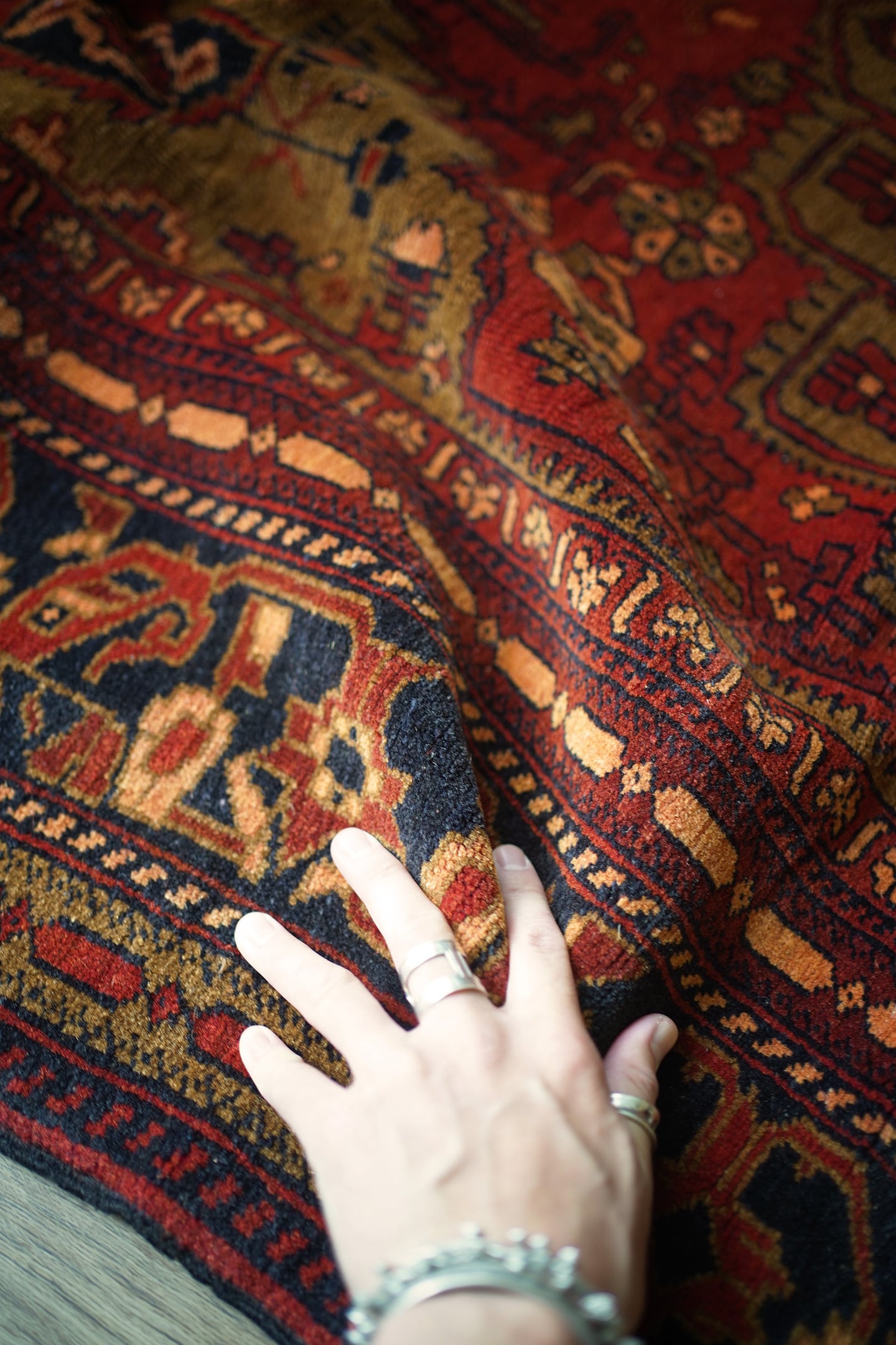 アフガニスタン北西部のカラエナウで織られた経年50年ほどのヴィンテージラグ。深みのある濃い赤をベースにした配色に花モチーフの大きなメダリオンが目を惹く一枚。表面のパイルはサラふわっとした肌触りで、厚みは6mm程度。均一の長さのパイルで仕立ても良く非常に高品質な印象を受けます。手織り特有のデザインの歪みが少々ございます。ゆらぎが感じられて愛着ポイントになってくれるかと思います((俯瞰写真にてご確認ください)。ダメージや補修跡もなく、パーフェクトなコンディション。質感もとても良いラグでオススメです♪
