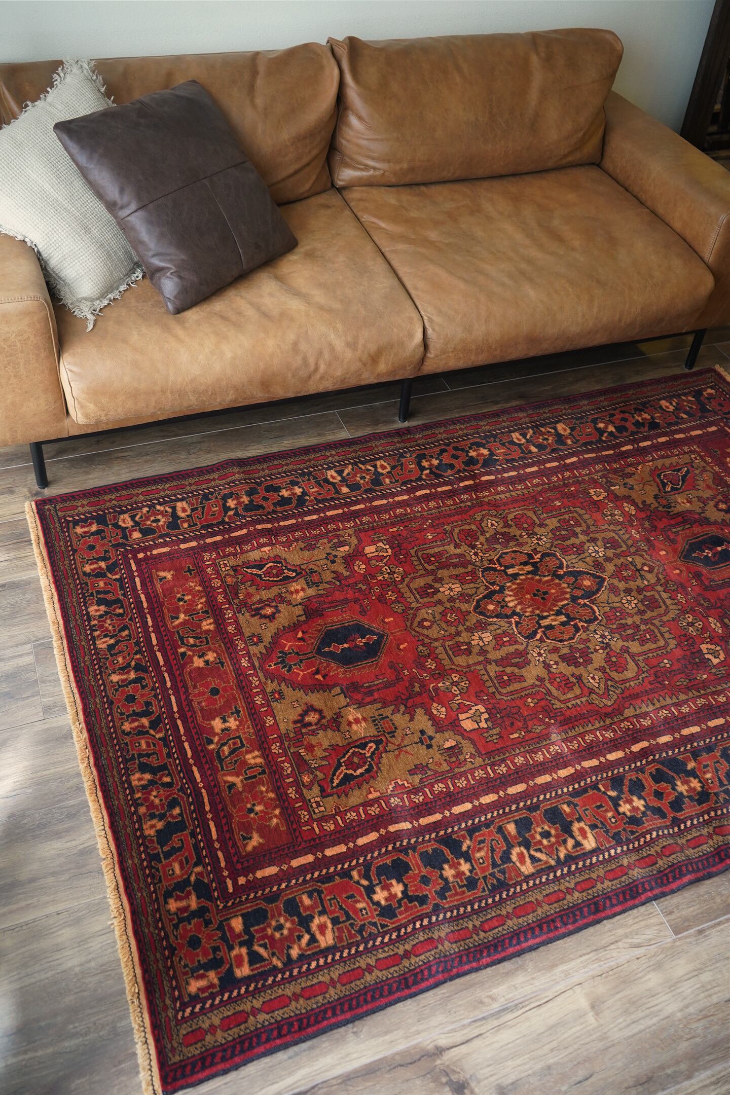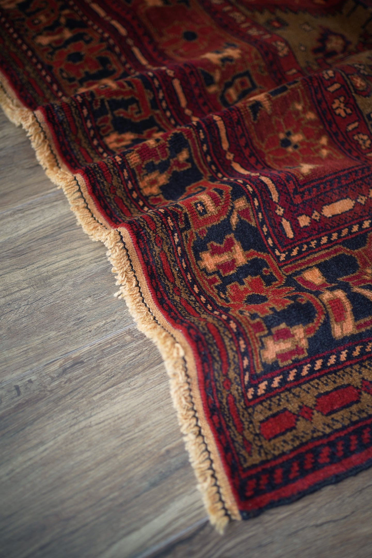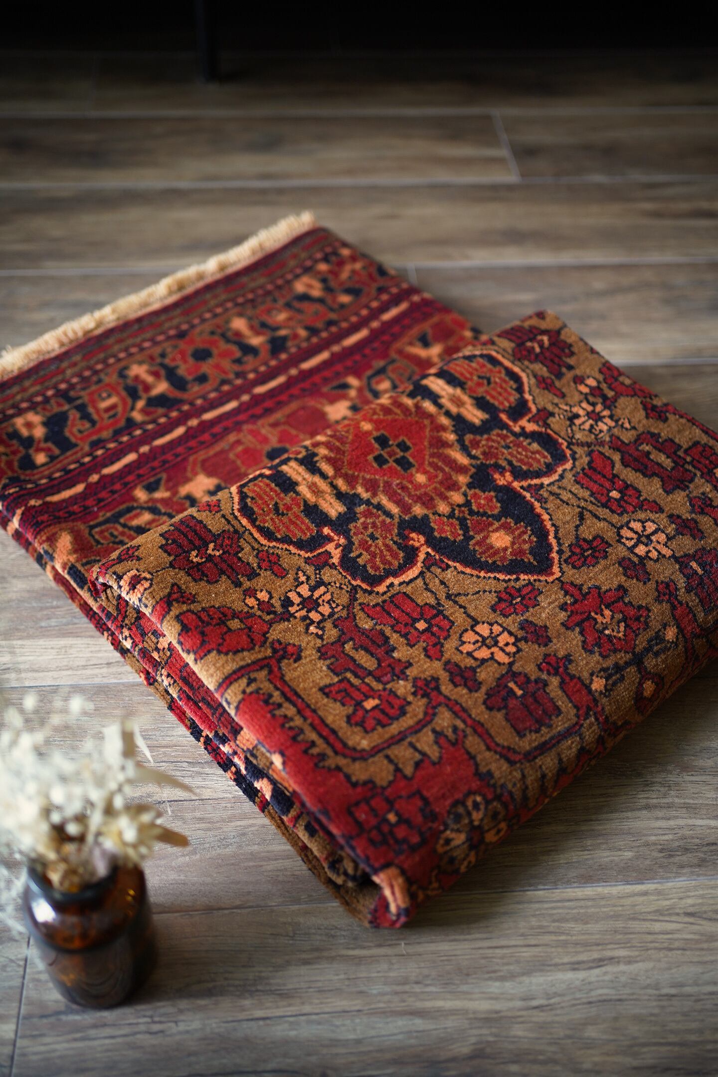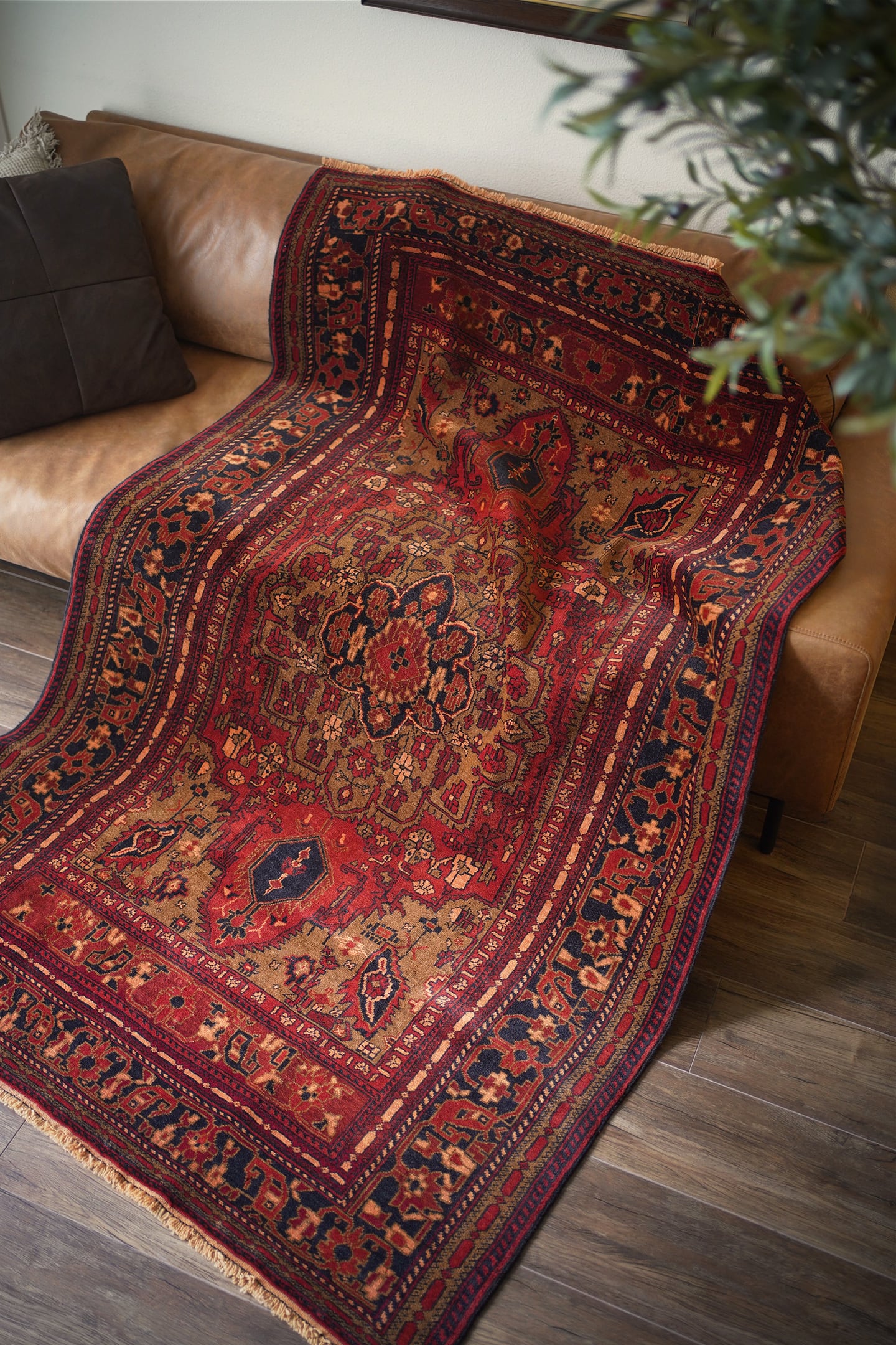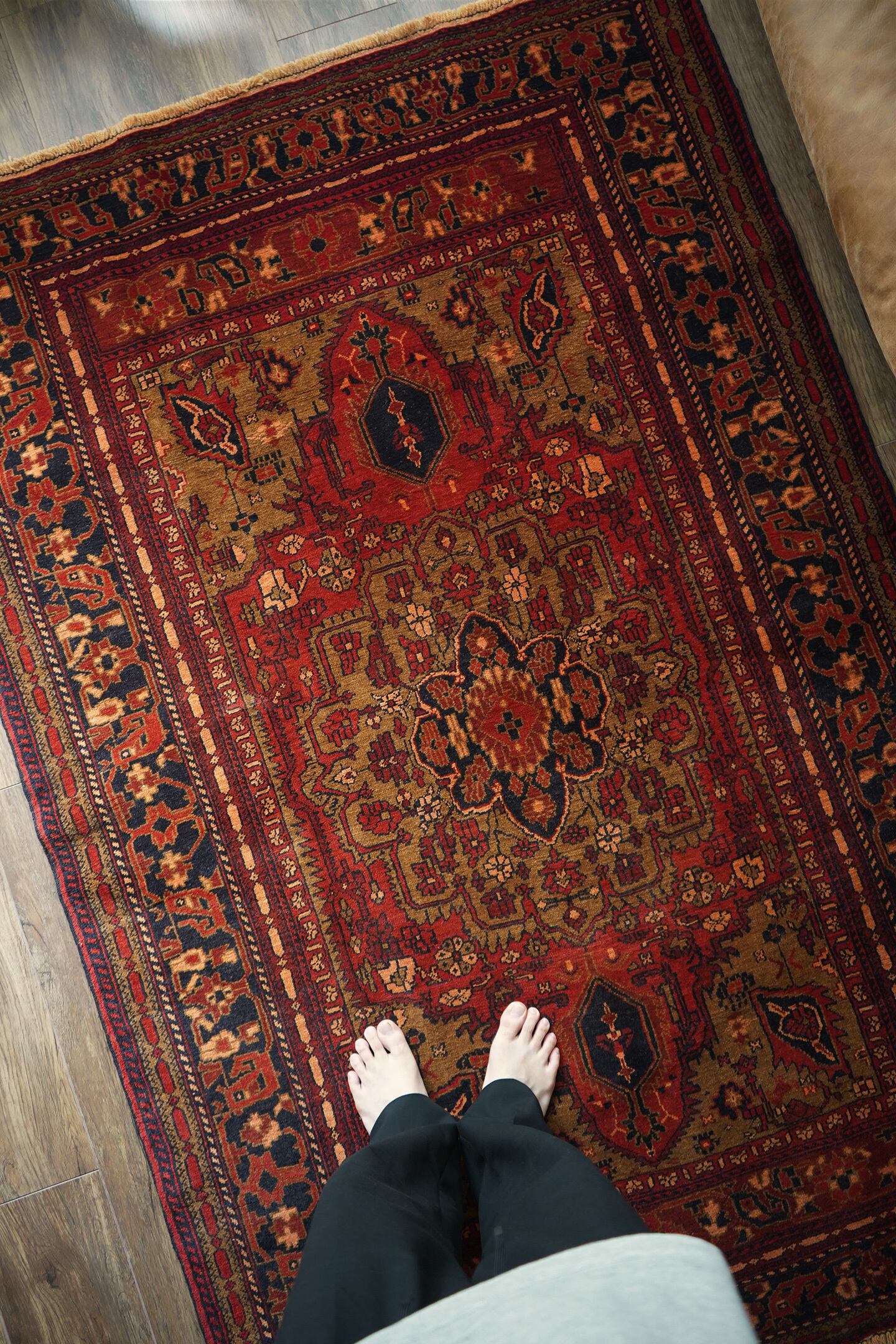 アフガニスタン北西部のカラエナウで織られた経年50年ほどのヴィンテージラグ。深みのある濃い赤をベースにした配色に花モチーフの大きなメダリオンが目を惹く一枚。表面のパイルはサラふわっとした肌触りで、厚みは6mm程度。均一の長さのパイルで仕立ても良く非常に高品質な印象を受けます。手織り特有のデザインの歪みが少々ございます。ゆらぎが感じられて愛着ポイントになってくれるかと思います((俯瞰写真にてご確認ください)。ダメージや補修跡もなく、パーフェクトなコンディション。質感もとても良いラグでオススメです♪