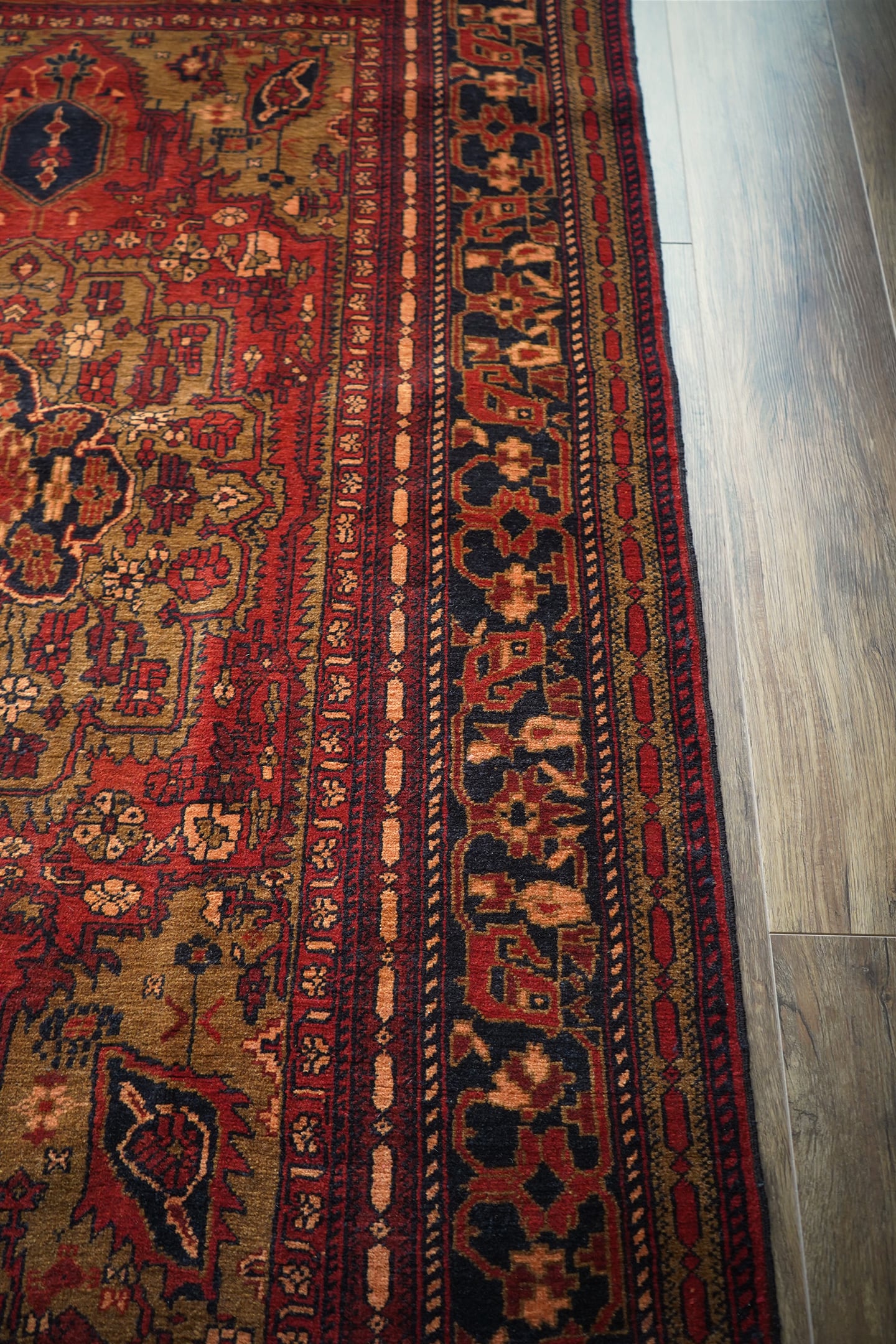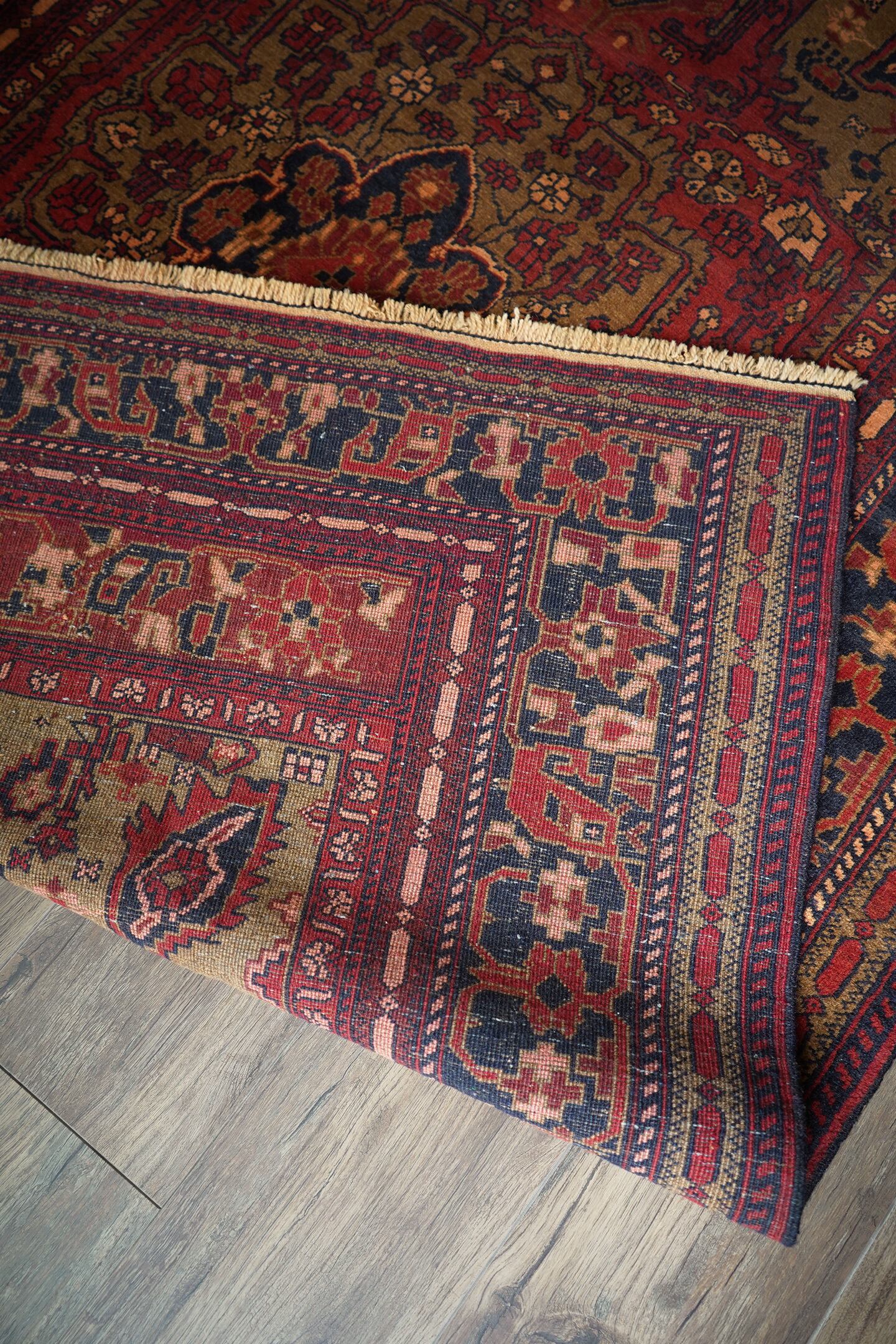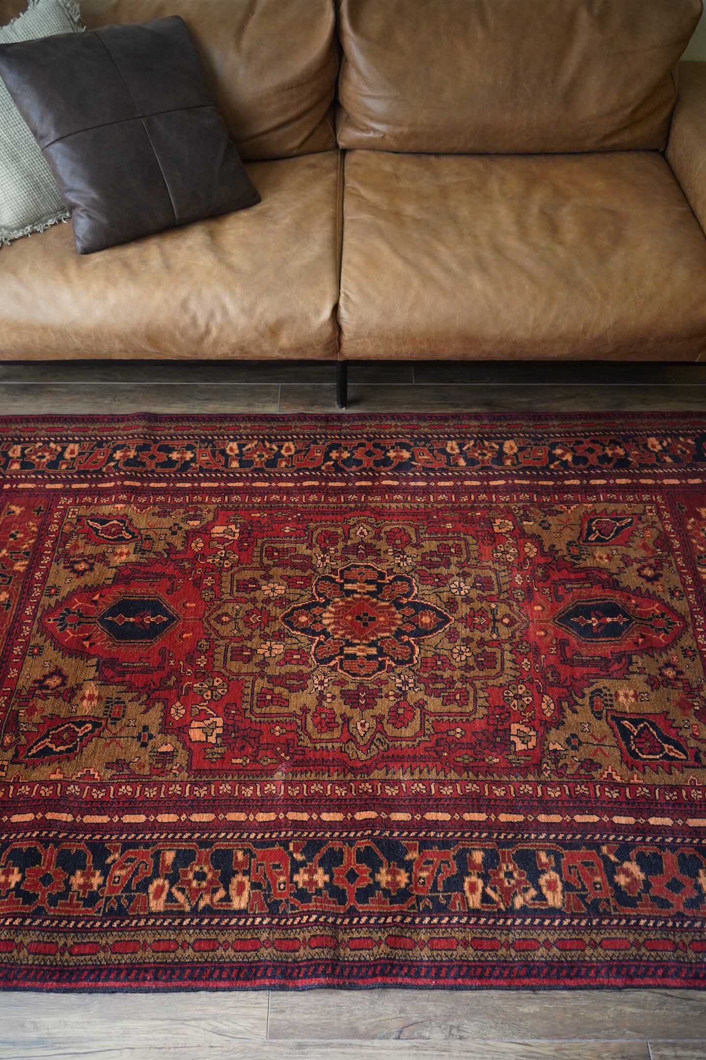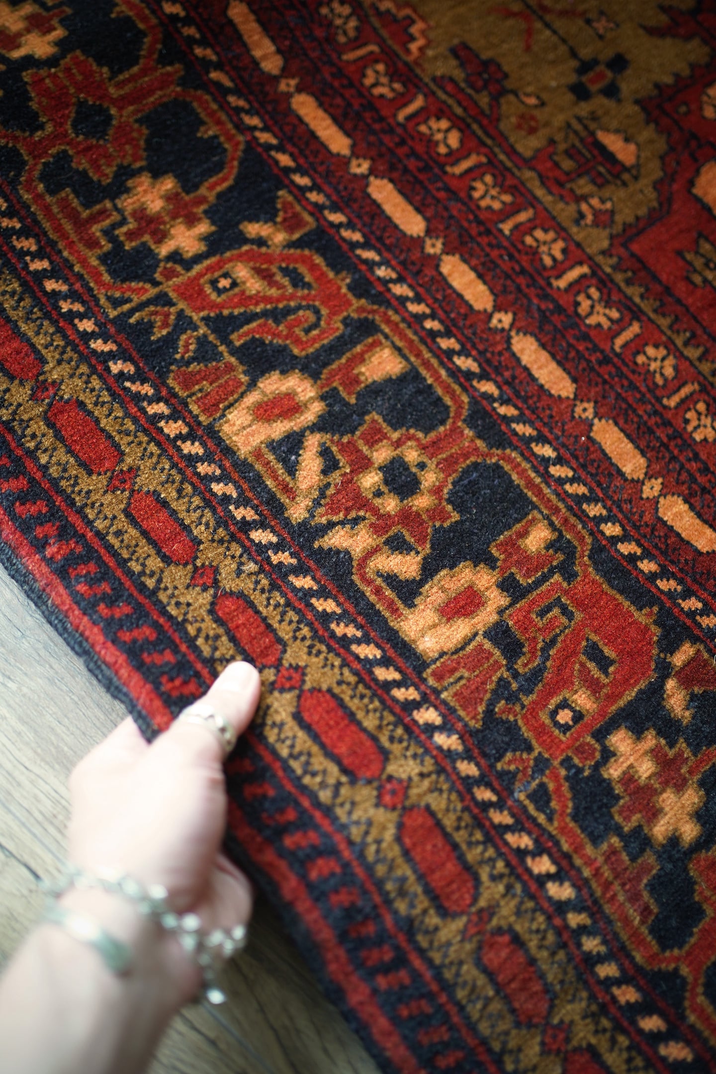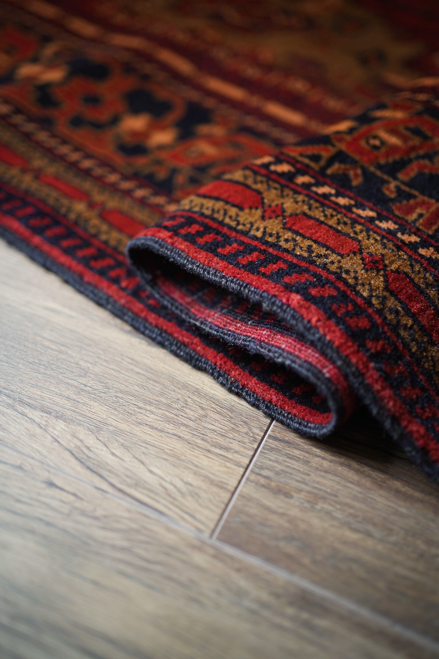アフガニスタン北西部のカラエナウで織られた経年50年ほどのヴィンテージラグ。深みのある濃い赤をベースにした配色に花モチーフの大きなメダリオンが目を惹く一枚。表面のパイルはサラふわっとした肌触りで、厚みは6mm程度。均一の長さのパイルで仕立ても良く非常に高品質な印象を受けます。手織り特有のデザインの歪みが少々ございます。ゆらぎが感じられて愛着ポイントになってくれるかと思います((俯瞰写真にてご確認ください)。ダメージや補修跡もなく、パーフェクトなコンディション。質感もとても良いラグでオススメです♪