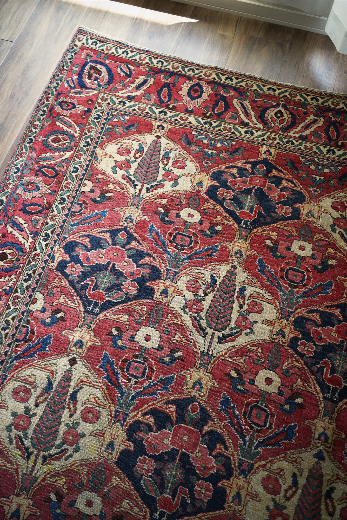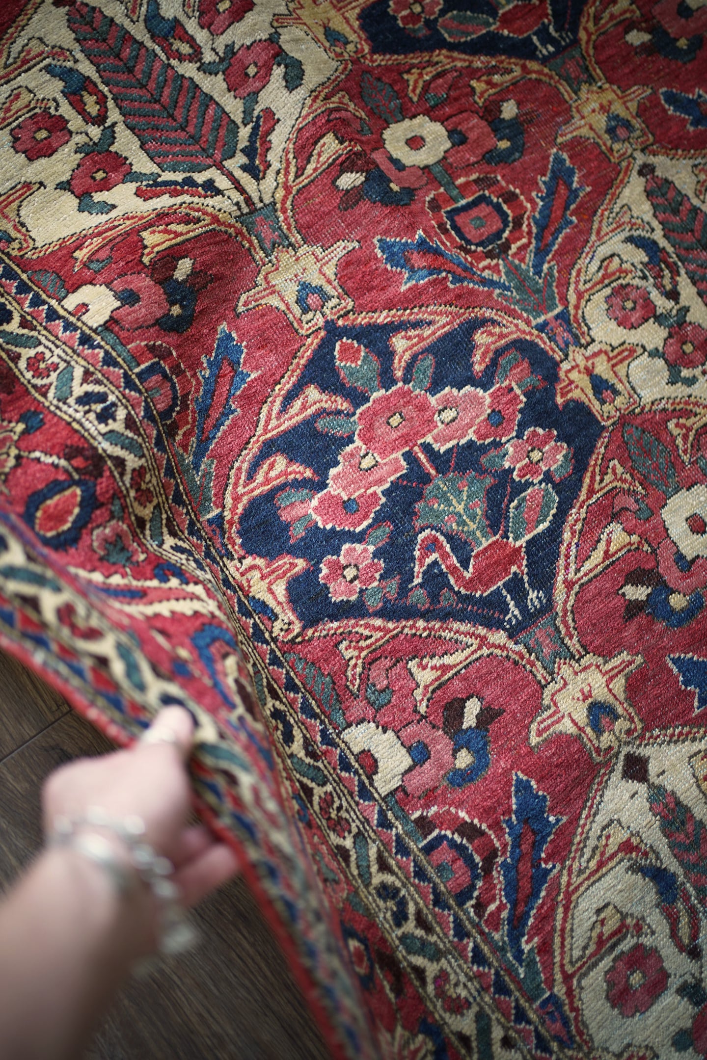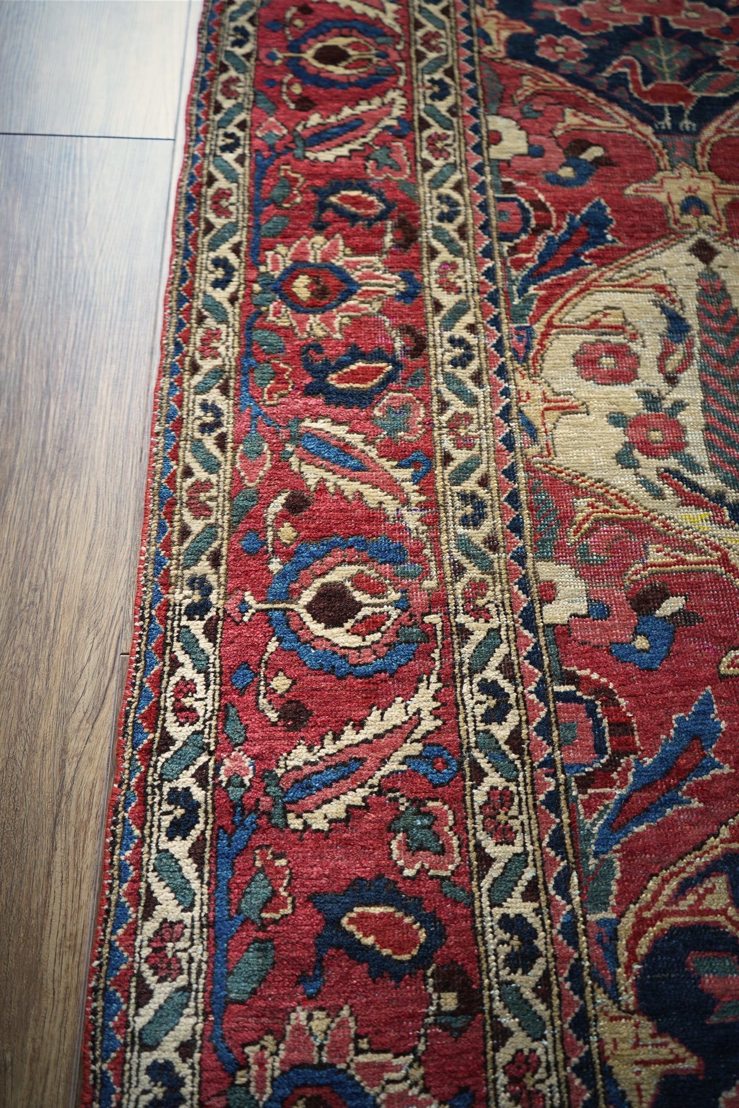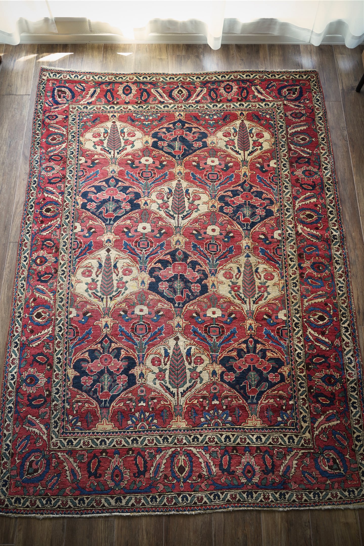イラン西部、ザクロス山脈周辺の高原地域に住むバクティアリ族によって織られたラグです。"char mahal"と呼ばれる四季を意味するデザインで、様々な種類の美しい花の紋様や杉の木の紋様が織り込まれています。孔雀の羽が花束になっているようなユニークなところも非常に可愛らしいです。アンティークならではの色褪せた渋い風合いで、長い歴史を感じさせる貫禄ある一枚。配色は淡いピンクや濃いピンク、ネイビーや淡いブルーグリーン、ベージュなど。7mm程度の厚みで、表面のパイルは薄くサッパリとした質感で、サラッとした乾いた肌触りをしています。非常に重みのあるラグで耐久性にも富んでいるため、交通量の多い場所でも問題なくご使用いただけます。またフリンジは短く、専門的に房止め処理が施されていますのでお写真最後にてご確認ください。目立ったダメージや補修跡も見受けられずグッドコンディション。ダイニングテーブル下などにオススメです♪