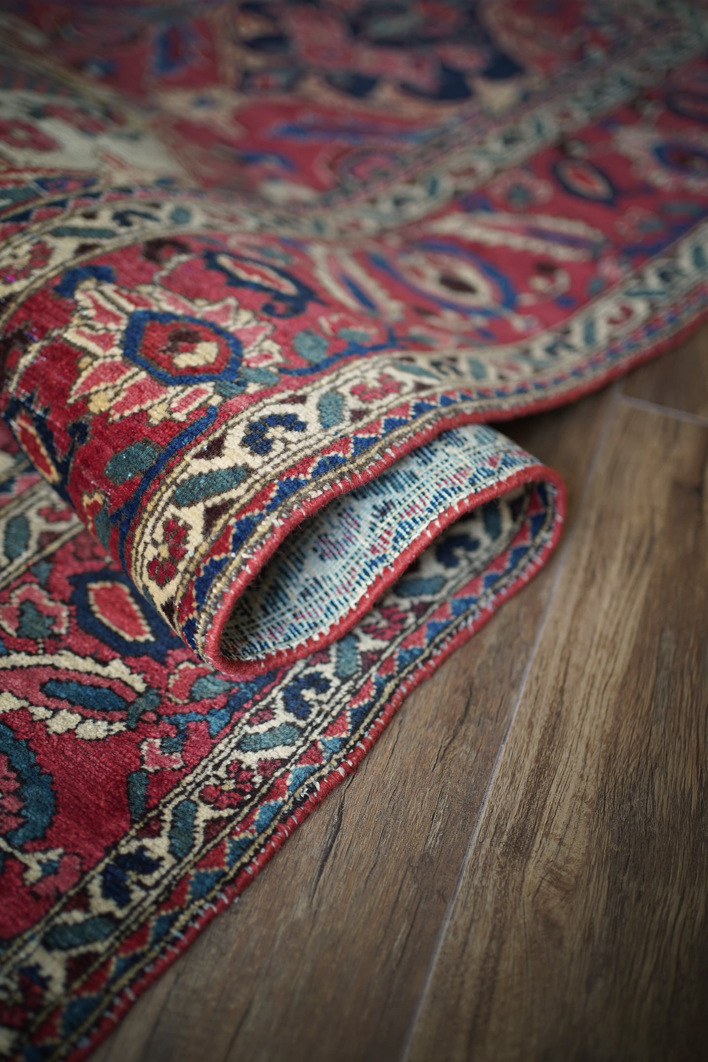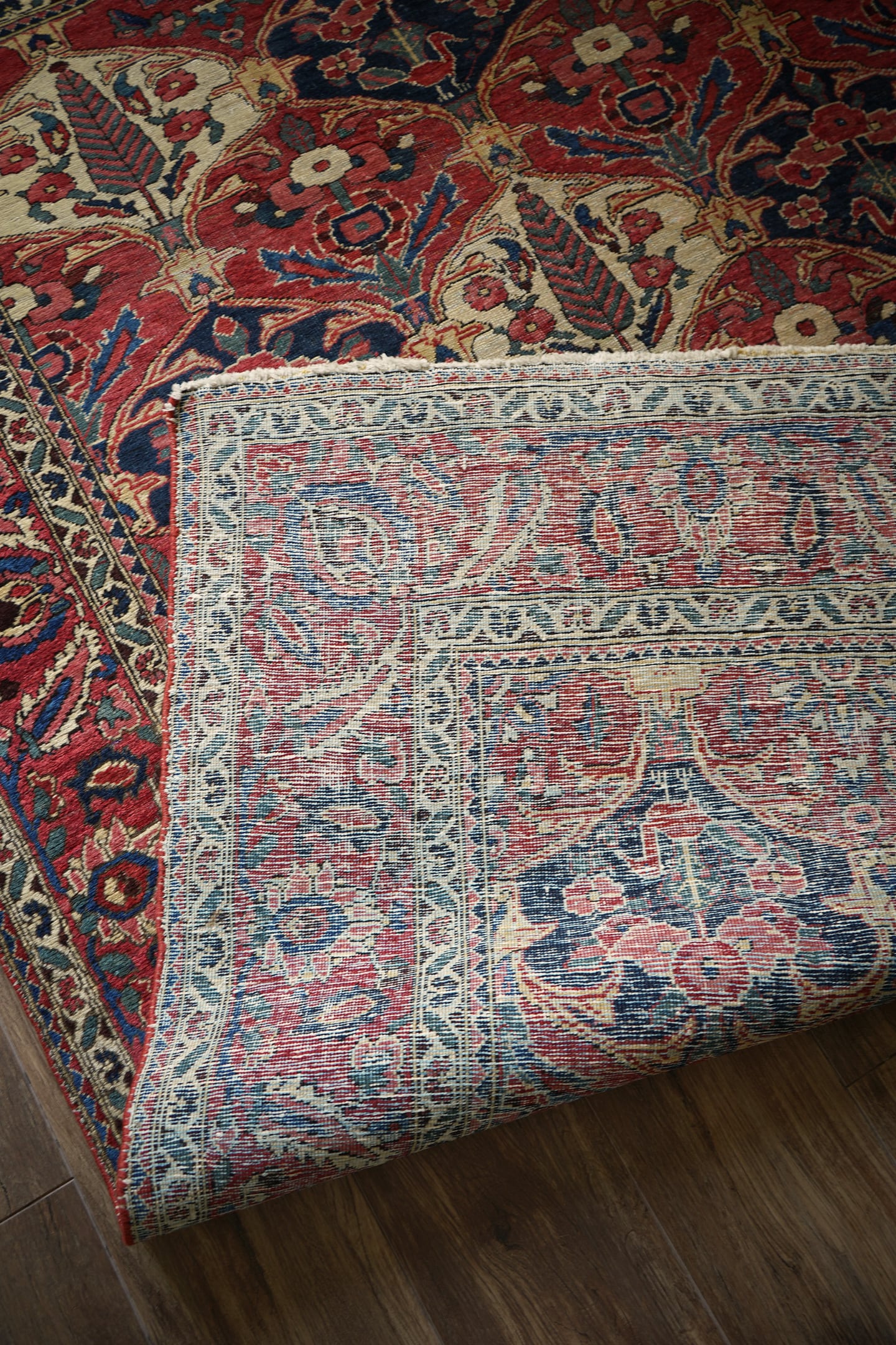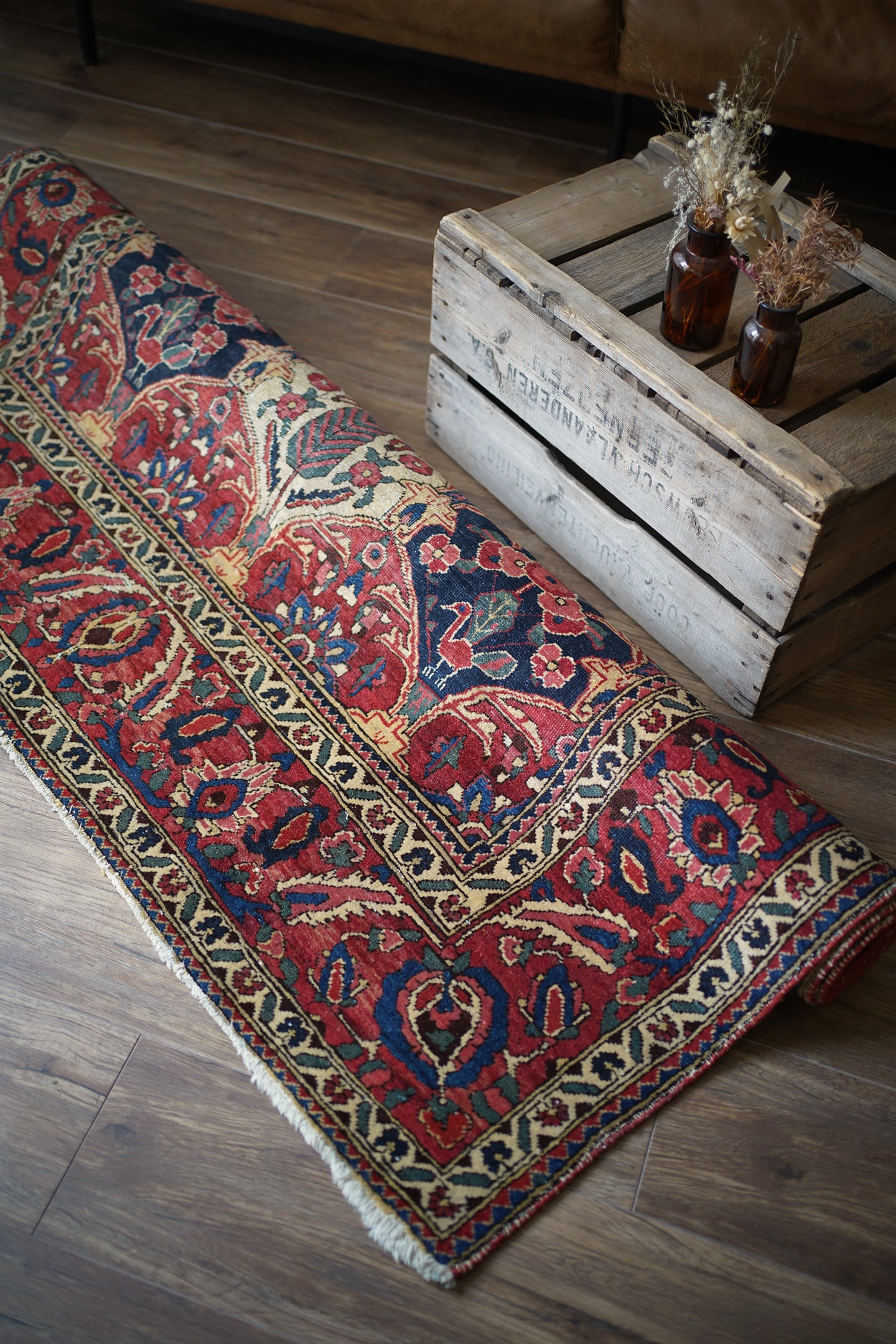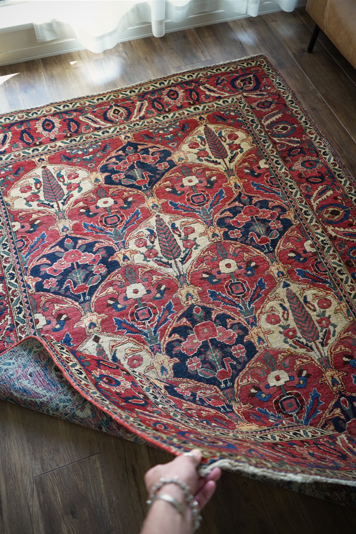 イラン西部、ザクロス山脈周辺の高原地域に住むバクティアリ族によって織られたラグです。"char mahal"と呼ばれる四季を意味するデザインで、様々な種類の美しい花の紋様や杉の木の紋様が織り込まれています。孔雀の羽が花束になっているようなユニークなところも非常に可愛らしいです。アンティークならではの色褪せた渋い風合いで、長い歴史を感じさせる貫禄ある一枚。配色は淡いピンクや濃いピンク、ネイビーや淡いブルーグリーン、ベージュなど。7mm程度の厚みで、表面のパイルは薄くサッパリとした質感で、サラッとした乾いた肌触りをしています。非常に重みのあるラグで耐久性にも富んでいるため、交通量の多い場所でも問題なくご使用いただけます。またフリンジは短く、専門的に房止め処理が施されていますのでお写真最後にてご確認ください。目立ったダメージや補修跡も見受けられずグッドコンディション。ダイニングテーブル下などにオススメです♪