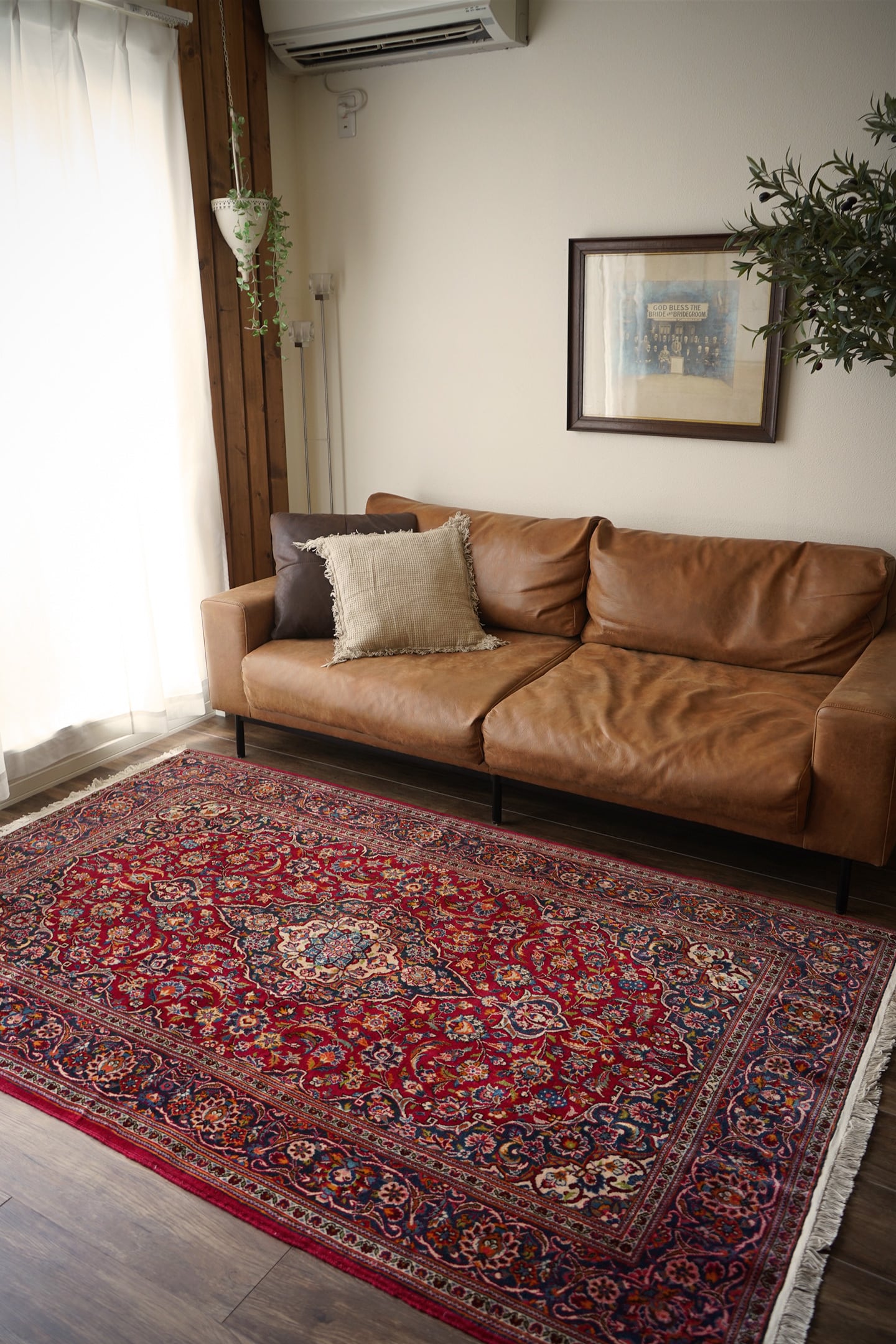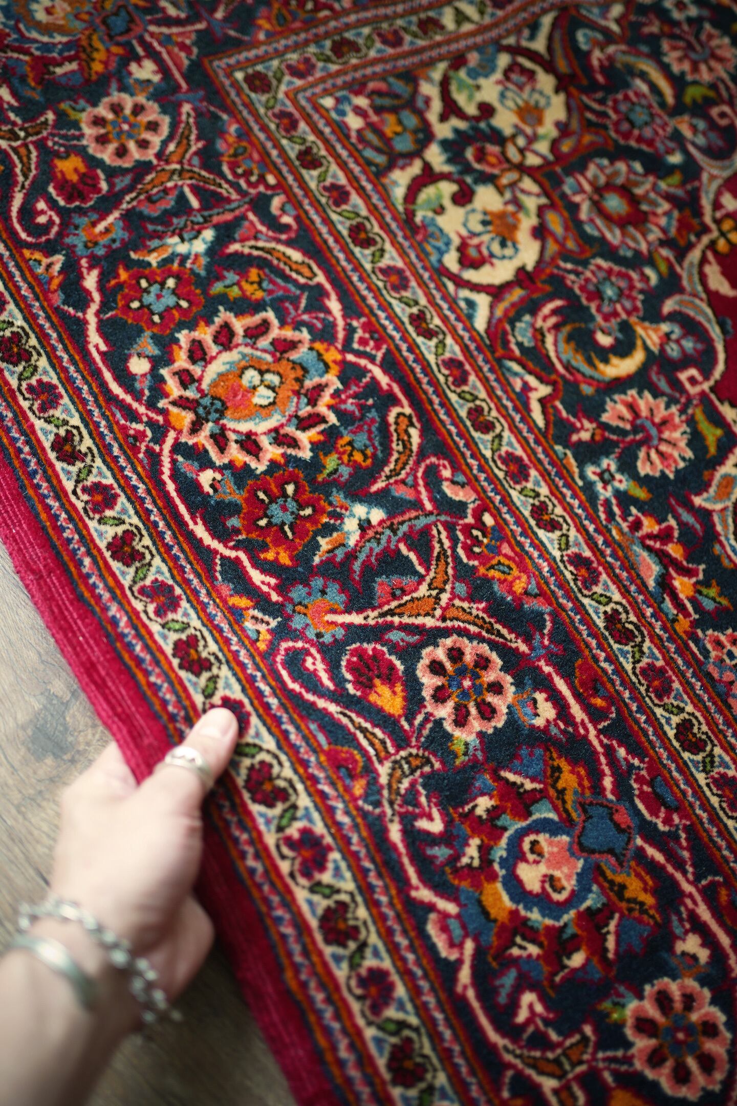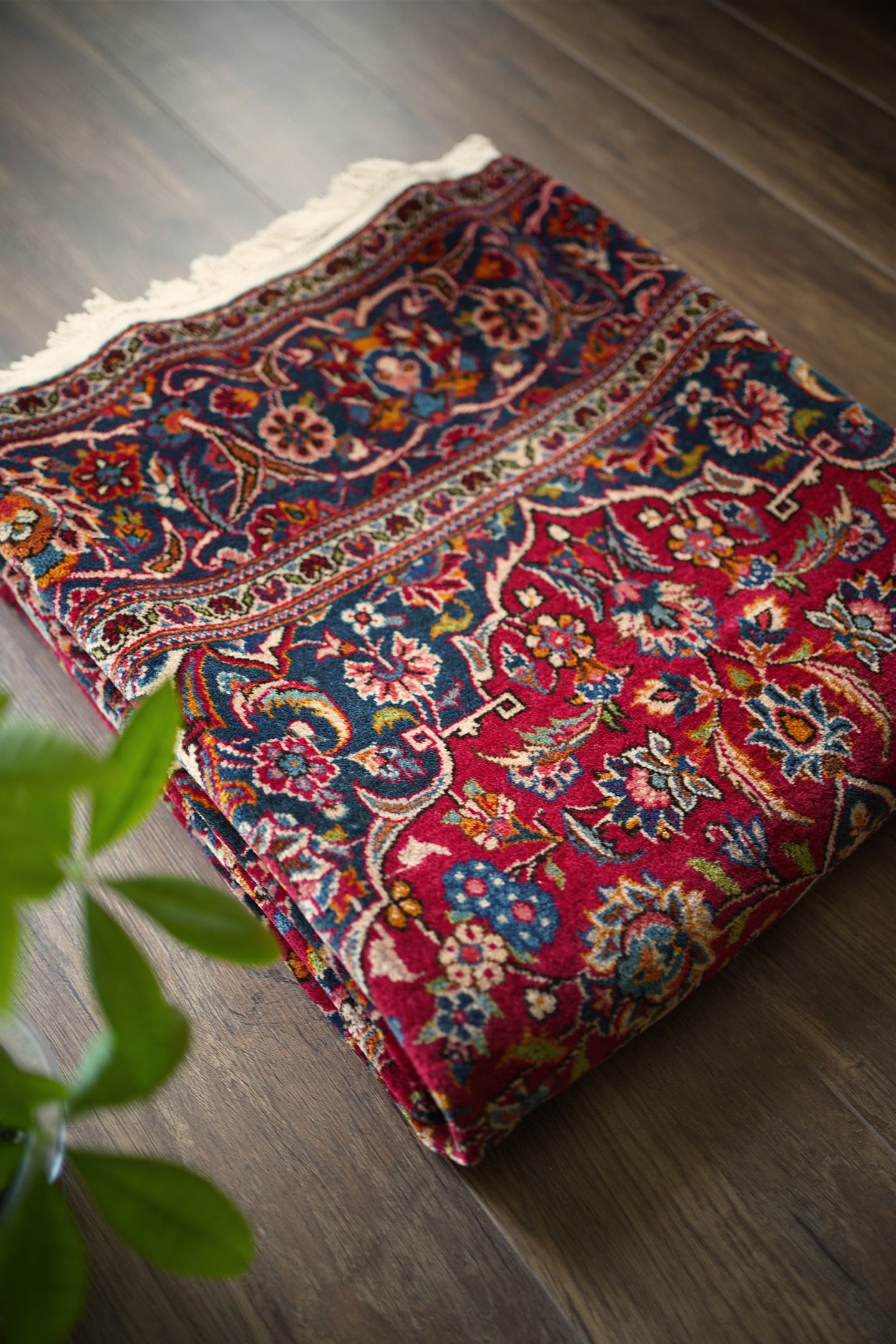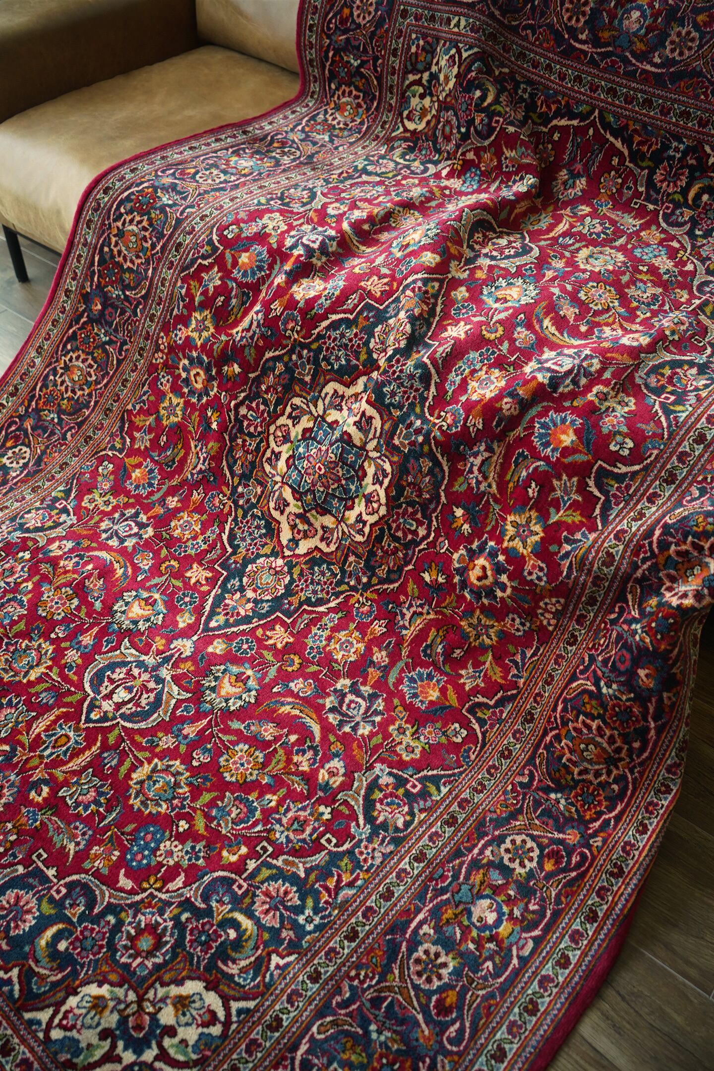 イランの北中央に位置するイスファハン州の都市カシャーンで織られたヴィンテージのラグです。濃く奥行きある赤色に王道でクラシカルなTHE・ペルシャ絨毯の可憐な花紋様のデザインが大変魅力的な一枚。その他ダークグリーンやベージュ、淡いピンク、オリーブなどが使われたバランスの取れた配色が素晴らしいです。ソフトウールで、毛足は短めながら驚くほどふわっとしっとりと柔らかく、上質なウールであることを感じさせます。厚みは6mm〜7mmほど。通年で気持ち良く敷いていただけるかと思います。一部パイルが少し薄くなっている箇所がありますが、よく見ないとほとんどわからないかと思います。またボーダーの角部分で少し色移りでピンクっぽくなっている箇所がありますのでお写真最後をご参照ください。それ以外はダメージや補修された跡も見受けられず大変良好なコンディションです。一枚敷くだけでお部屋が素敵な空間になりますよ♪