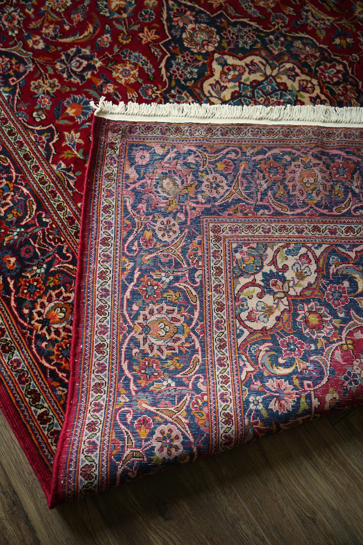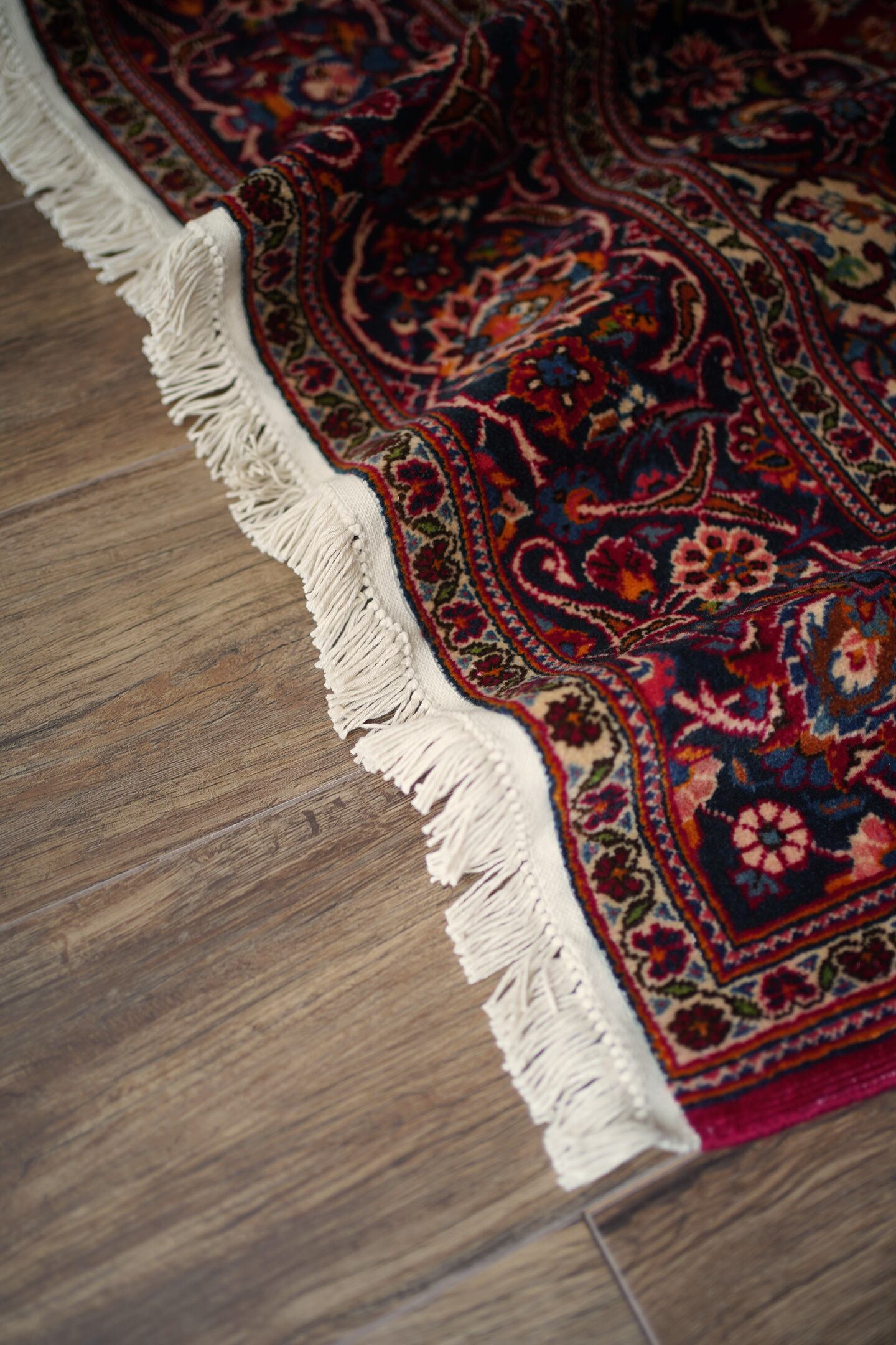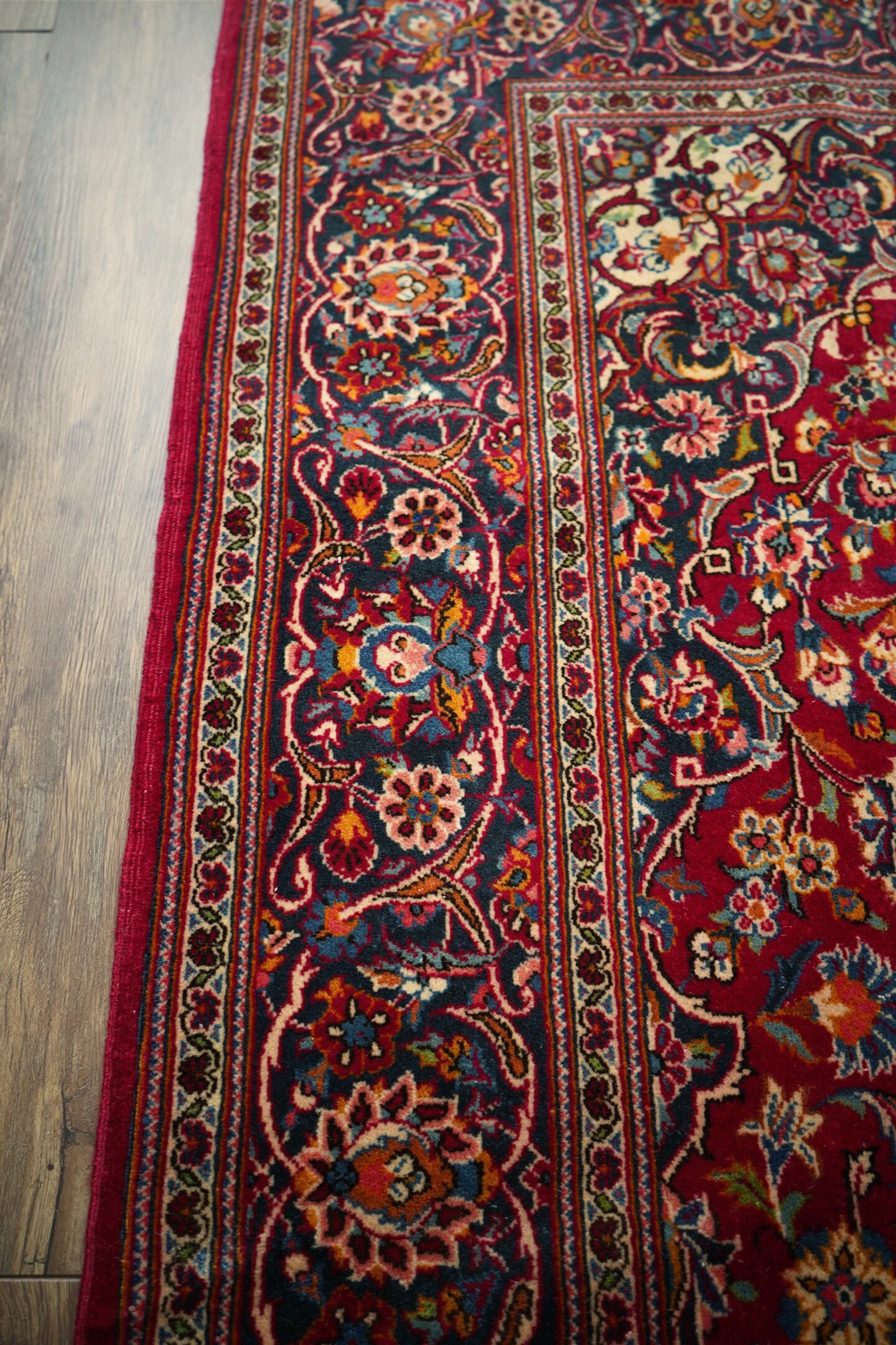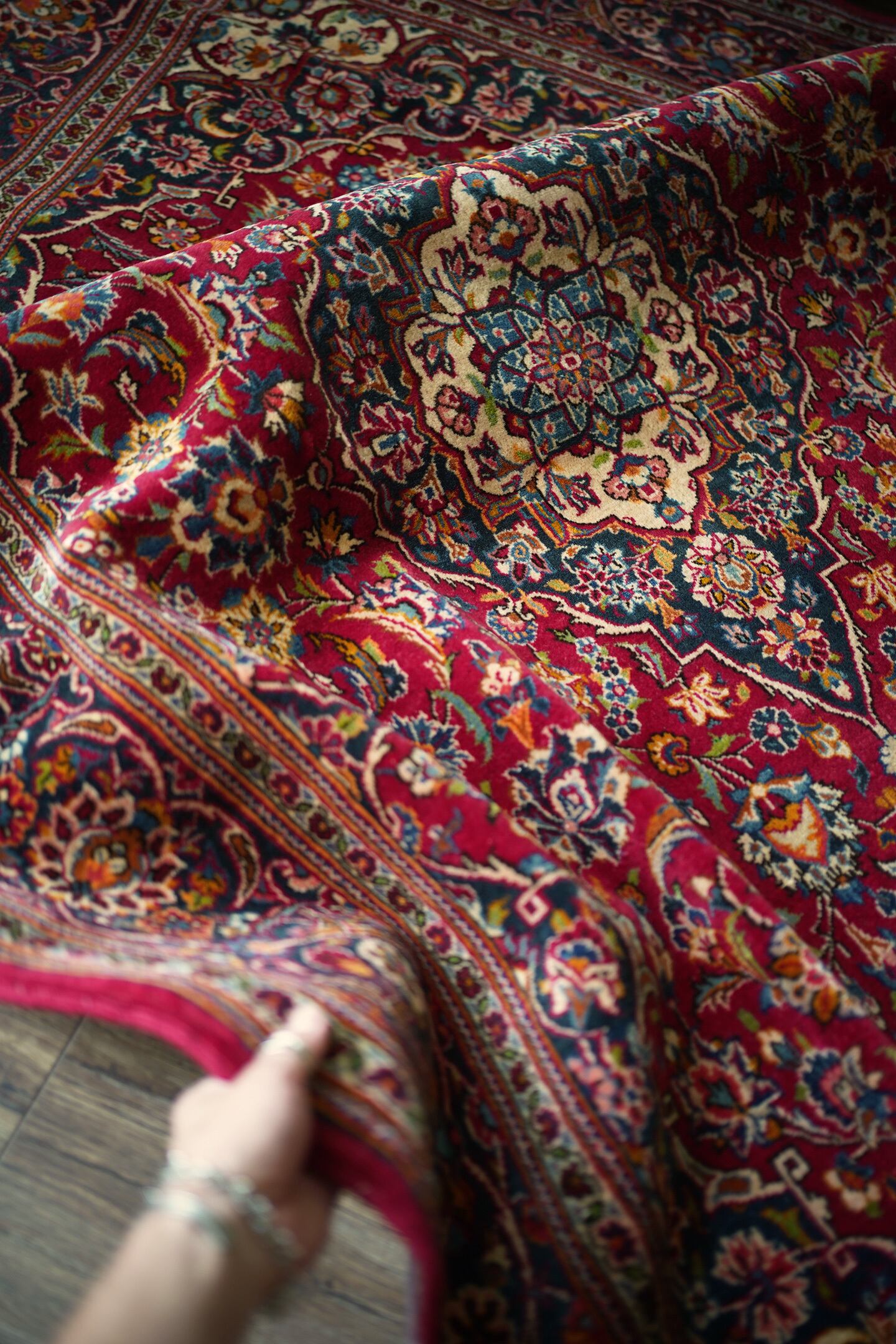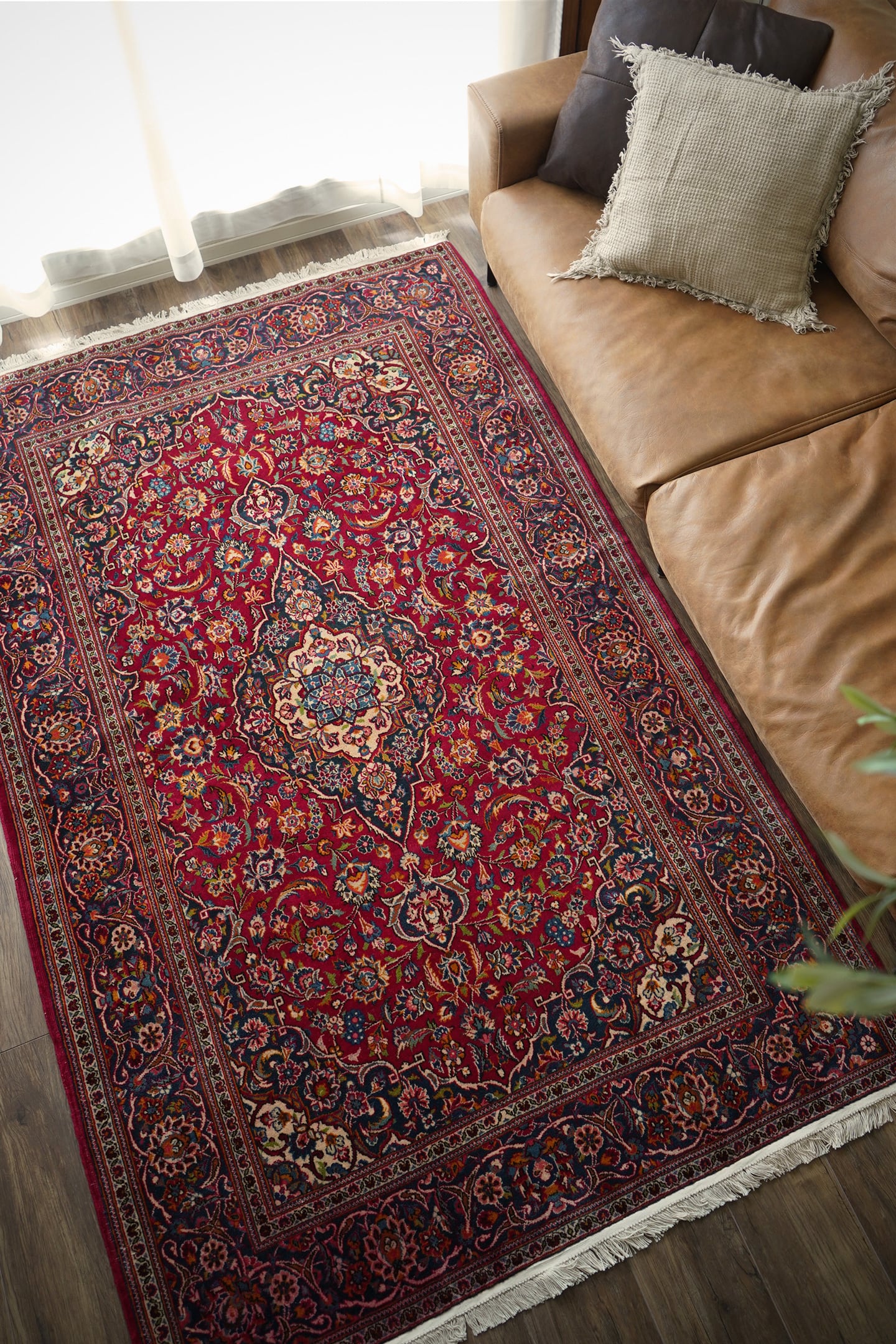 イランの北中央に位置するイスファハン州の都市カシャーンで織られたヴィンテージのラグです。濃く奥行きある赤色に王道でクラシカルなTHE・ペルシャ絨毯の可憐な花紋様のデザインが大変魅力的な一枚。その他ダークグリーンやベージュ、淡いピンク、オリーブなどが使われたバランスの取れた配色が素晴らしいです。ソフトウールで、毛足は短めながら驚くほどふわっとしっとりと柔らかく、上質なウールであることを感じさせます。厚みは6mm〜7mmほど。通年で気持ち良く敷いていただけるかと思います。一部パイルが少し薄くなっている箇所がありますが、よく見ないとほとんどわからないかと思います。またボーダーの角部分で少し色移りでピンクっぽくなっている箇所がありますのでお写真最後をご参照ください。それ以外はダメージや補修された跡も見受けられず大変良好なコンディションです。一枚敷くだけでお部屋が素敵な空間になりますよ♪