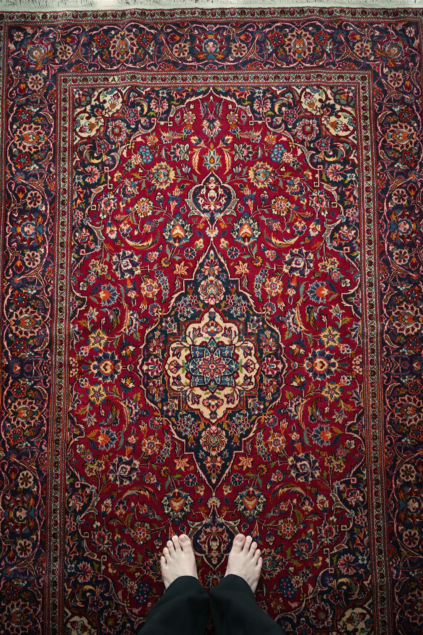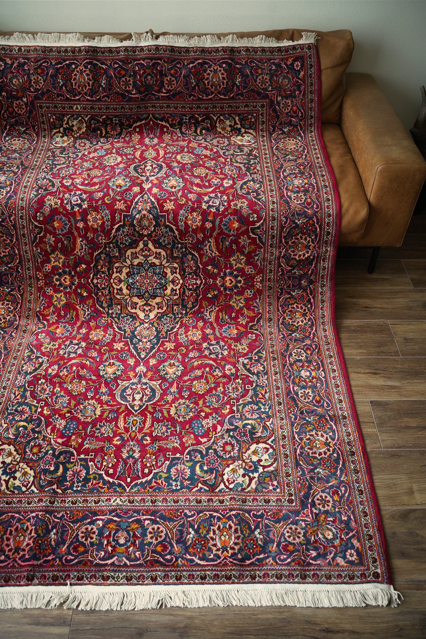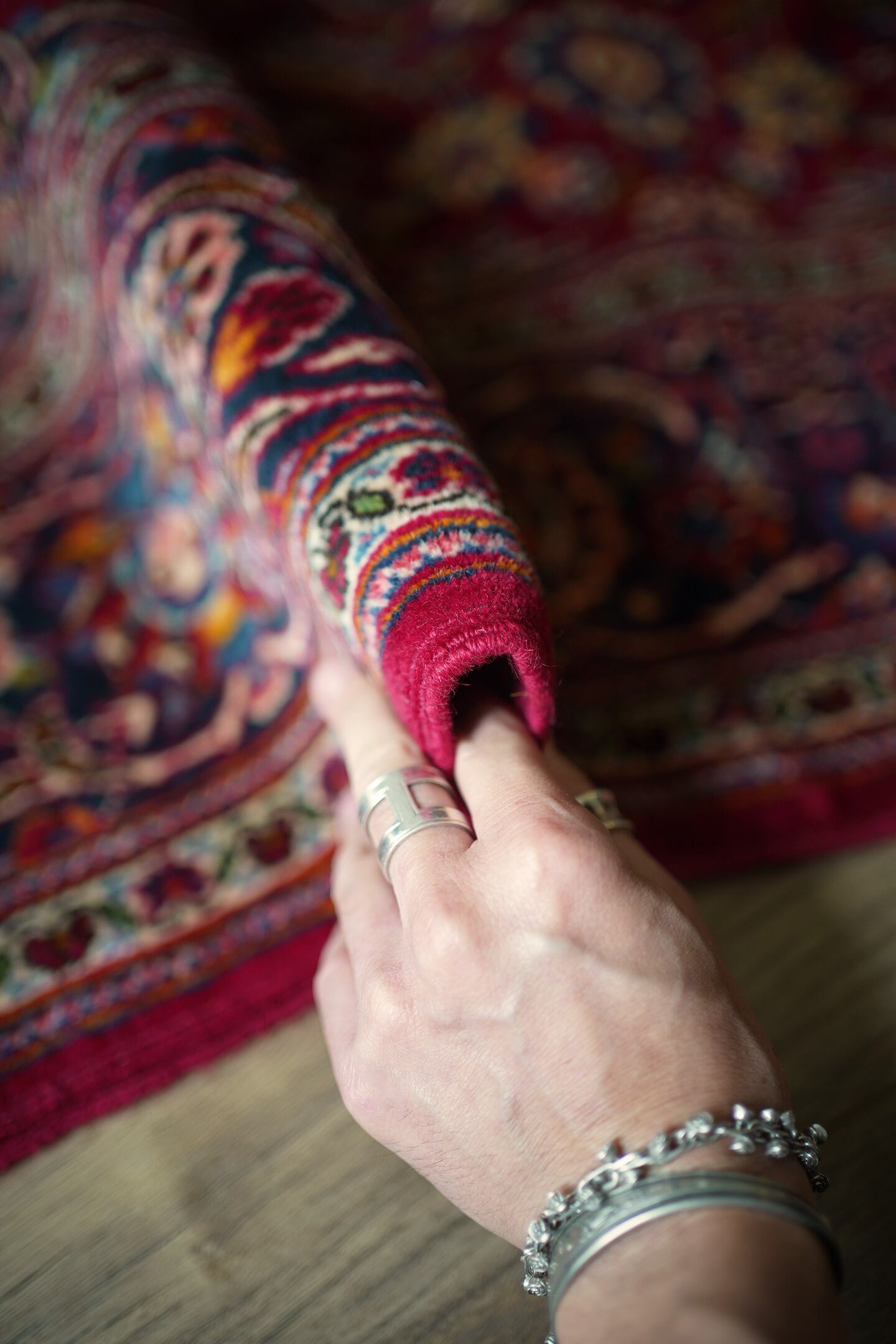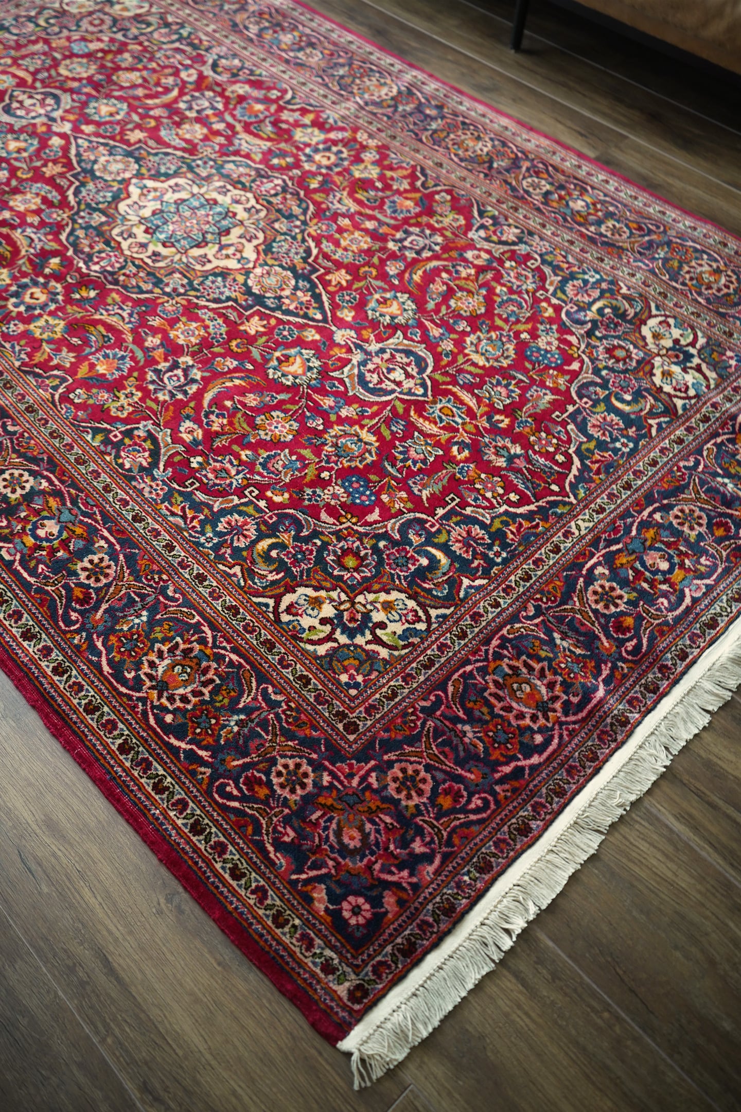 イランの北中央に位置するイスファハン州の都市カシャーンで織られたヴィンテージのラグです。濃く奥行きある赤色に王道でクラシカルなTHE・ペルシャ絨毯の可憐な花紋様のデザインが大変魅力的な一枚。その他ダークグリーンやベージュ、淡いピンク、オリーブなどが使われたバランスの取れた配色が素晴らしいです。ソフトウールで、毛足は短めながら驚くほどふわっとしっとりと柔らかく、上質なウールであることを感じさせます。厚みは6mm〜7mmほど。通年で気持ち良く敷いていただけるかと思います。一部パイルが少し薄くなっている箇所がありますが、よく見ないとほとんどわからないかと思います。またボーダーの角部分で少し色移りでピンクっぽくなっている箇所がありますのでお写真最後をご参照ください。それ以外はダメージや補修された跡も見受けられず大変良好なコンディションです。一枚敷くだけでお部屋が素敵な空間になりますよ♪
