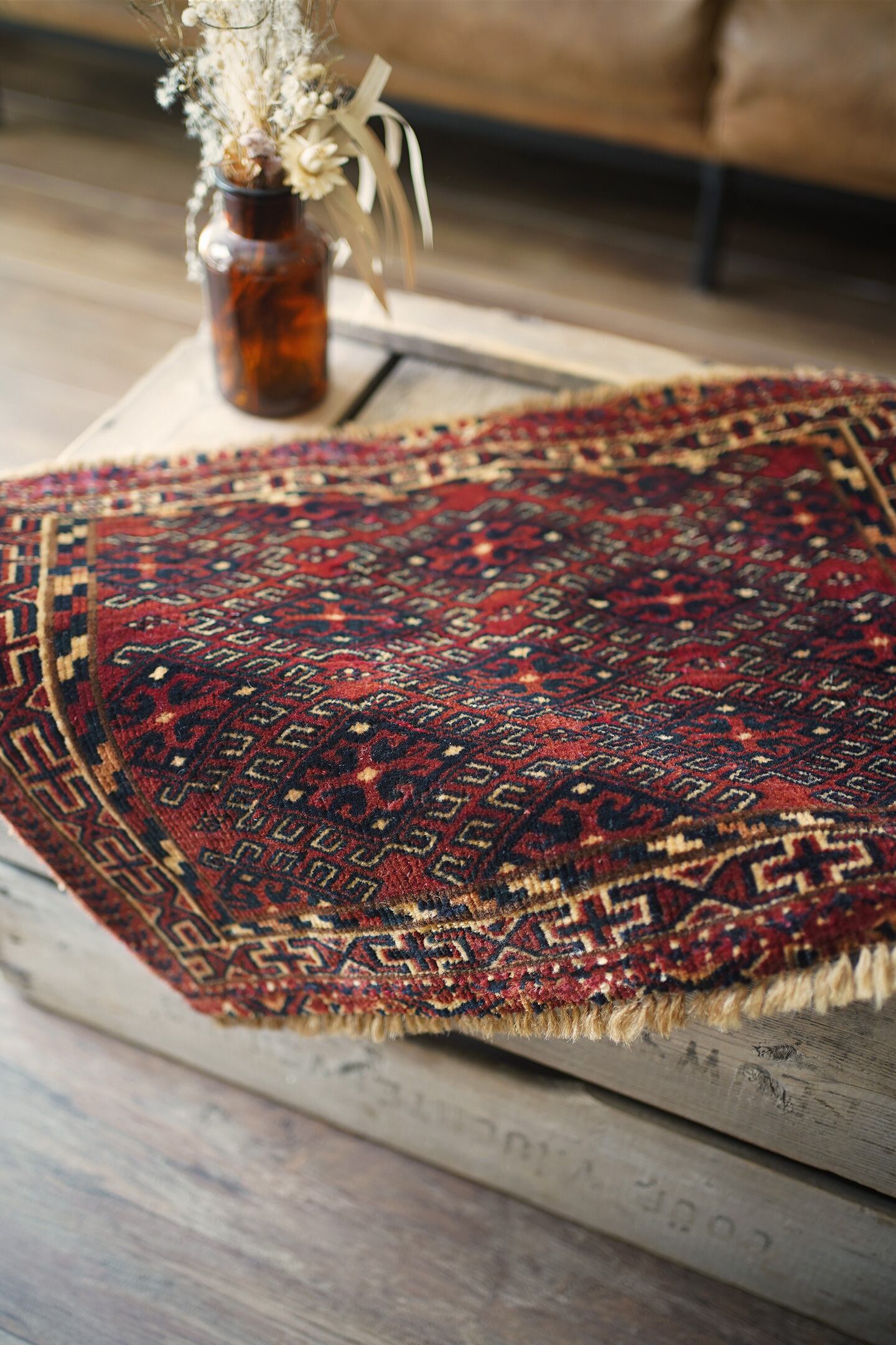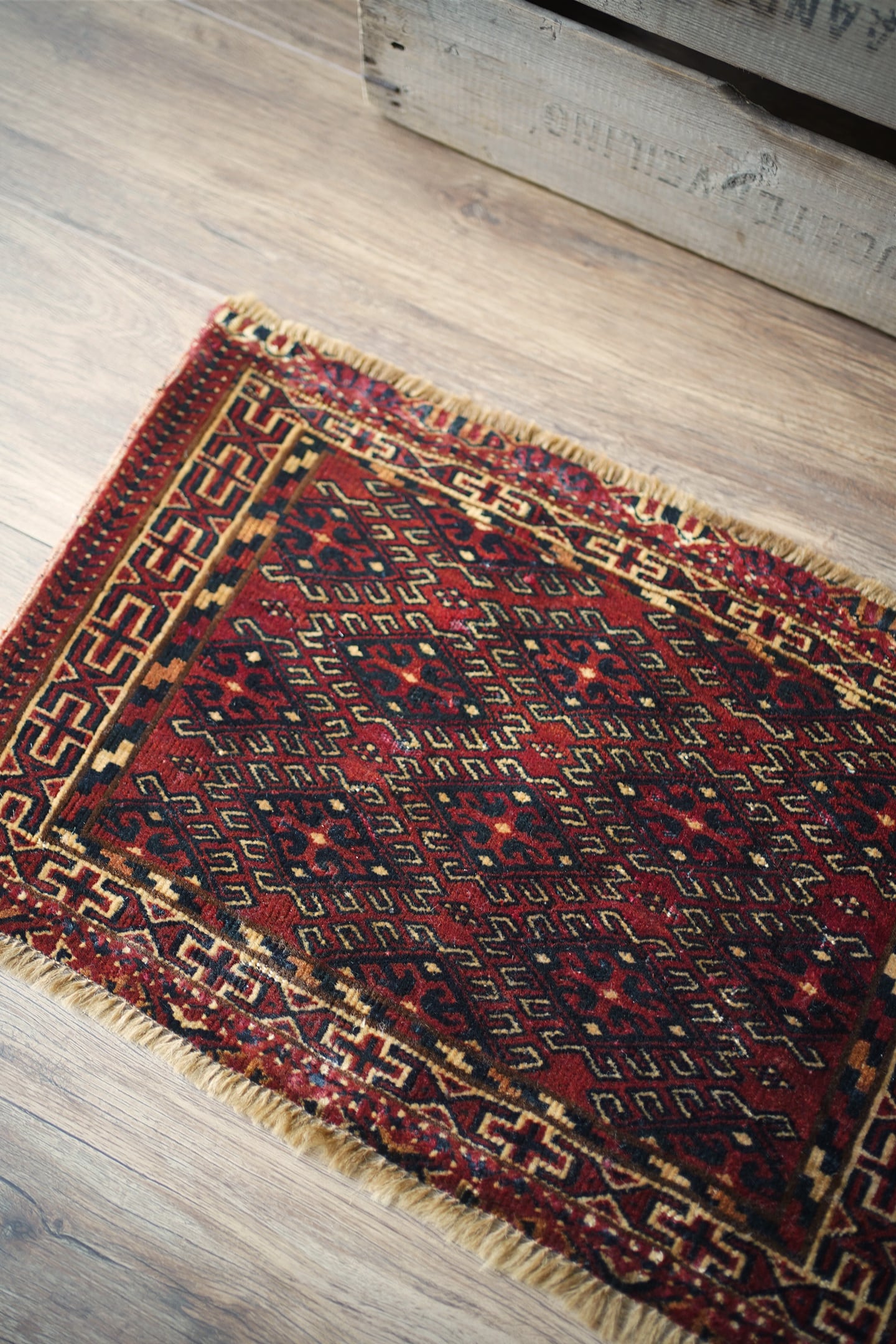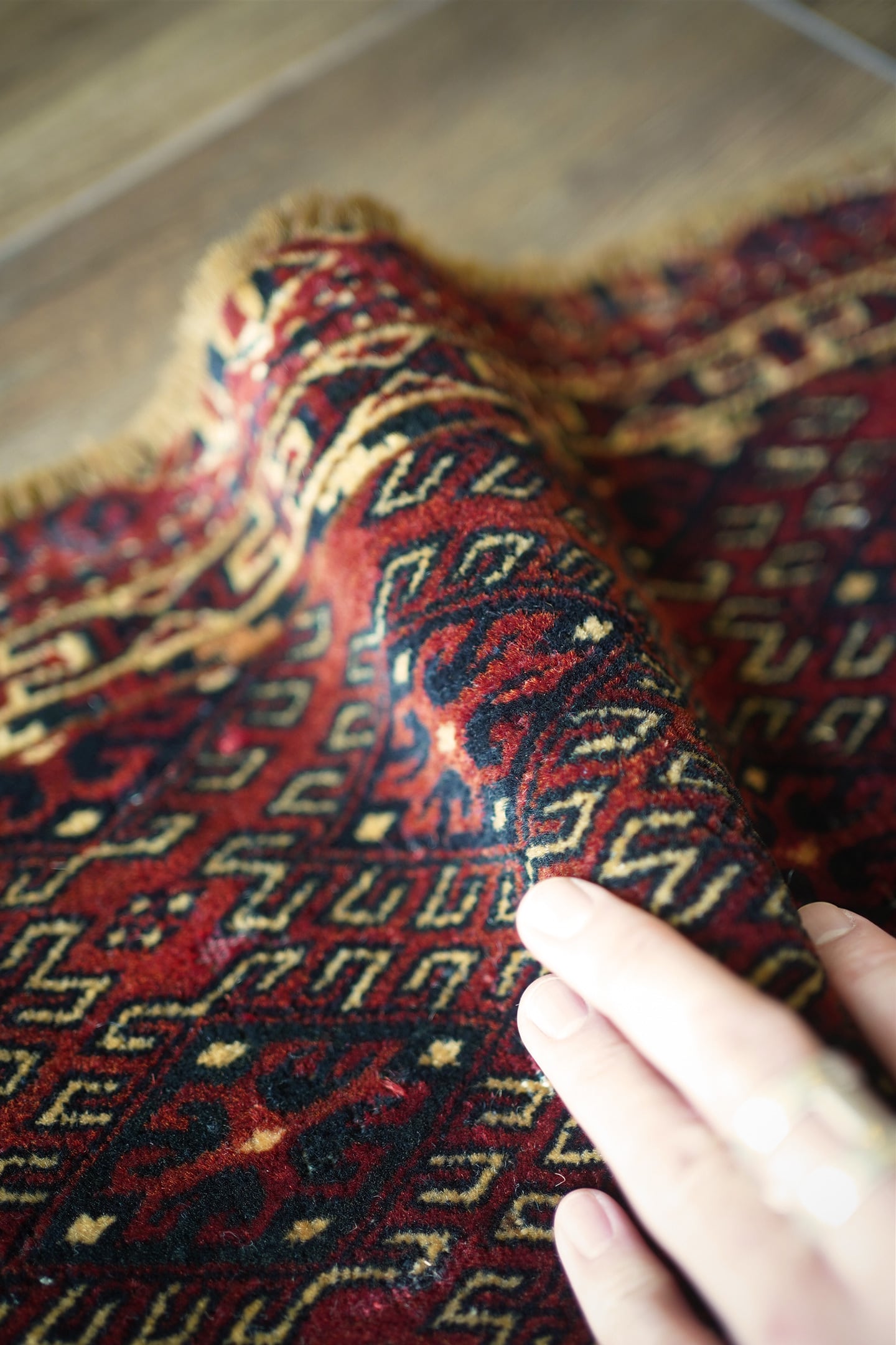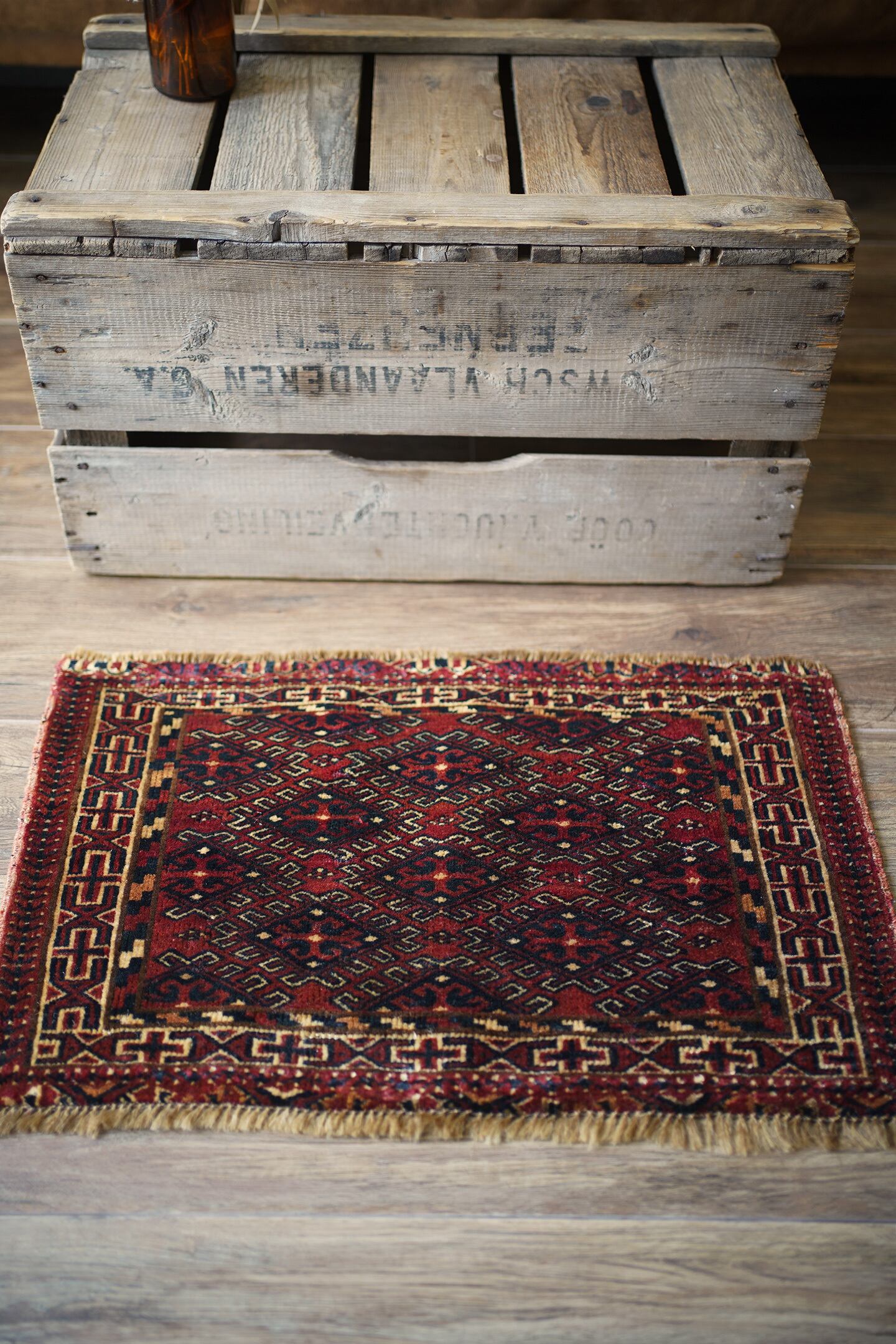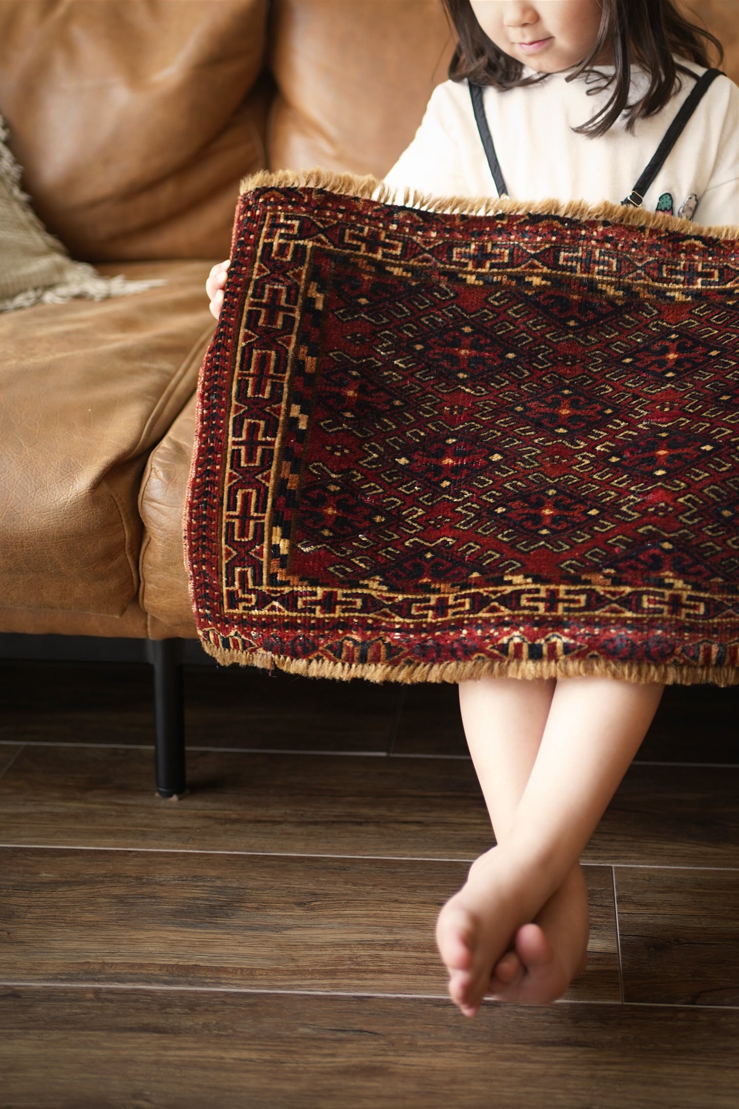 約90年前のトルクメニスタン産セミアンティークラグです。トルクメンのヤムート族によって織られた1枚で、深みのある赤色とブラックの落ち着いた配色が魅力的な一枚。小さすぎず大きすぎない程よいサイズ感で、デスクスペースや棚の上、観葉植物の下に敷いたりと色んなシーンでご使用いただけるかと思います♪ 厚みは4mmで、表面はサラふわっとした肌触り。パイルが薄くなっている箇所もありますが、それ以外は目立った補修跡も見受けられません。歴史を感じさせる素敵なトルクメンをお探しの方に。