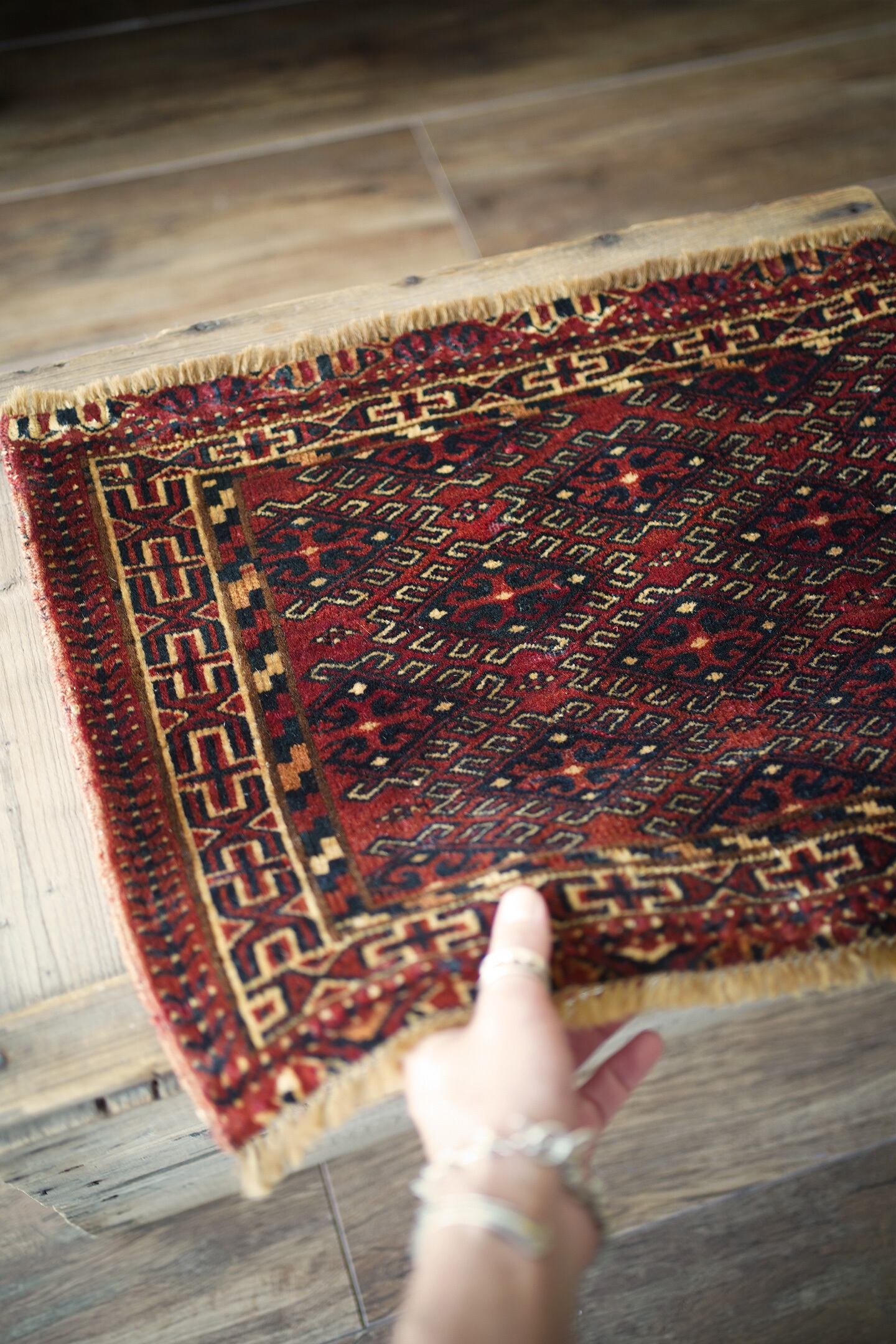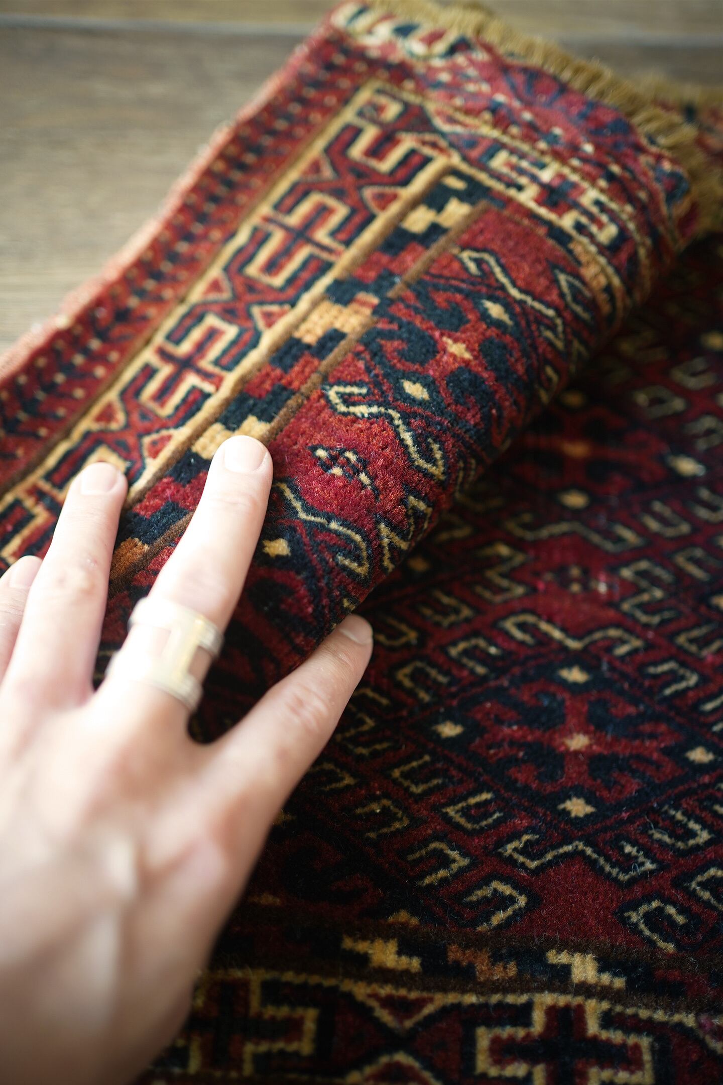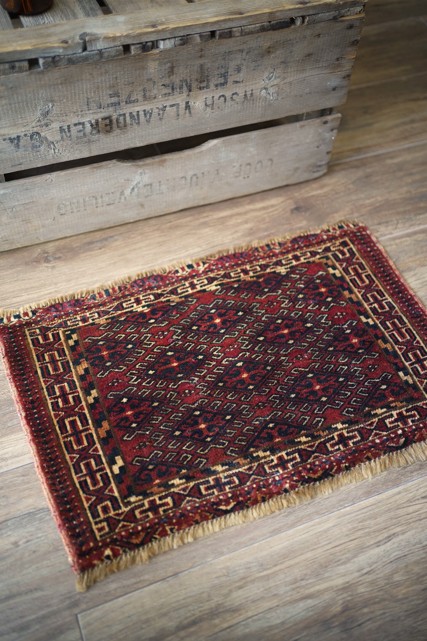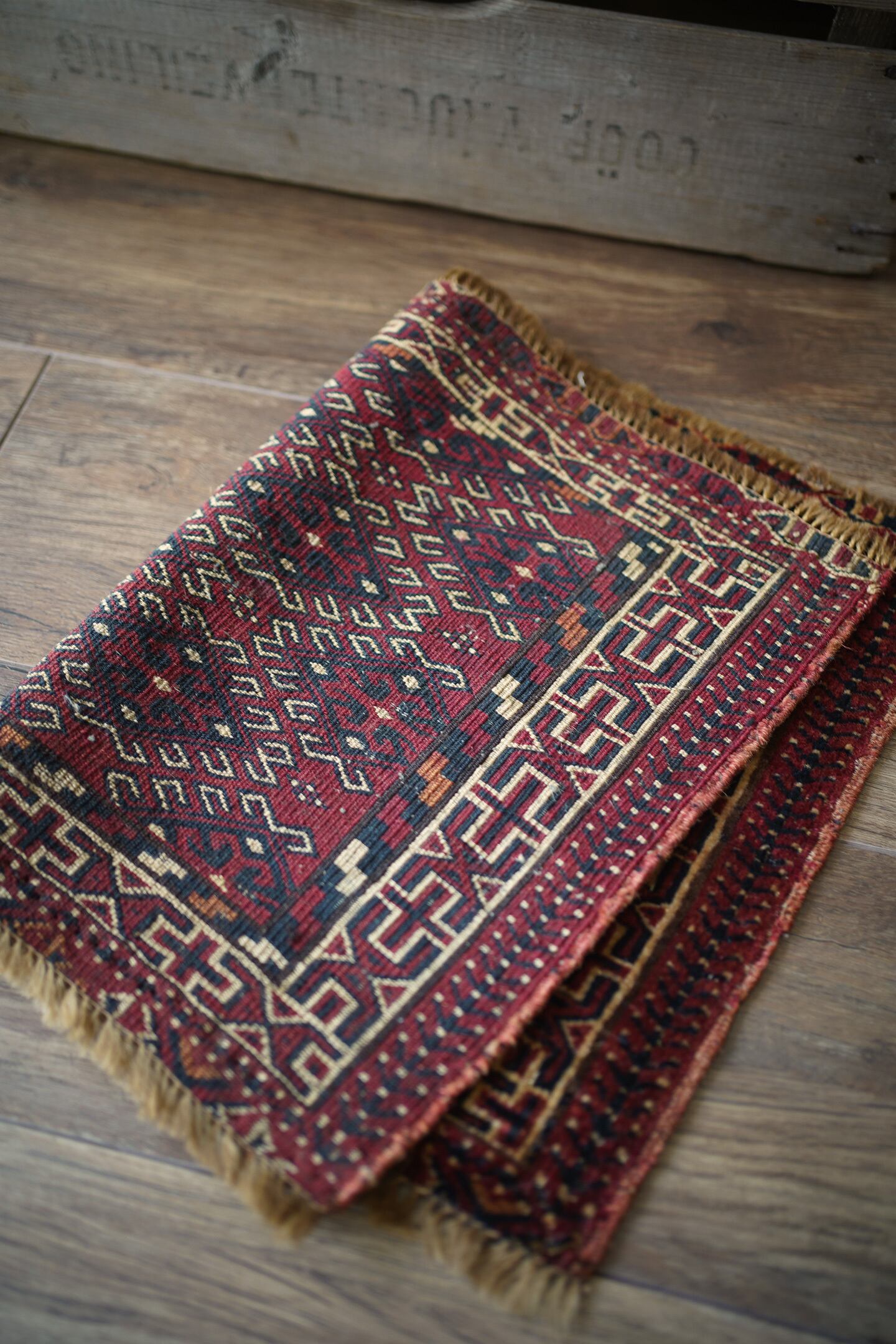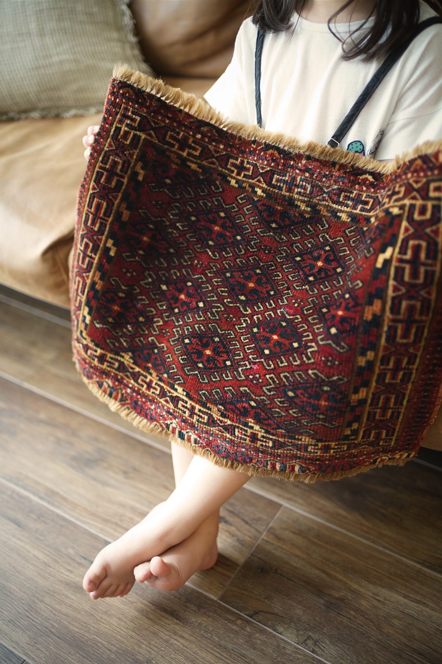 約90年前のトルクメニスタン産セミアンティークラグです。トルクメンのヤムート族によって織られた1枚で、深みのある赤色とブラックの落ち着いた配色が魅力的な一枚。小さすぎず大きすぎない程よいサイズ感で、デスクスペースや棚の上、観葉植物の下に敷いたりと色んなシーンでご使用いただけるかと思います♪ 厚みは4mmで、表面はサラふわっとした肌触り。パイルが薄くなっている箇所もありますが、それ以外は目立った補修跡も見受けられません。歴史を感じさせる素敵なトルクメンをお探しの方に。