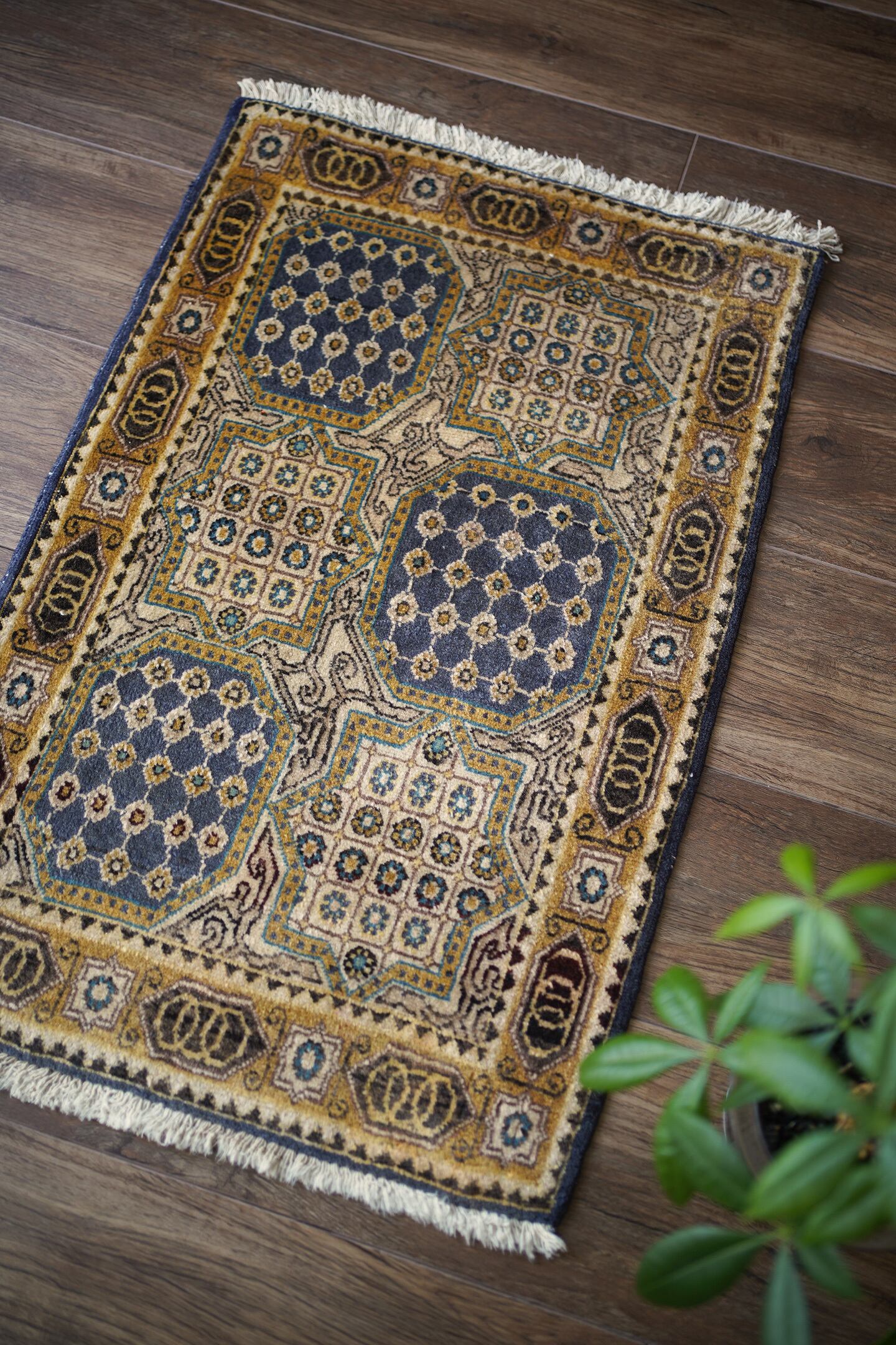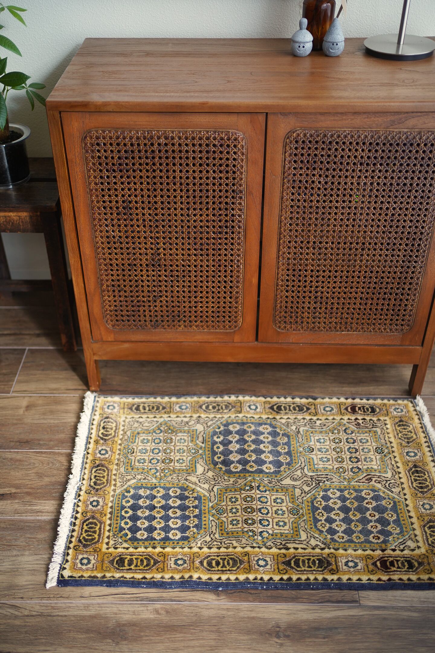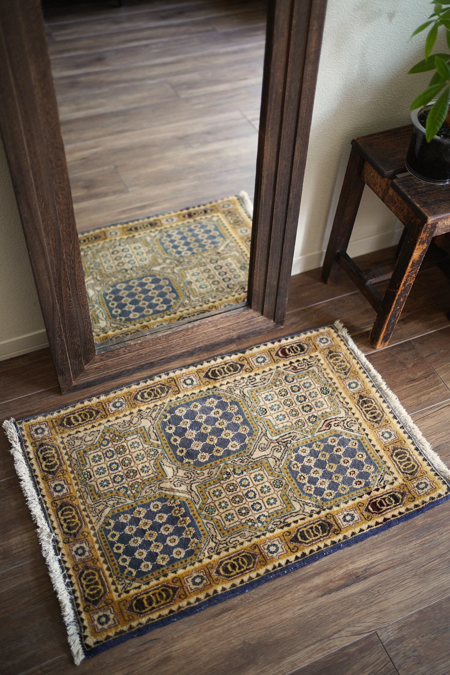 経年約40年のイラン・タブリーズ産のヴィンテージラグ。珍しいデザインに惹かれて仕入れを決めた1枚です。黄色と黄土色の中間色のような渋い色合いで、実物はお写真よりもややくすんだ色味の印象を受けます。表面のパイルはサラふわっとした肌触りで、厚みは6mm程度。目立ったダメージもなく状態良好です。玄関スペースをはじめ、色んな場所に敷いていただけるかと思います。