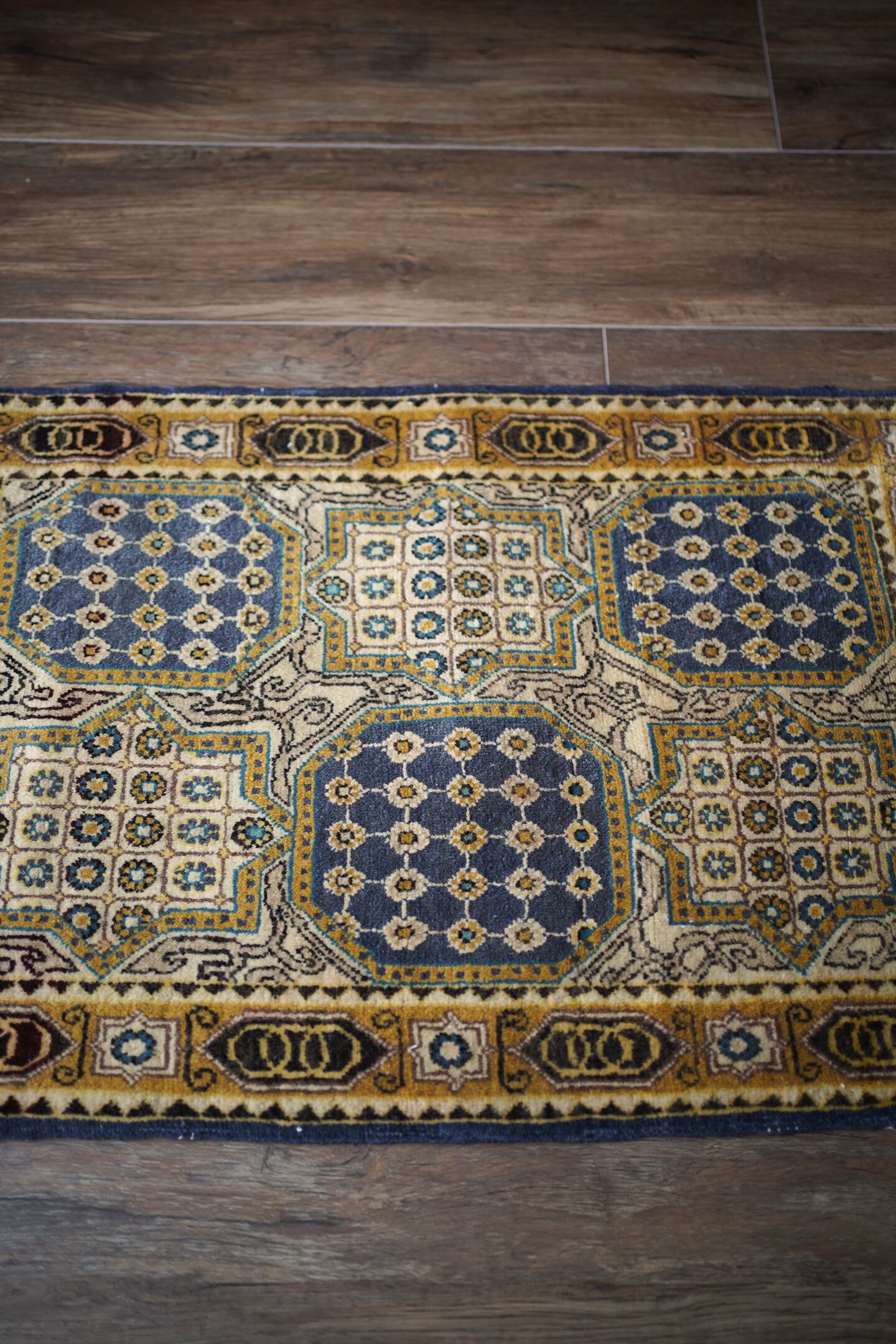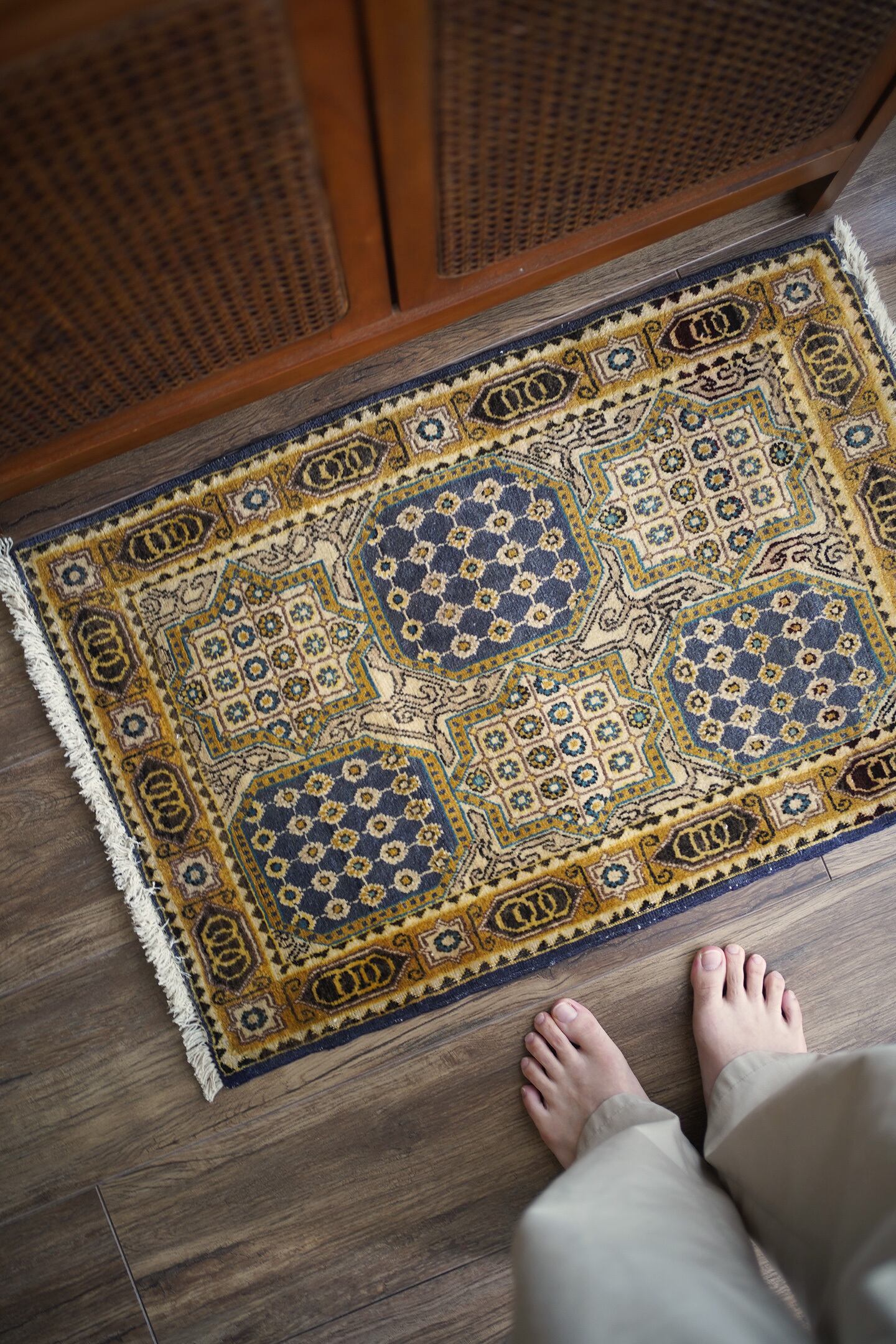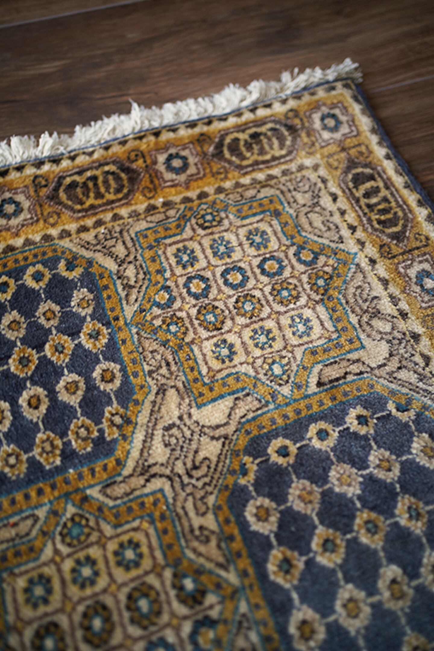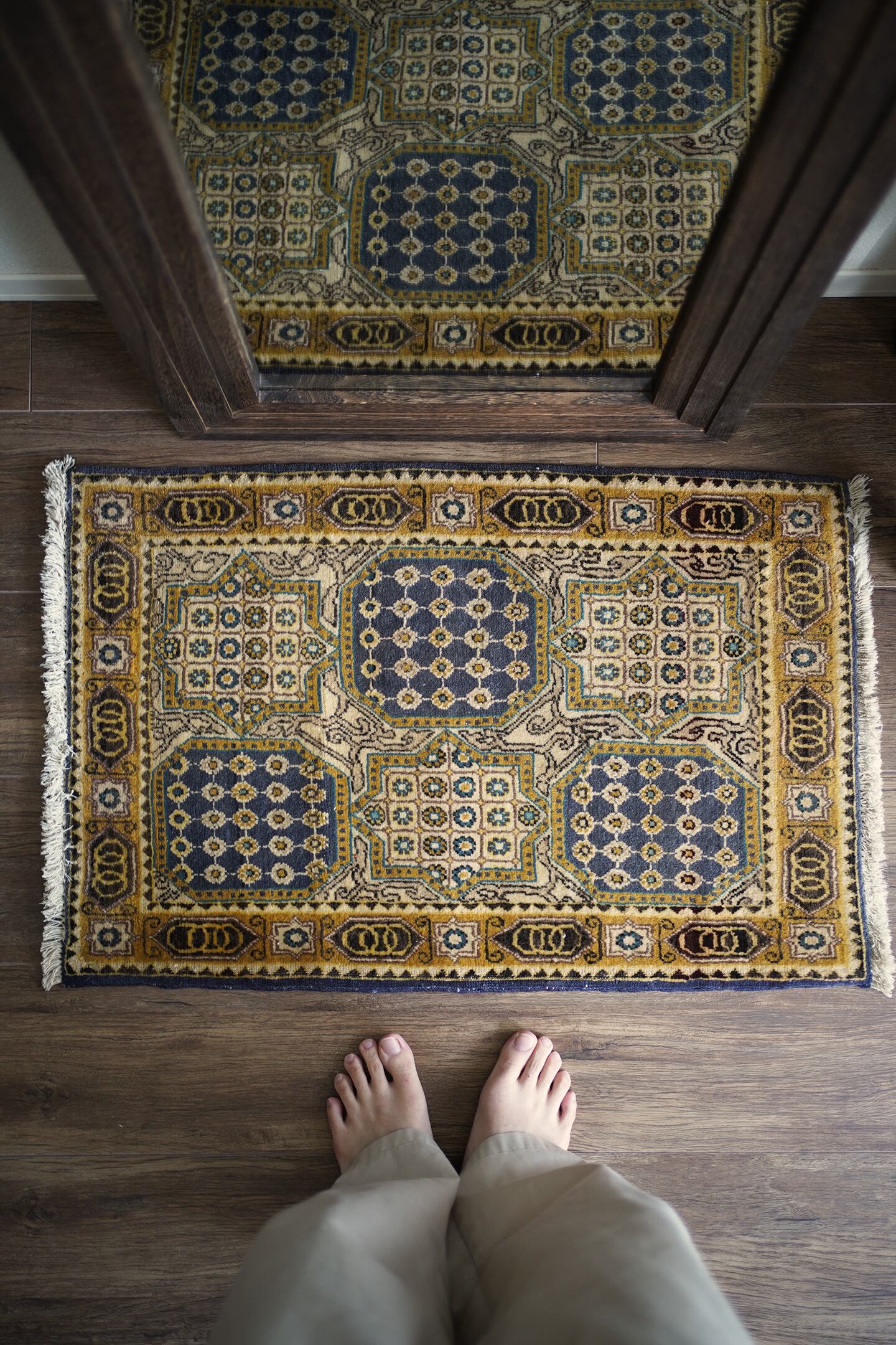 経年約40年のイラン・タブリーズ産のヴィンテージラグ。珍しいデザインに惹かれて仕入れを決めた1枚です。黄色と黄土色の中間色のような渋い色合いで、実物はお写真よりもややくすんだ色味の印象を受けます。表面のパイルはサラふわっとした肌触りで、厚みは6mm程度。目立ったダメージもなく状態良好です。玄関スペースをはじめ、色んな場所に敷いていただけるかと思います。