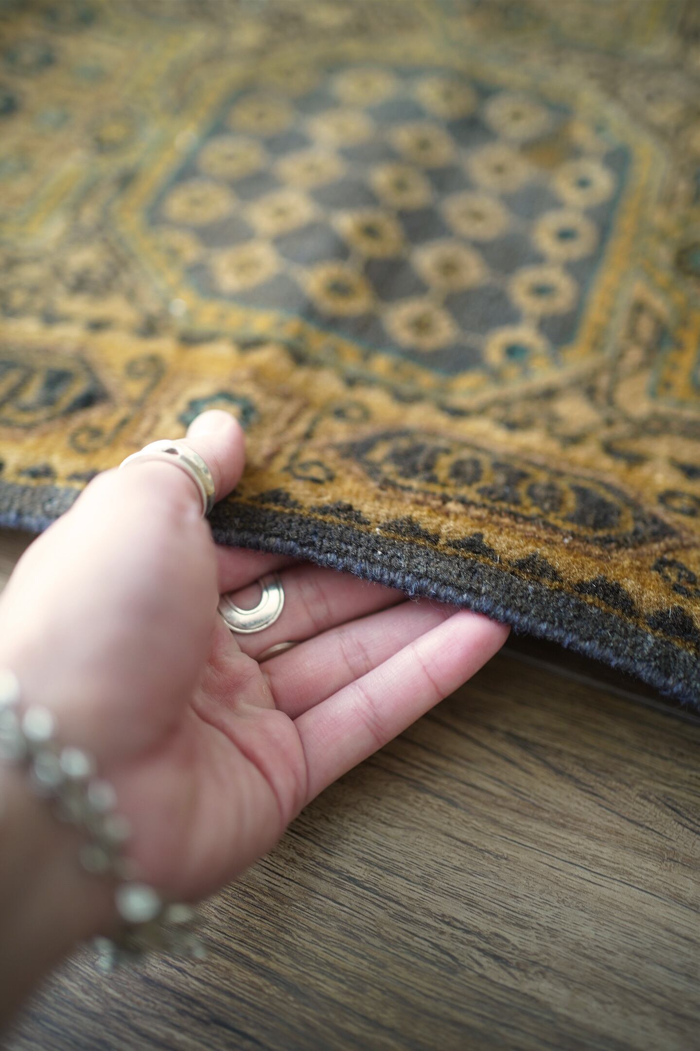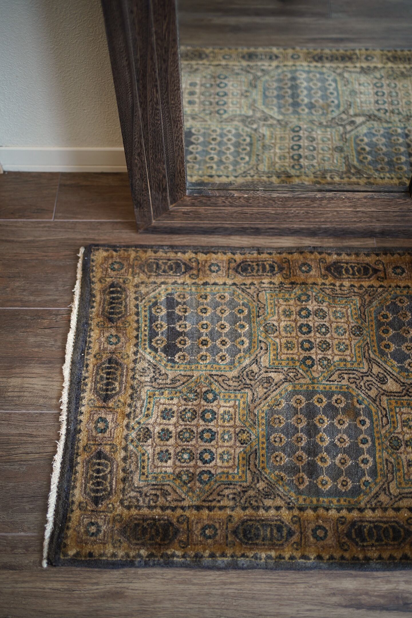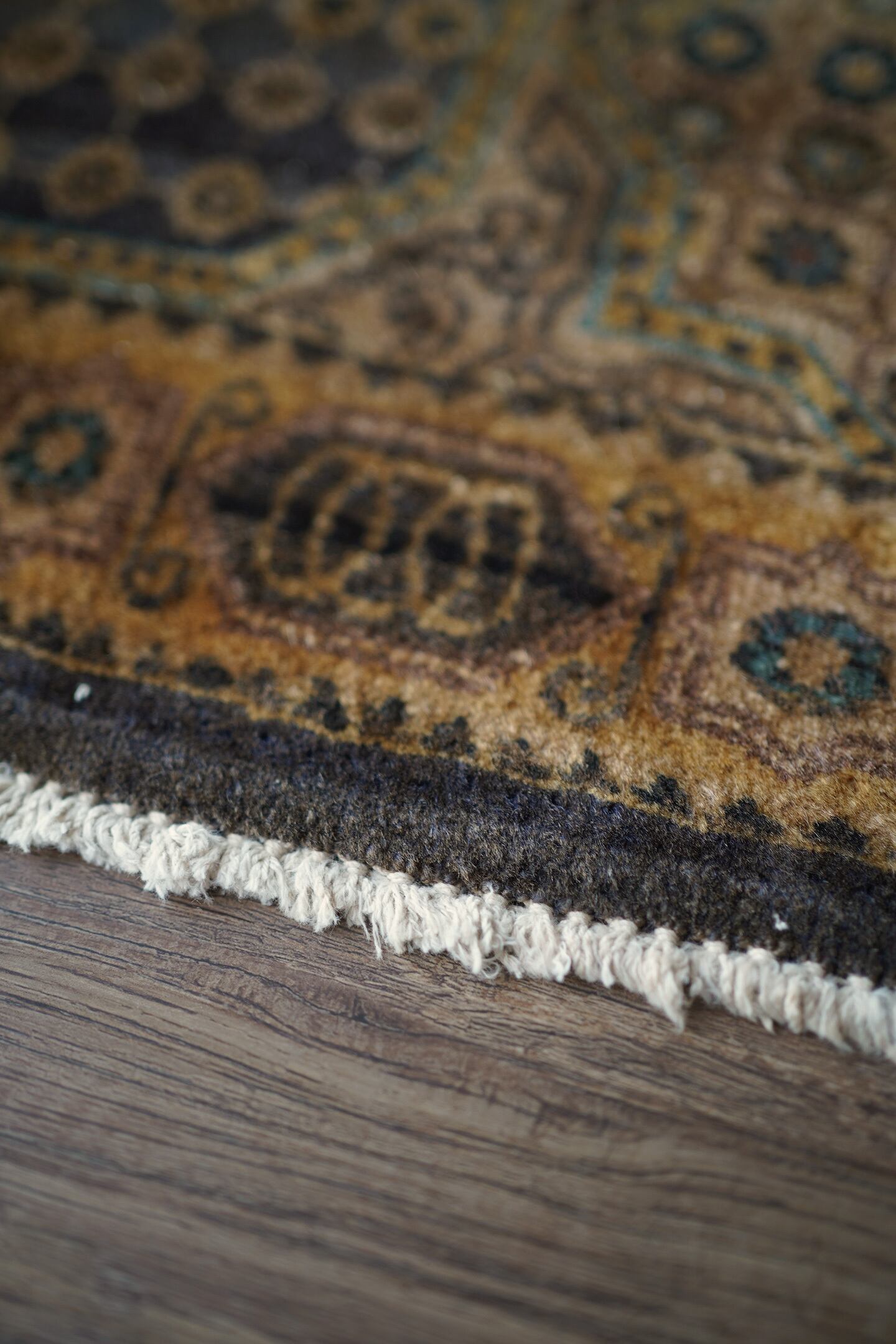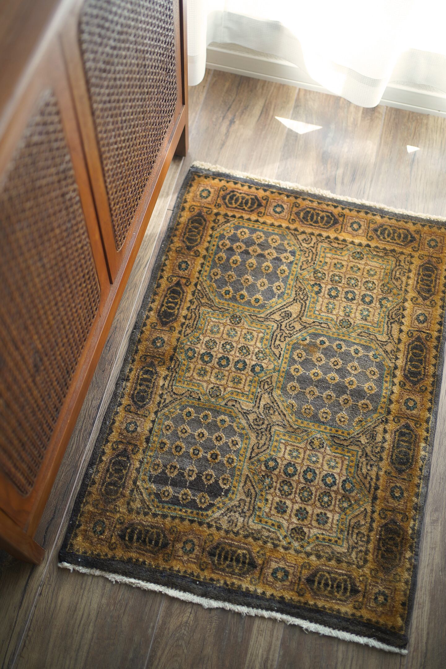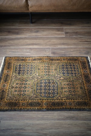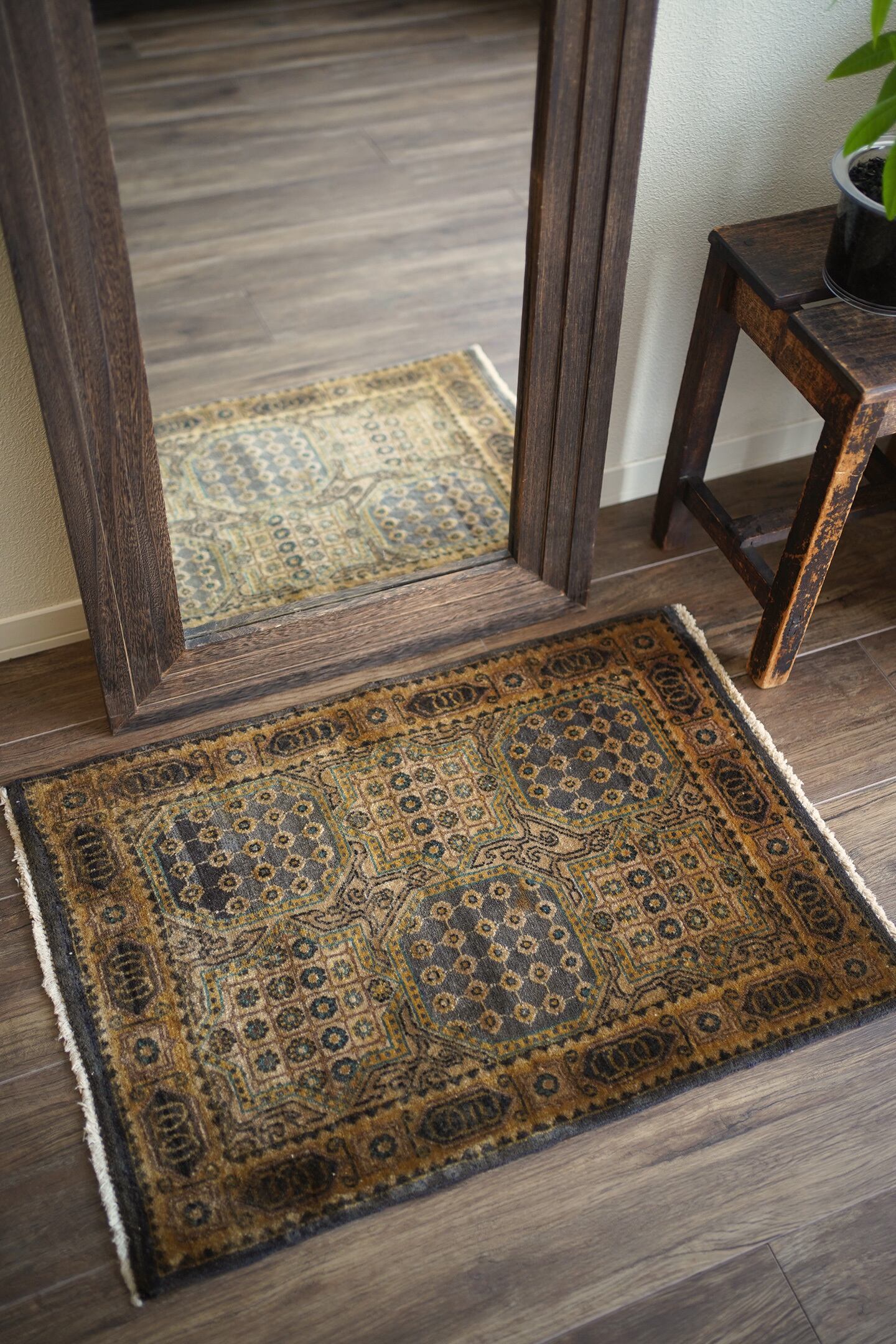 経年約40年のイラン・タブリーズ産のヴィンテージラグ。珍しいデザインに惹かれて仕入れを決めた1枚です。上染めにより暗めに仕上げており、黒みがかった黄土色のような渋い色合いになっています。表面のパイルはサラふわっとした肌触りで、厚みは6mm程度。目立ったダメージもなく状態良好です。玄関スペースをはじめ、色んな場所に敷いていただけるかと思います。