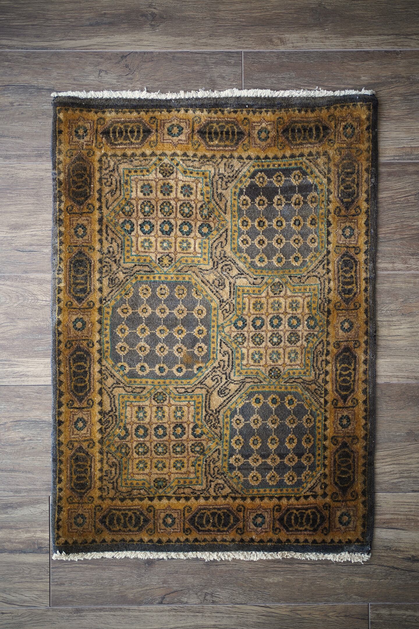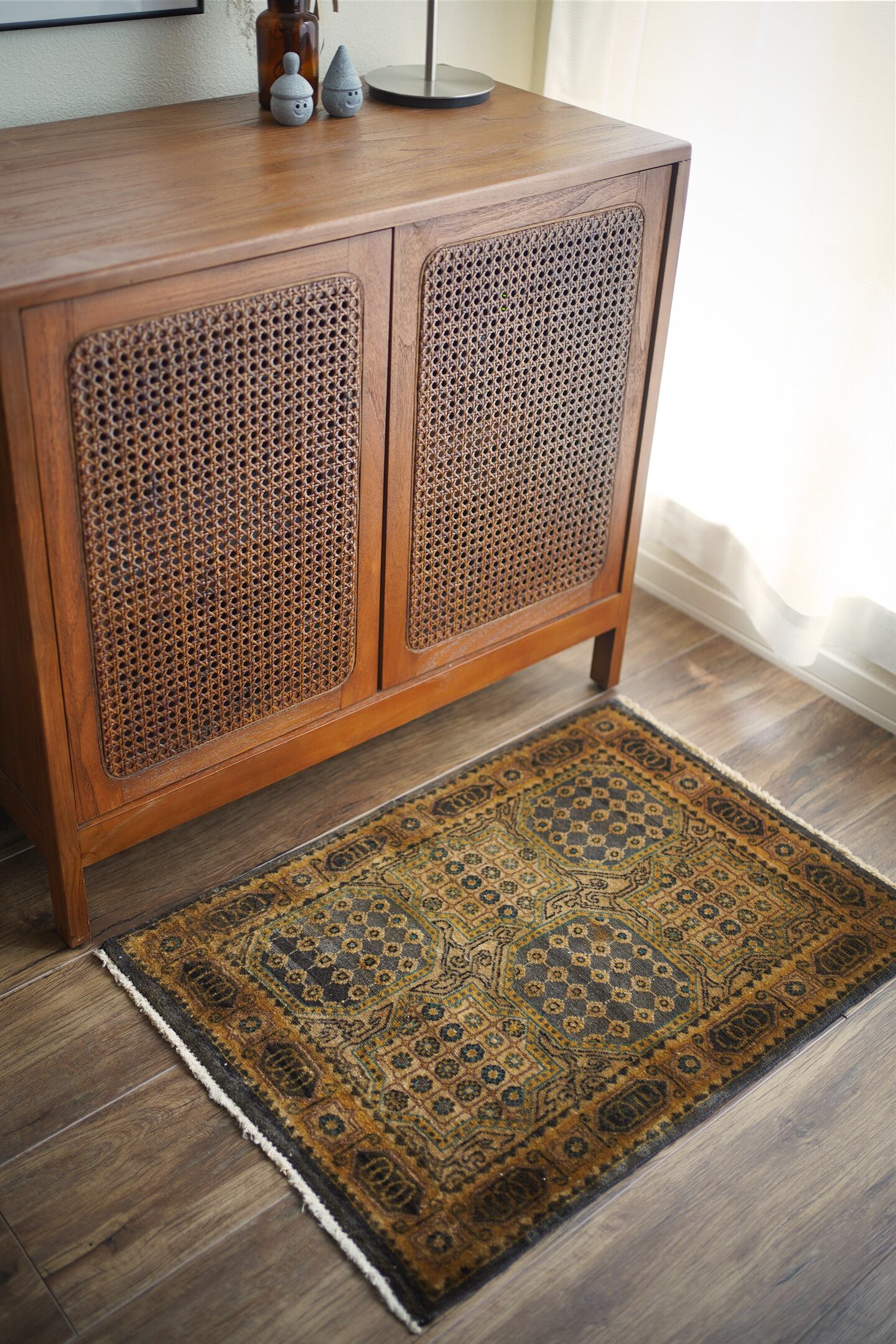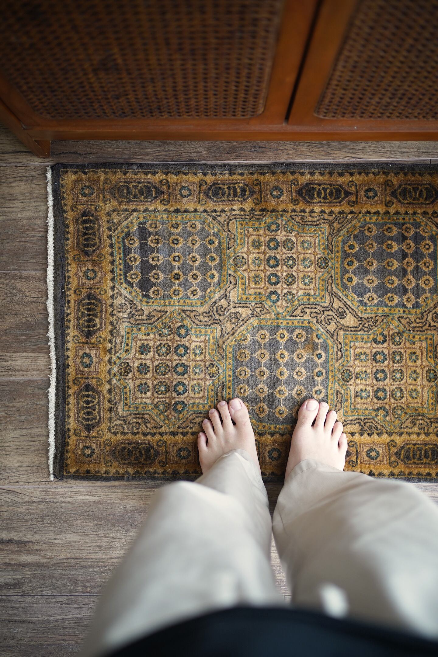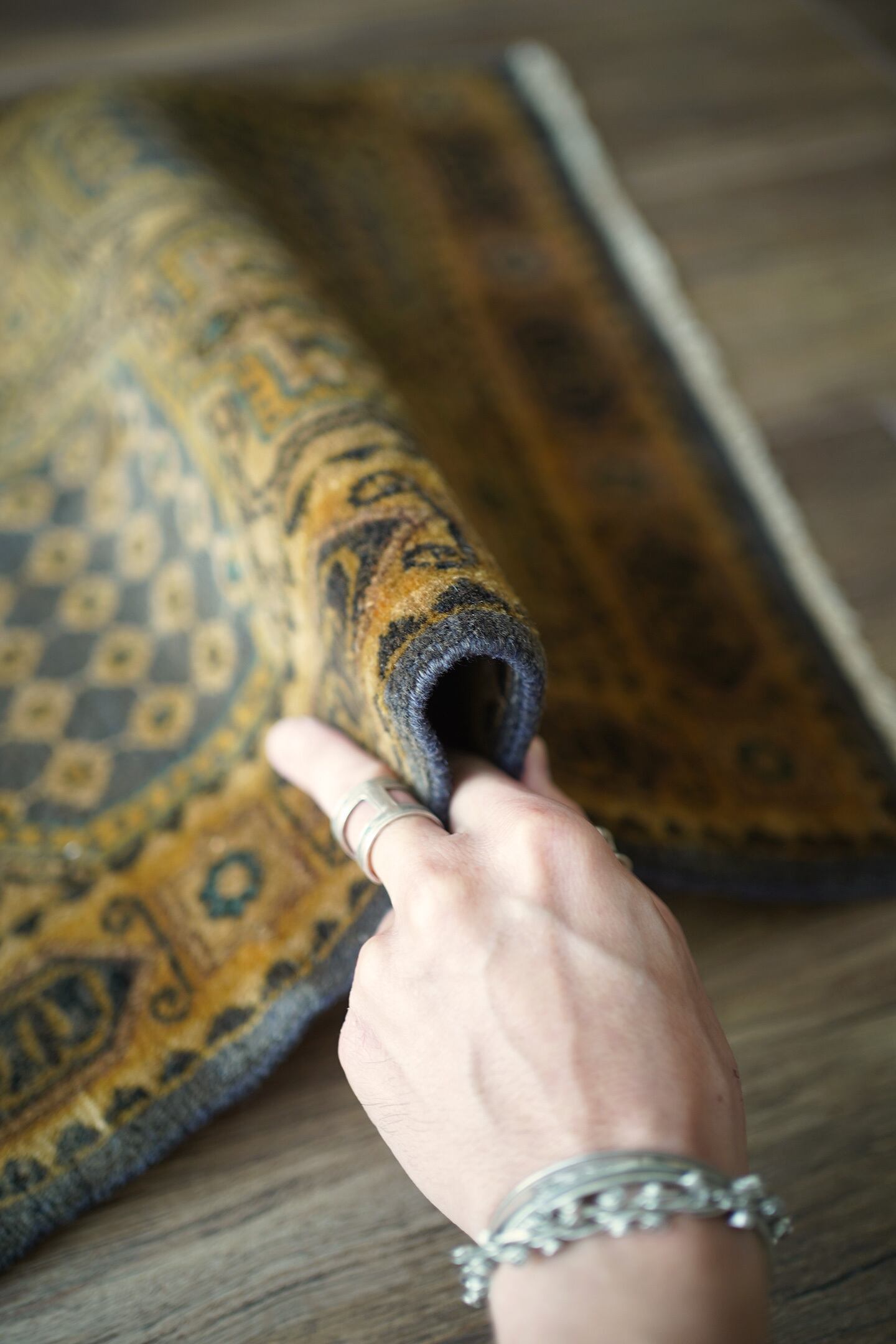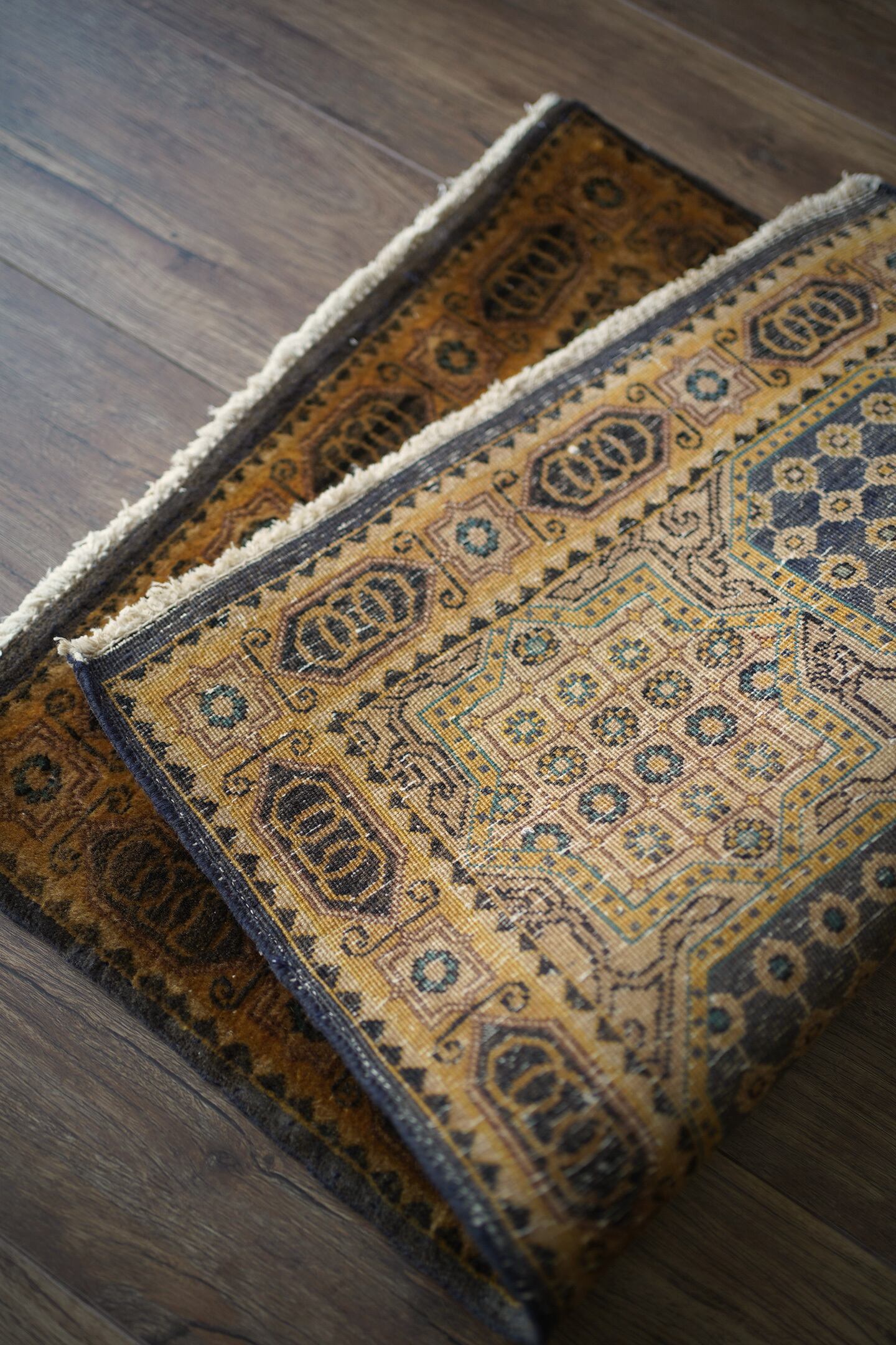 経年約40年のイラン・タブリーズ産のヴィンテージラグ。珍しいデザインに惹かれて仕入れを決めた1枚です。上染めにより暗めに仕上げており、黒みがかった黄土色のような渋い色合いになっています。表面のパイルはサラふわっとした肌触りで、厚みは6mm程度。目立ったダメージもなく状態良好です。玄関スペースをはじめ、色んな場所に敷いていただけるかと思います。