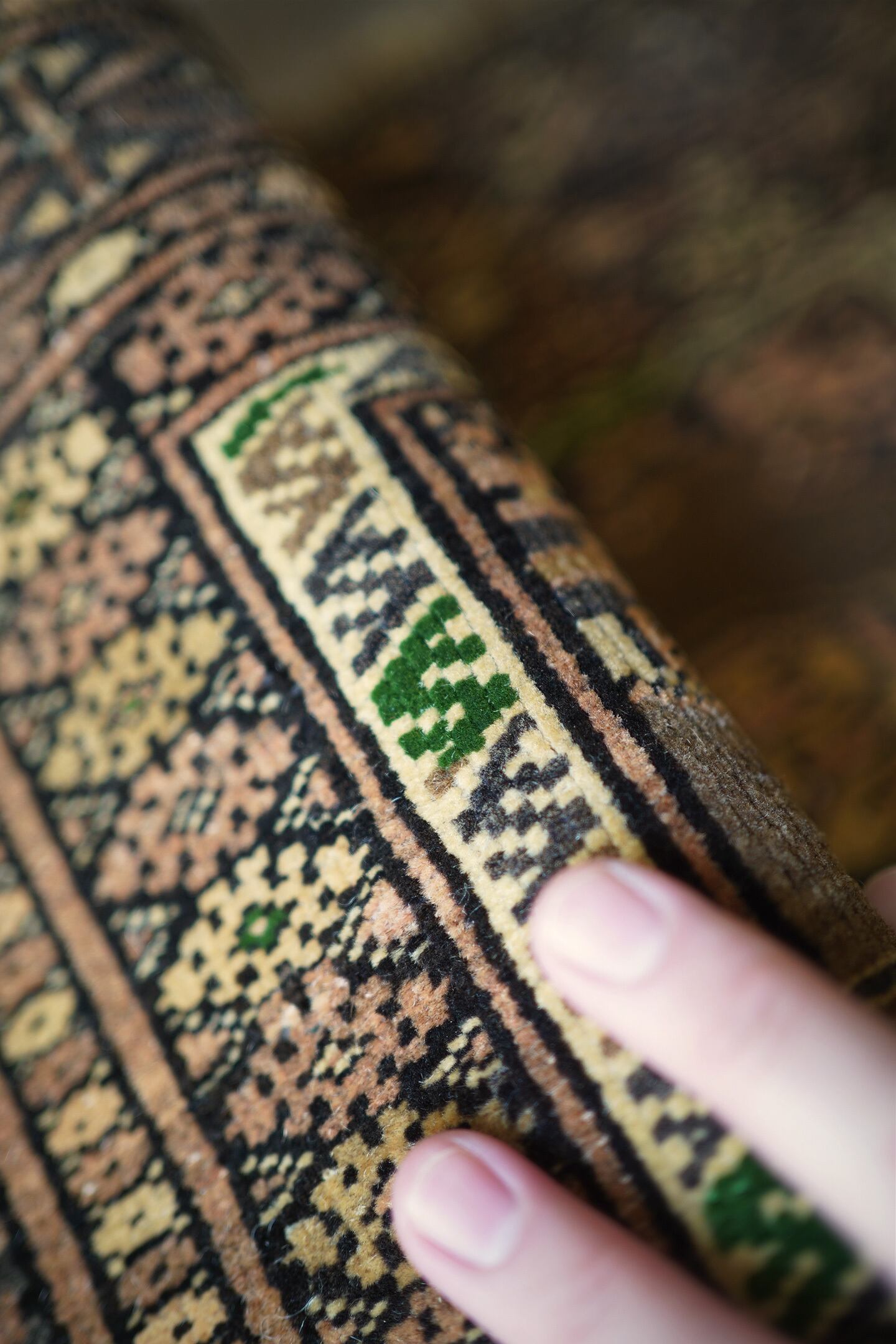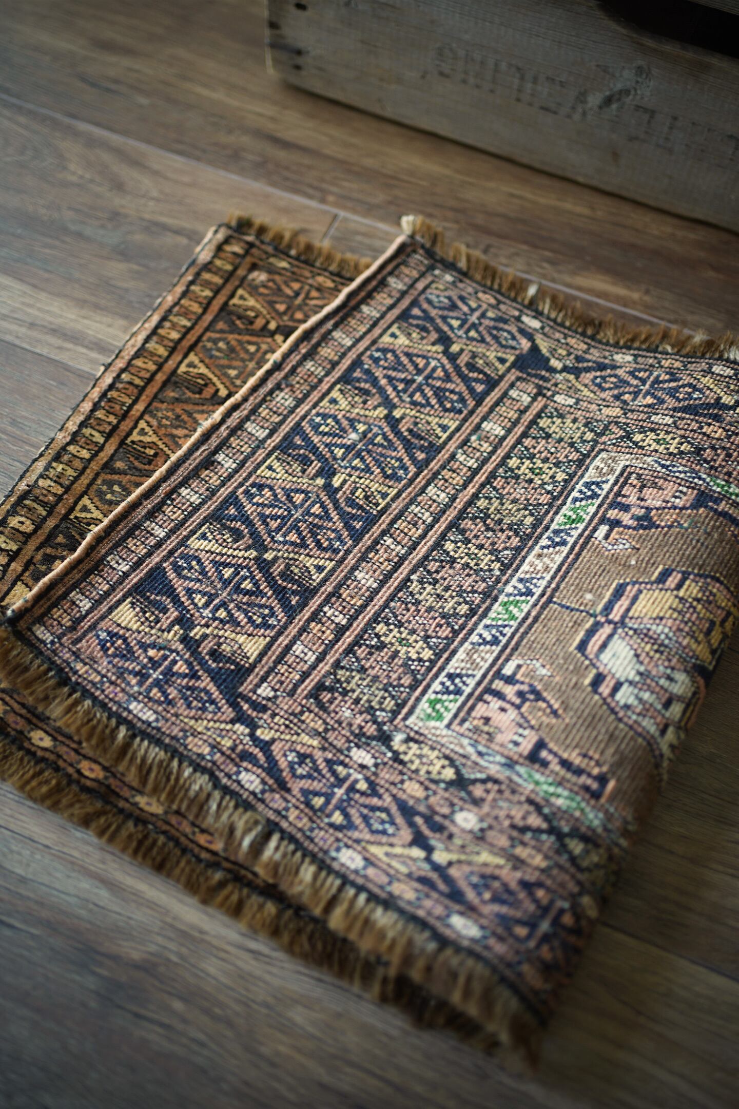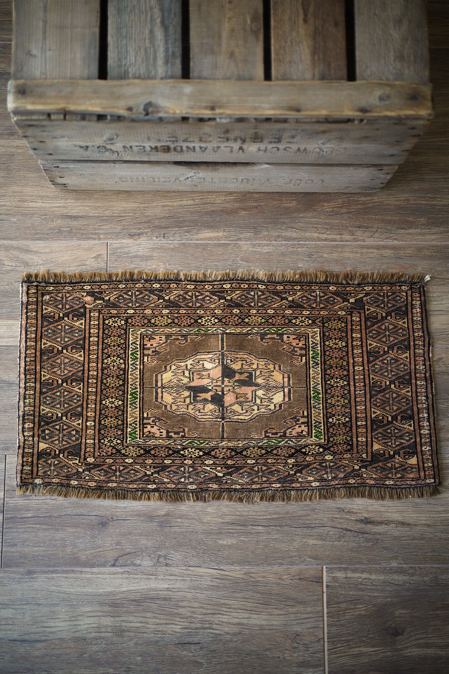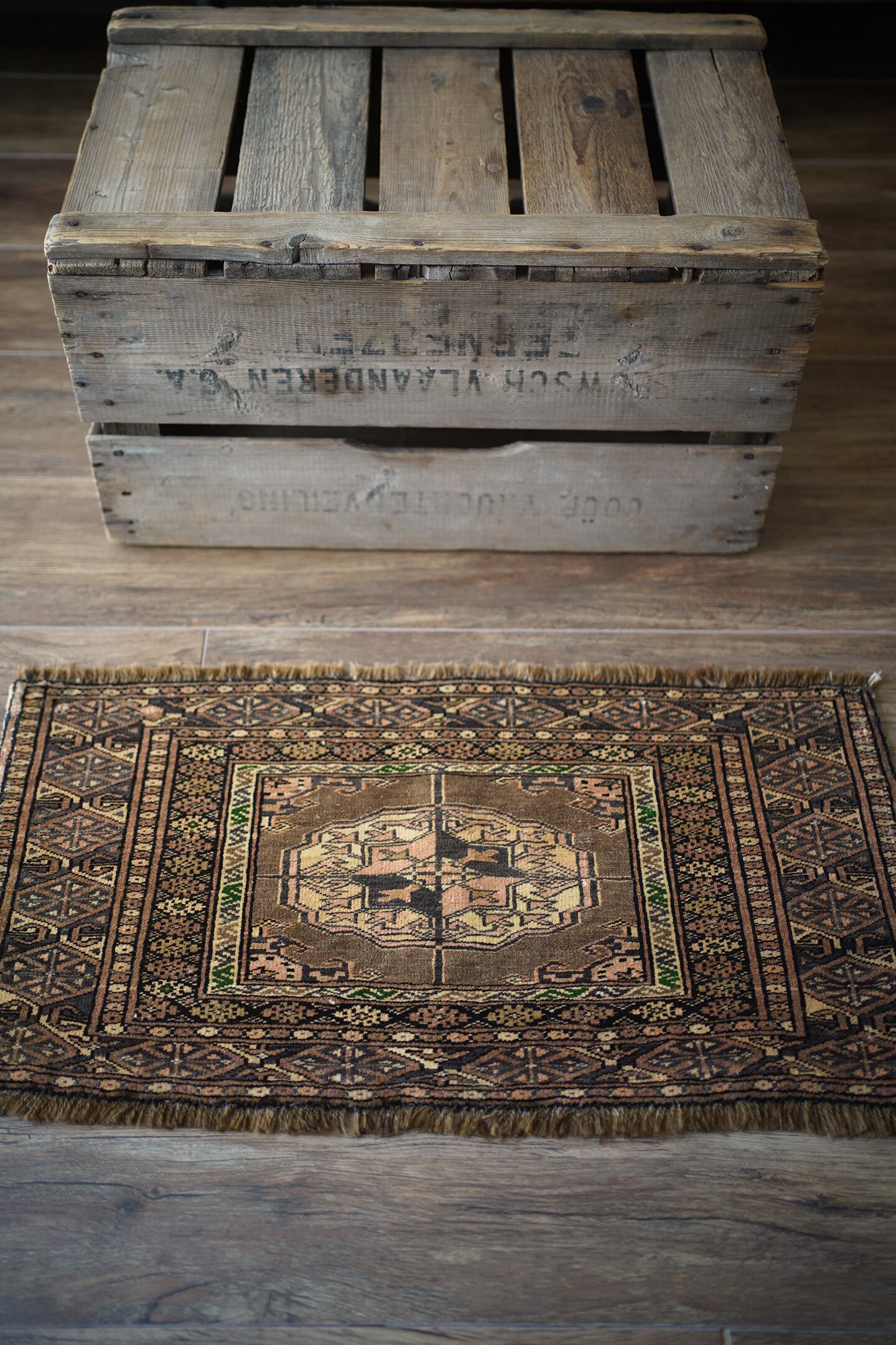 約80年ほど前に織られたアフガニスタン産のトルクメンラグ。中央にはテッケギュルと呼ばれる四方の放射状の鳥のようなギュル紋様が織り込まれています。ブラウン、焦茶、ブラック、ベージュなどの統一感のある配色が素晴らしく、アクセントカラーにダークグリーンが使われているところが非常に素敵なポイントです。表面はサラッとした肌触りをしており、厚みは5mm程度。裏面は張りのある質感をしています。目立ったダメージや補修された跡もなく状態良好です。観葉植物の下に敷いたり、デスクスペースに広げたりと色んな使い方で楽しめそうです♪