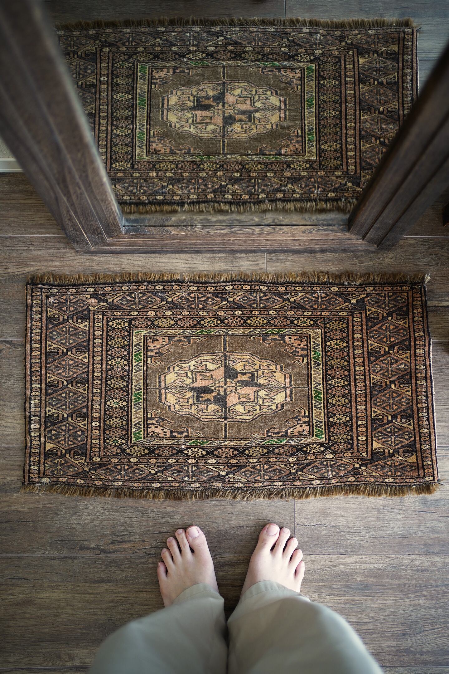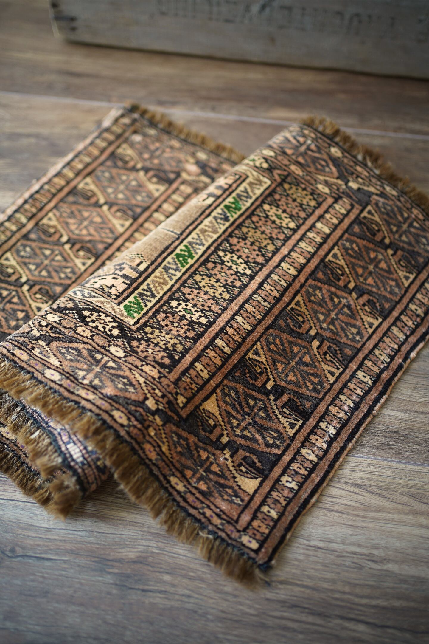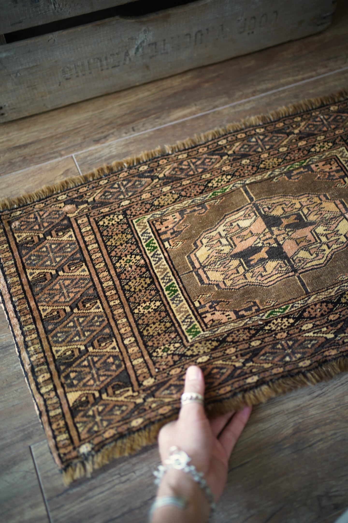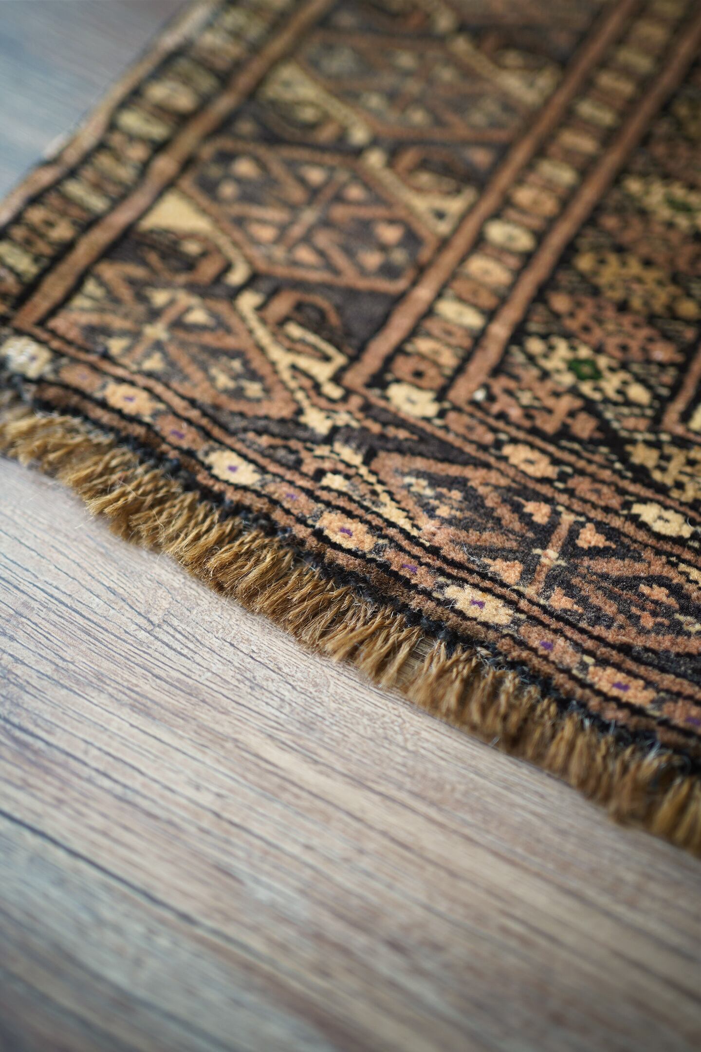約80年ほど前に織られたアフガニスタン産のトルクメンラグ。中央にはテッケギュルと呼ばれる四方の放射状の鳥のようなギュル紋様が織り込まれています。ブラウン、焦茶、ブラック、ベージュなどの統一感のある配色が素晴らしく、アクセントカラーにダークグリーンが使われているところが非常に素敵なポイントです。表面はサラッとした肌触りをしており、厚みは5mm程度。裏面は張りのある質感をしています。目立ったダメージや補修された跡もなく状態良好です。観葉植物の下に敷いたり、デスクスペースに広げたりと色んな使い方で楽しめそうです♪