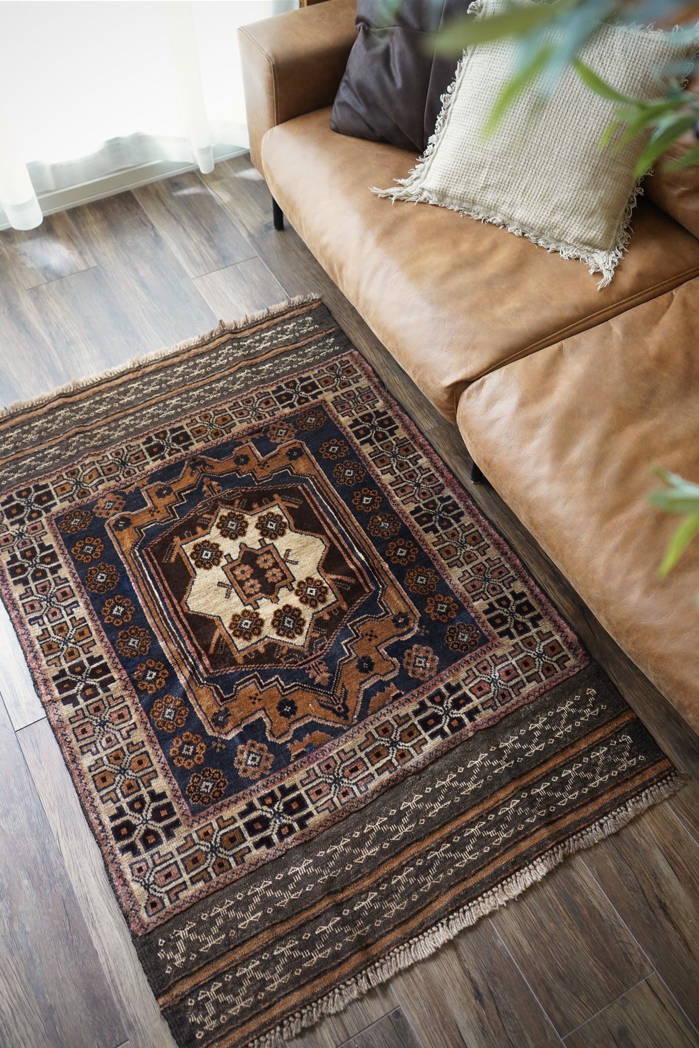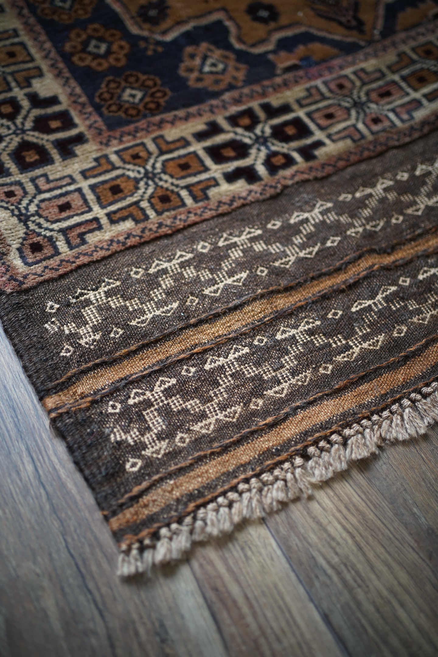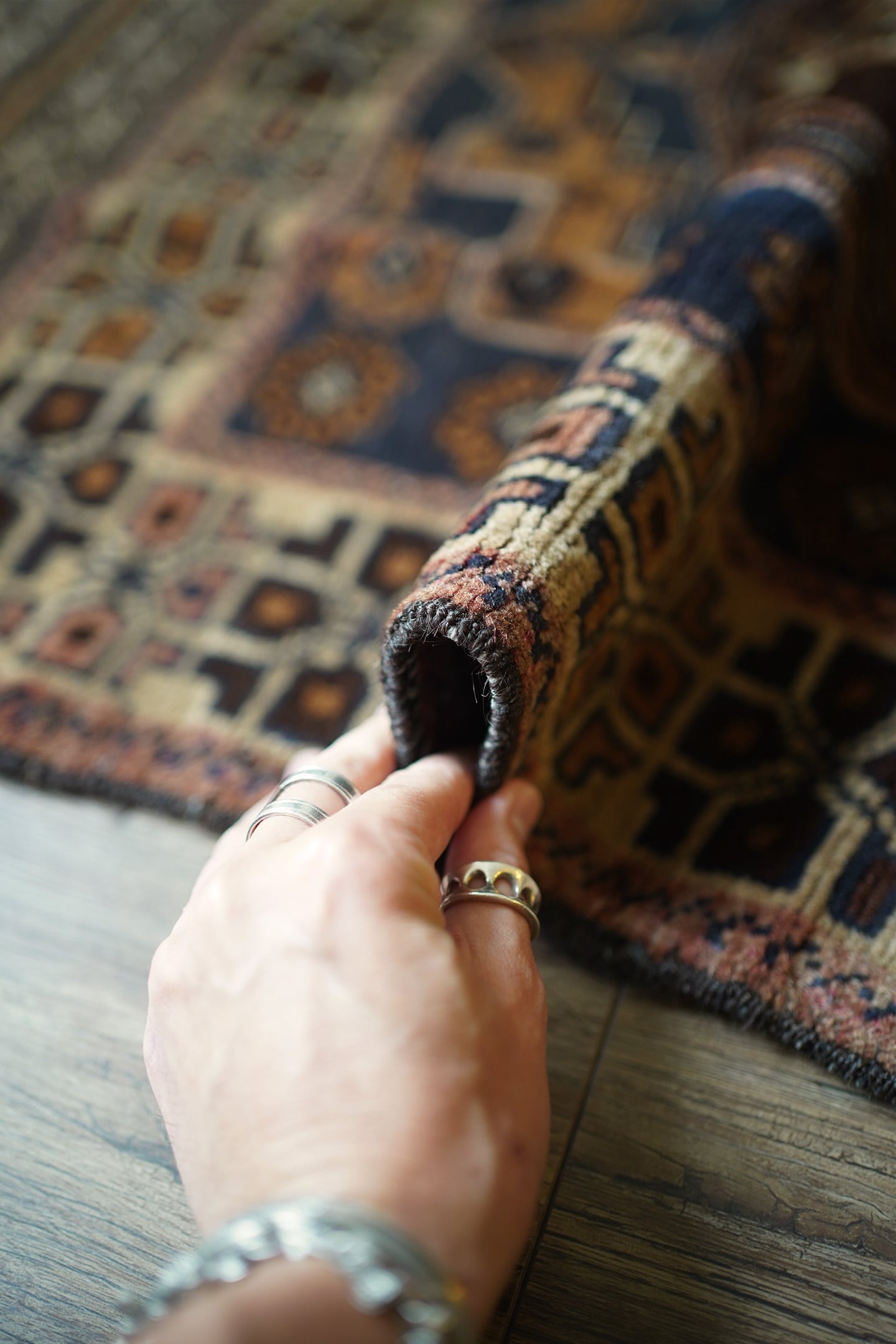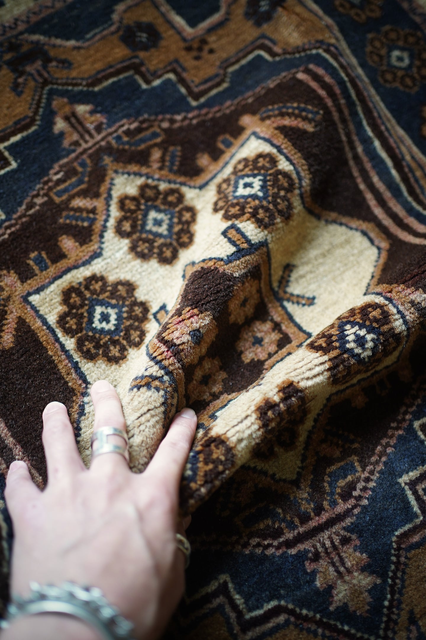 約30年前に織られたアフガニスタン産のバルーチラグ。キリムエンドが特徴的で帯が二重になったユニークな作りをしています。濃紺、ブラウン、焦茶、ベージュと統一感のある素晴らしい配色でお部屋にも取り入れやすい一枚かと思います。表面はふわっと柔らかい肌触りで、厚みは8mm程度。目立ったダメージや補修跡も見受けられず、良好なコンディションです。お気に入りのスペースをはじめ、小さめのソファの前や一人掛けチェアに合わせたりと色んなシーンで楽しんでいだだけると思います♫
