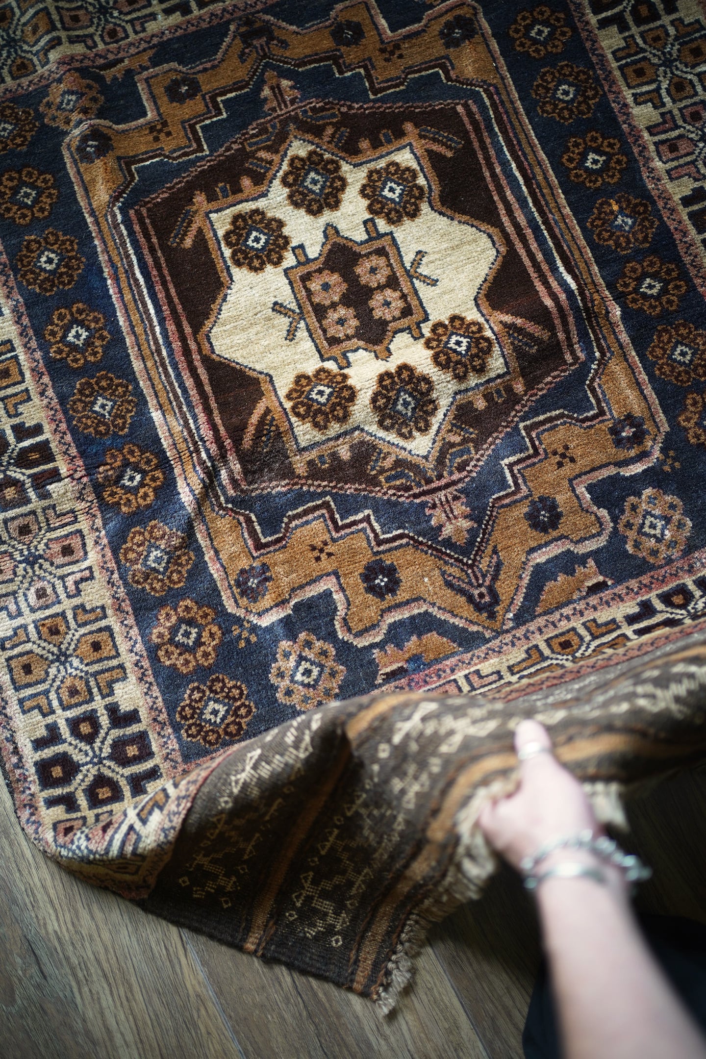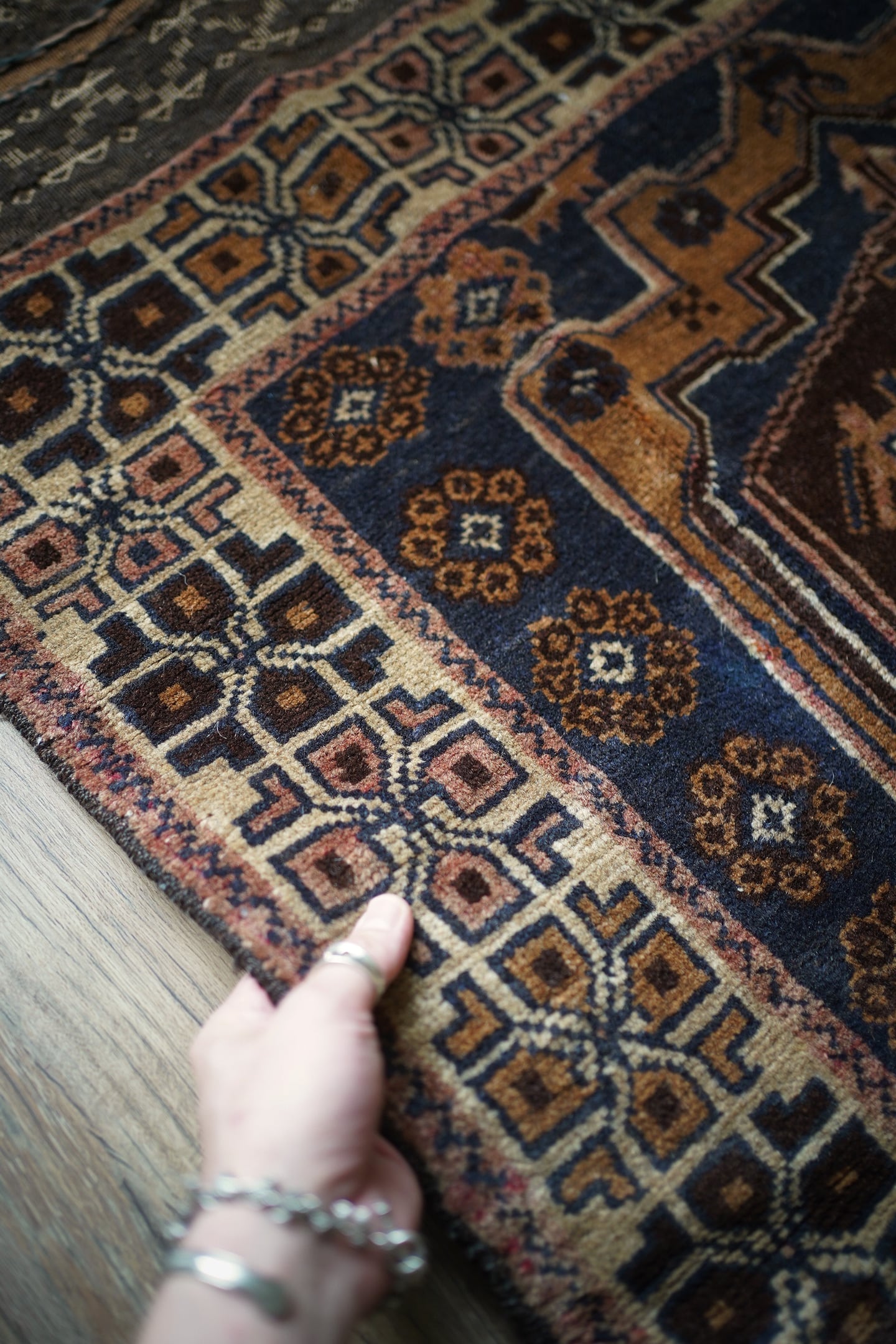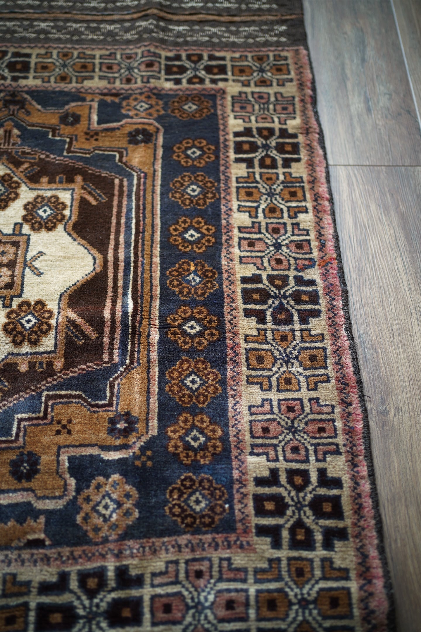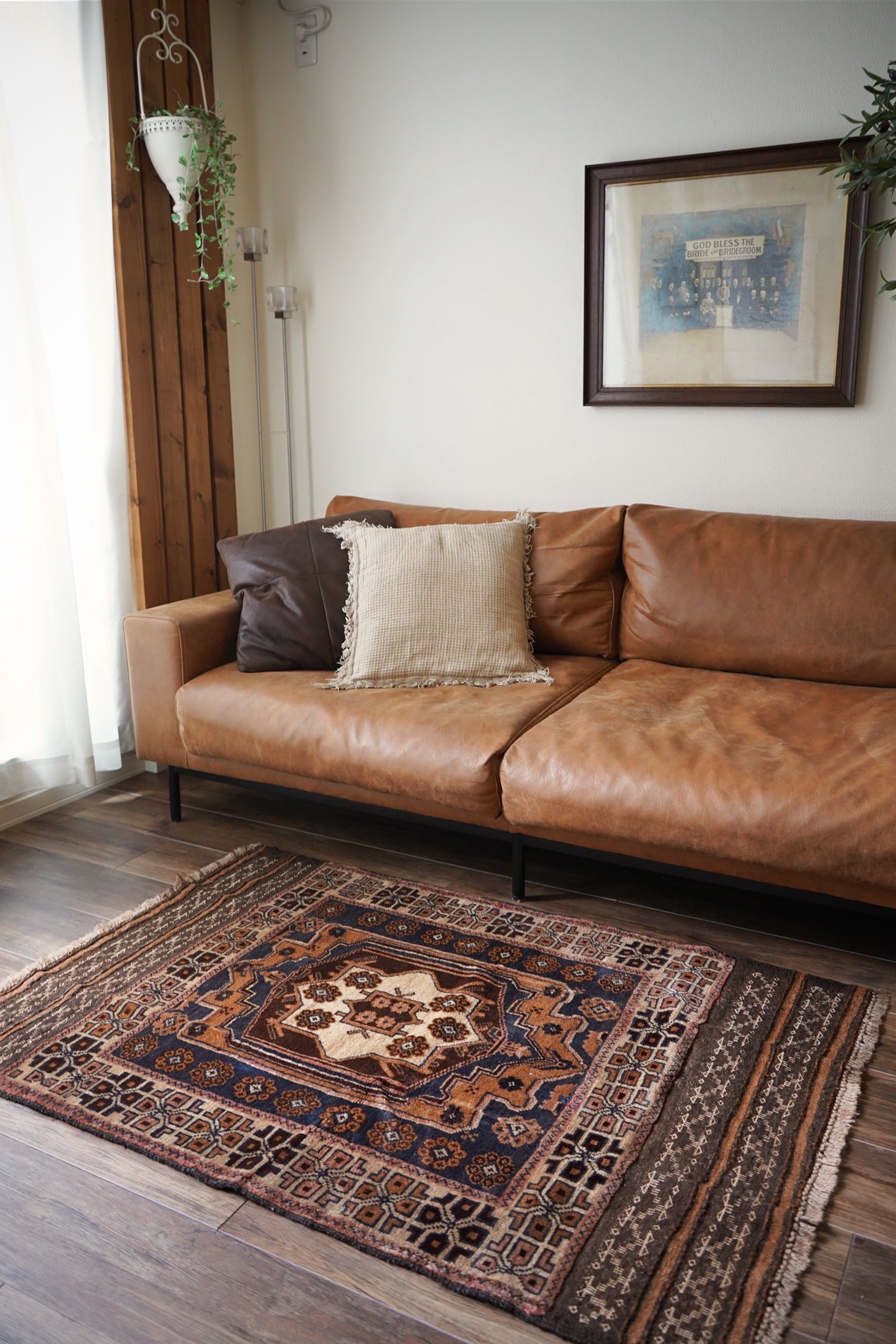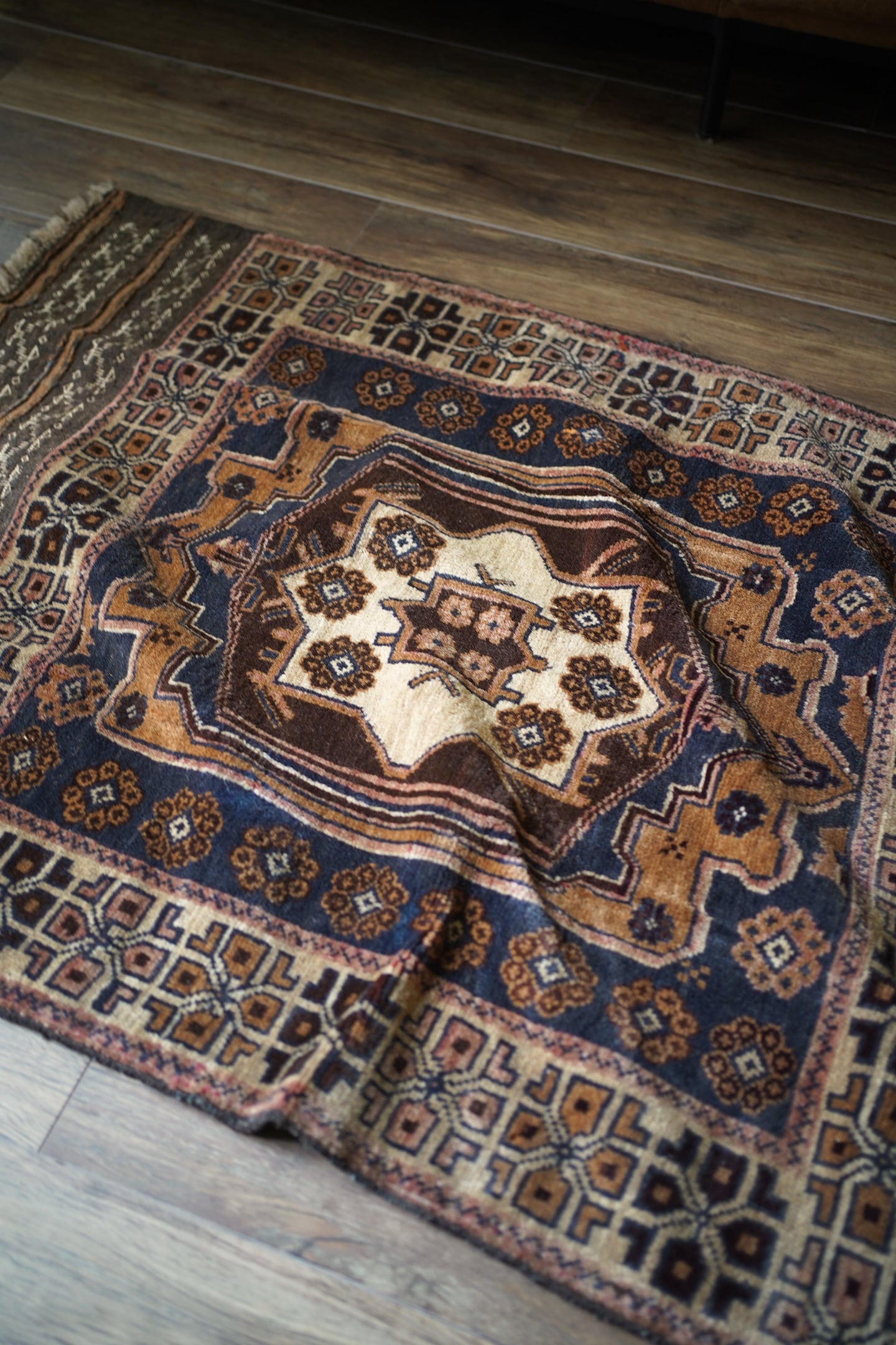 約30年前に織られたアフガニスタン産のバルーチラグ。キリムエンドが特徴的で帯が二重になったユニークな作りをしています。濃紺、ブラウン、焦茶、ベージュと統一感のある素晴らしい配色でお部屋にも取り入れやすい一枚かと思います。表面はふわっと柔らかい肌触りで、厚みは8mm程度。目立ったダメージや補修跡も見受けられず、良好なコンディションです。お気に入りのスペースをはじめ、小さめのソファの前や一人掛けチェアに合わせたりと色んなシーンで楽しんでいだだけると思います♫