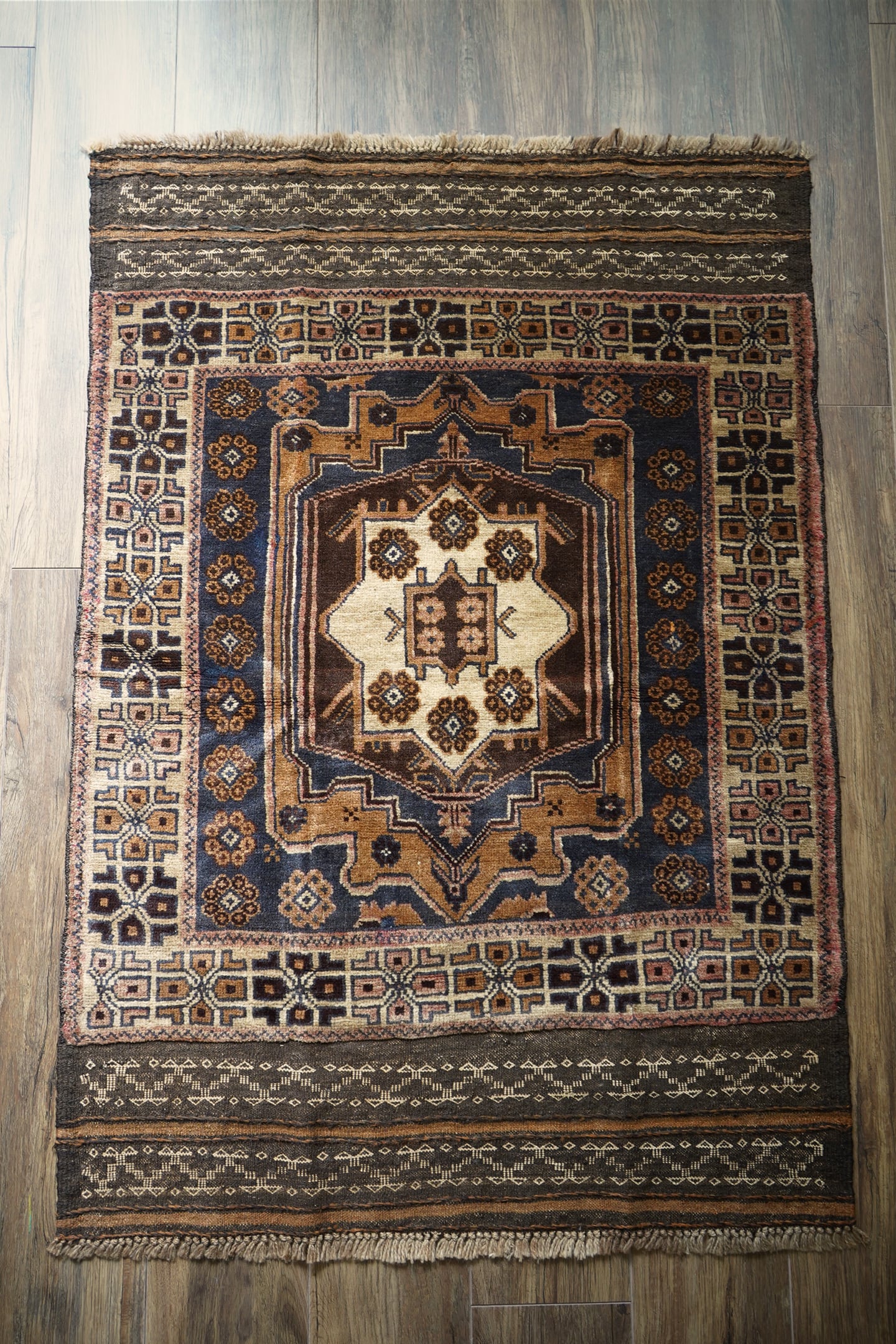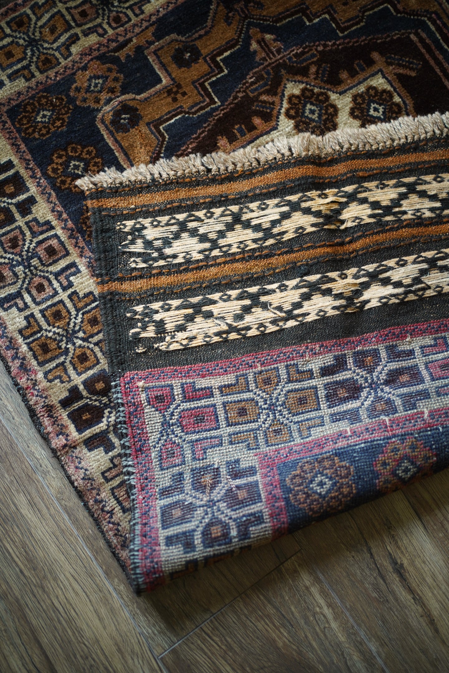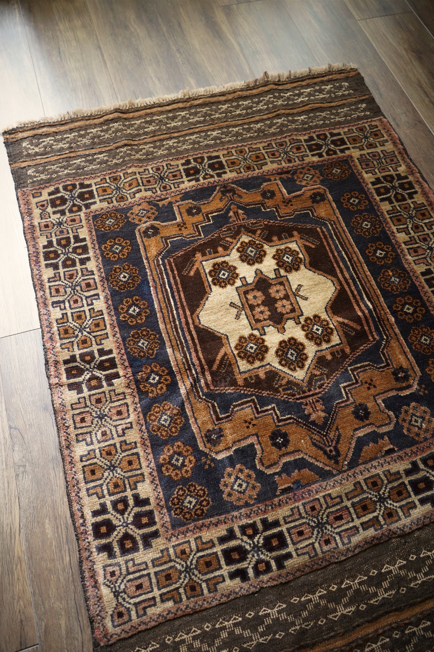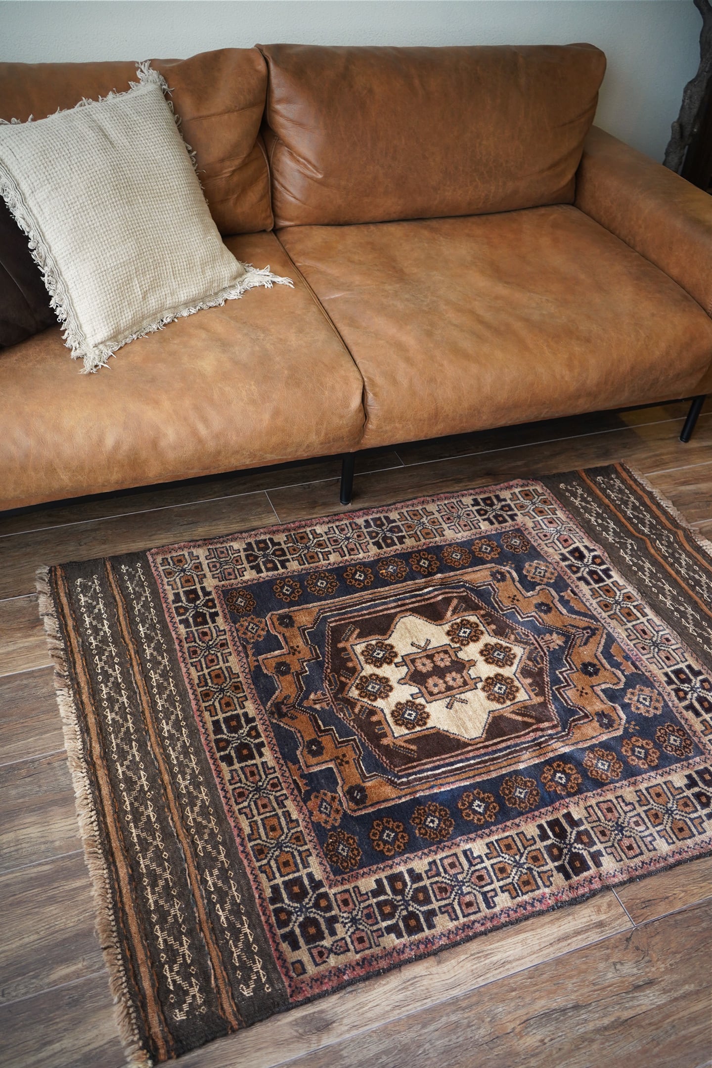 約30年前に織られたアフガニスタン産のバルーチラグ。キリムエンドが特徴的で帯が二重になったユニークな作りをしています。濃紺、ブラウン、焦茶、ベージュと統一感のある素晴らしい配色でお部屋にも取り入れやすい一枚かと思います。表面はふわっと柔らかい肌触りで、厚みは8mm程度。目立ったダメージや補修跡も見受けられず、良好なコンディションです。お気に入りのスペースをはじめ、小さめのソファの前や一人掛けチェアに合わせたりと色んなシーンで楽しんでいだだけると思います♫