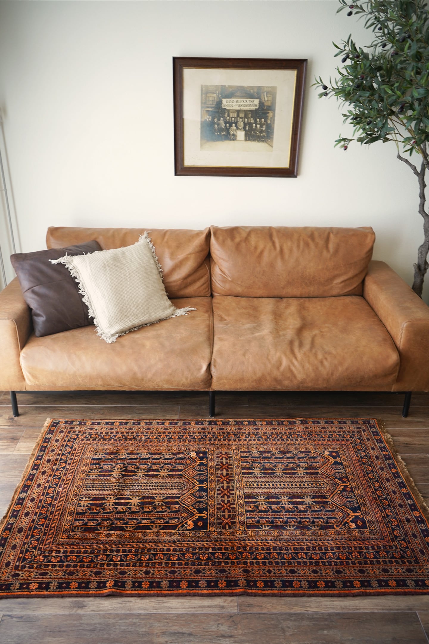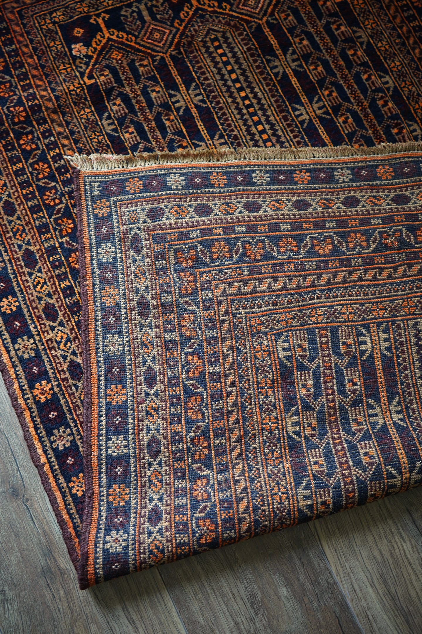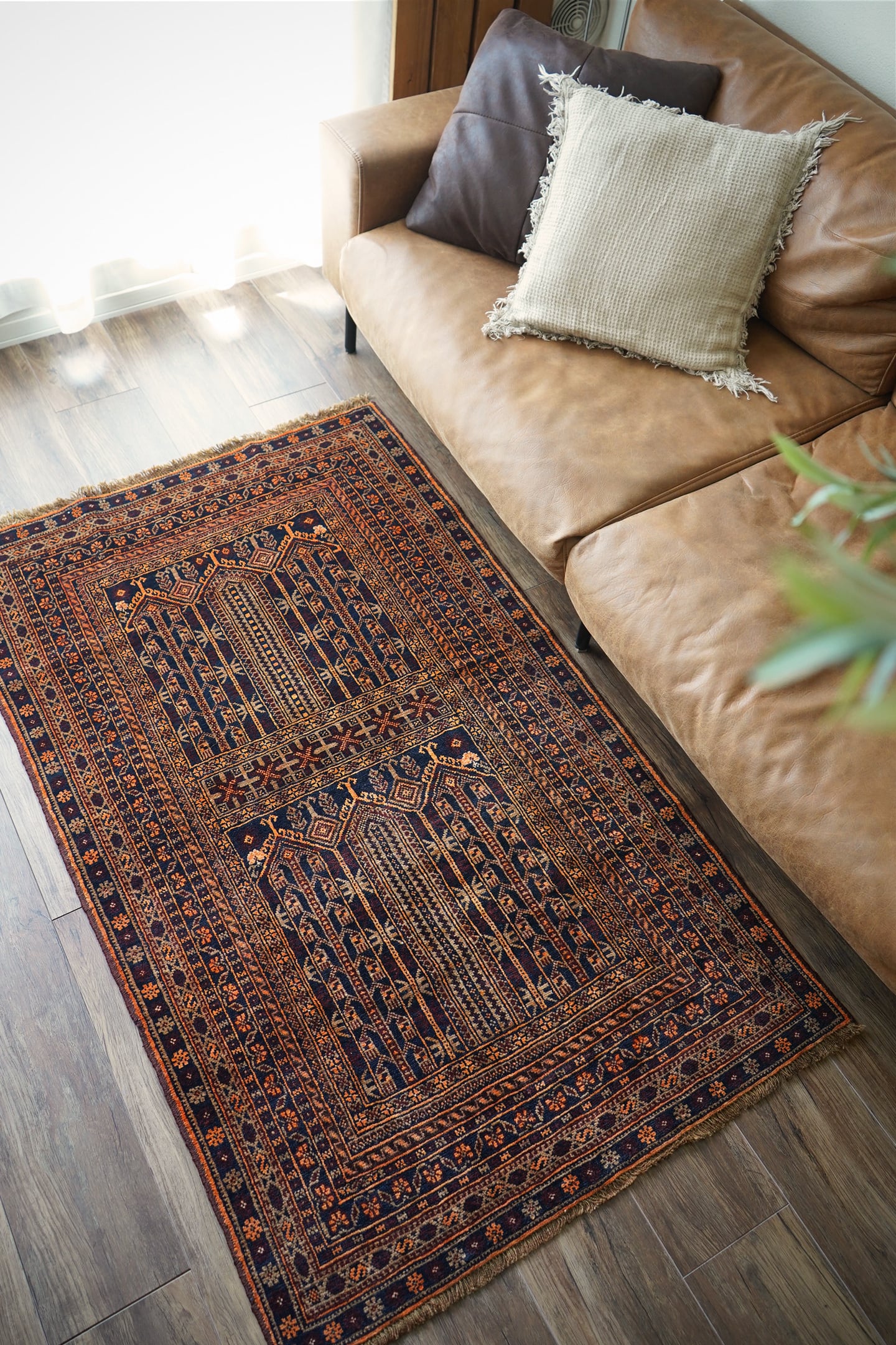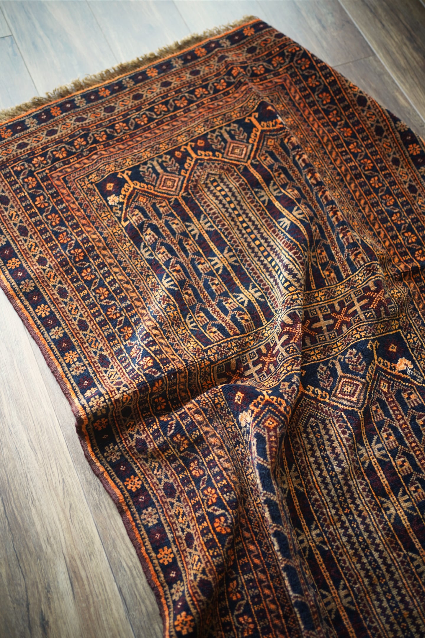 約30年ほど前にトルクメン族によって織られたアリホジャラグ。ミフラーブ"と呼ばれるイスラム建築由来の紋様デザインで、繊細な紋様の数々が連続して美しく織り込まれています。厚みは6mm程度で、表面のパイルはふわっと柔らかく優しい肌触りをしています。質感も非常に良く、使用頻度もほとんど感じられないパーフェクトなコンディション。鮮やかなオレンジと濃紺のコントラストが目を惹く一枚で、お部屋にちょっとした色味のアクセントが欲しい方にオススメです。